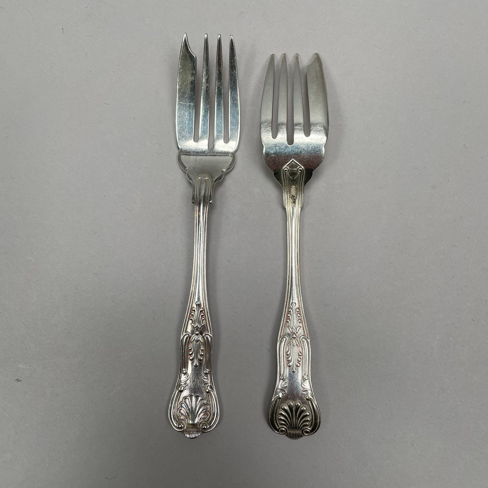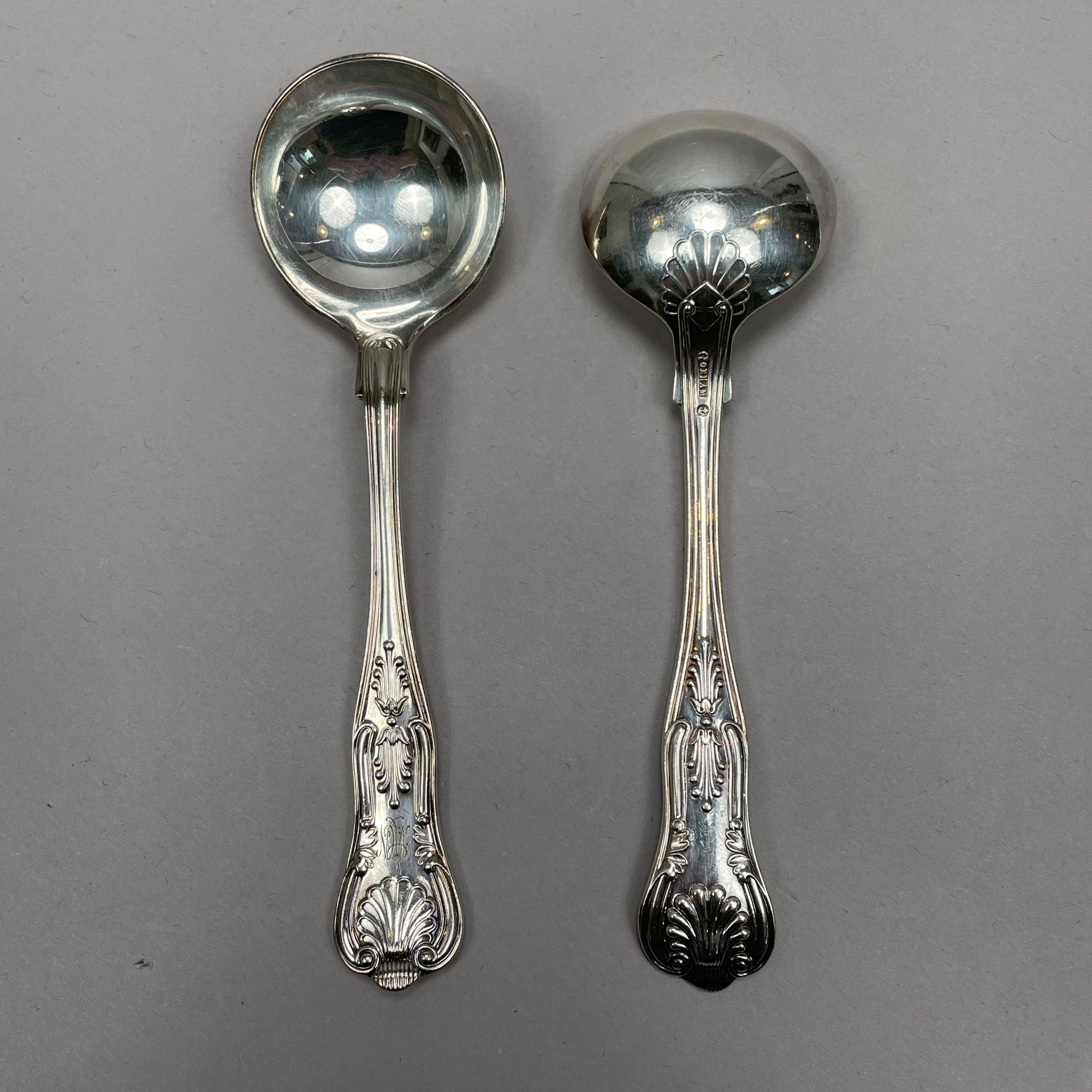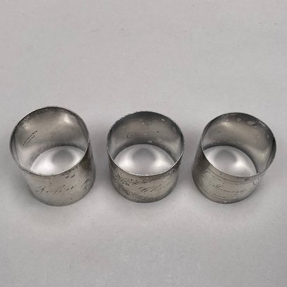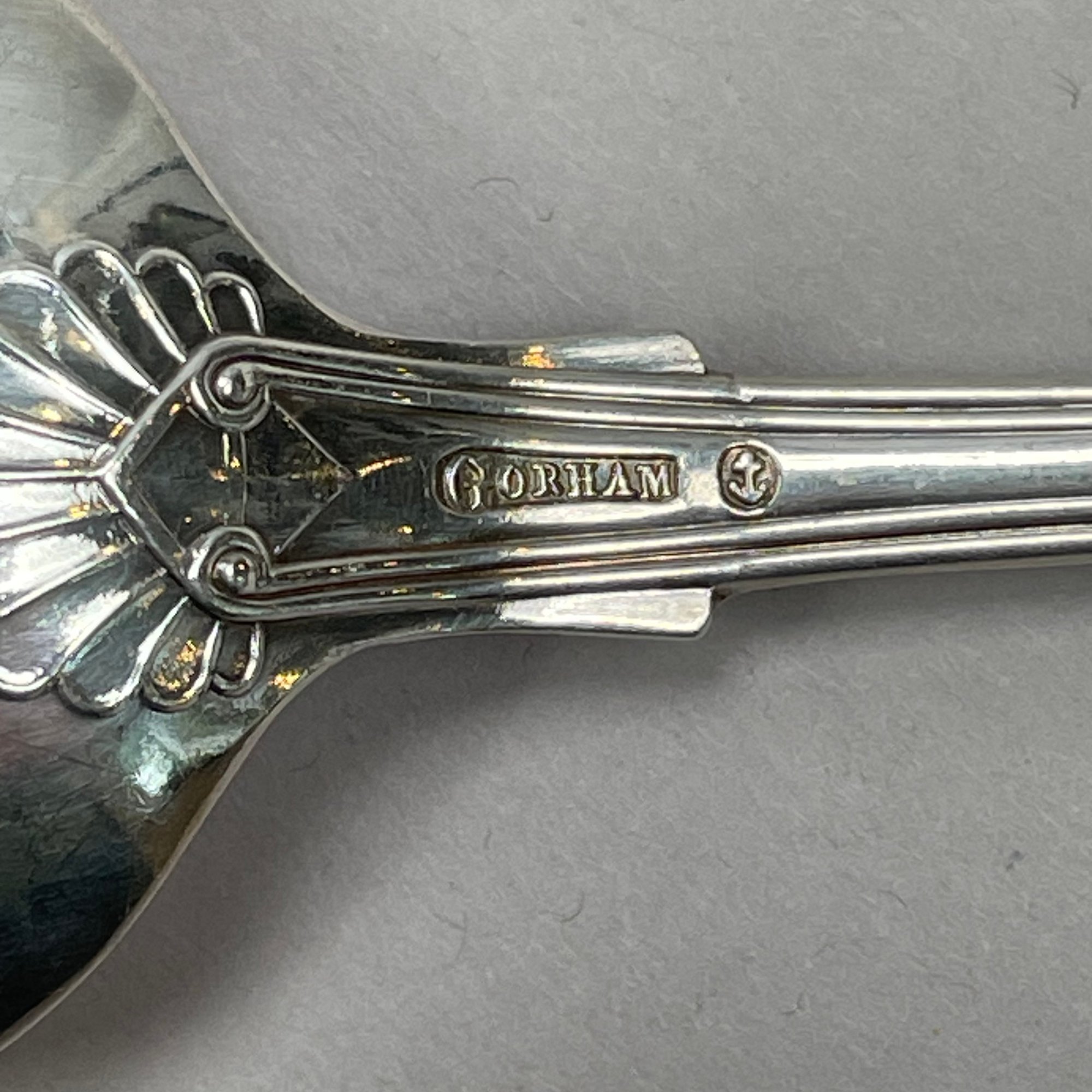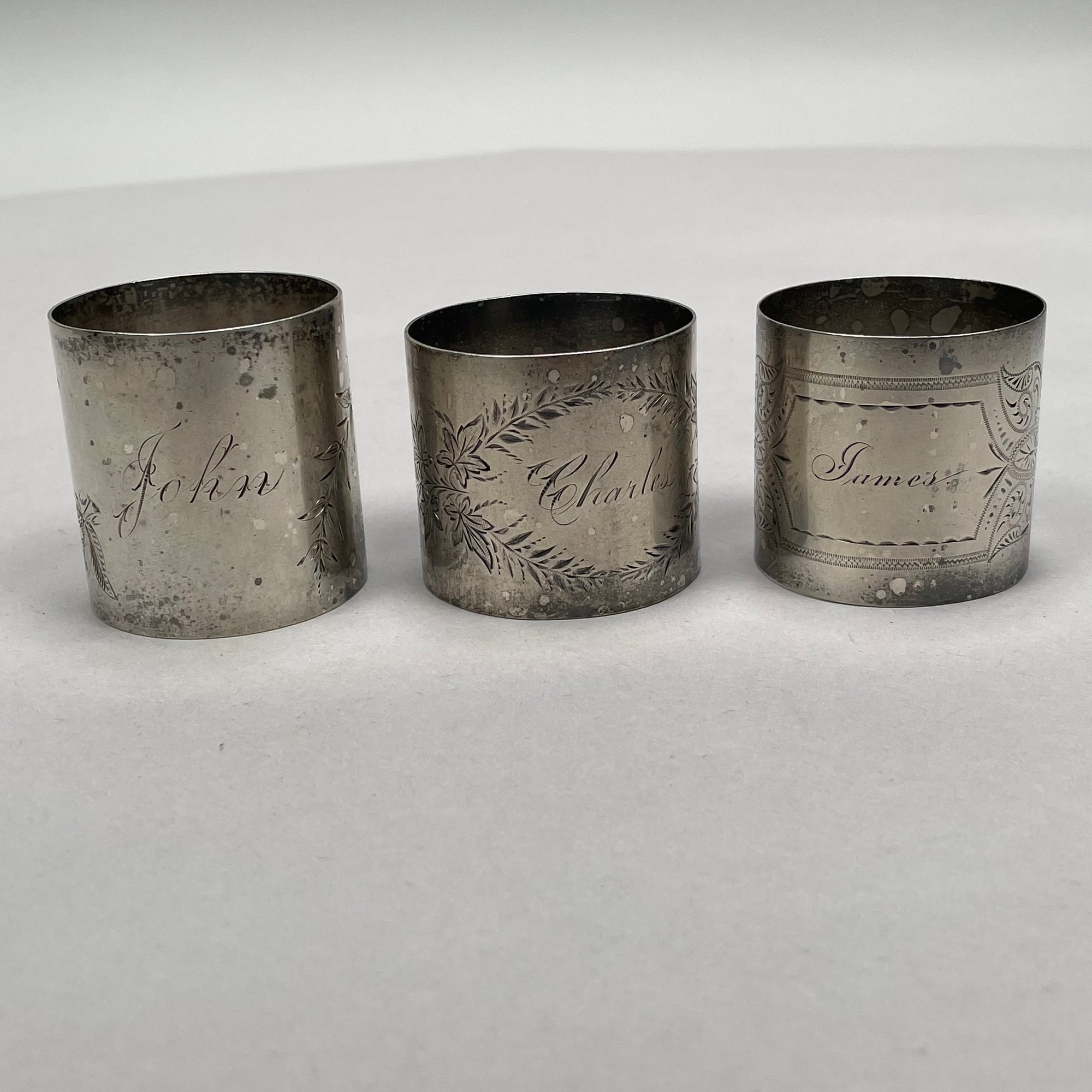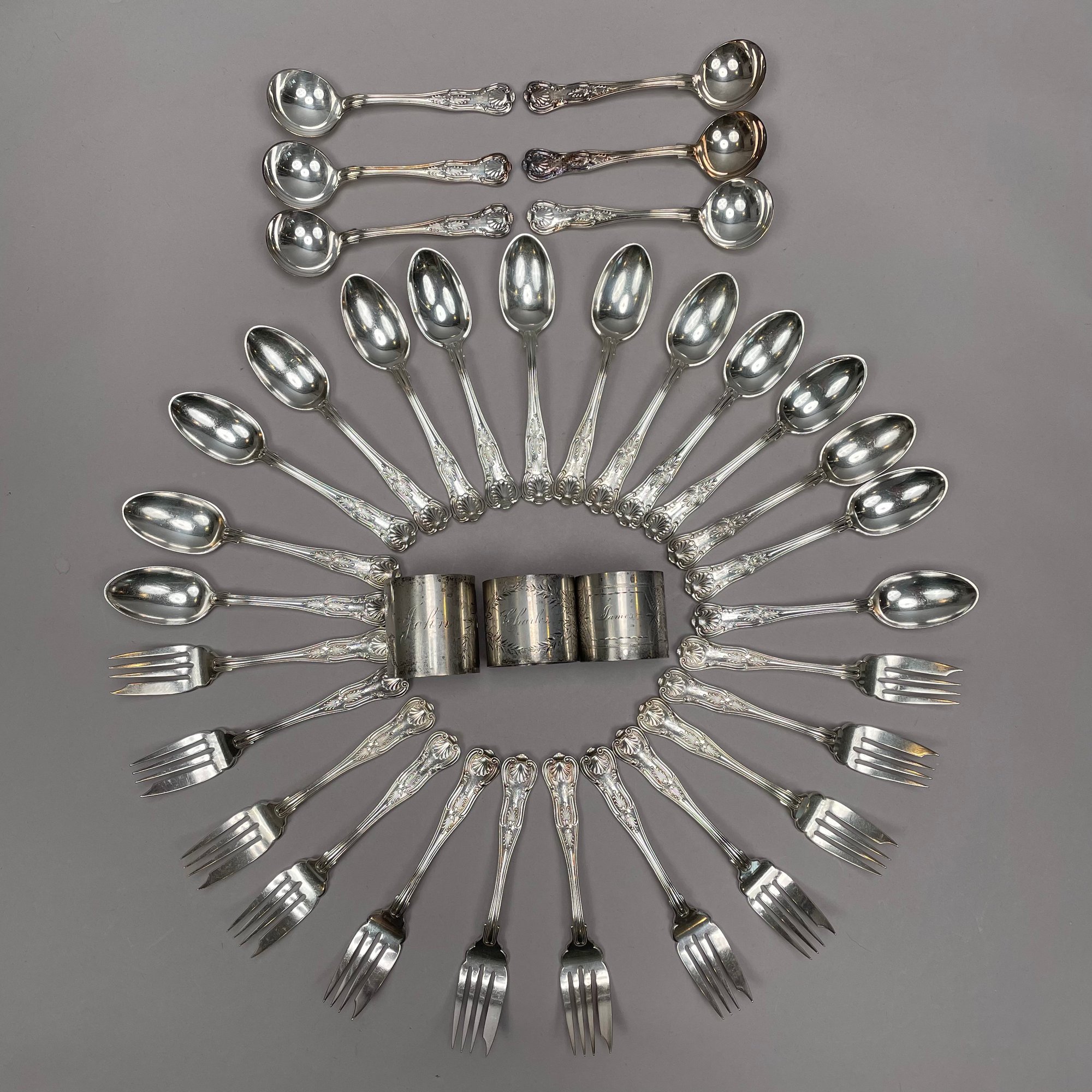 Group of American Sterling Silver and Silverplate. Comprising two sterling silver napkin rings, the first engraved "James," Gorham Mfg. Co., the second engraved "John," A. Stowell & Co.; a silverplate napkin ring engraved "Charles;" and a set of silverplate 'Kings' pattern flatware, Gorham Mfg. Co., comprising six bouillon spoons, twelve salad forks and fourteen teaspoons. (35)