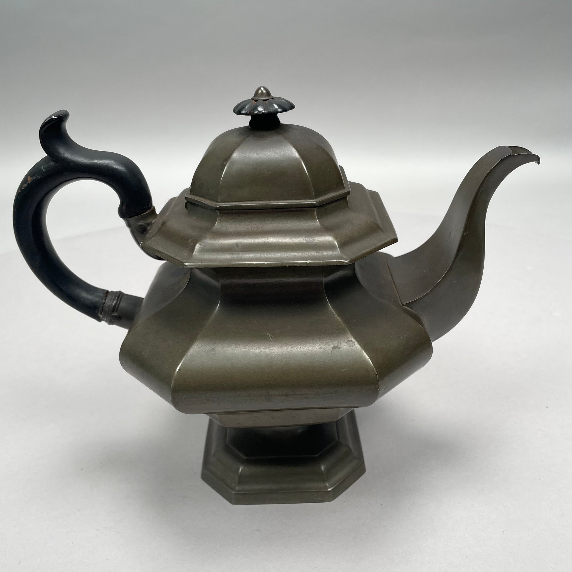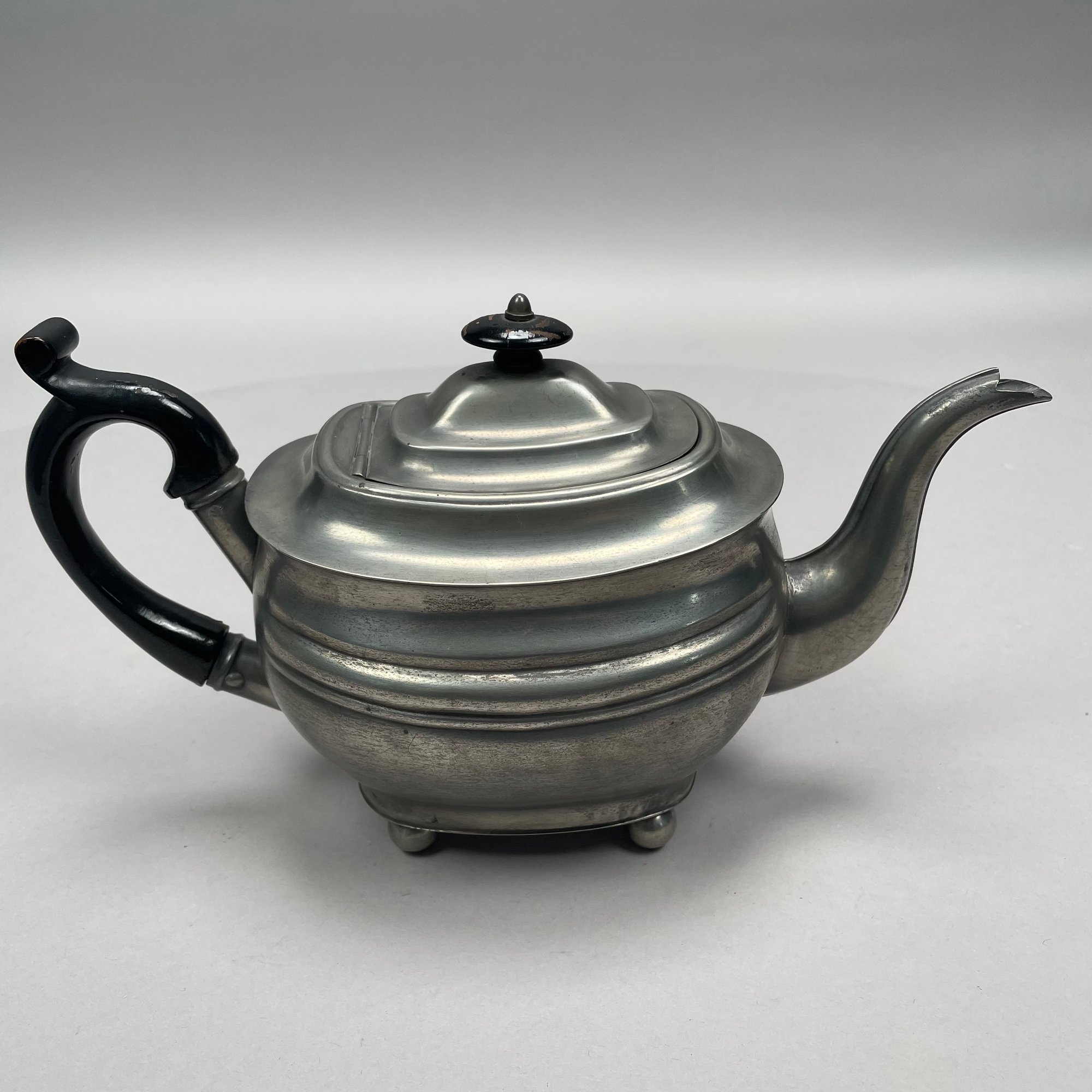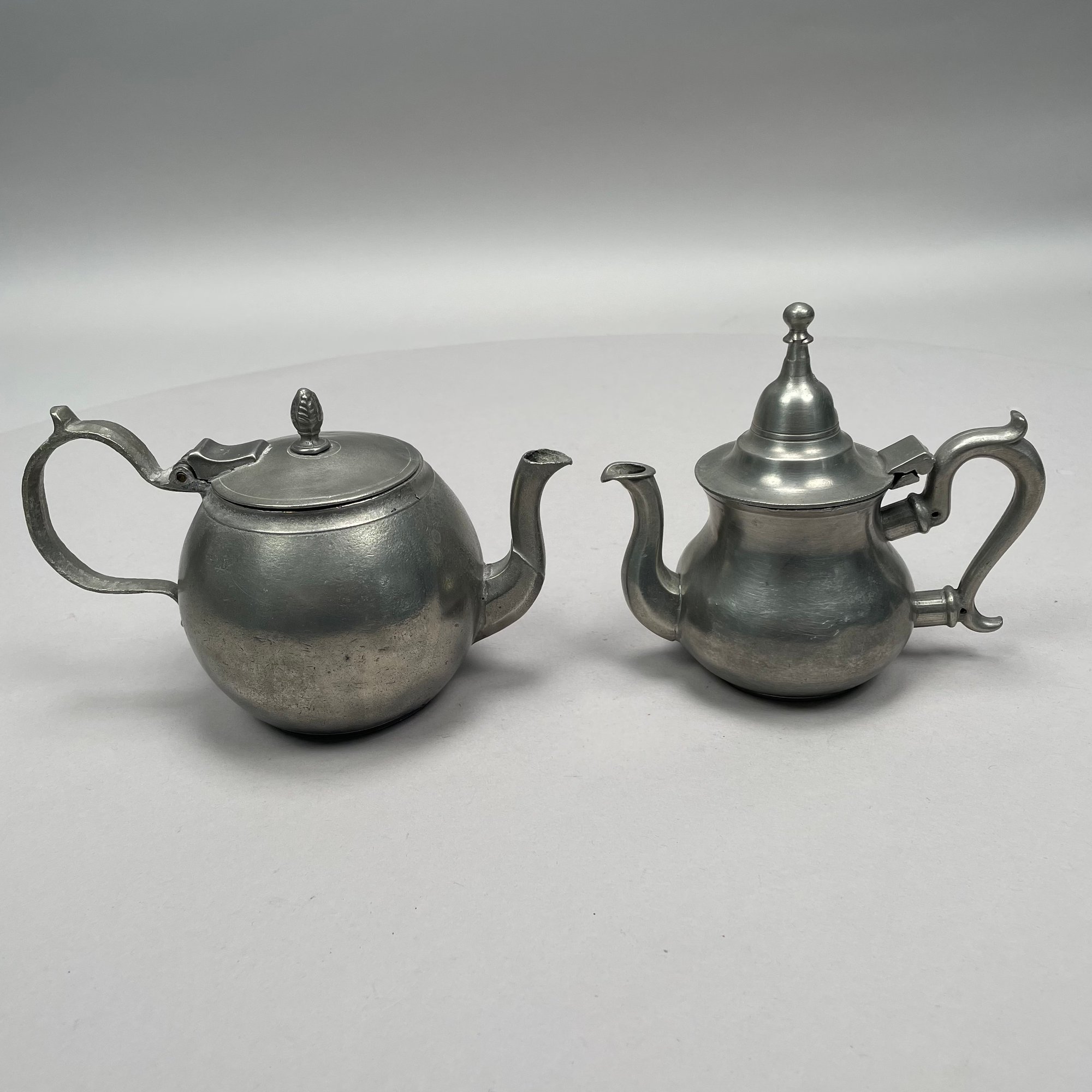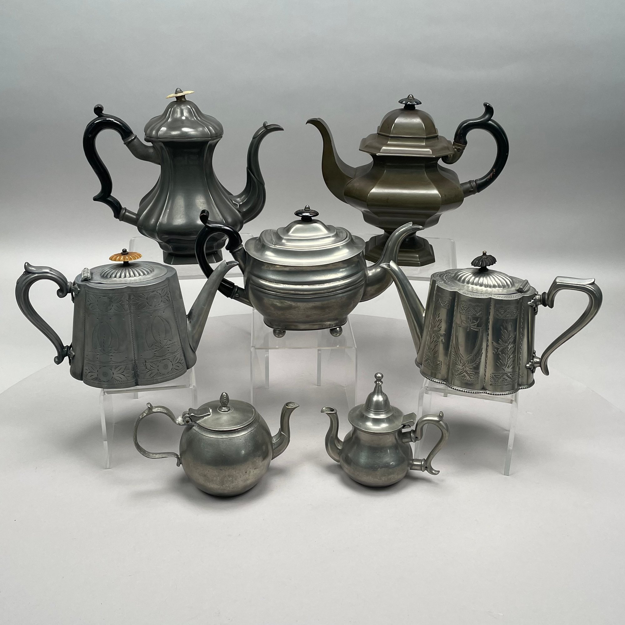 Group of English and Continental Pewter and Silverplate Wares, Late Eighteenth-Nineteenth Century. Comprising a Continental globular teapot, a Victorian teapot in the Queen Anne style, a teapot with seamed spout, two James Dixon & Son teapots, and two silverplate teapots (one worn). (7)