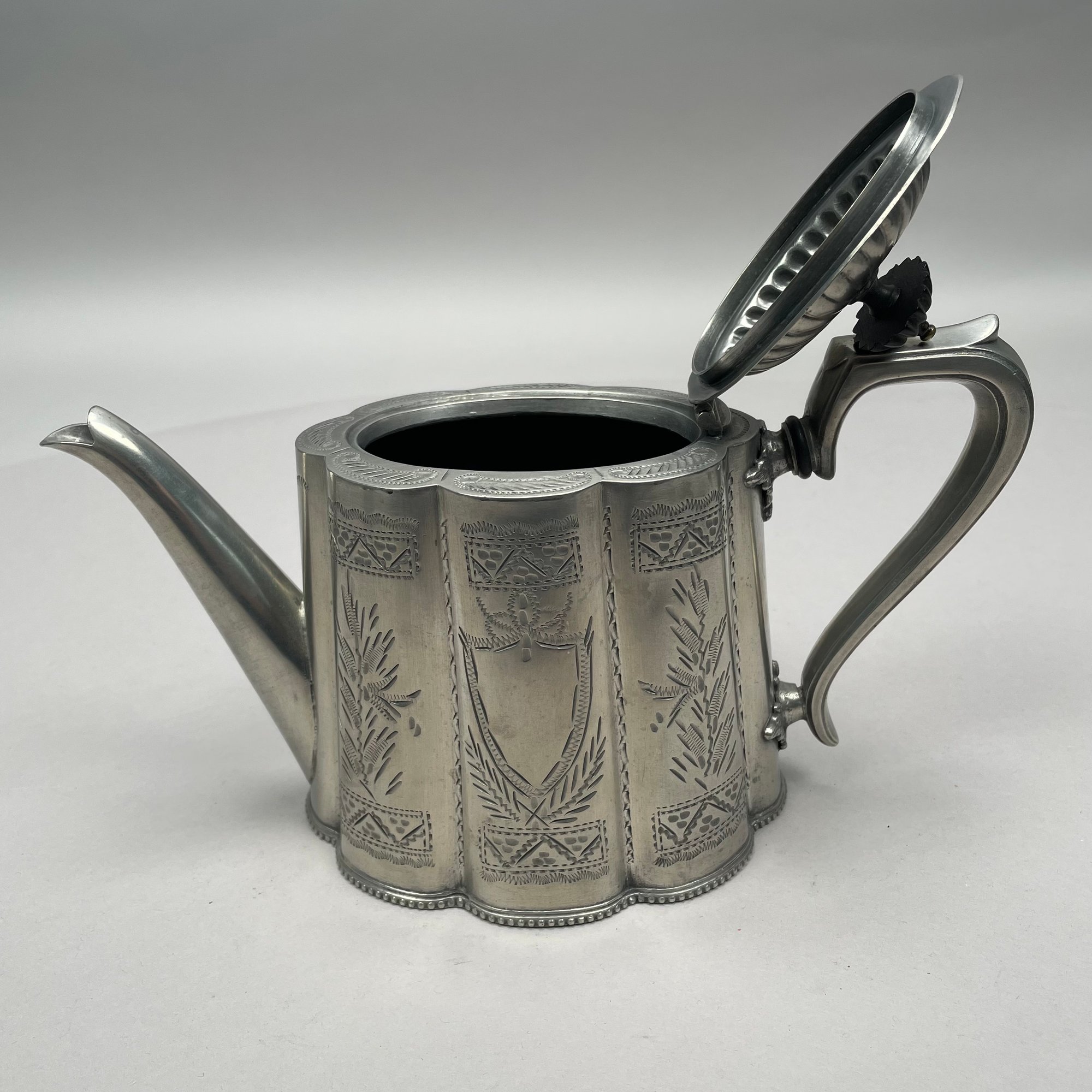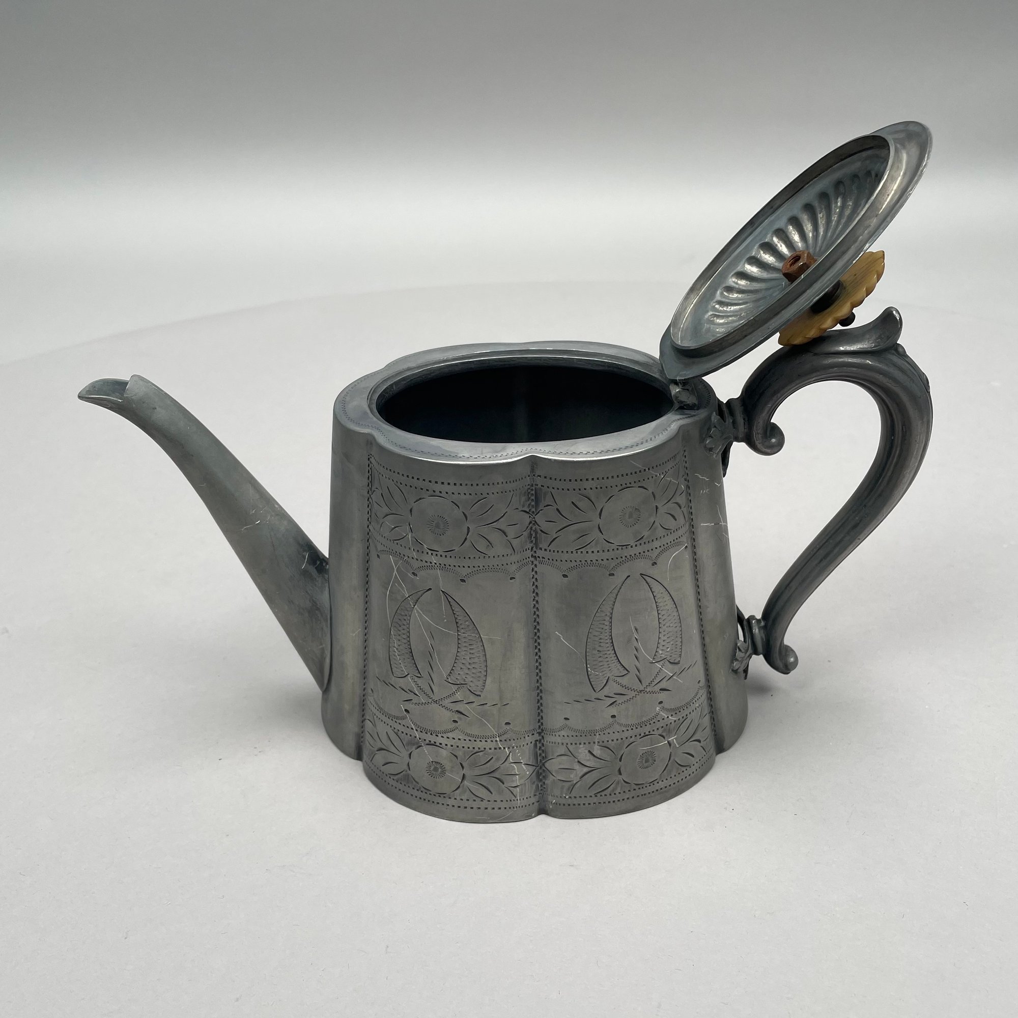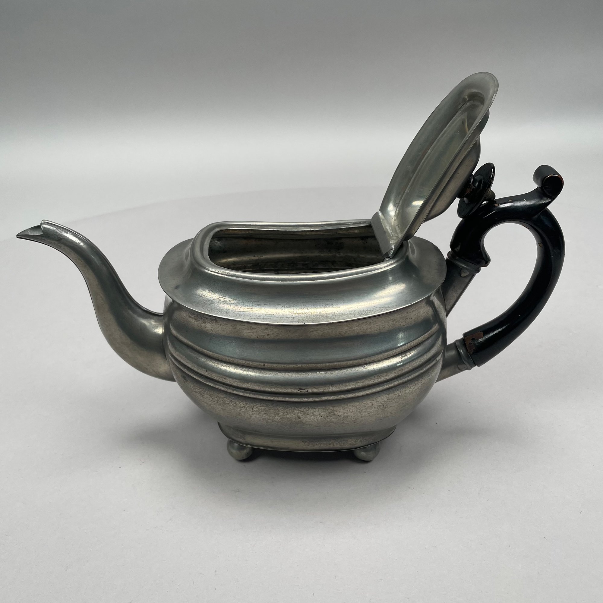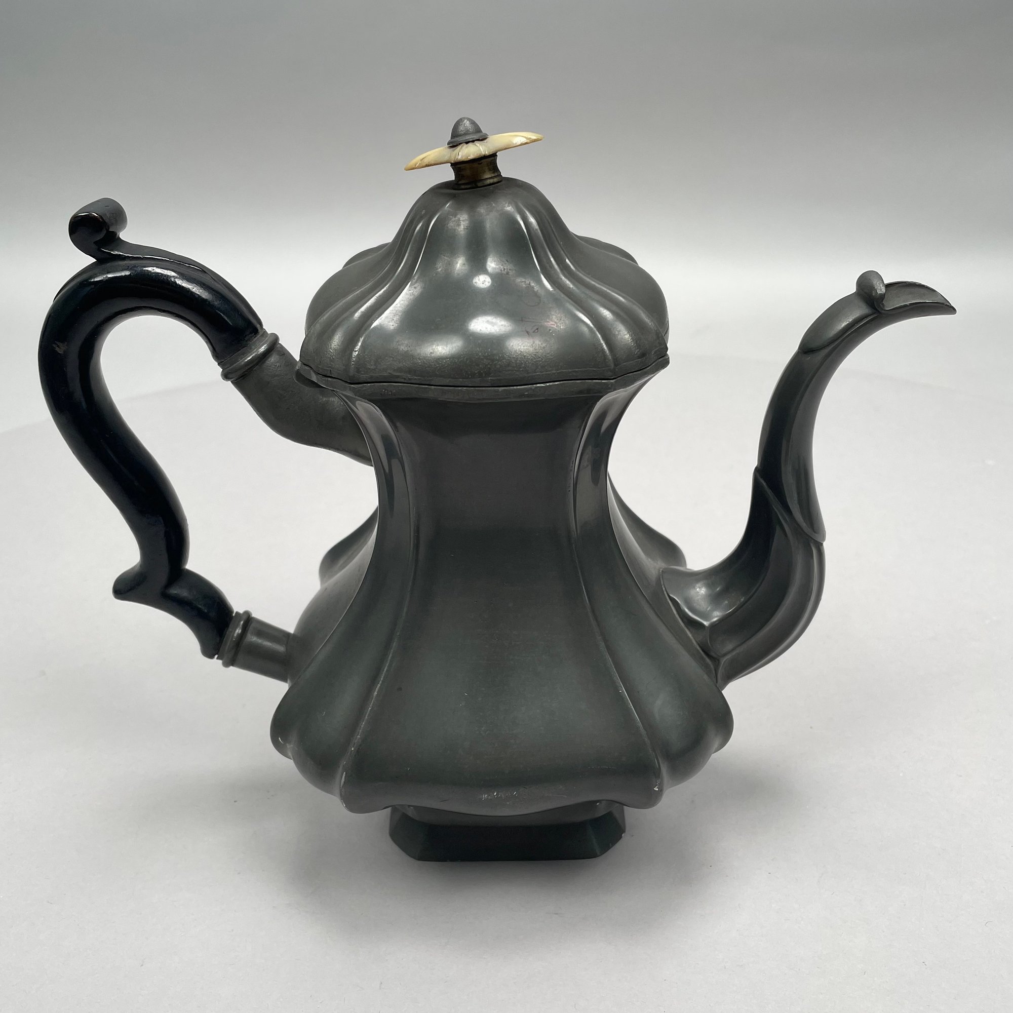 Group of English and Continental Pewter and Silverplate Wares, Late Eighteenth-Nineteenth Century. Comprising a Continental globular teapot, a Victorian teapot in the Queen Anne style, a teapot with seamed spout, two James Dixon & Son teapots, and two silverplate teapots (one worn). (7)