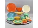 Comprising a 10.875 in. 'Yellow,' 'Medium Green' and 'Ivory' relish tray; in 'Yellow' a 12.5 in. oval platter, 12.125 in. comport, two 8.375 in. nappies and two 5.5 in. fruit bowls; comprising in 'Medium Green' a Kitchen Craft 8.75 casserole and cover in a chrome holder, a 7.875 in. and a 8.625 in. casserole and cover, and a 6.125 in. teapot; comprising in 'Turquoise' a 12.625 in. oval platter, and a sugar bowl and cream pitcher utility tray only (unmarked); comprising in 'Red' one 14.125 in. chop plate, one 11 in. footed salad bowl, pair of salt and pepper shakers, and a sugar bowl and cream pitcher utility tray only (marked); comprising in 'Ivory' a 12.125 in. chop plate and a sauceboat, impressed "HLC fiesta MADE IN U.S.A.," "fiesta HLC. USA.," "HLC fiesta KITCHEN KRAFT U.S.A." or stamped "GENUINE fiesta HLC USA." (20)