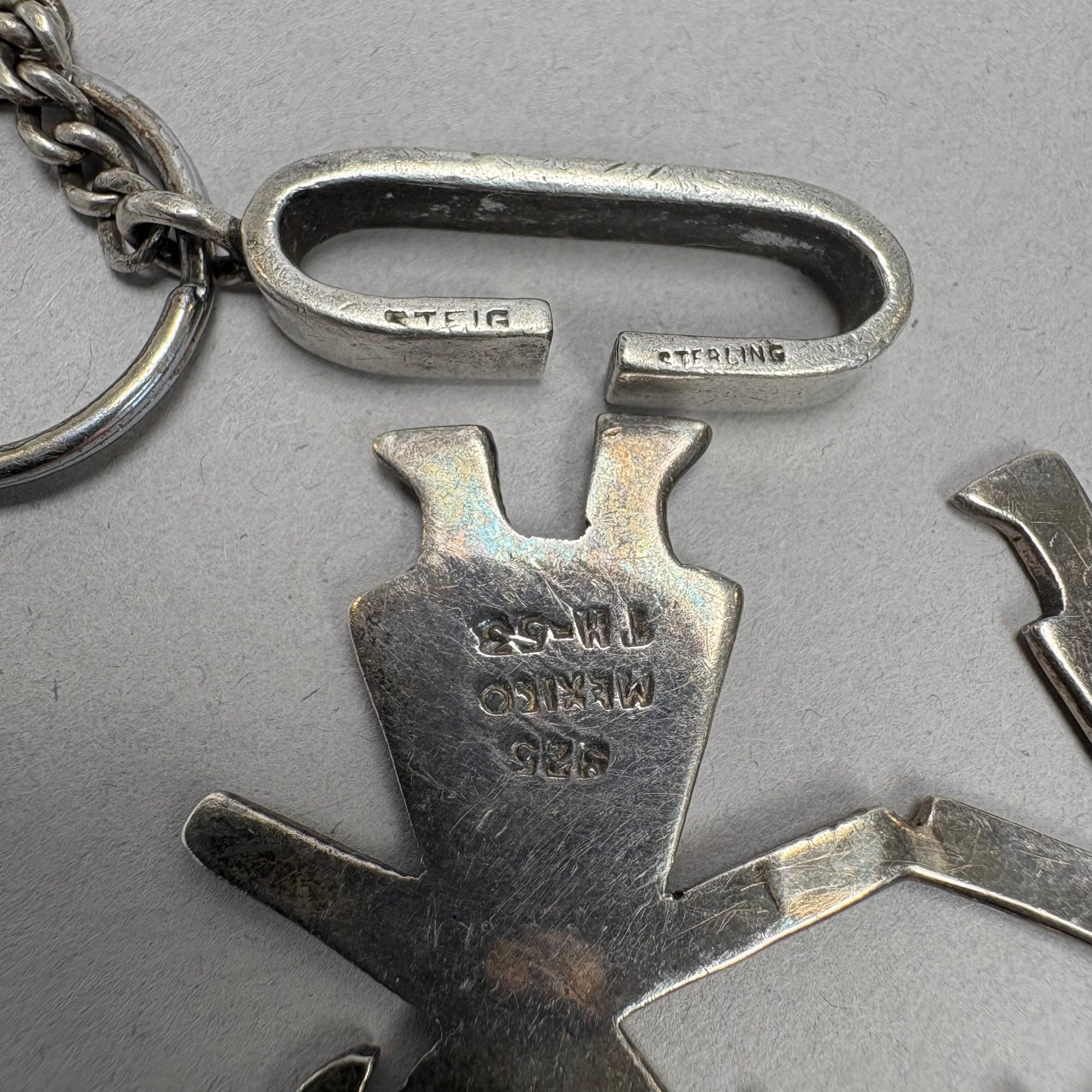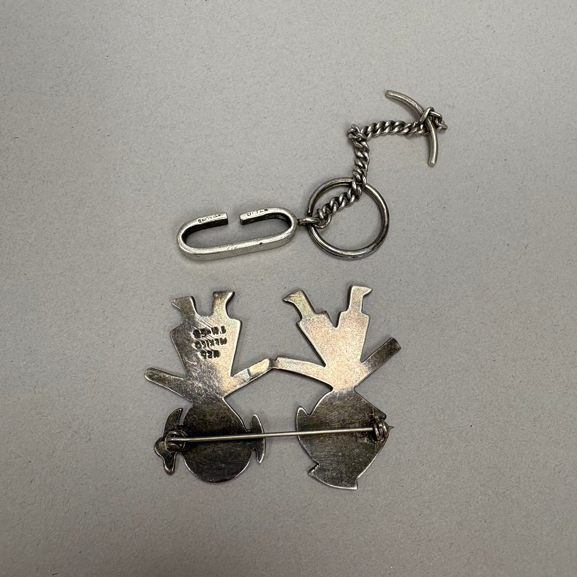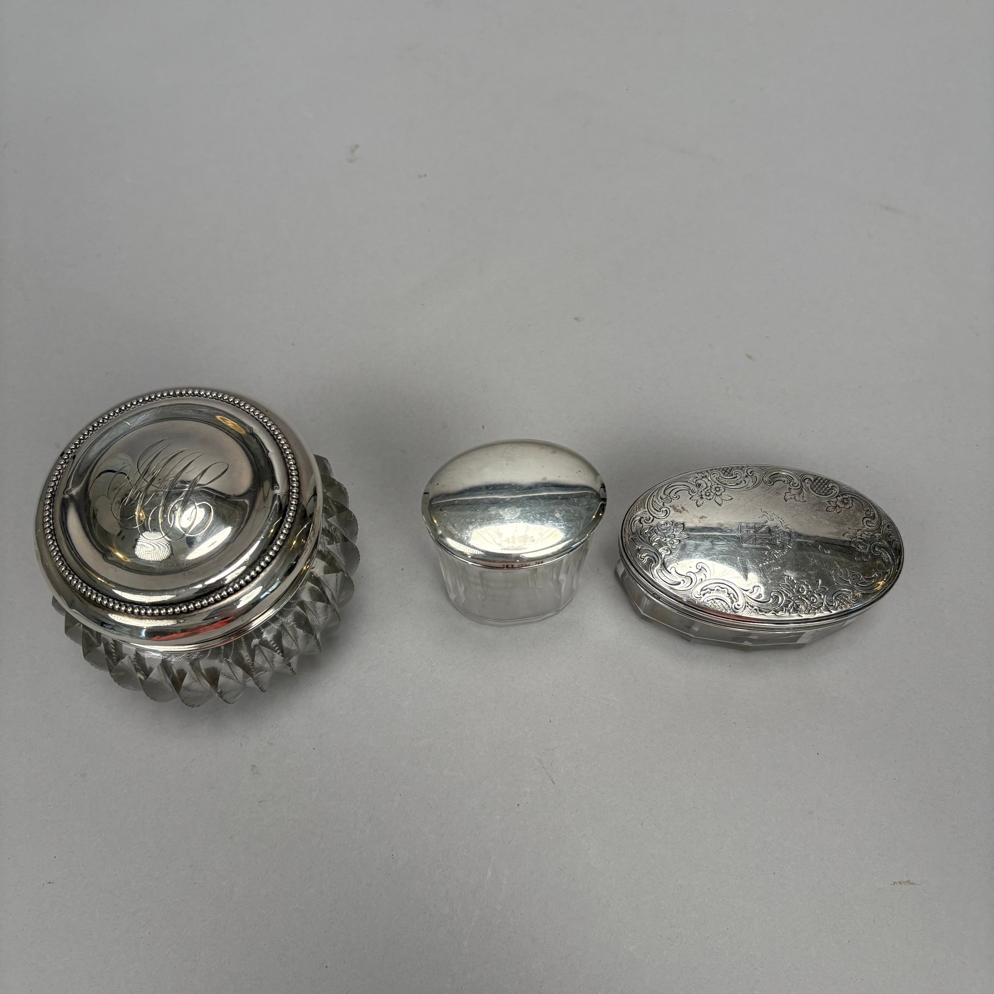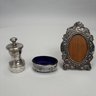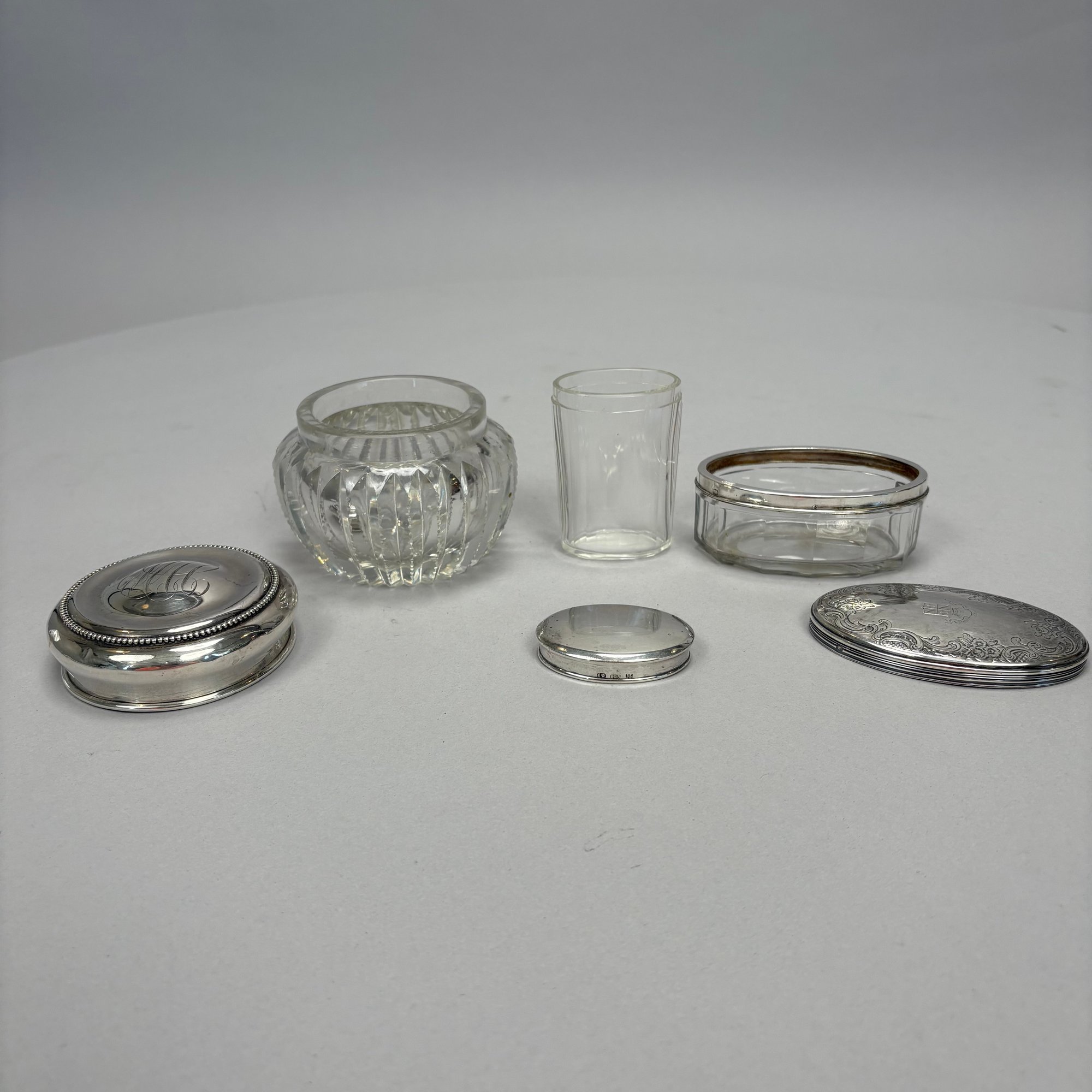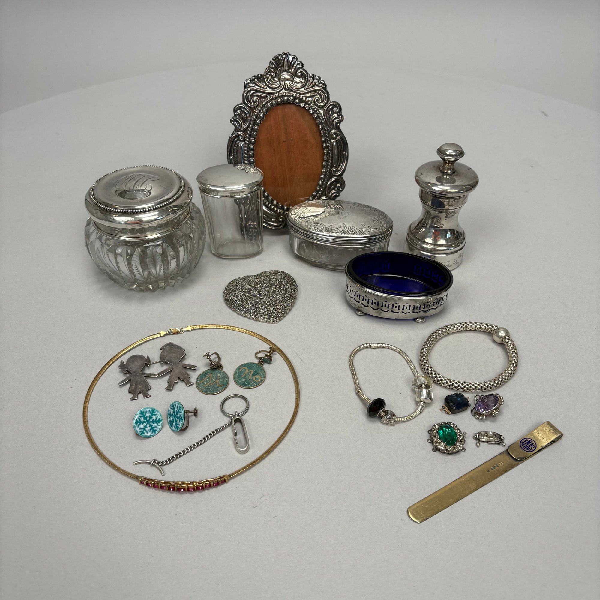 Group of American and Continental Sterling Silver and Silverplate Table Objects and Jewelry. Comprising a powder jar, small jar, armorial trinket box, footed oval salt, silverplate salt mill or grinder, wood picture frame with repousse surround marked "925," a heart-shaped filigree brooch marked "THAILAND 925," a Mexican pin of two children marked "925/ MEXICAO/ TH-53," a pair of screw-back earrings marked "STERLING 0925/ RF.C/ FC OEH MEXICO;" a pair of enamel and silver snowflake screw-back earrings marked "STERLING;" a keychain marked "STEIG STERLING," a silver-gilt clip monogrammed "XMAS," London, 1910, probably William Edward Hurcomb; and a necklace, two bracelets and five glass or semi-precious stone pendants or mounts. (22)