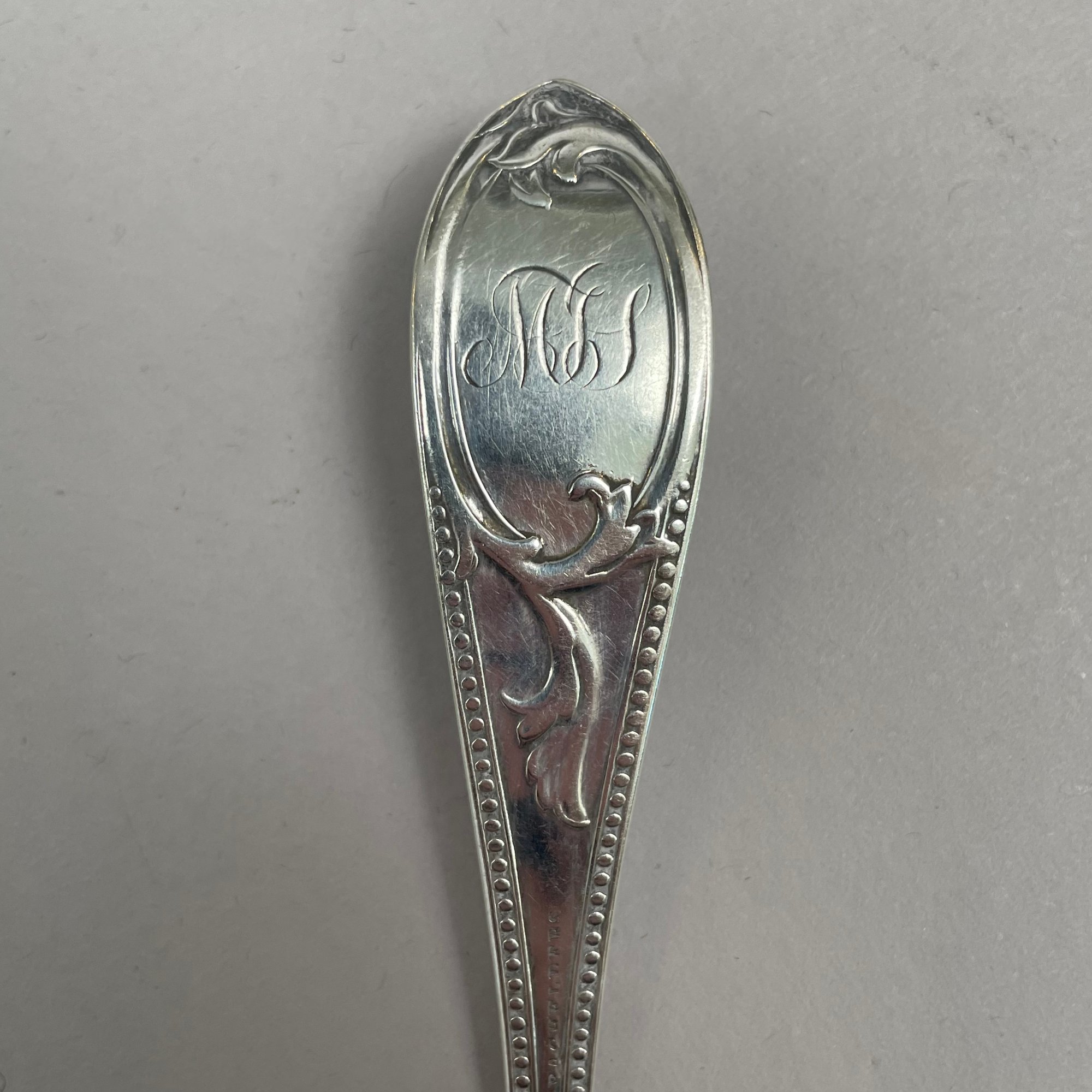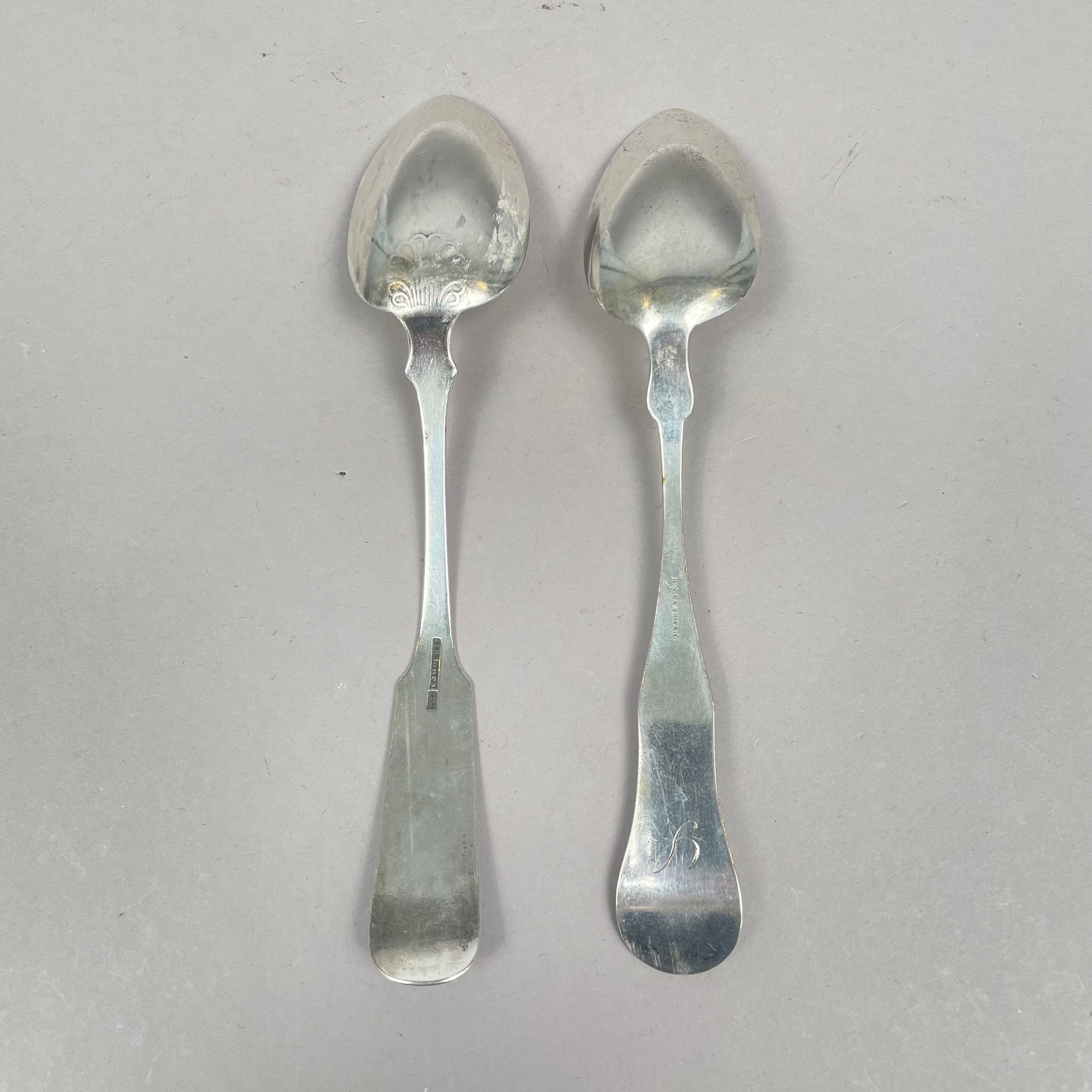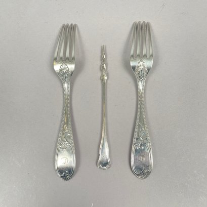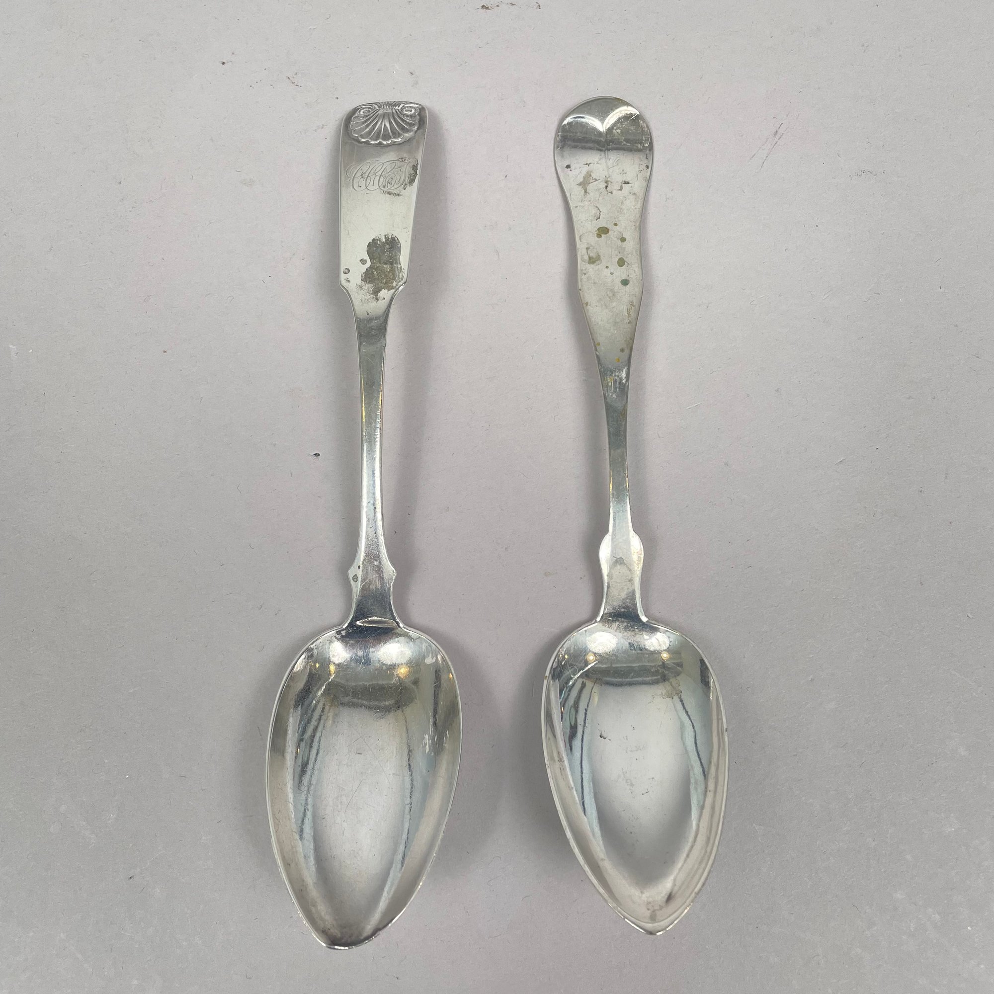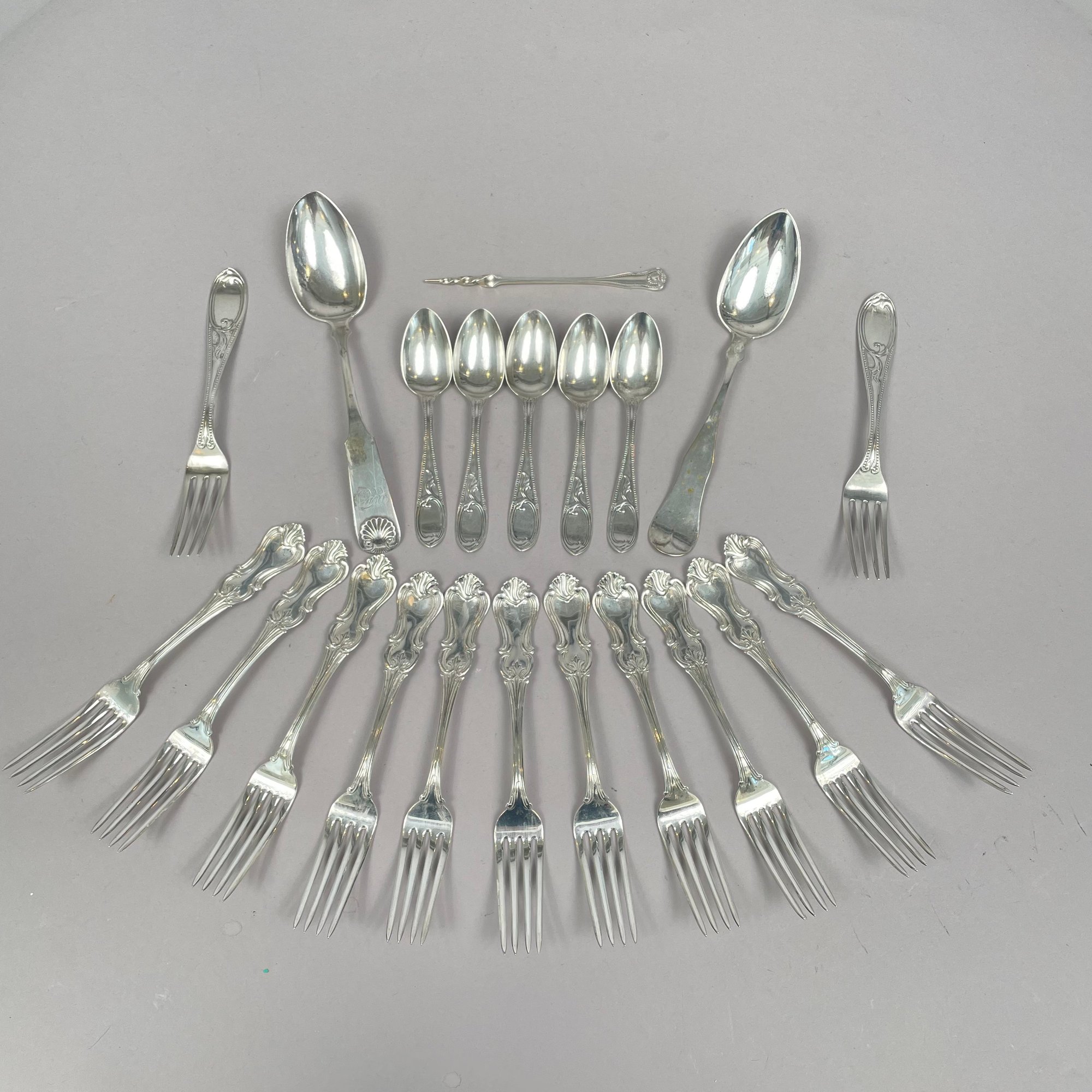 Group of American Coin and Sterling Silver Flatware in Various Patterns, Nineteenth Century. Comprising eleven dinner forks, Lincoln & Foss, Boston Massachusetts, 1848-57; one fiddle-handled tablespoon, and a set of two dinner forks and five teaspoons, E.K. Lakeman, Salem, Massachusetts, circa 1830; a fiddle- handled tablespoon applied with a shell, J.B. Jones, Boston, circa 1830; and a nutpick, Bigelow & Kennard & Co., Boston, after 1867. (21)