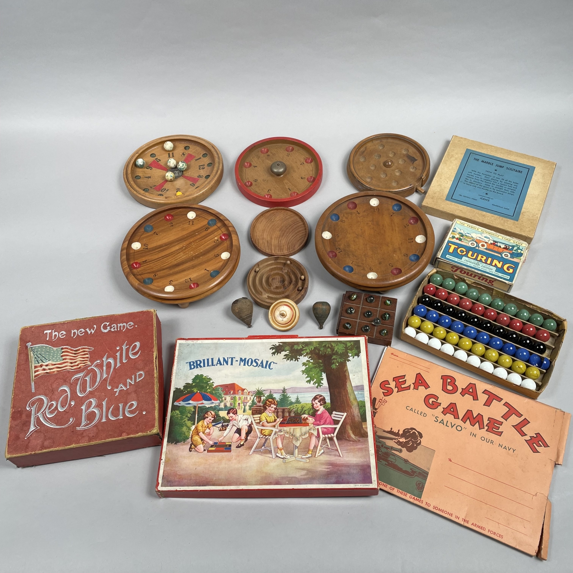 Comprising five marble games, boxed "The new Game. Red, White AND Blue" or "Imperial Roulette" game, J.W.S. & S., Bavaria, retailer's stamp inside lid; boxed "THE MARBLE JUMP SOLITAIRE," manufactured by Jodice, Somerville, Massachusetts; a square playing board containing marbles; a circular box containing four wooden balls; a tray of six rows of colored marbles; a "TOURING" card game, Parker Brothers, Salem, Massachusetts, New York, London; "SEA BATTLE GAME, CALLED 'SALVO' IN OUR NAVY," John W. Hill & Co.; boxed "BRILLIANT MOSAIC" game; and three wooden tops. (16)