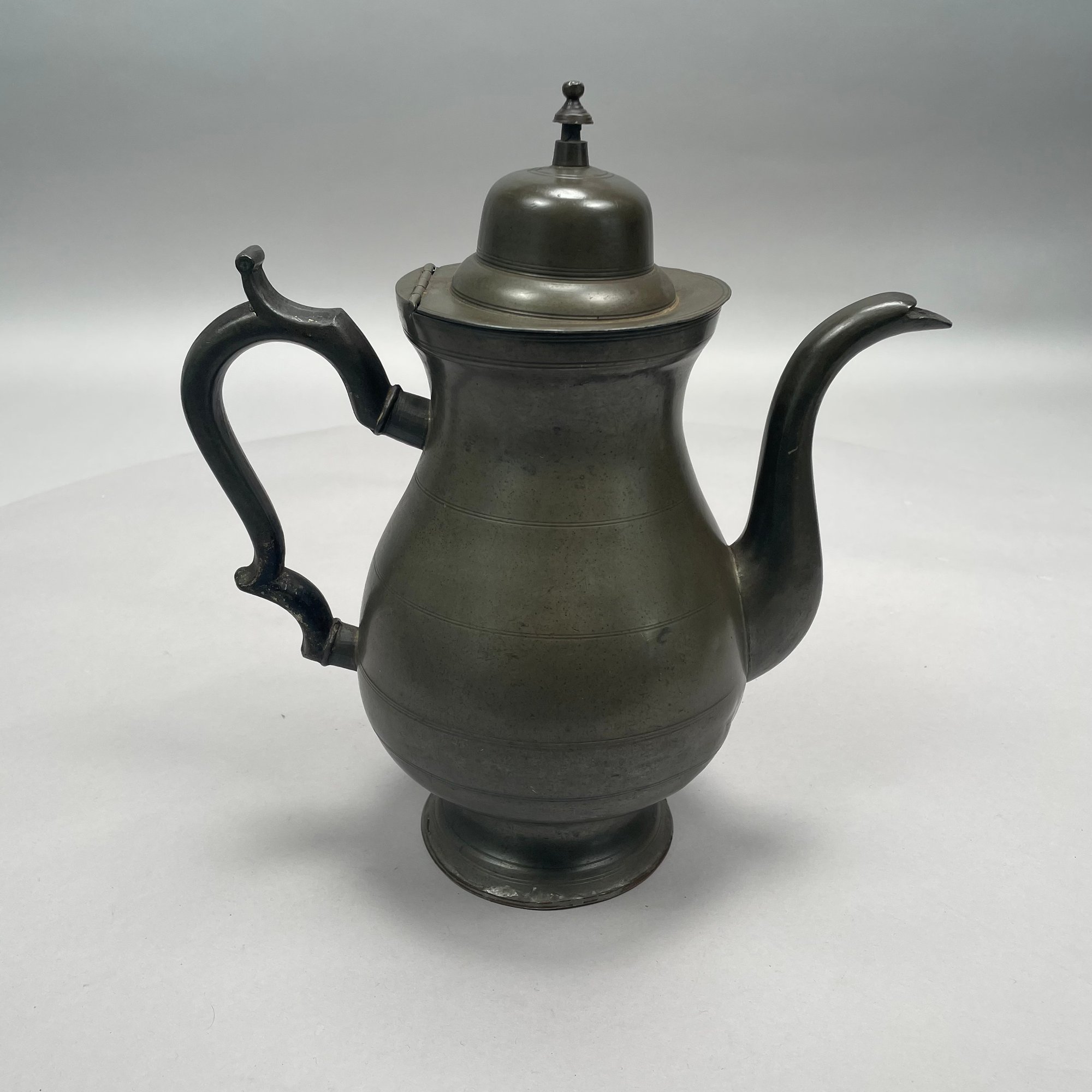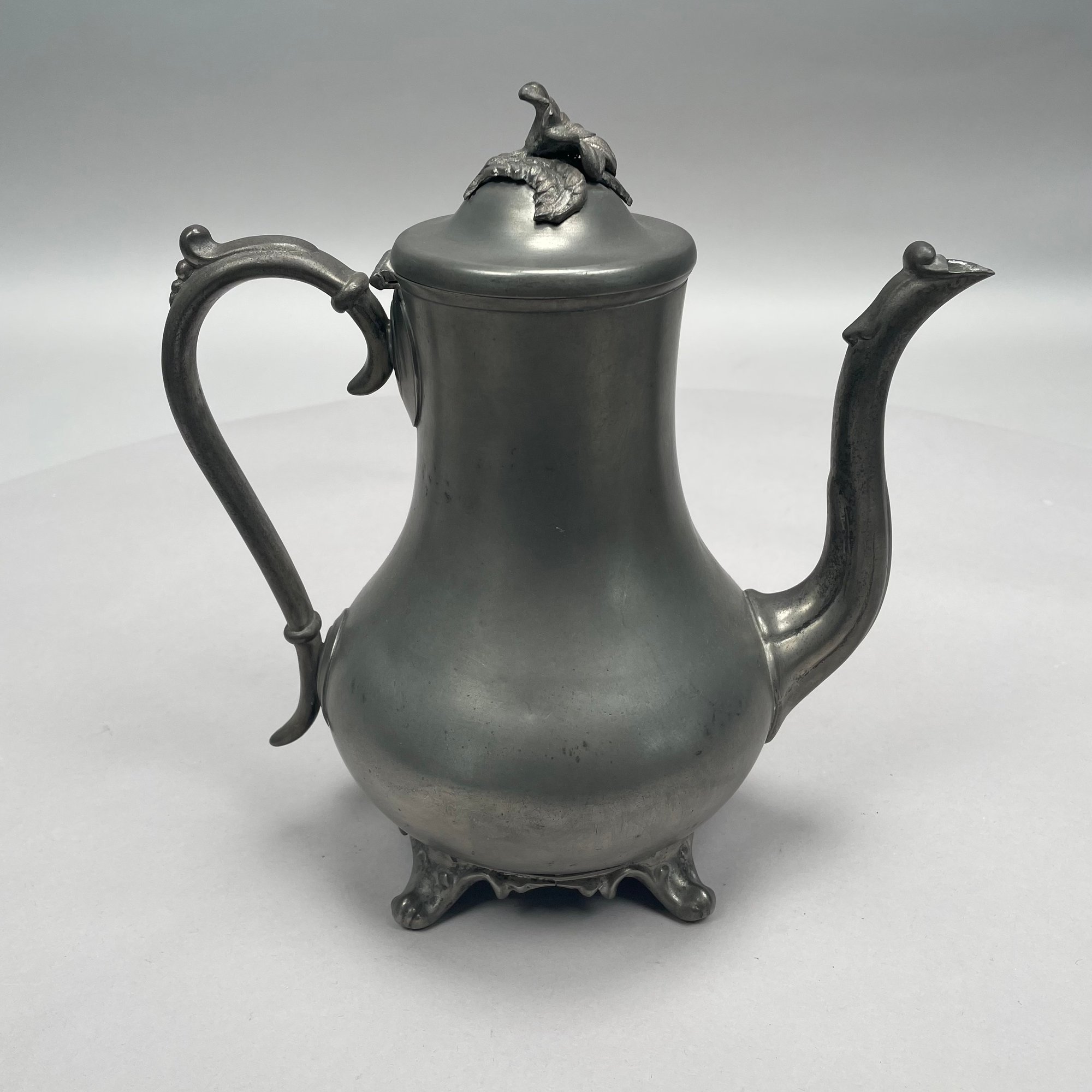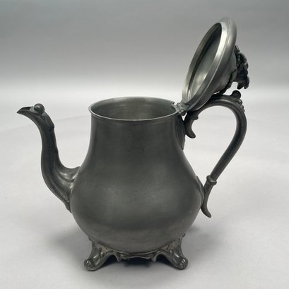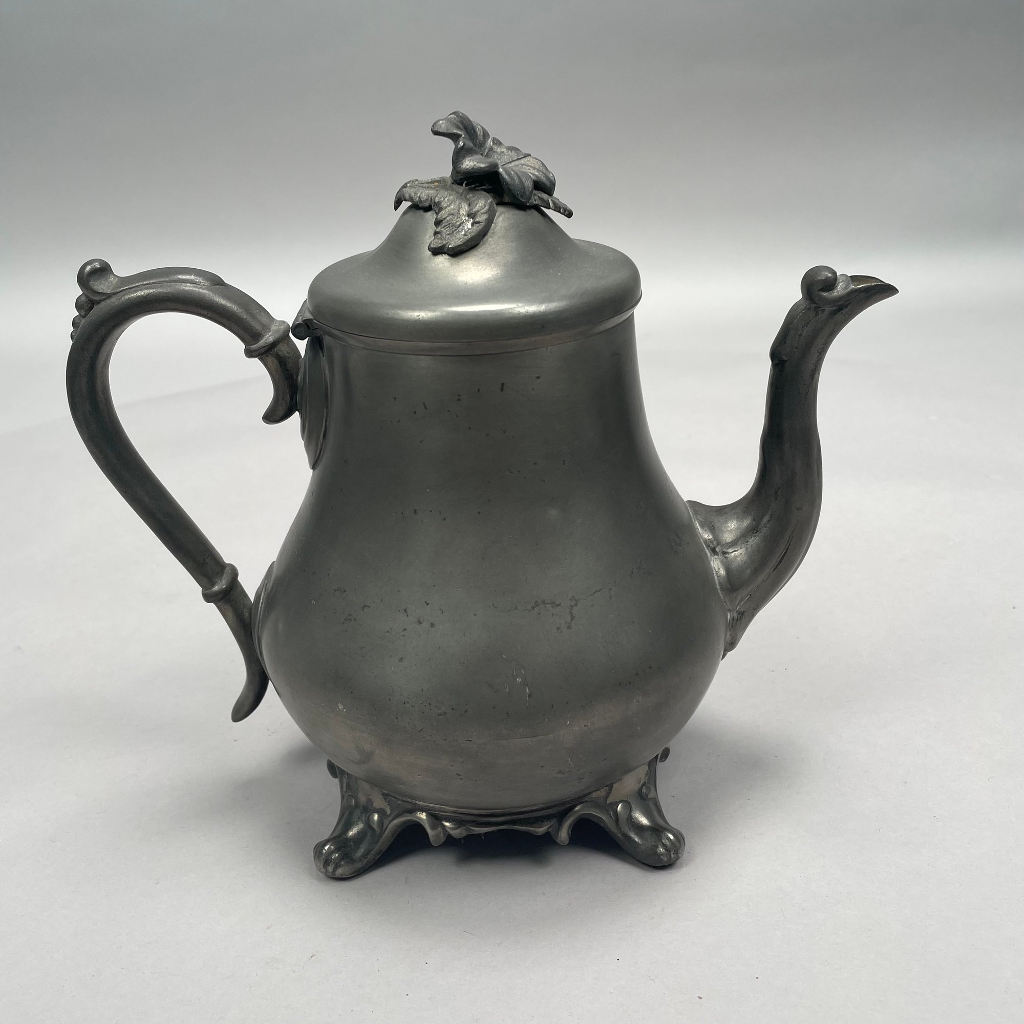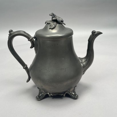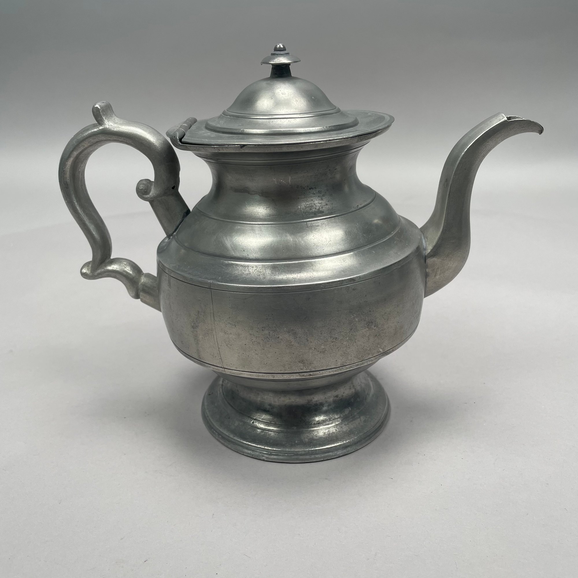 Group of American Pewter Tea and Coffee Wares, Nineteenth Century. Comprising a five piece tea and coffee service, retailed by John H. Whitlock, Troy, New York, 1836-44; the remaining comprising a teapot, Willis Humiston, Troy, New York, 1840-60, two teapots (one Boardman, New York), a coffeepot, a sugar bowl and cover; and a Pairpoint Mfg. Co. silverplate sugar bowl. (11)