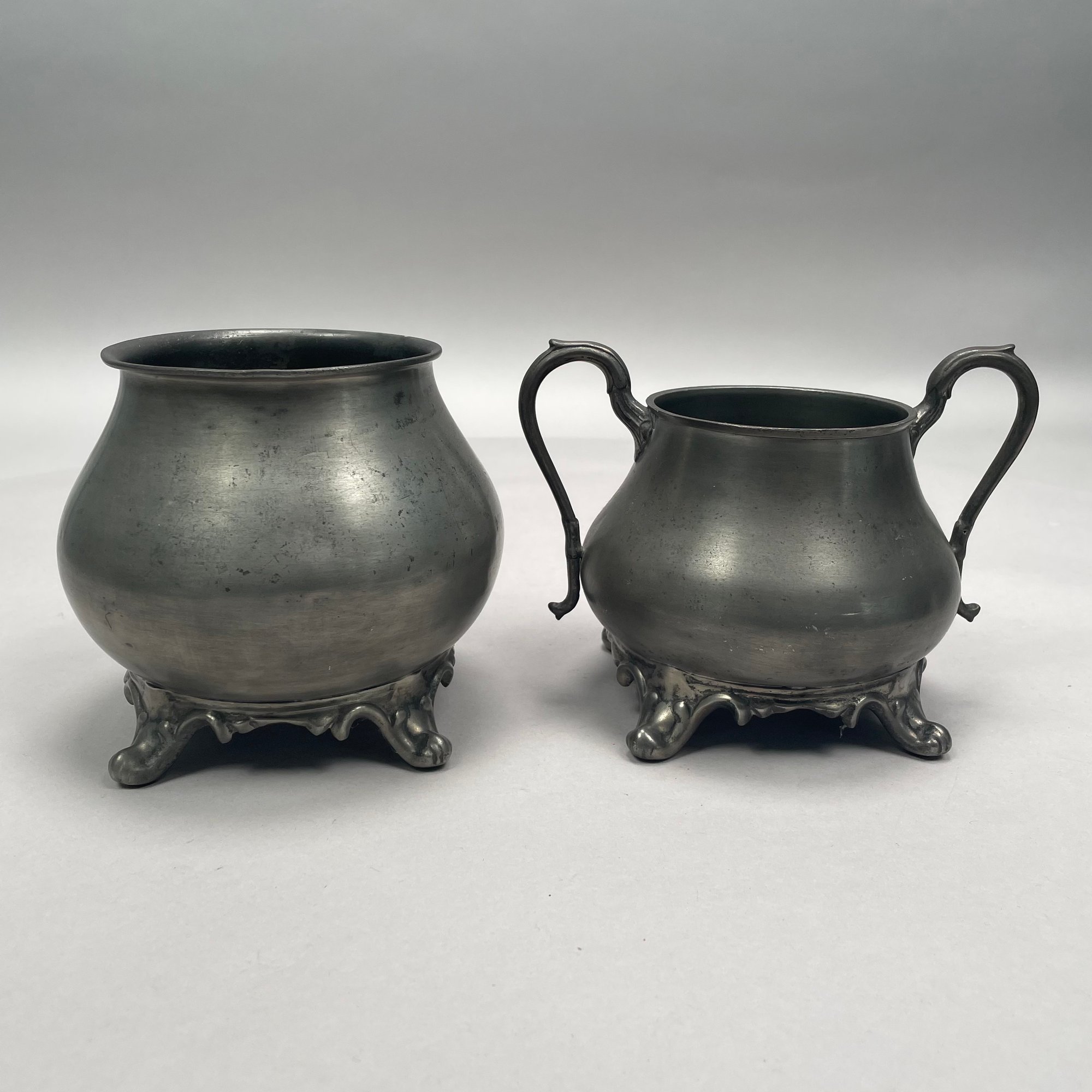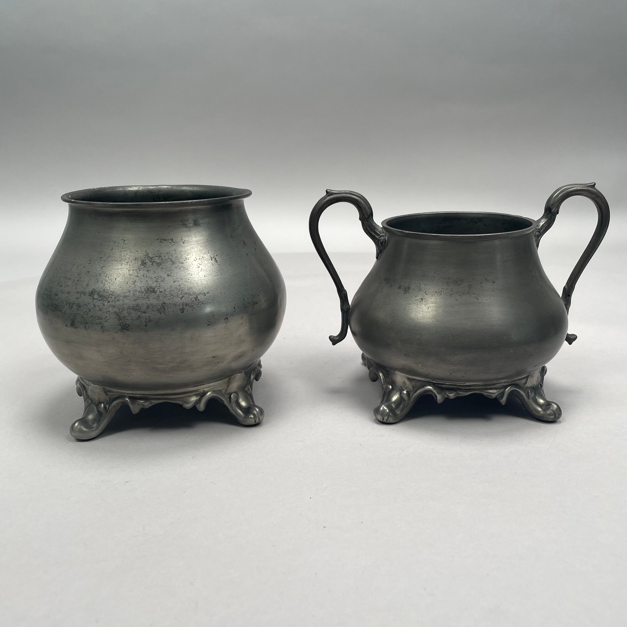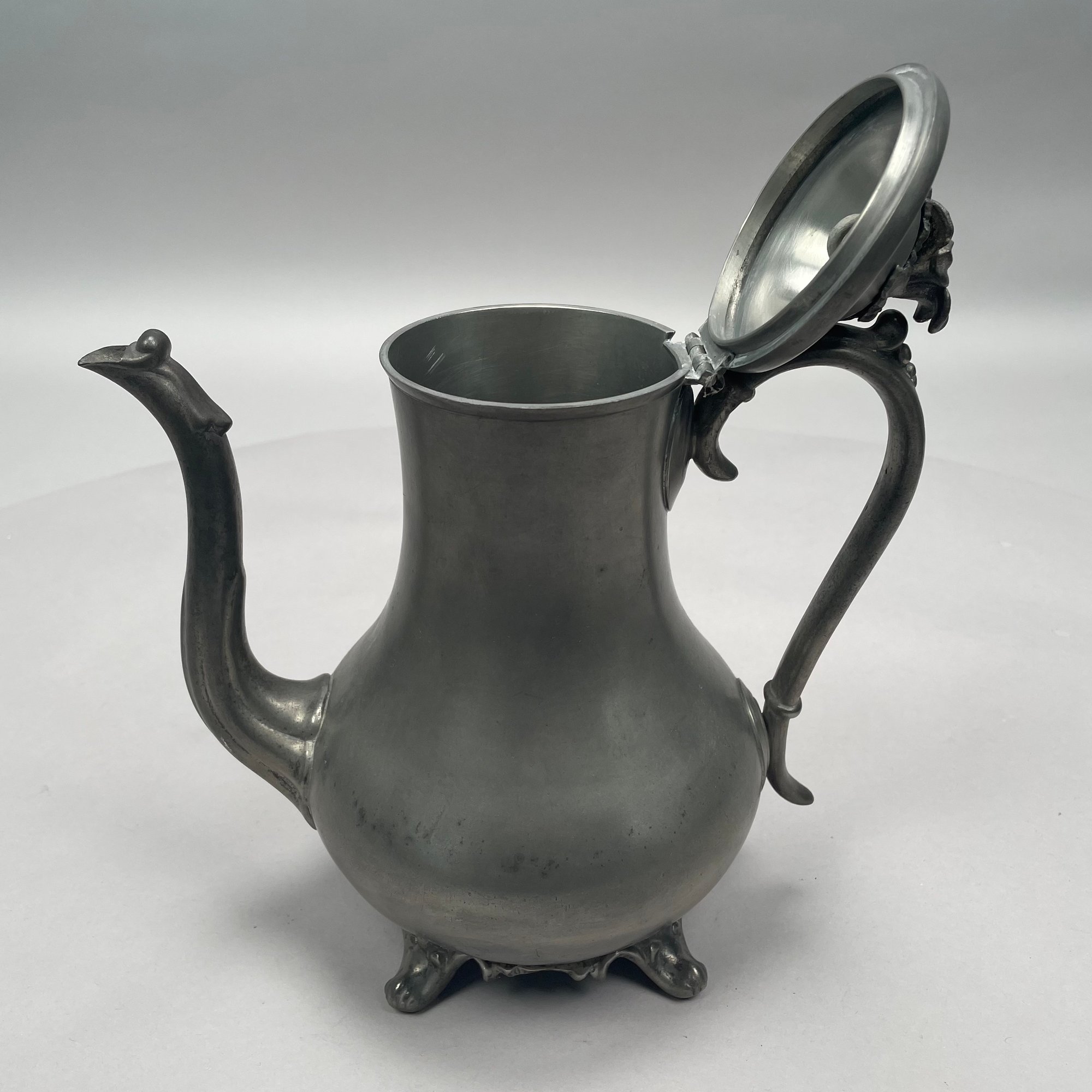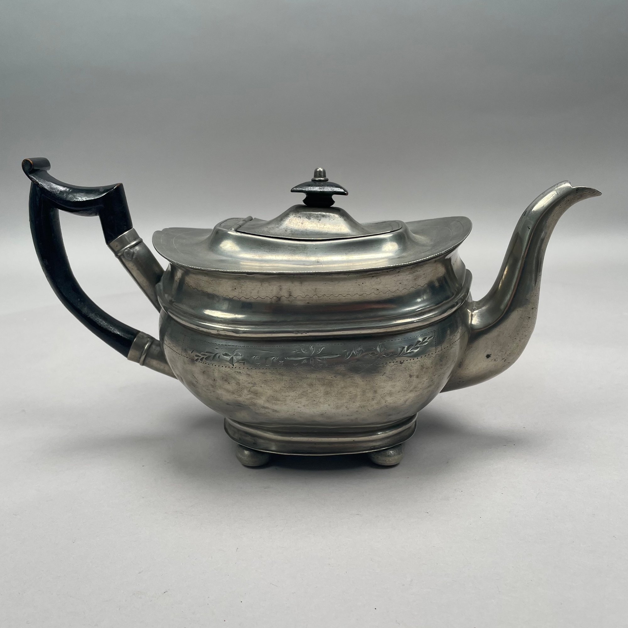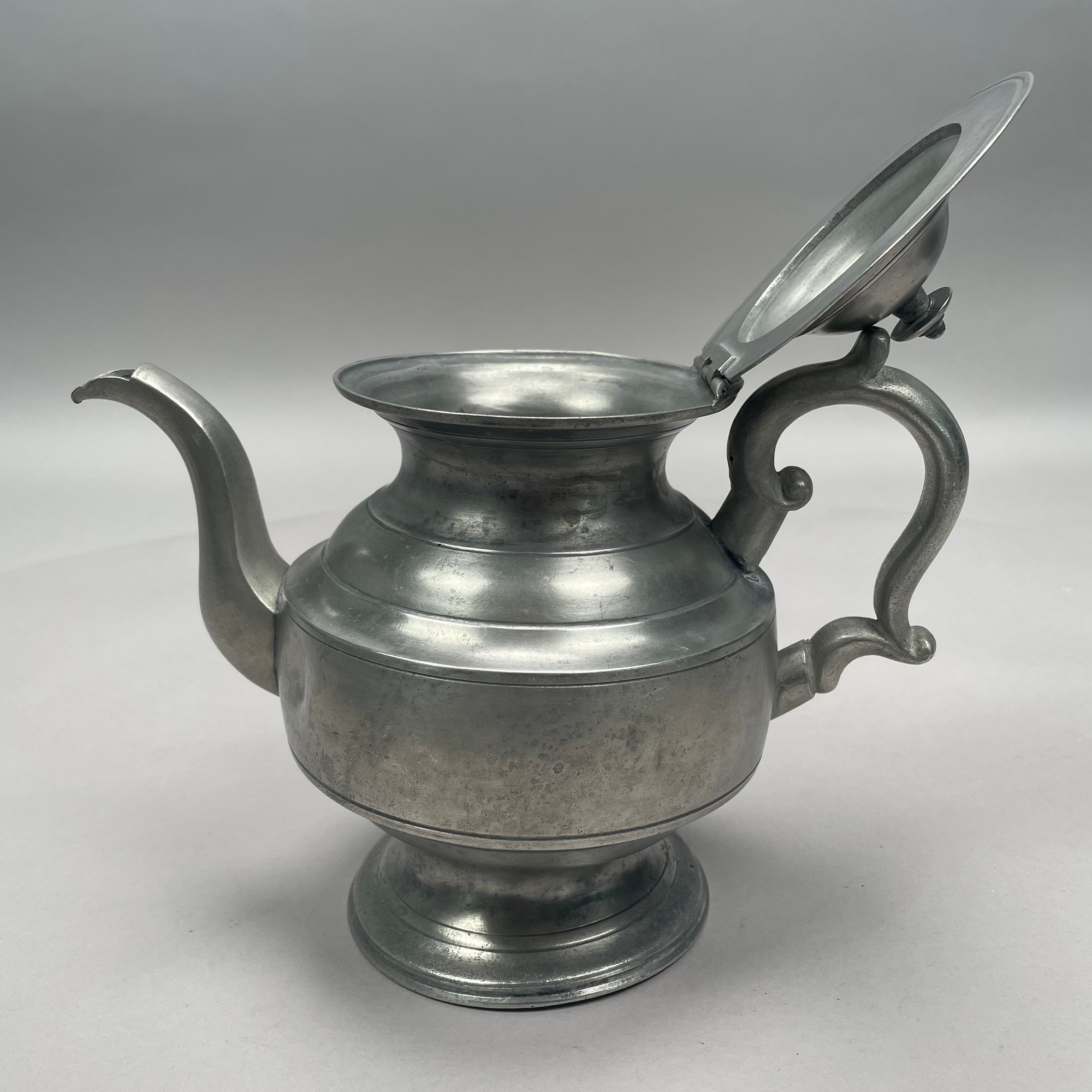Group of American Pewter Tea and Coffee Wares, Nineteenth Century. Comprising a five piece tea and coffee service, retailed by John H. Whitlock, Troy, New York, 1836-44; the remaining comprising a teapot, Willis Humiston, Troy, New York, 1840-60, two teapots (one Boardman, New York), a coffeepot, a sugar bowl and cover; and a Pairpoint Mfg. Co. silverplate sugar bowl. (11)