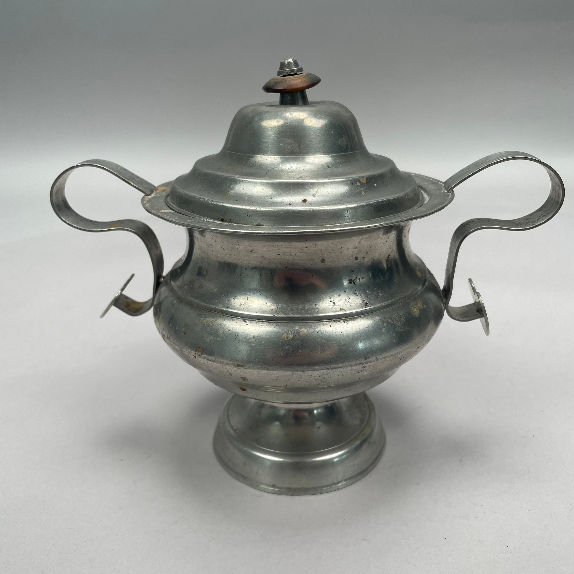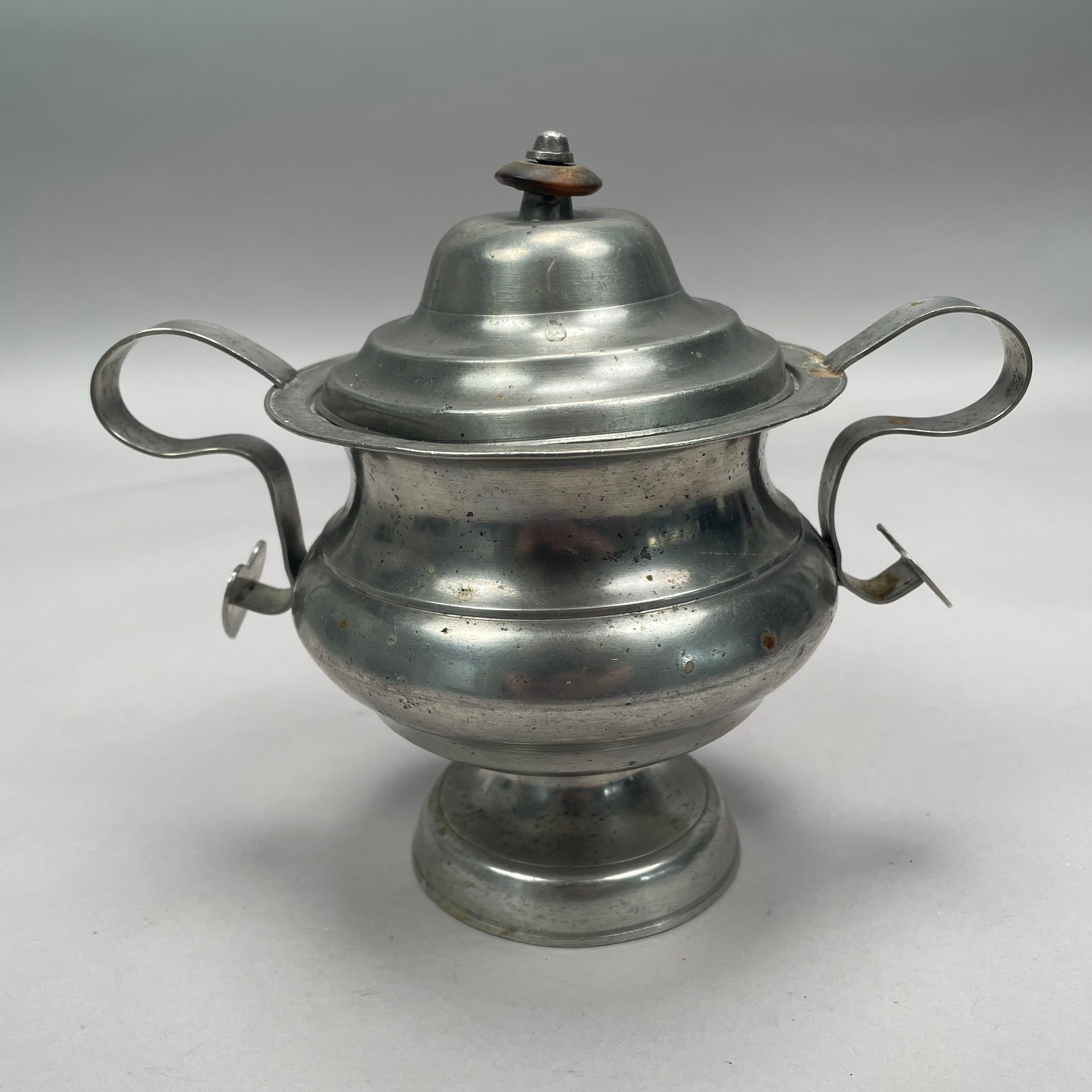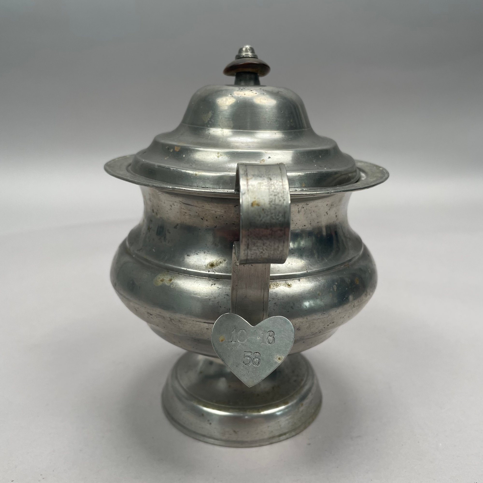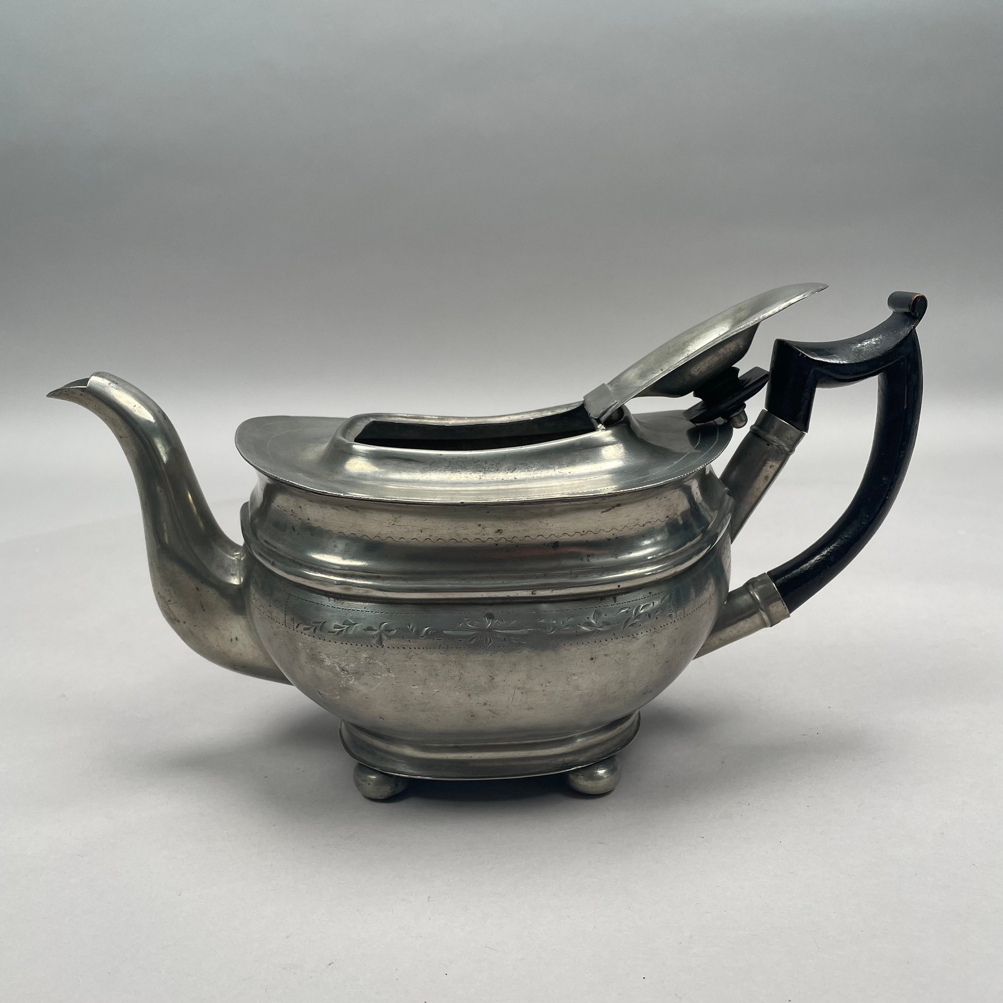 Group of American Pewter Tea and Coffee Wares, Nineteenth Century. Comprising a five piece tea and coffee service, retailed by John H. Whitlock, Troy, New York, 1836-44; the remaining comprising a teapot, Willis Humiston, Troy, New York, 1840-60, two teapots (one Boardman, New York), a coffeepot, a sugar bowl and cover; and a Pairpoint Mfg. Co. silverplate sugar bowl. (11)