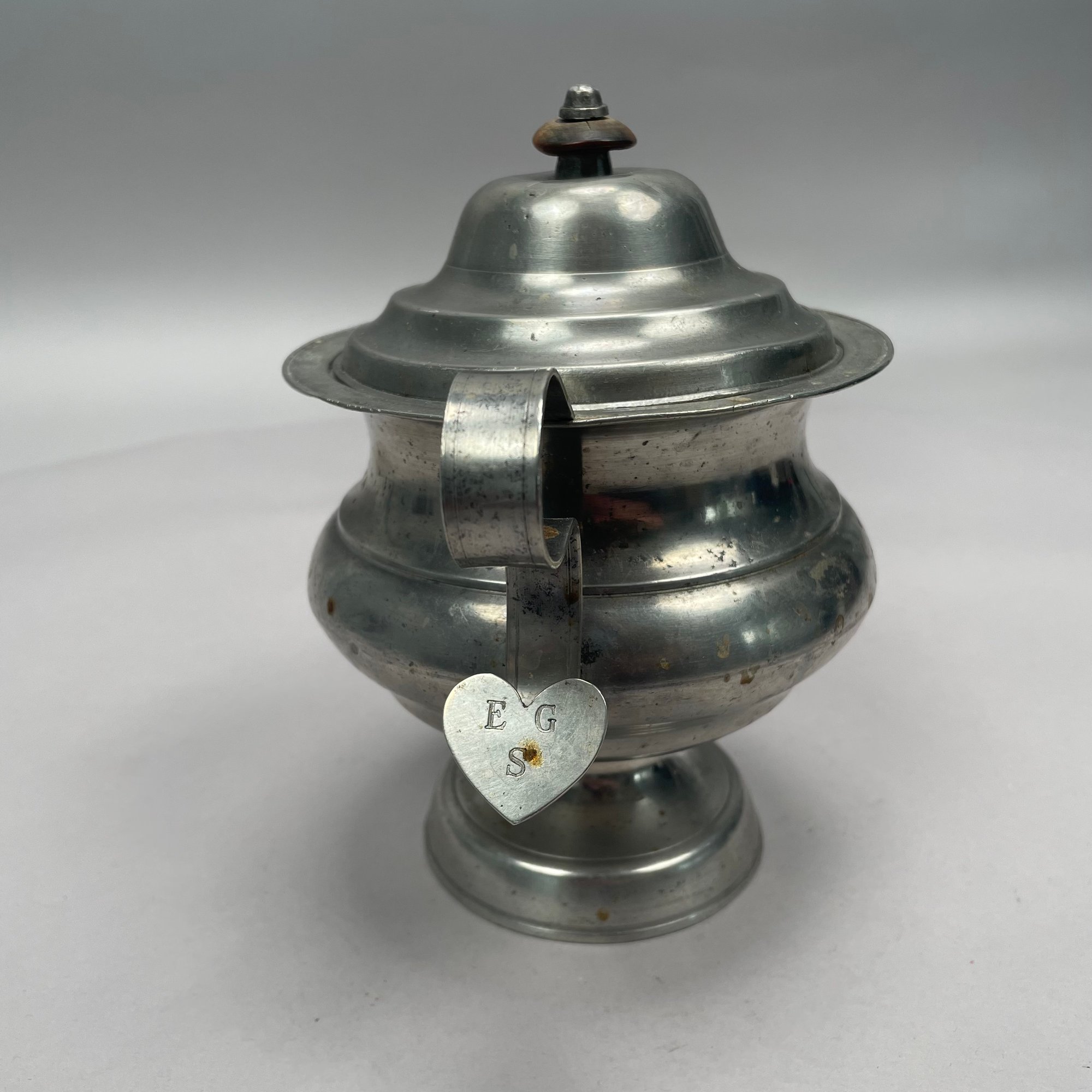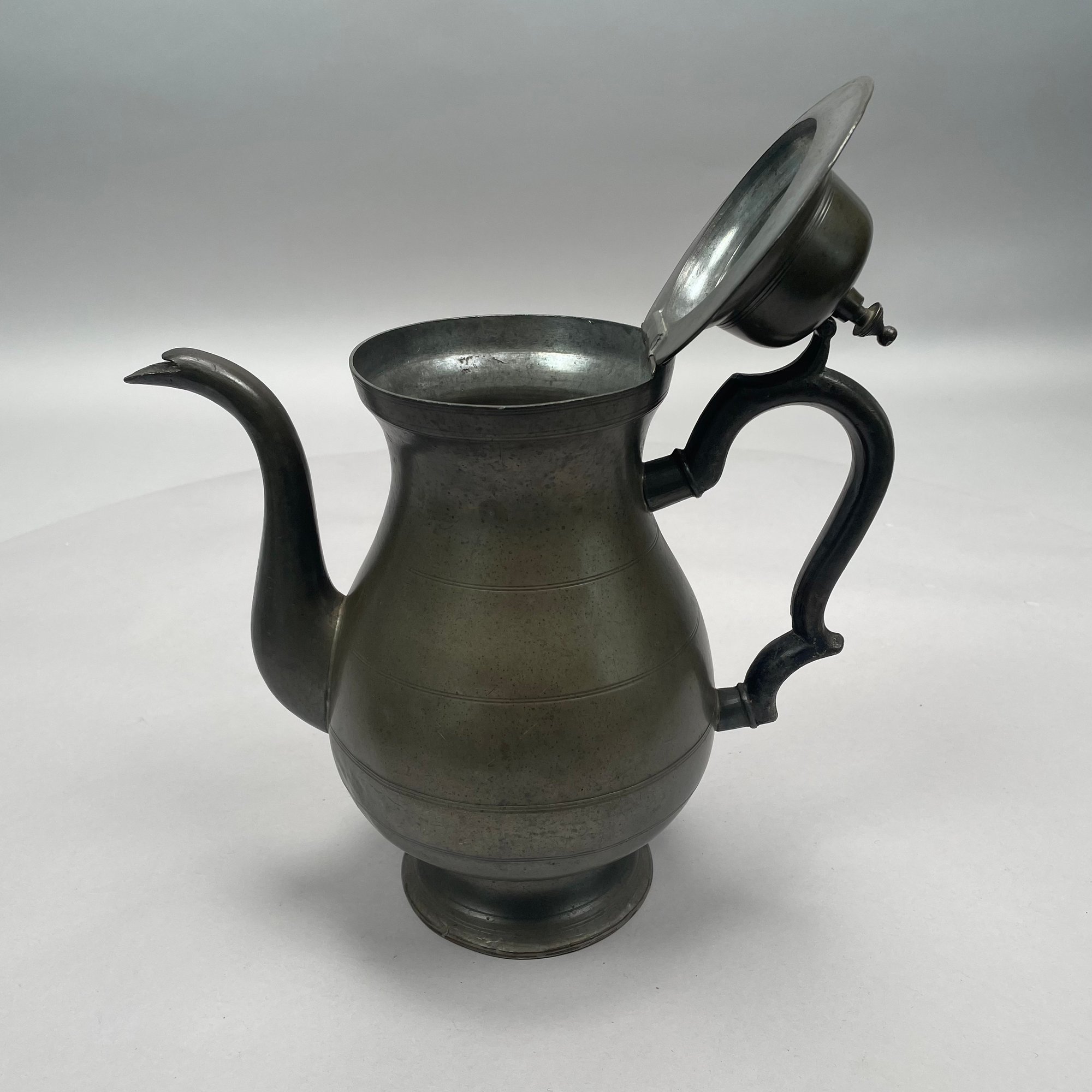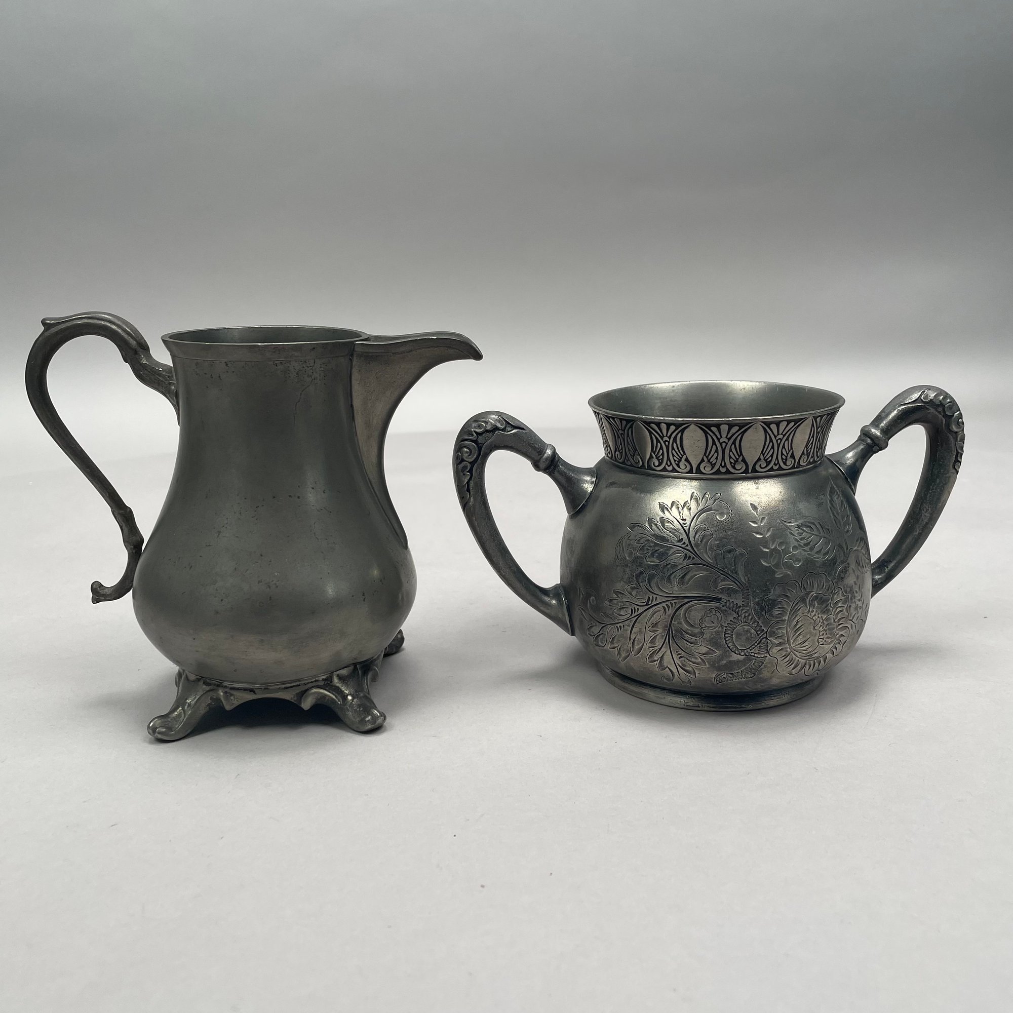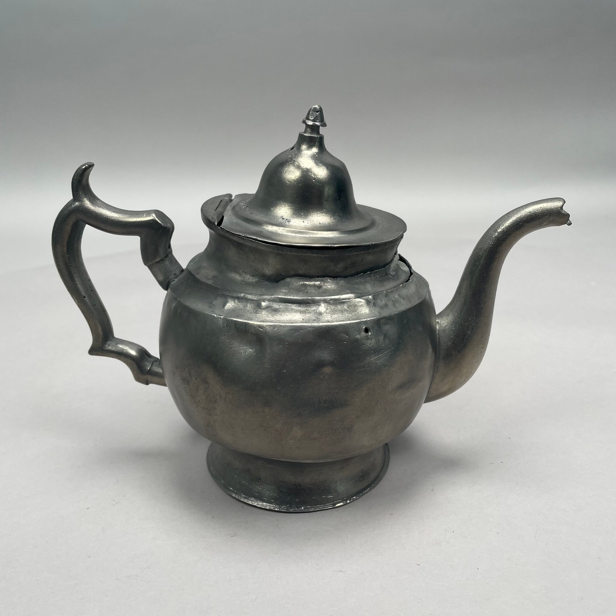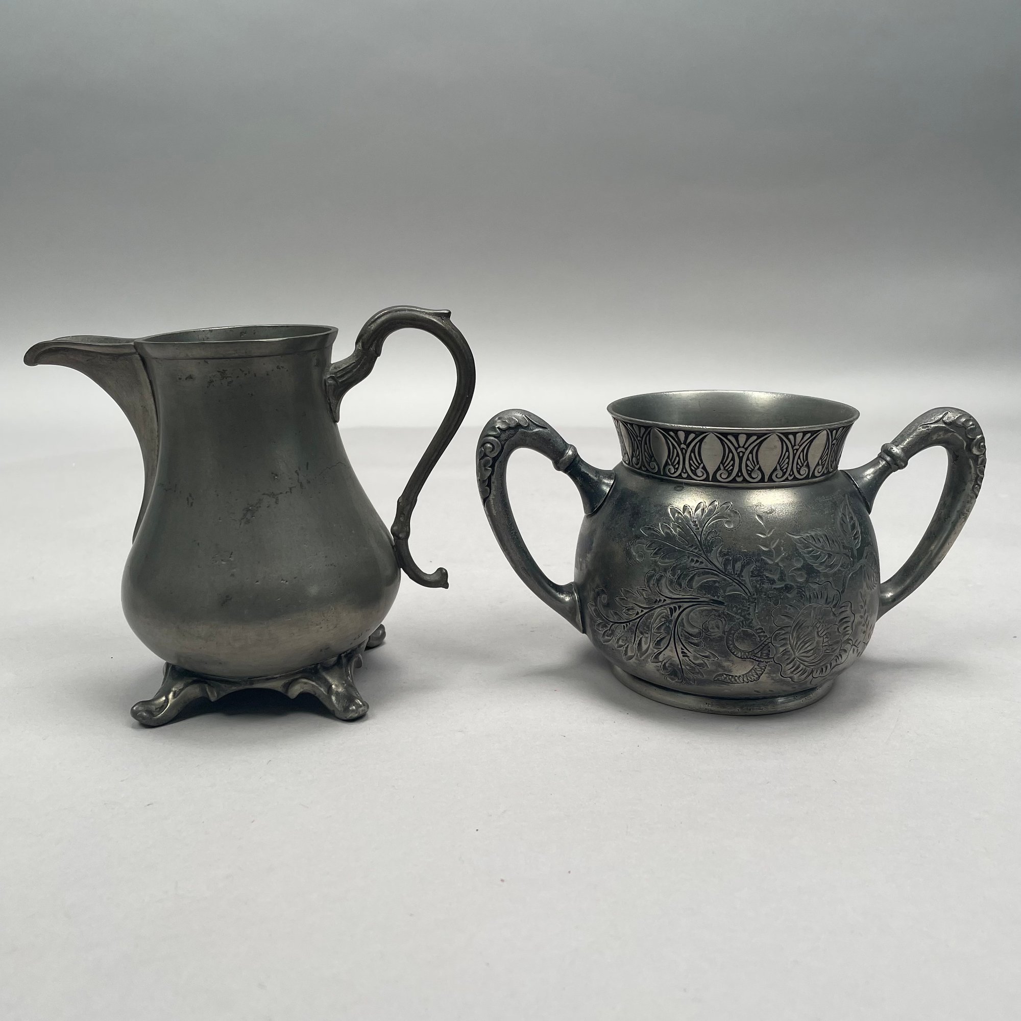 Group of American Pewter Tea and Coffee Wares, Nineteenth Century. Comprising a five piece tea and coffee service, retailed by John H. Whitlock, Troy, New York, 1836-44; the remaining comprising a teapot, Willis Humiston, Troy, New York, 1840-60, two teapots (one Boardman, New York), a coffeepot, a sugar bowl and cover; and a Pairpoint Mfg. Co. silverplate sugar bowl. (11)