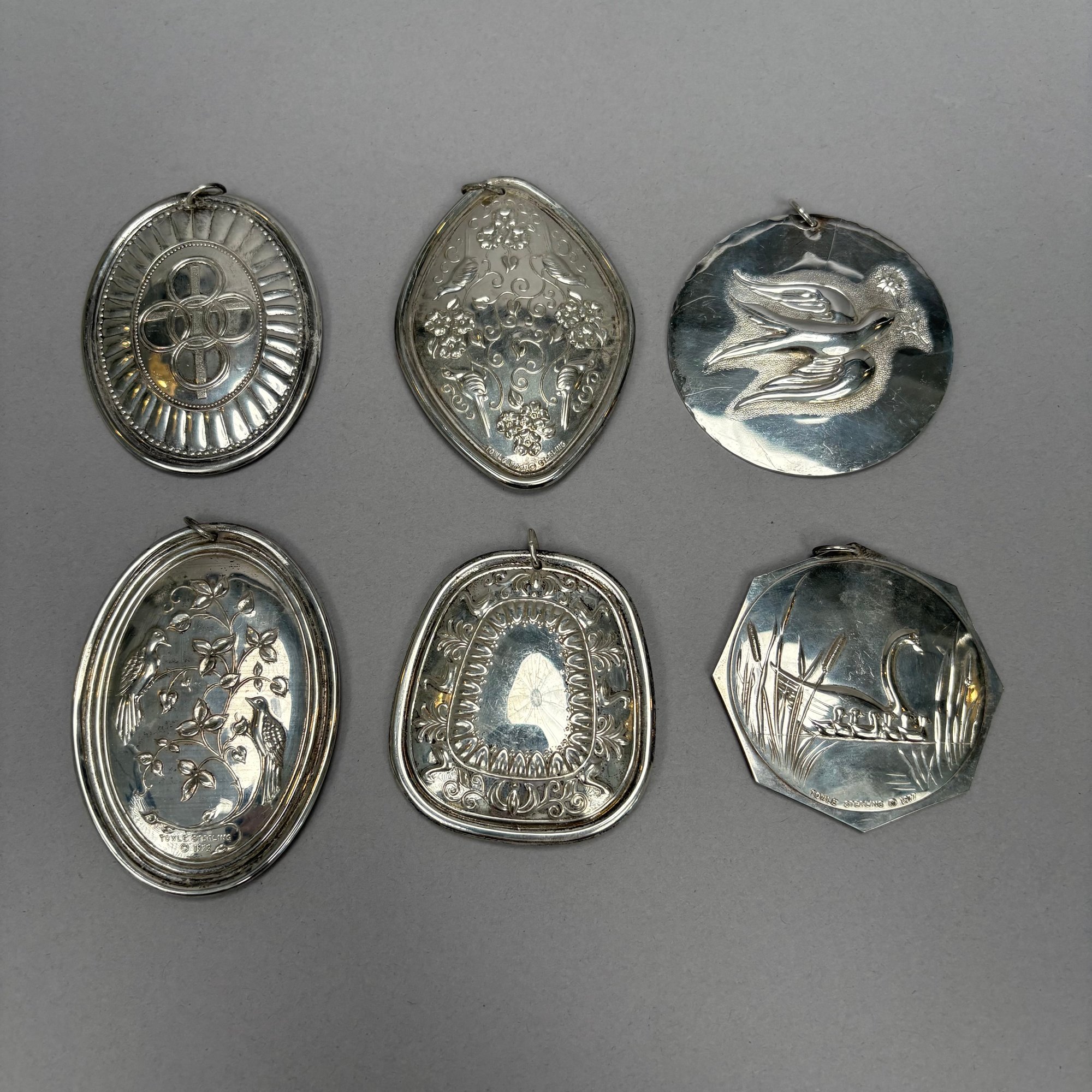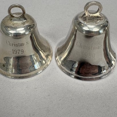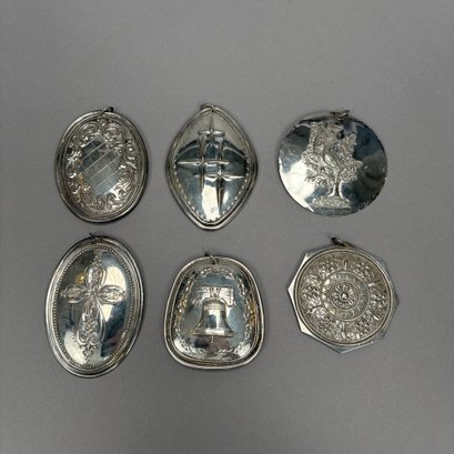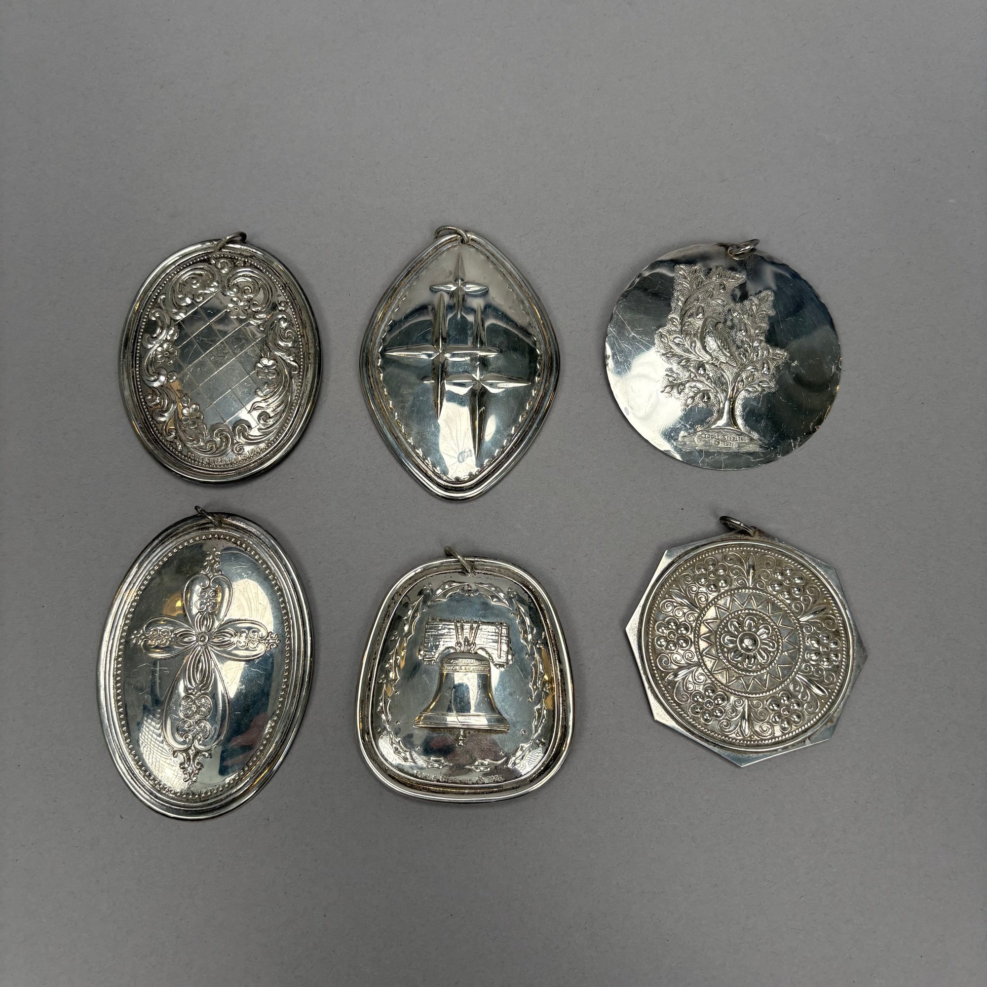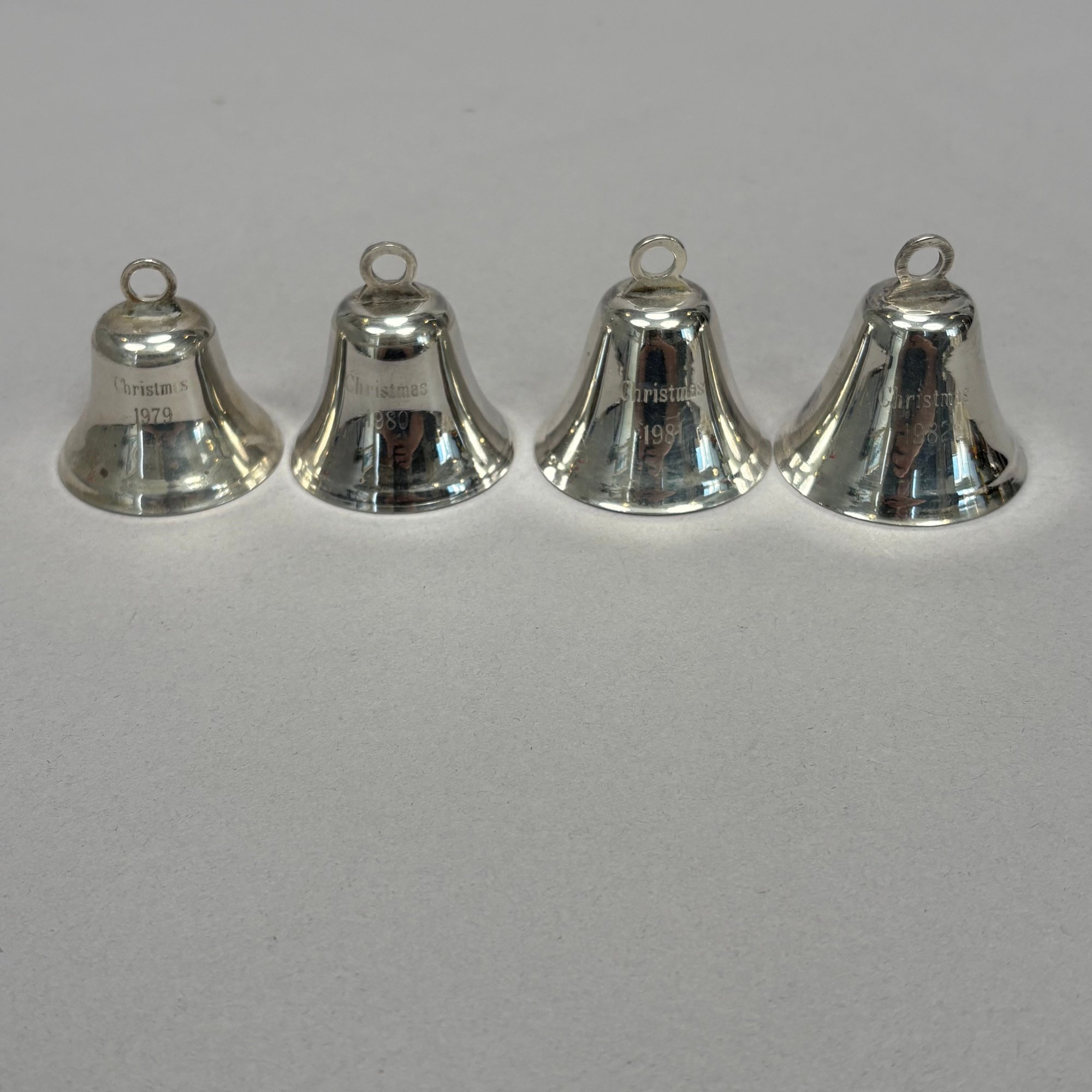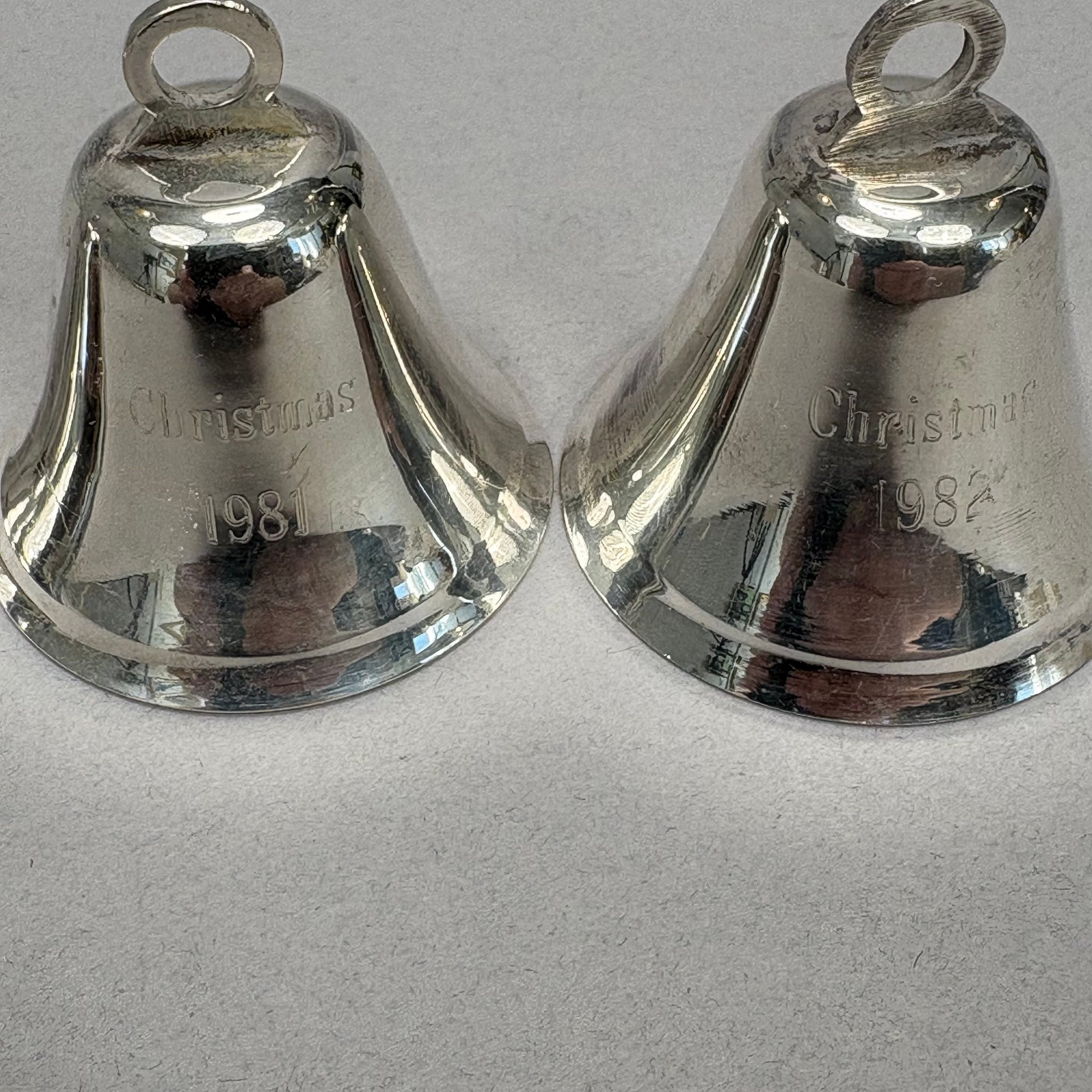 Group of American Sterling Silver and Silverplate Christmas and Table Objects, Various Makers, 20th Century. Comprising six Christmas ornaments for the years 1971-1972 and 1974-1977, Towle Mfg. Co.; a set of four bells, a desk calendar (not weighed), two dressing table jars and covers (one cover silverplate), a square engraved lipstick container with mirror, a children's brush, a shoe horn, napkin ring, pie server, and purse frame. (19)