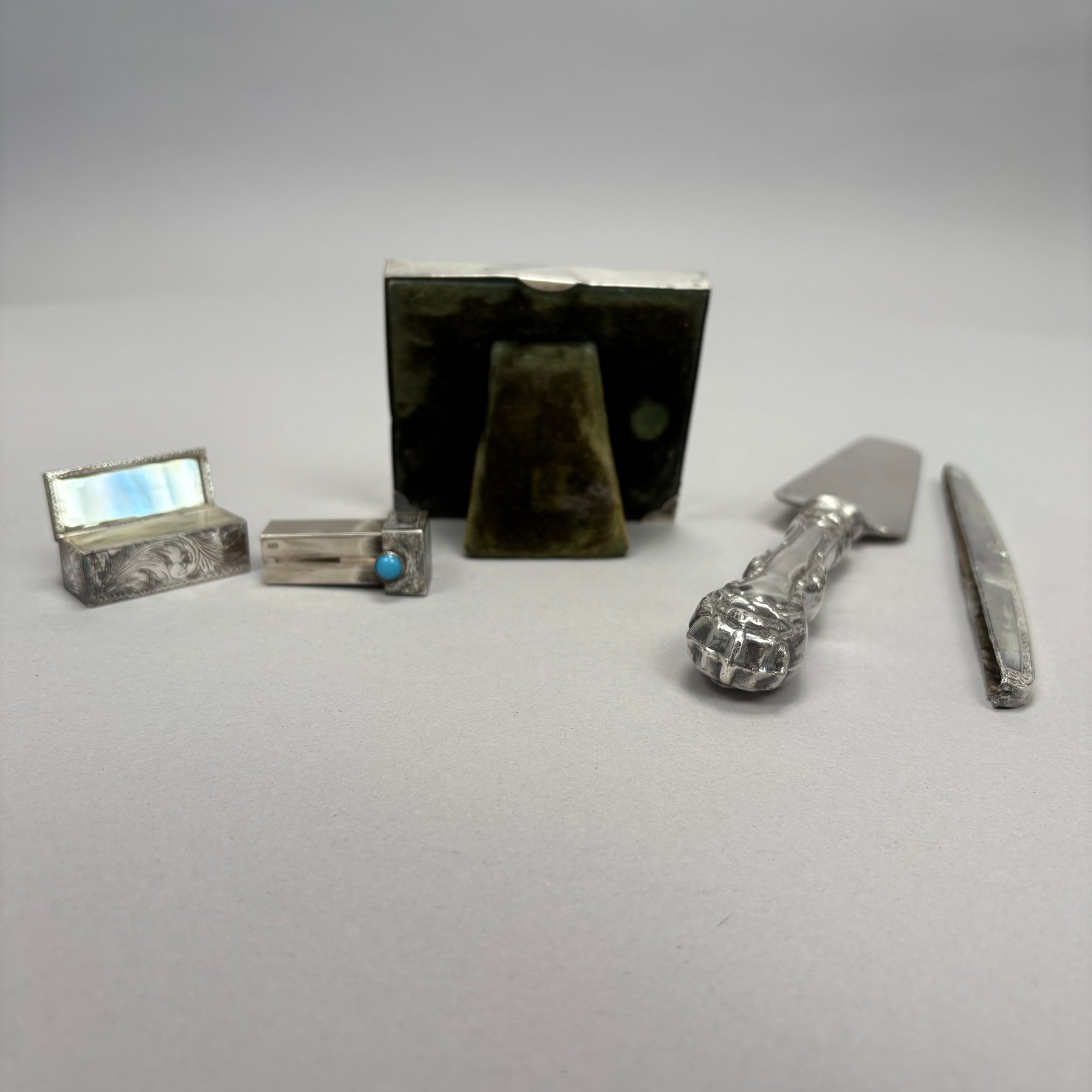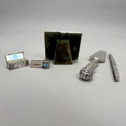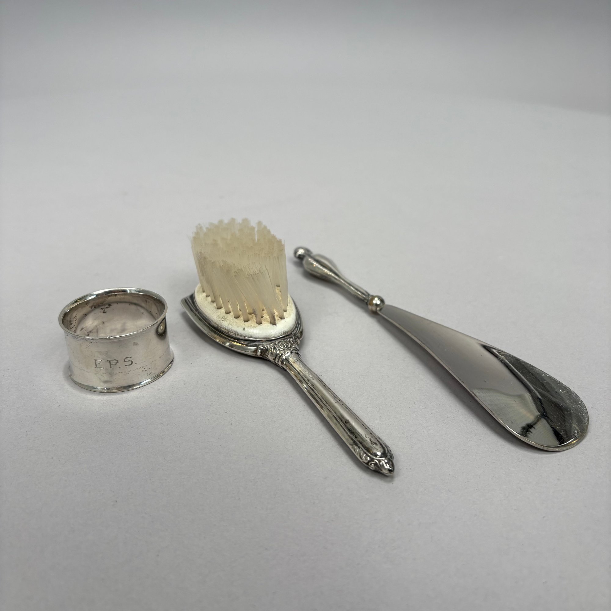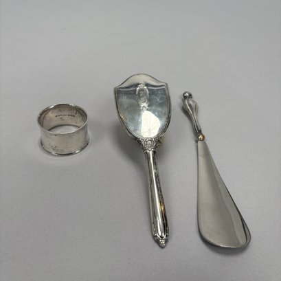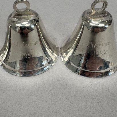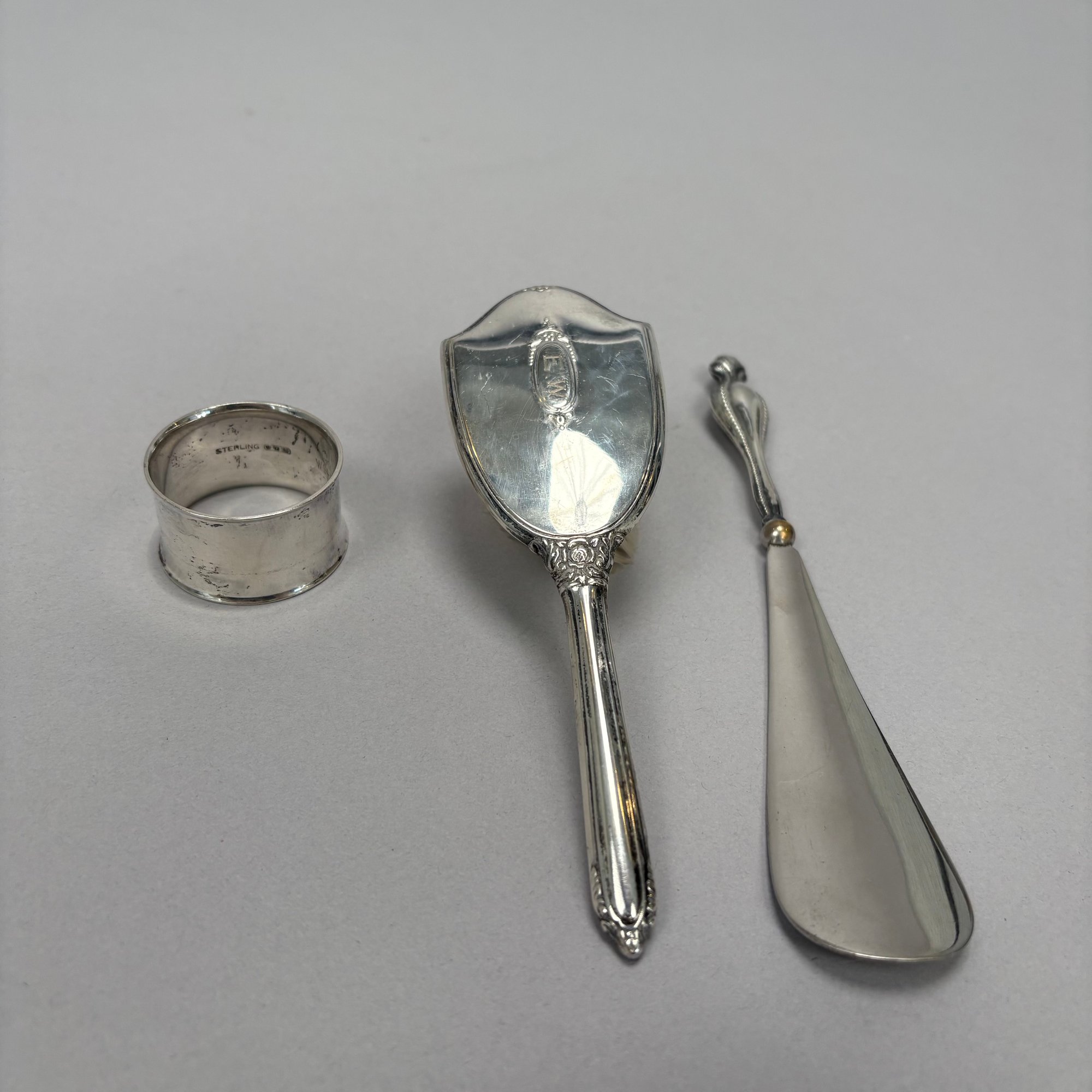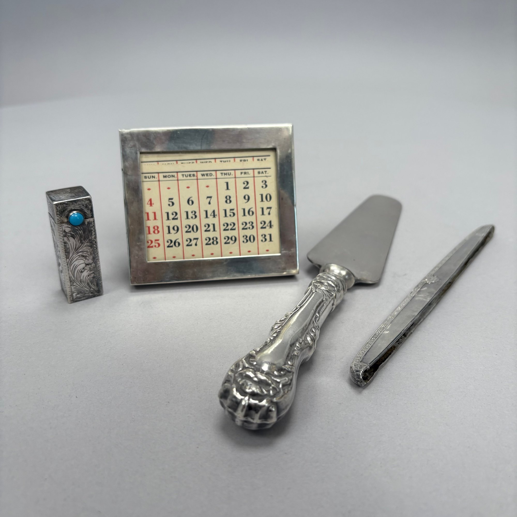 Group of American Sterling Silver and Silverplate Christmas and Table Objects, Various Makers, 20th Century. Comprising six Christmas ornaments for the years 1971-1972 and 1974-1977, Towle Mfg. Co.; a set of four bells, a desk calendar (not weighed), two dressing table jars and covers (one cover silverplate), a square engraved lipstick container with mirror, a children's brush, a shoe horn, napkin ring, pie server, and purse frame. (19)