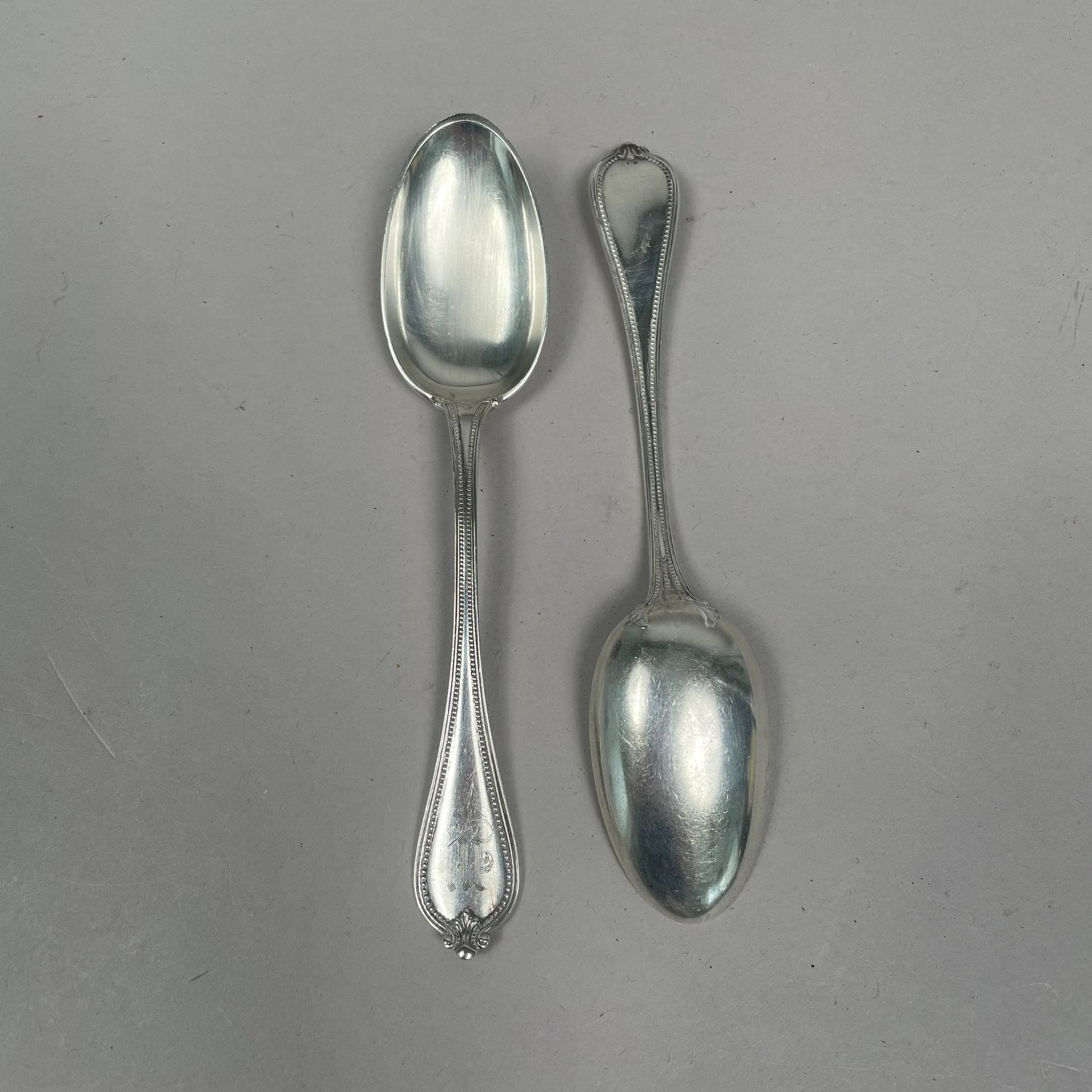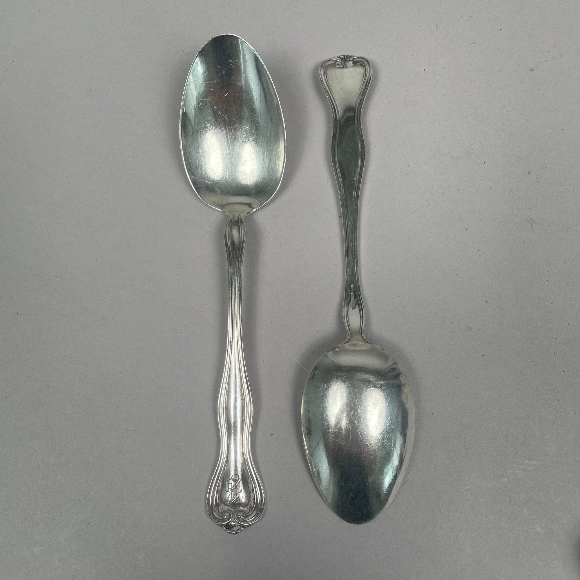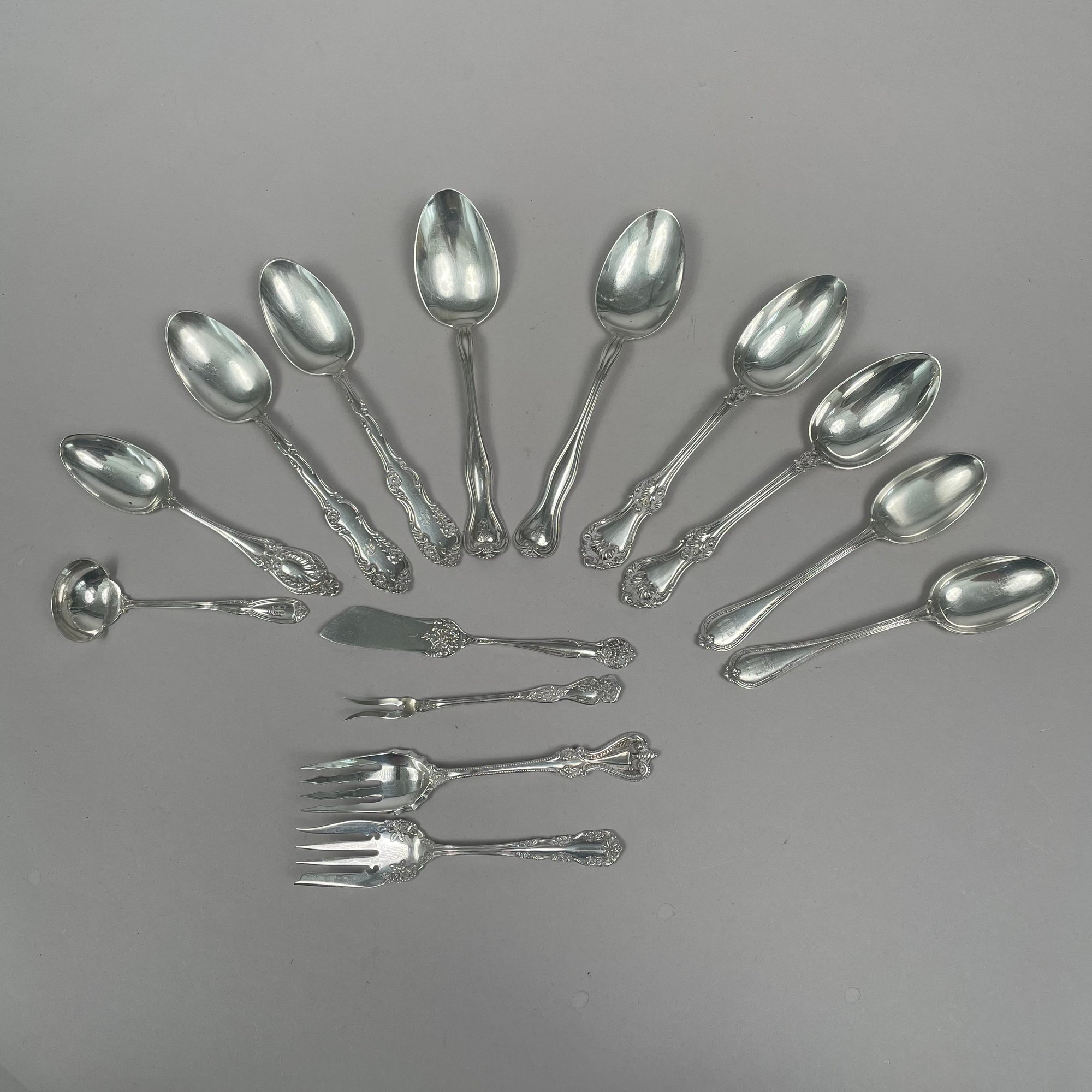 Group of American Sterling Silver Flatware, Twentieth Century. Including a pair of 'Old English' pattern tablespoons designed by George P. Tilton, Towle Silversmiths/ Mfg. Co., Newburyport, Massachusetts, 1892-1996; and a pair of 'Corinthian' pattern tablespoons designed by Theodore Bender, Roger Williams Silver Co., introduced in 1902, various monograms and marks. (14)