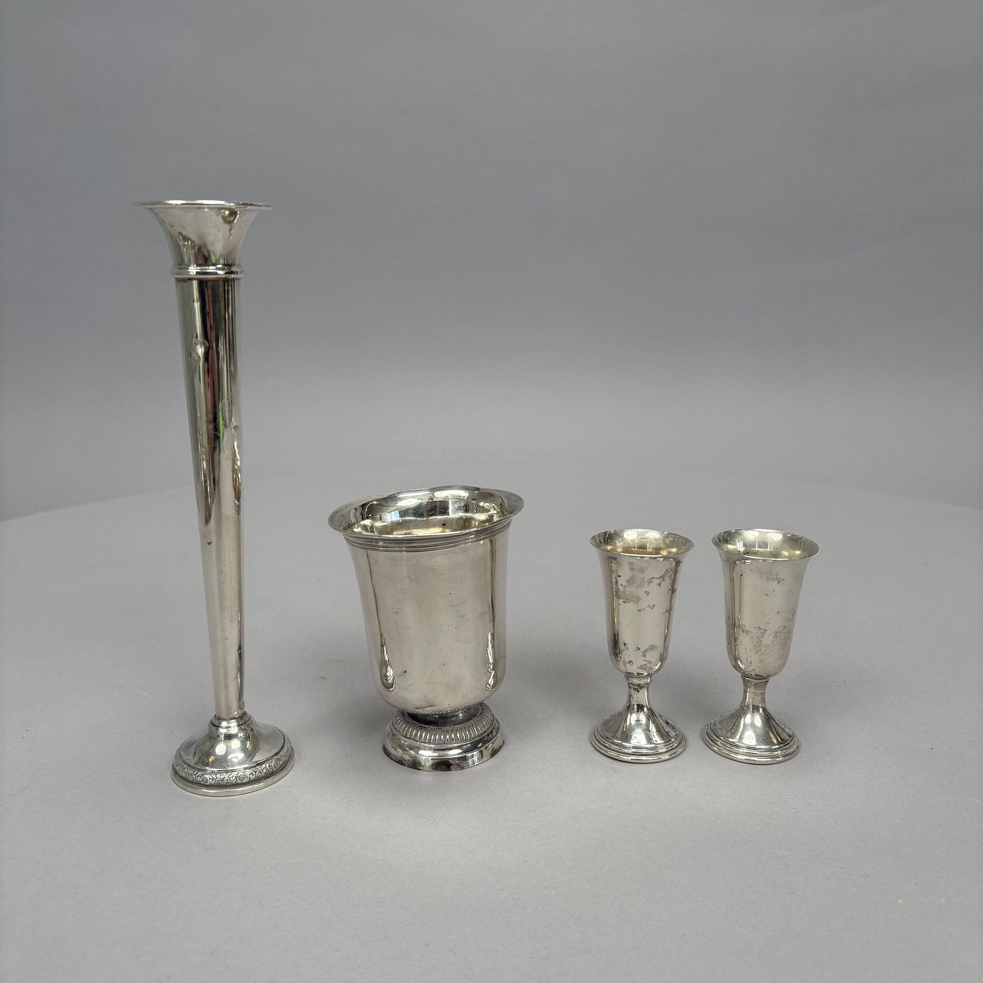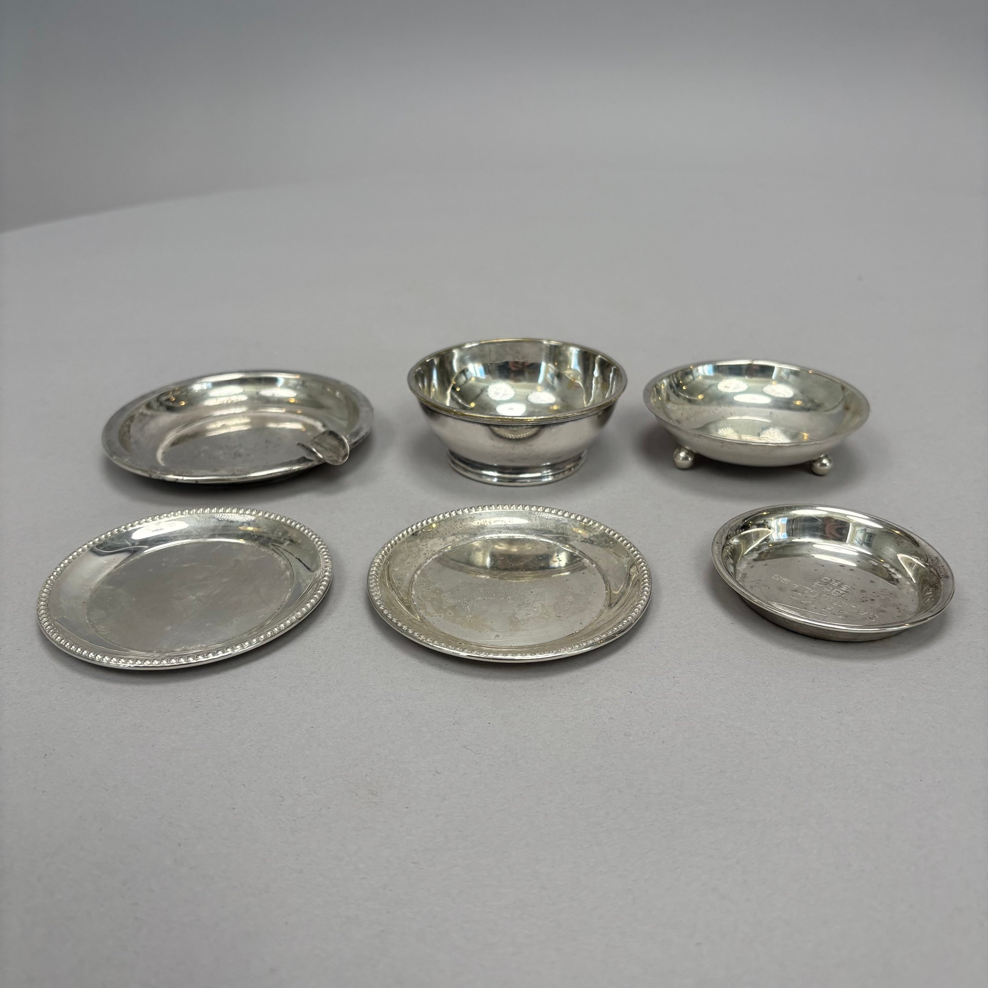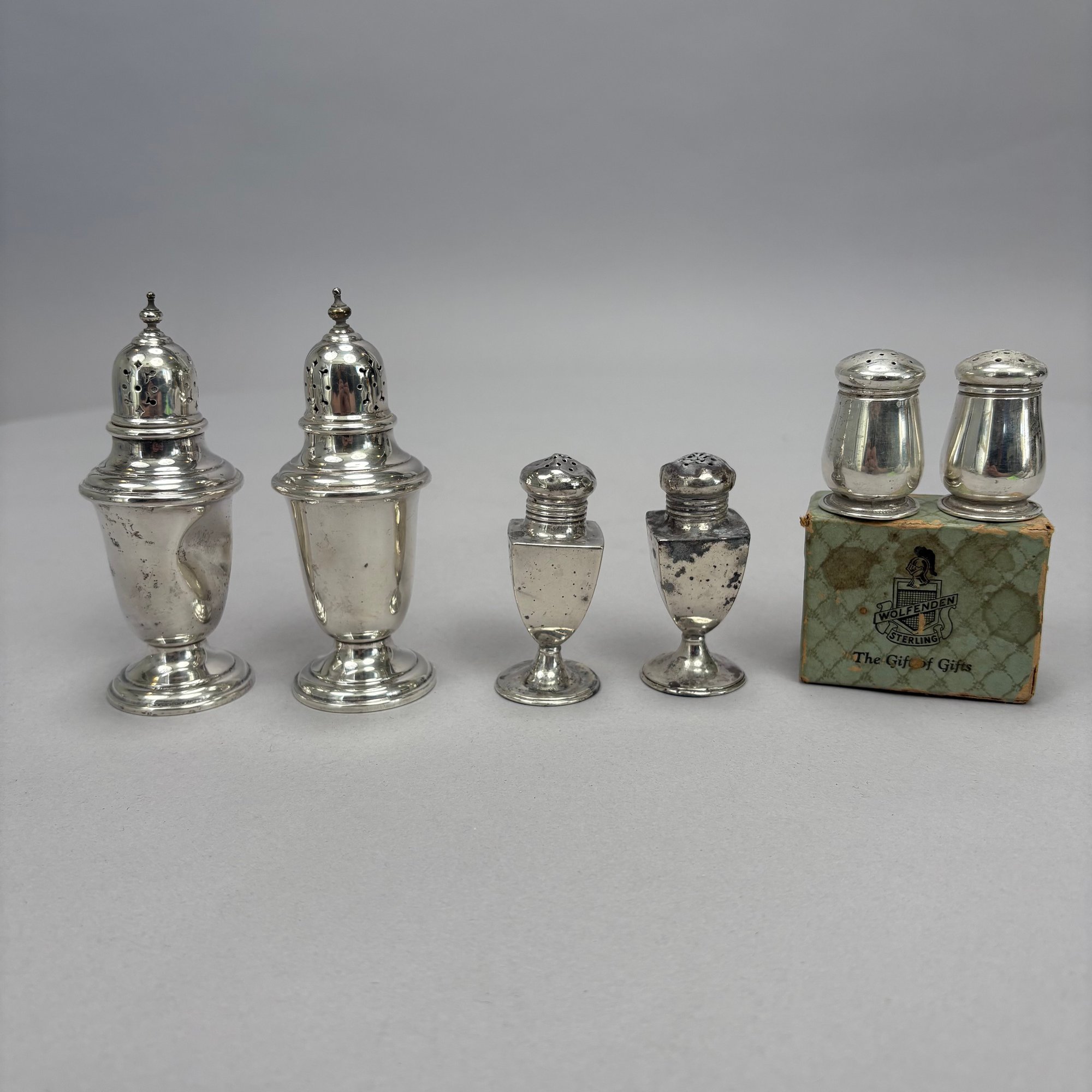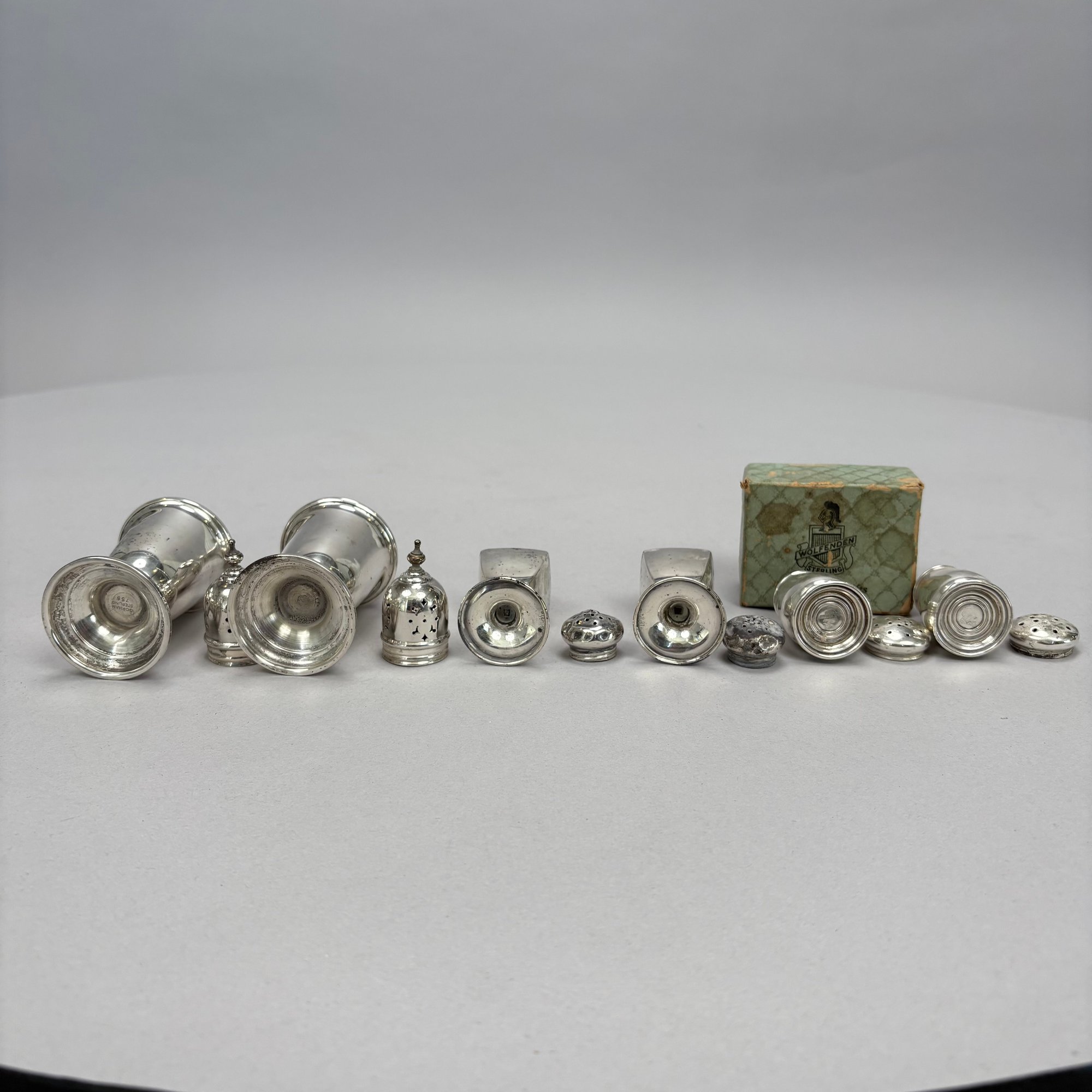 Group of American Sterling Silver Table Objects, Various Makers, 20th Century. Comprising a children's porringer, Udall & Ballou, New York, New York; a pair of boxed salt shakers, Wolfenden; and assorted bowls, liners, cups, nut dishes, shakers and casters, pair of salt cellars, vases and scrap items.