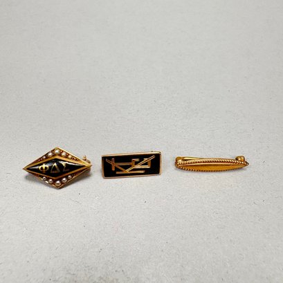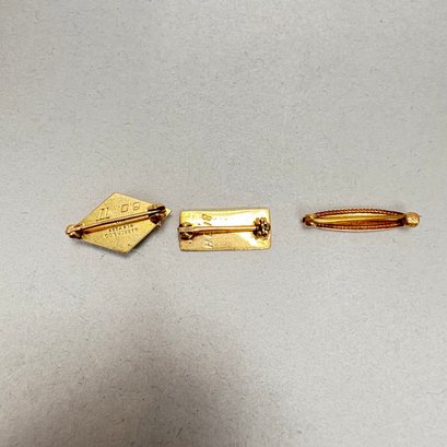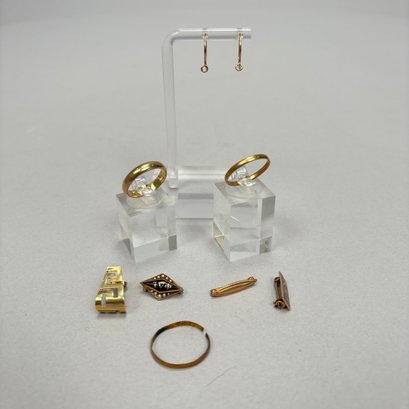 Group of Assorted Gold Rings, Earrings and Pins. Comprising three rings, a pair of pierced loop earrings, a single screw-back earring and three small pins. (9)