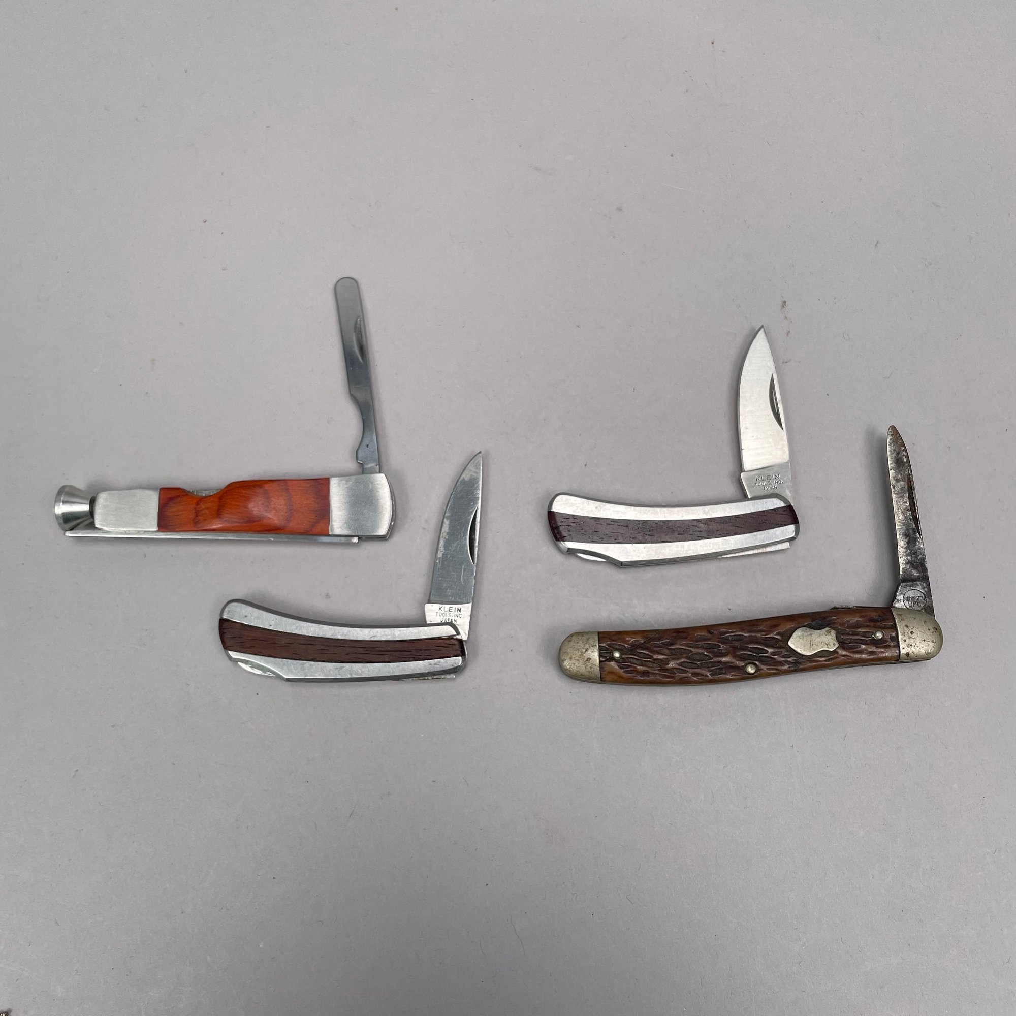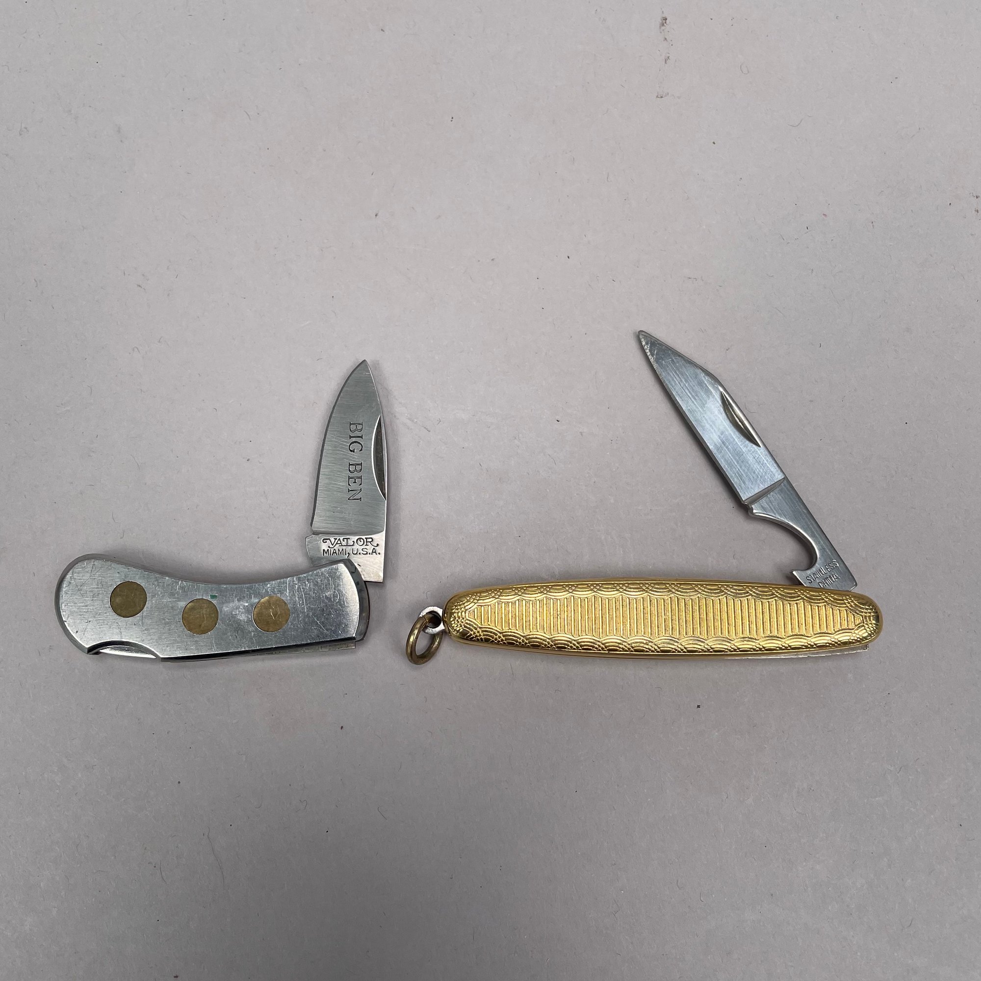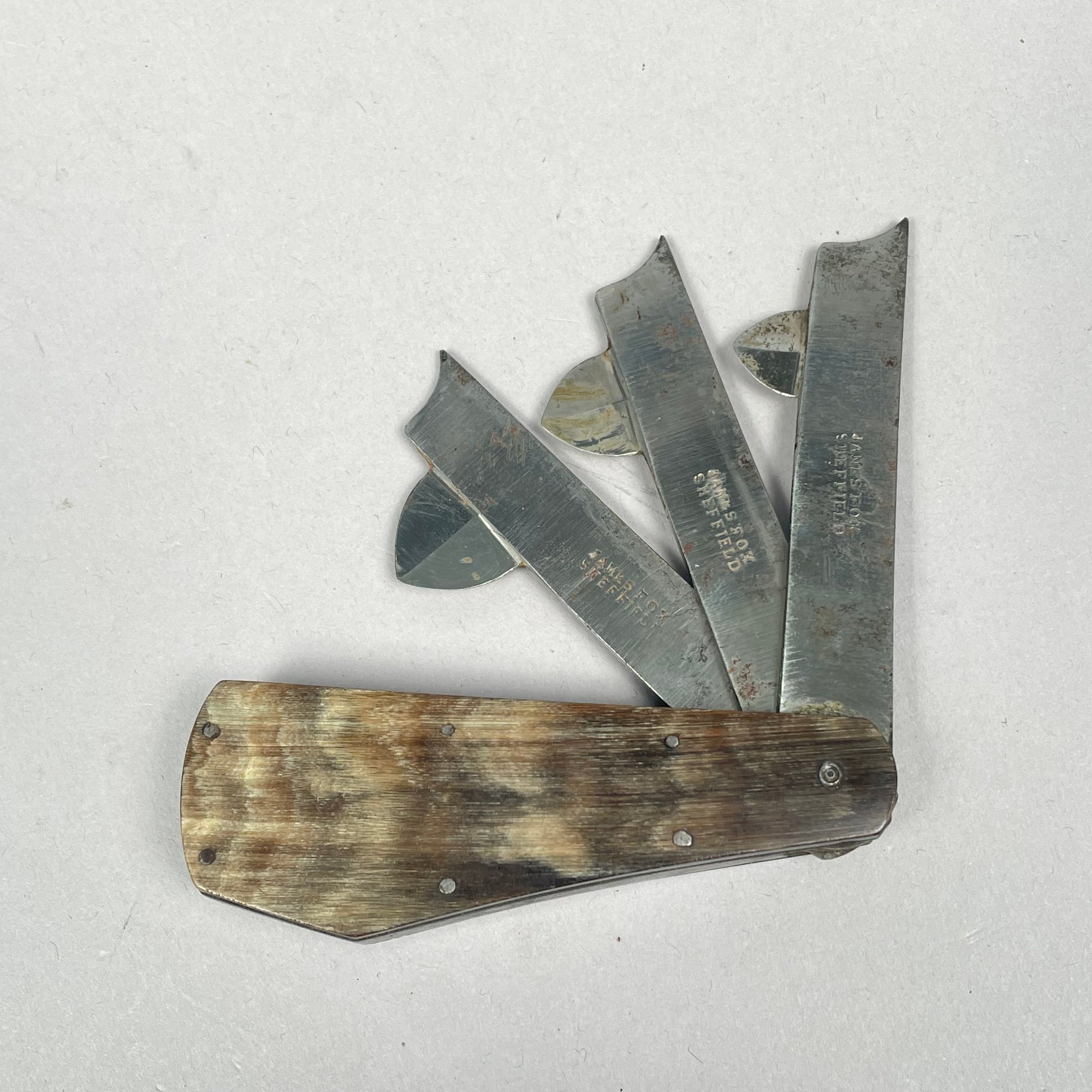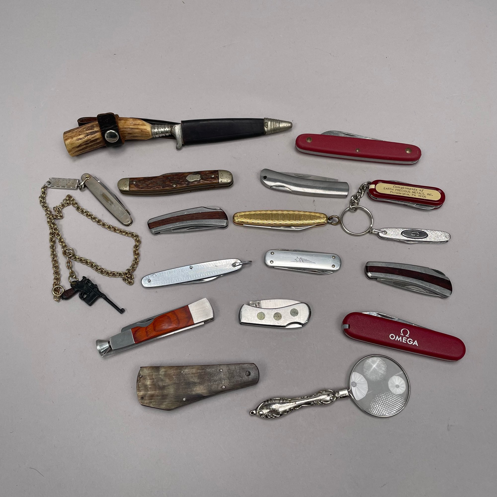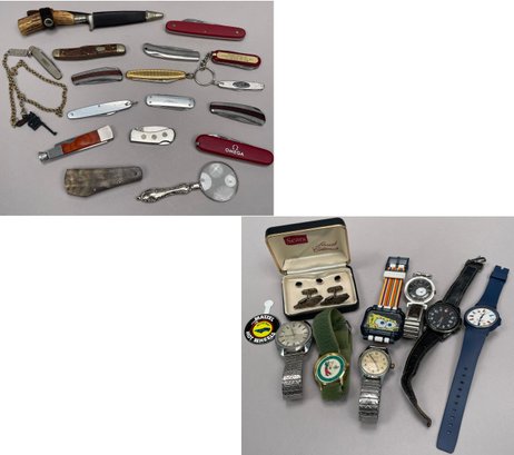Group of Folding and Other Pocket Knives. Including an English horn-handled fleam or blood-letting knife, James Fox, Sheffield; and a knife with antler handle and leather holder, together with group of Gentleman's wrist watches, Boxed Pair of Sears T-Bird Cufflinks and Three Collar Studs.