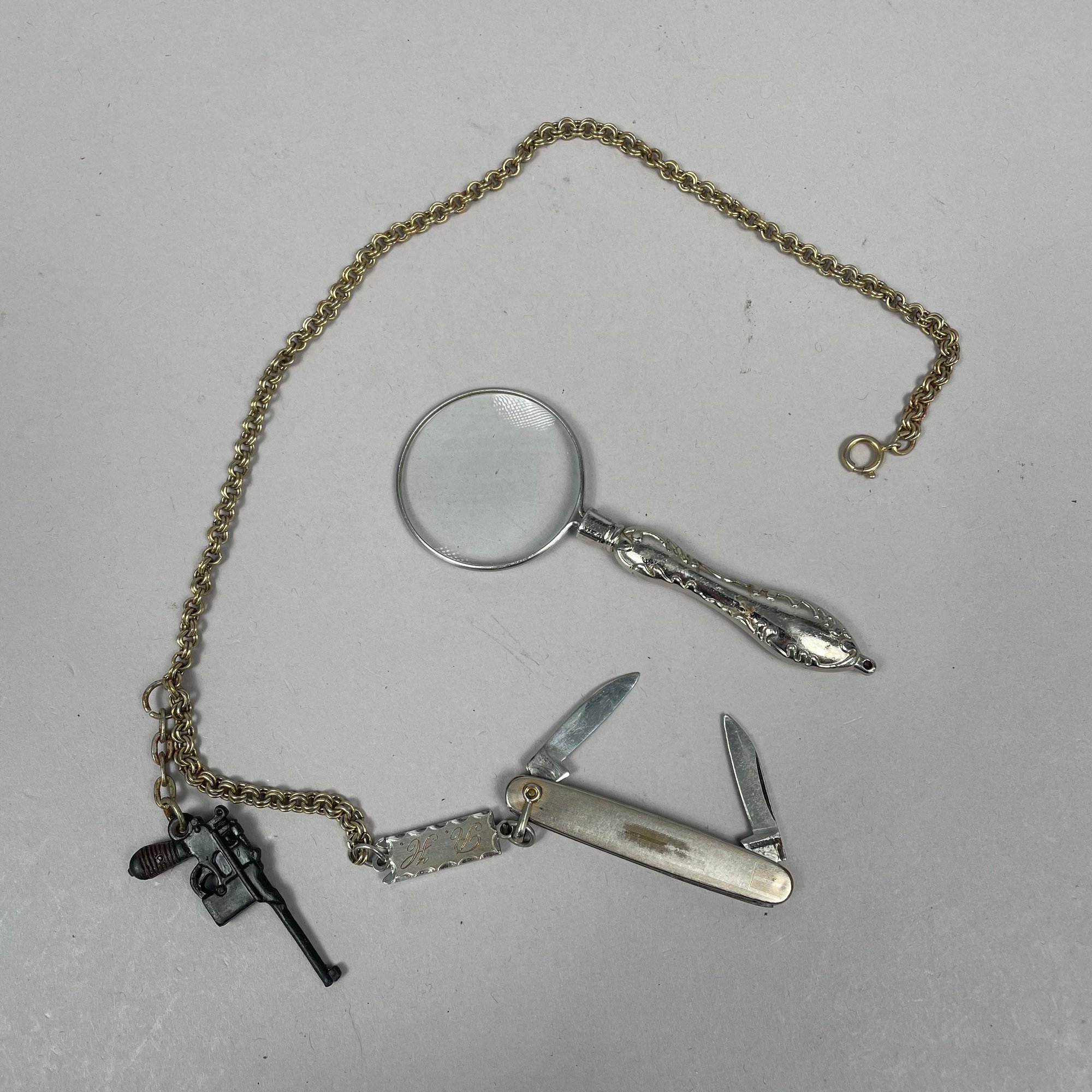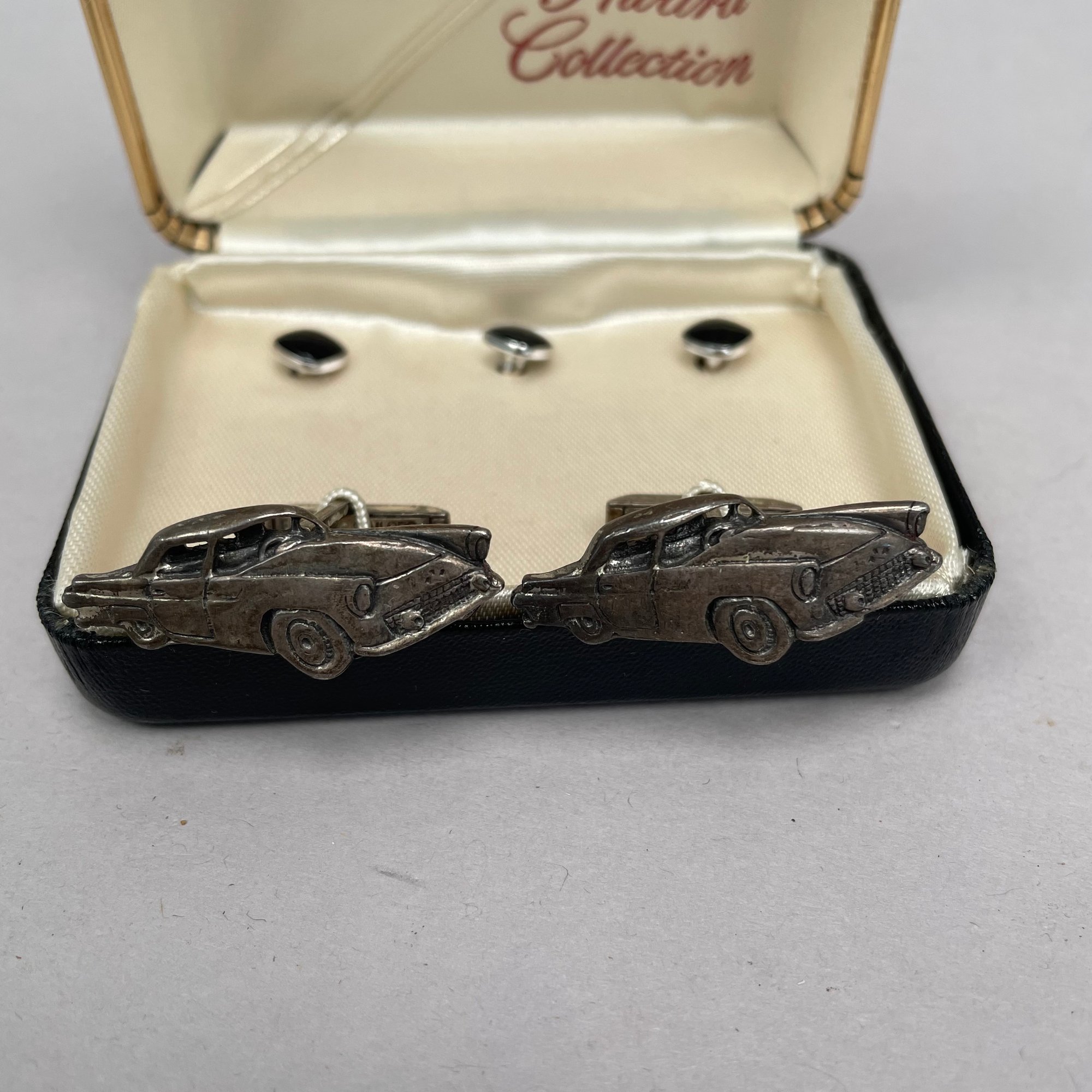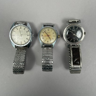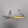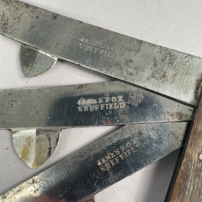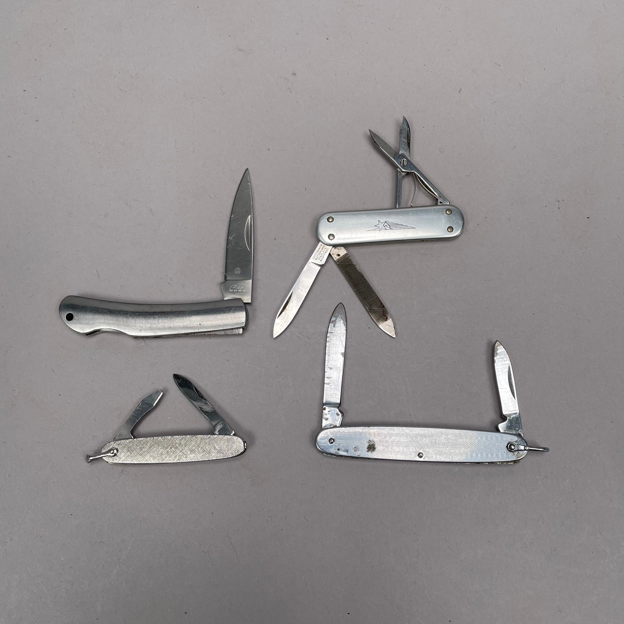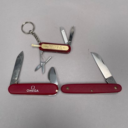 Group of Folding and Other Pocket Knives. Including an English horn-handled fleam or blood-letting knife, James Fox, Sheffield; and a knife with antler handle and leather holder, together with group of Gentleman's wrist watches, Boxed Pair of Sears T-Bird Cufflinks and Three Collar Studs.