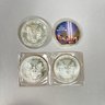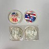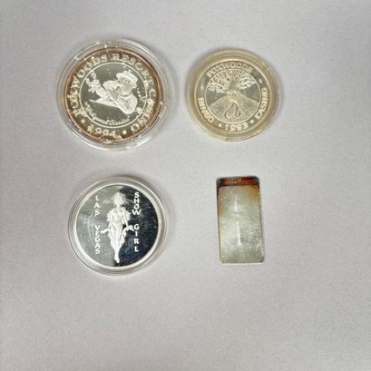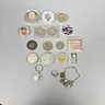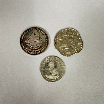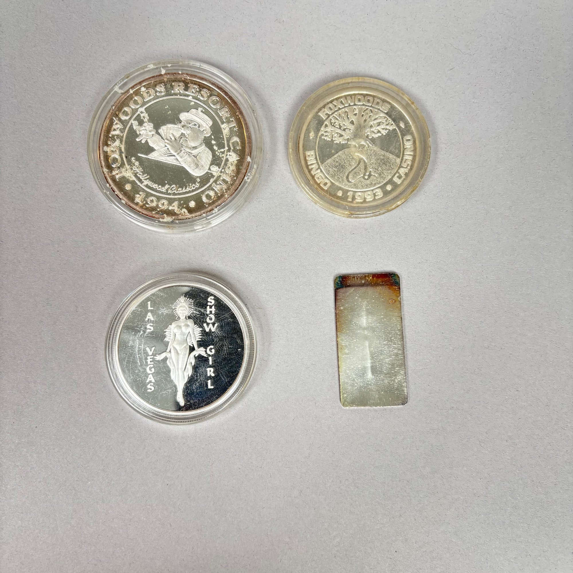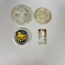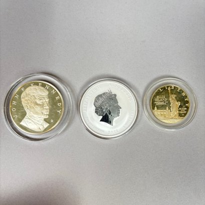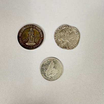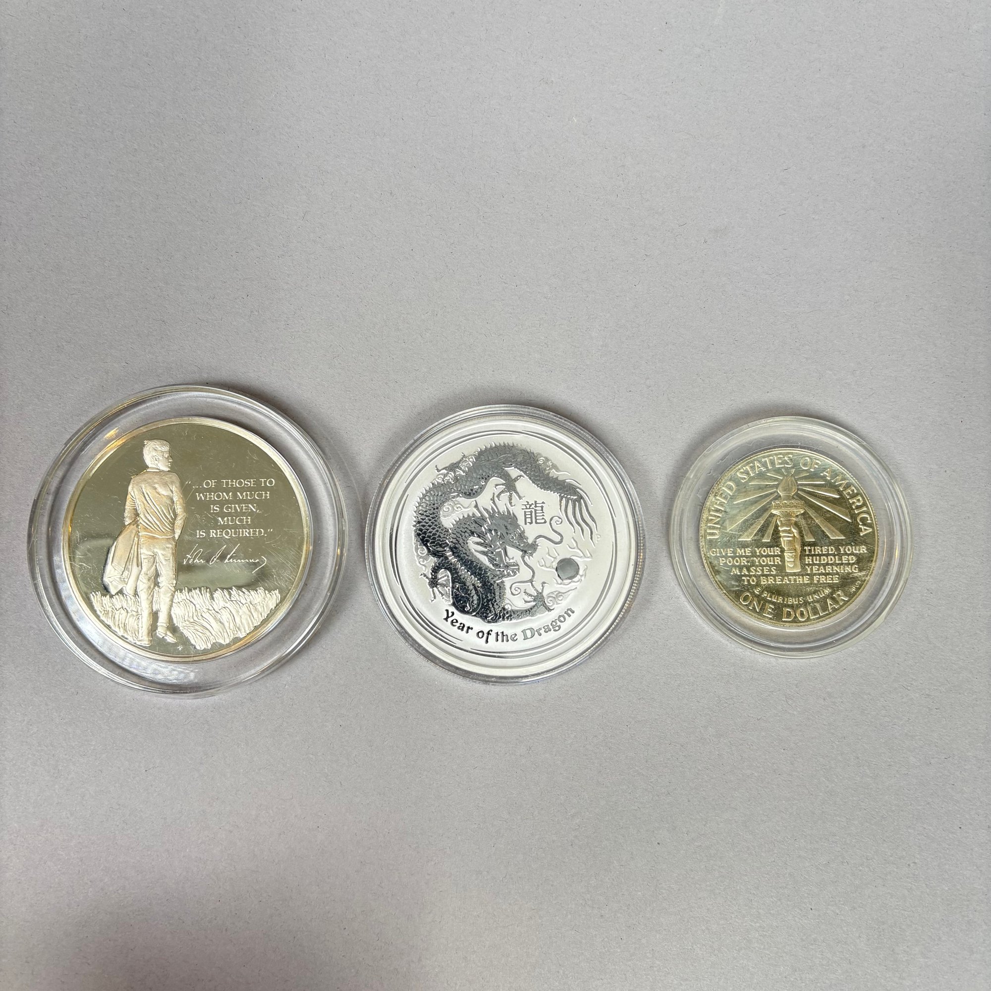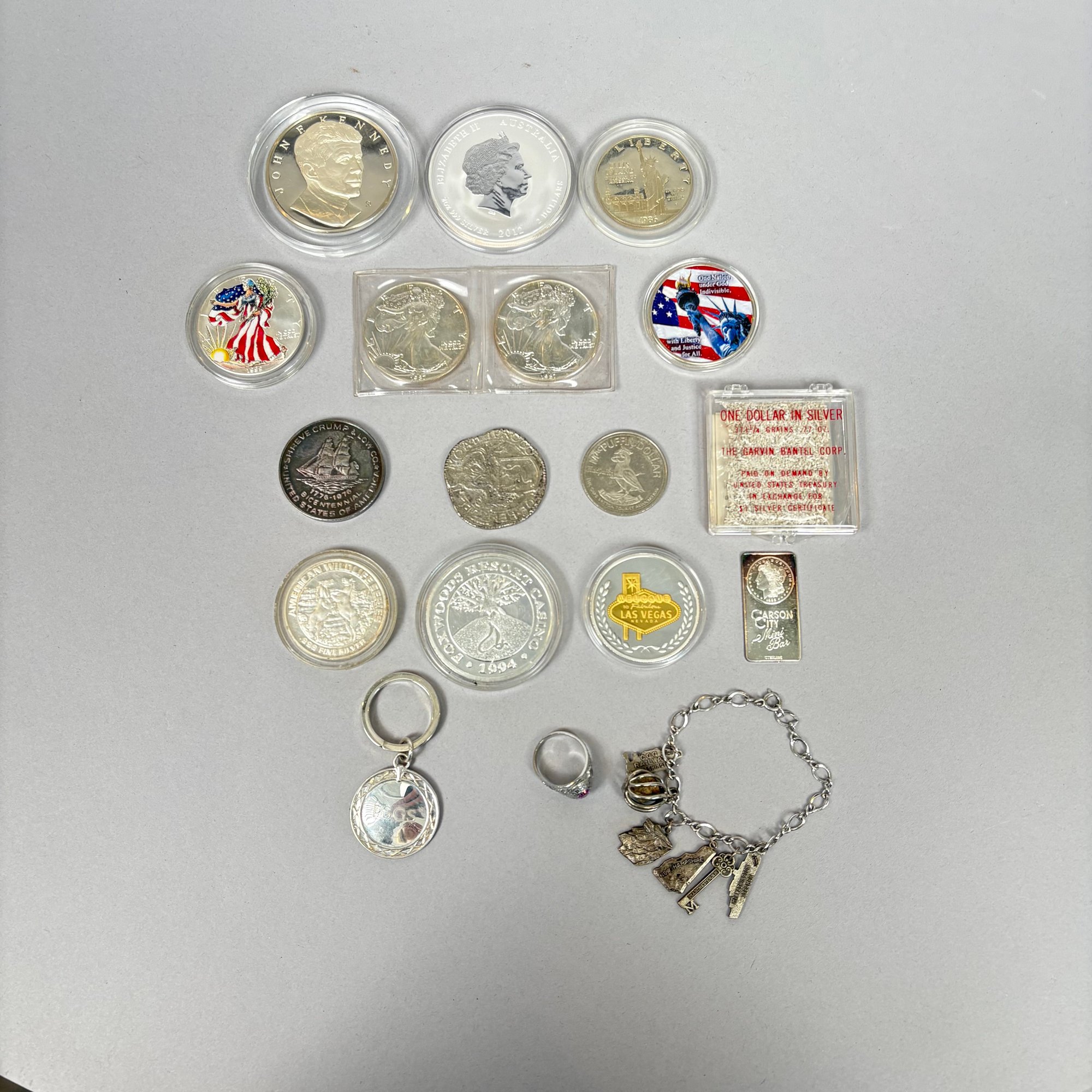Group of Assorted Silver Coins and Medallions, 20th Century. Comprising a John Kennedy/ "To Those to Whom is Given..." medallion, a 1986 "LIBERTY/ ELLIS ISLAND"/ "UNITED STATES OF AMERICA" dollar, two 1987 "LIBERTY"/ "UNITED STATES OF AMERICA" dollars, a 1999 "LIBERTY"/ "UNITED STATES OF AMERICA" dollar, a CONCORD MINUTEMAN/ 1776-1976 BICENTENNIAL" twenty-five dollar coin, an Elizabeth II Australia 2012/ "Year of the Dragon" two dollar coin; and a 2002 9/11 memorial medallion, a MacPuffin dollar, Roman (?) coin, The Garvin Bantel Corp. cased one dollar in silver, three casino medallions and a Carson City silver mini bar, a keychain, a 1988 Hillsboro-Deering High School class ring, and a charm bracelet with six New Hampshire-related charms. (17)