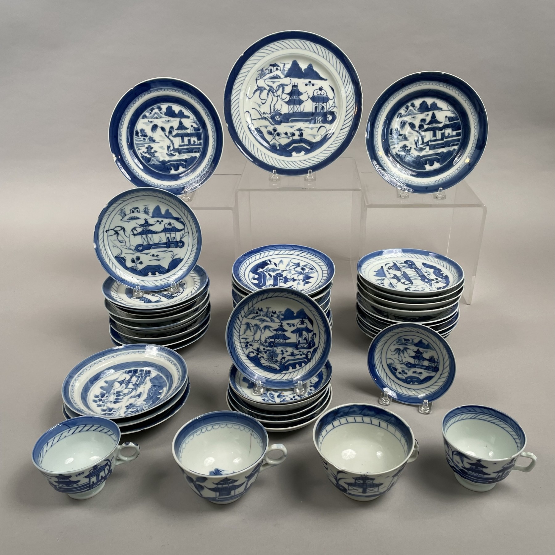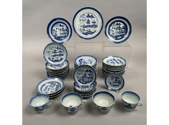 Comprising 1 dinner plate, Diam.: 8.75 in., 2 luncheon plates, 35 side dishes and saucers, 3 teacups and saucers, 1 large handled cup and saucer. (46)