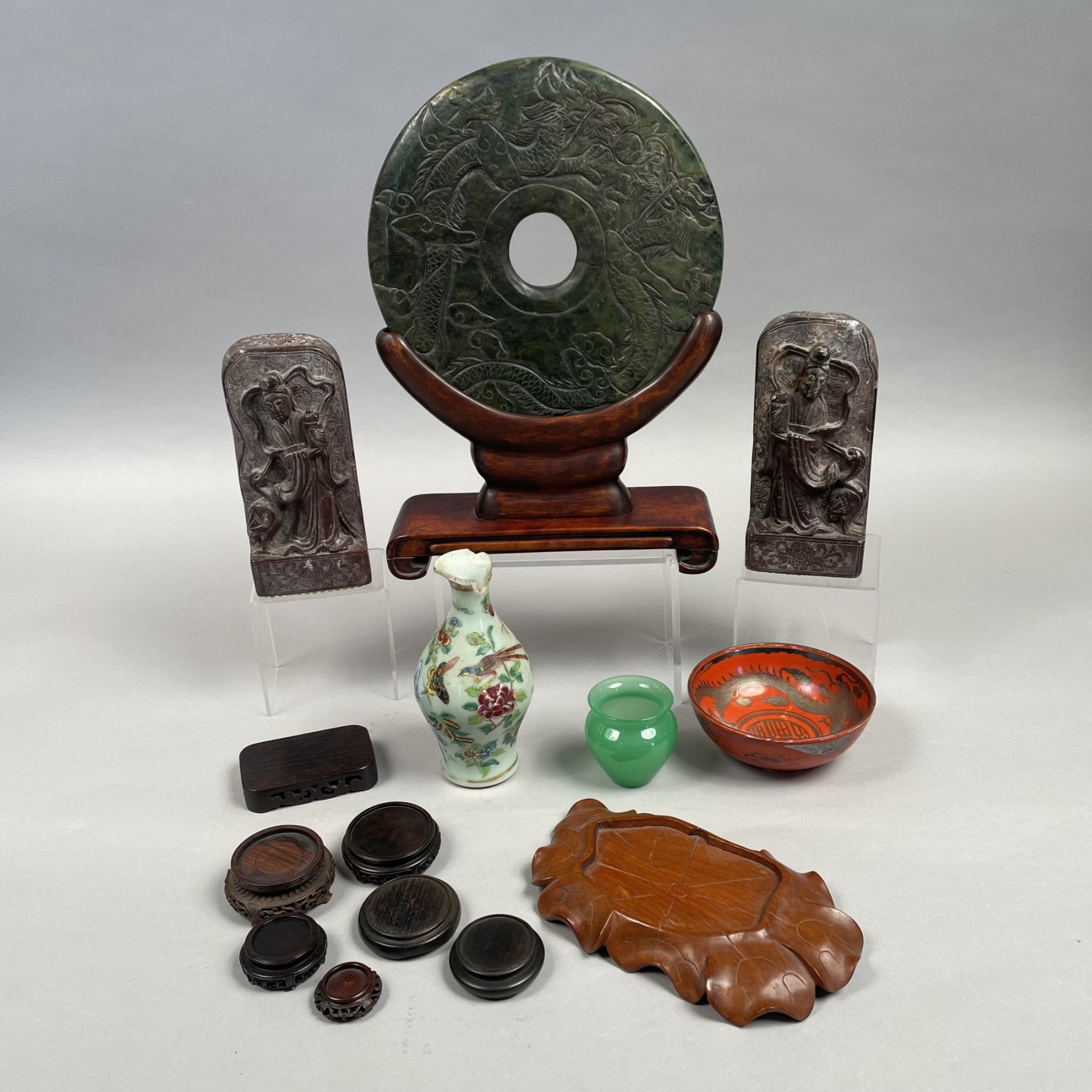 Comprising a jade bi carved on each side with two dragons chasing a fiery pearl, with hardwood stand; a pair of aubergine stone bookends, each carved with an Immortal and crane; a porcelain dragon in clouds bowl; a celadon famille rose vase; a Peking glass vase; and eight carved hardwood stands. (15)