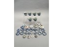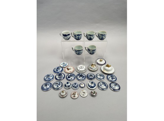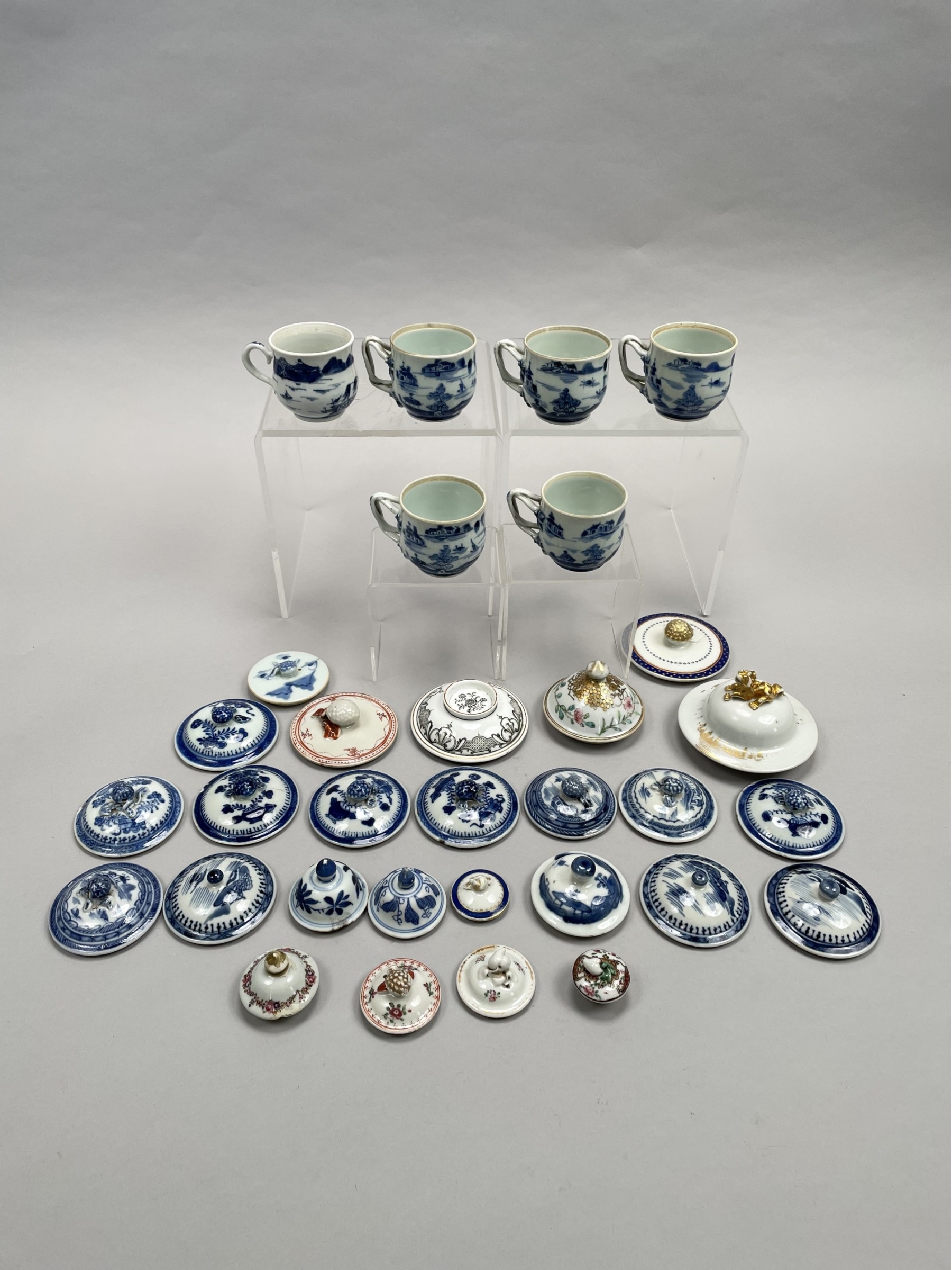 Eighteenth and Nineteenth Century. The blue and white porcelain comprising a set of 6 syllabub cups and 5 covers, h: 3.125 in., a set of 3, a pair and 4 single syllabub covers, and 2 tea caddy covers; the enamel-decorated wares comprising 4 teapot covers, 1 rice bowl cover, and 5 tea caddy covers. (32)