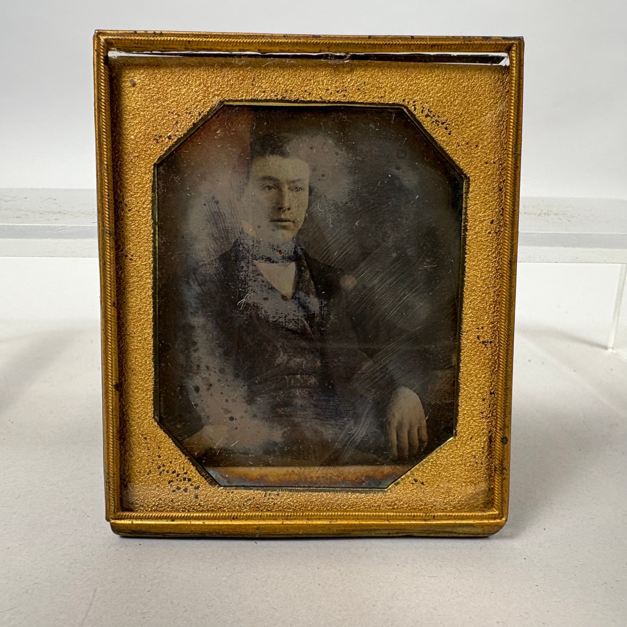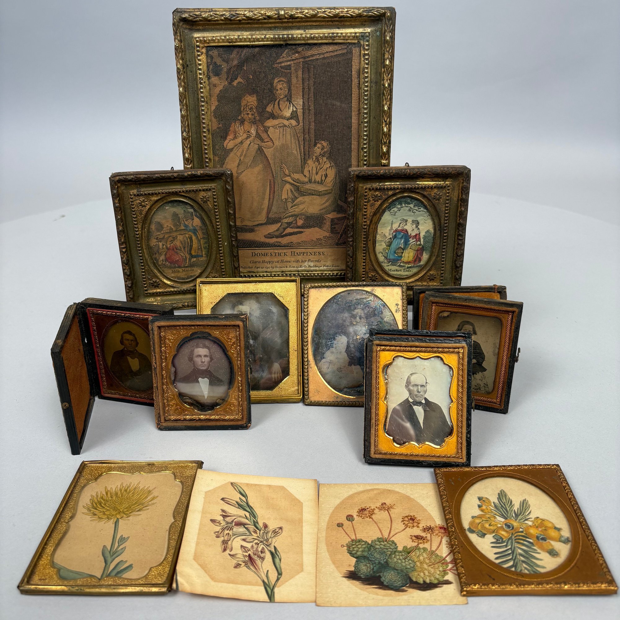 Group of Colored Prints and Cased Photographs, Late 18th-Early 19th Century. The three prints each housed in a wood frame applied with a stamped brass surround; four botanical colored prints, two in brass and glass frames; and six daguerreotypes and albumen prints, three each in a leather case, one in half a case and two each in a brass and glass frame. (13)