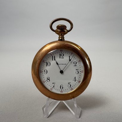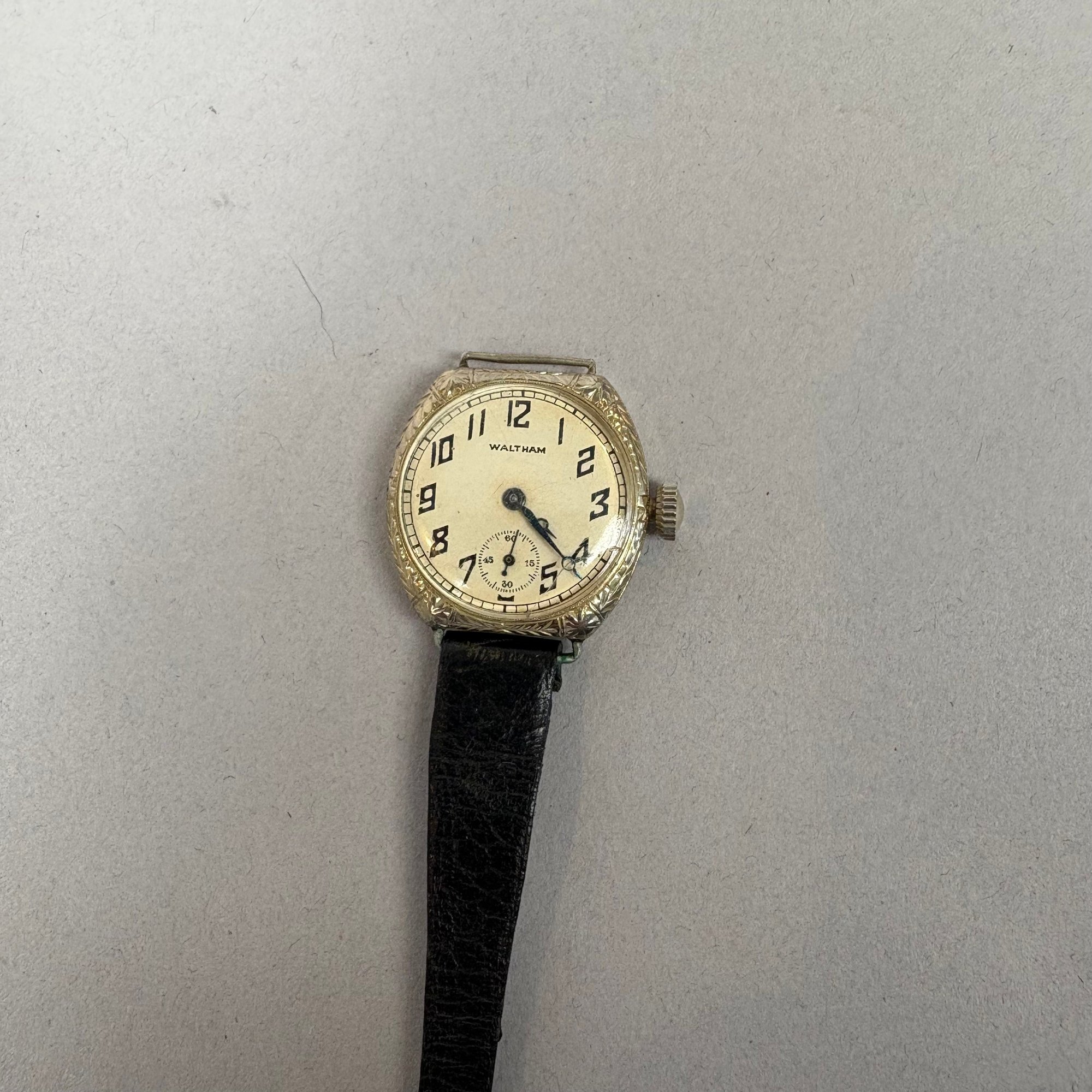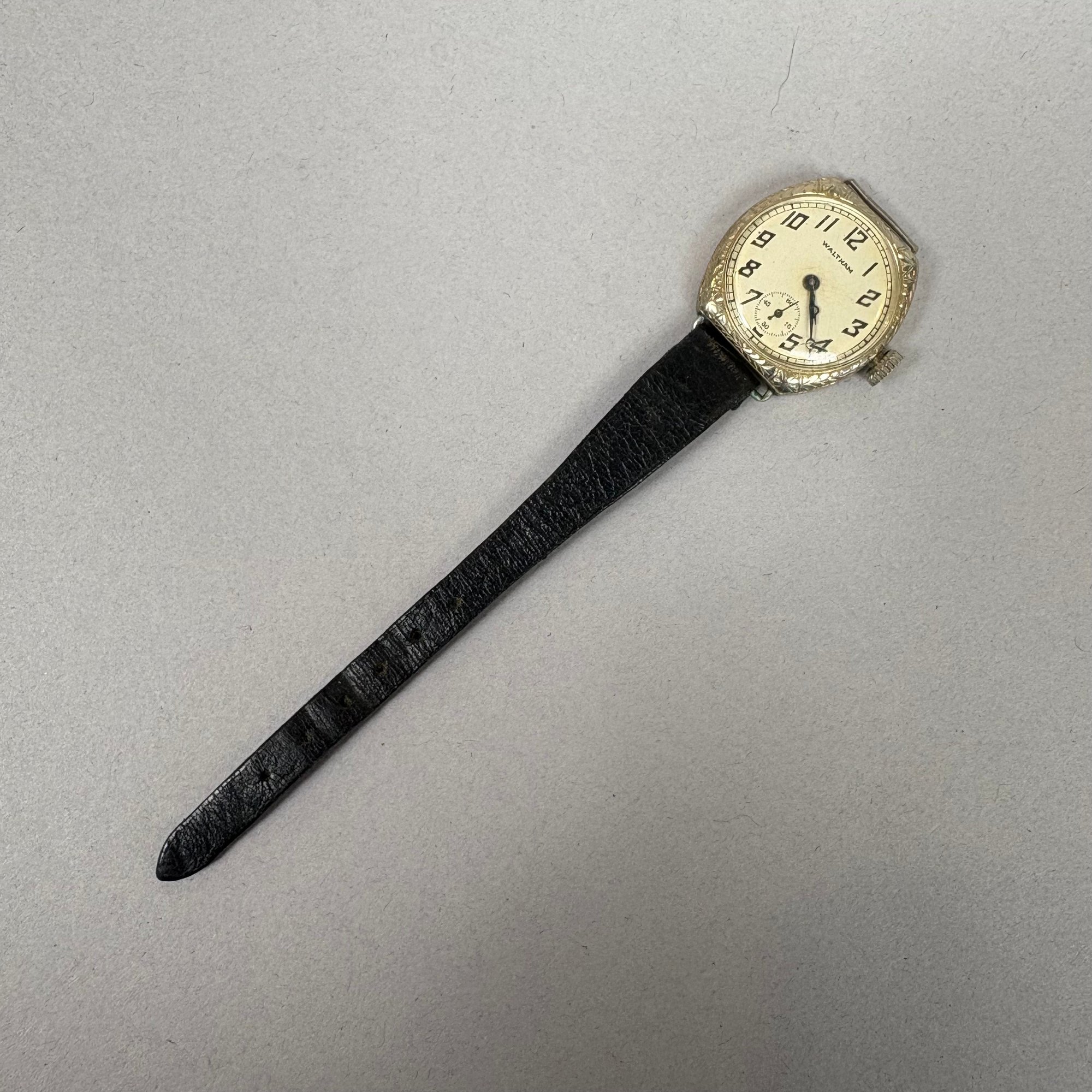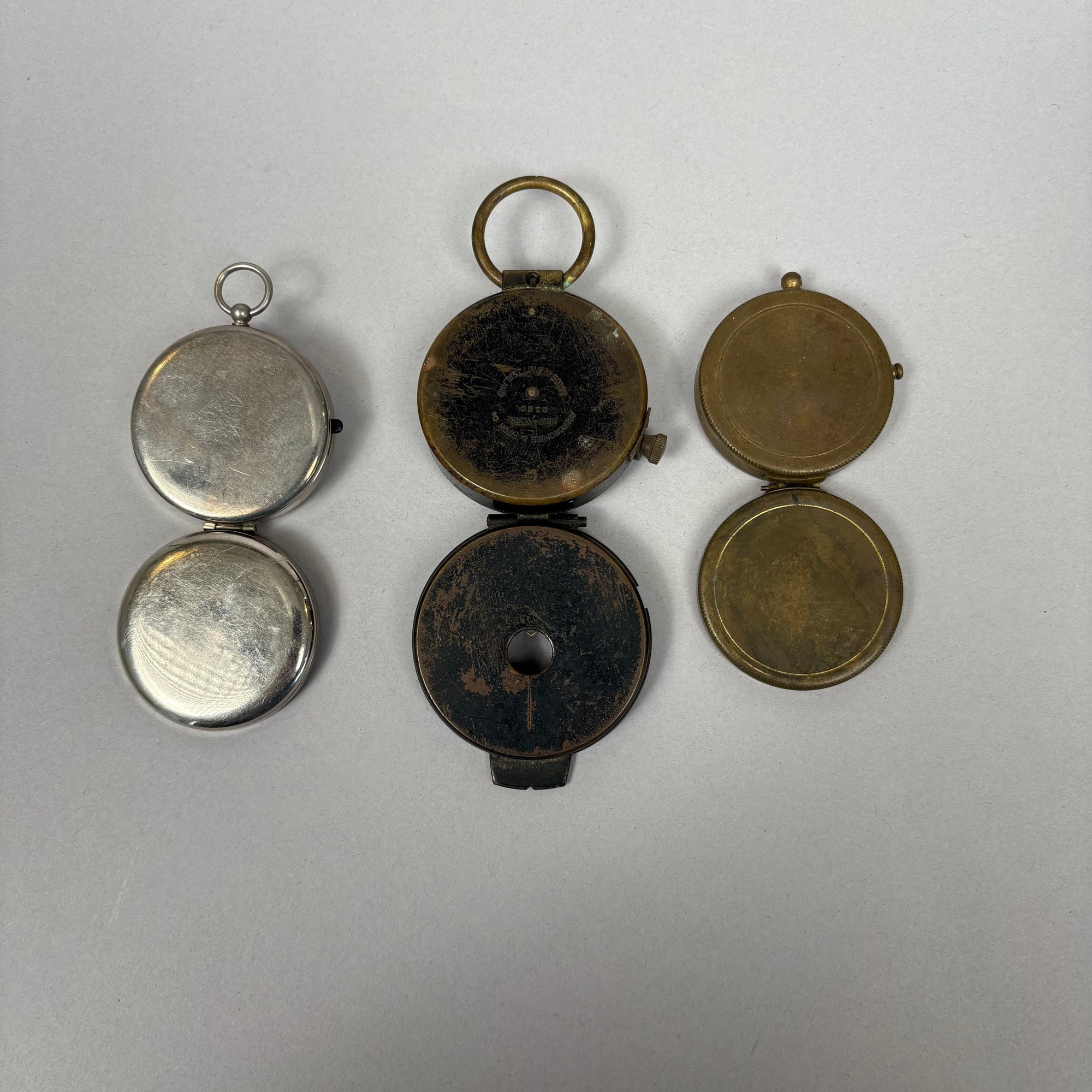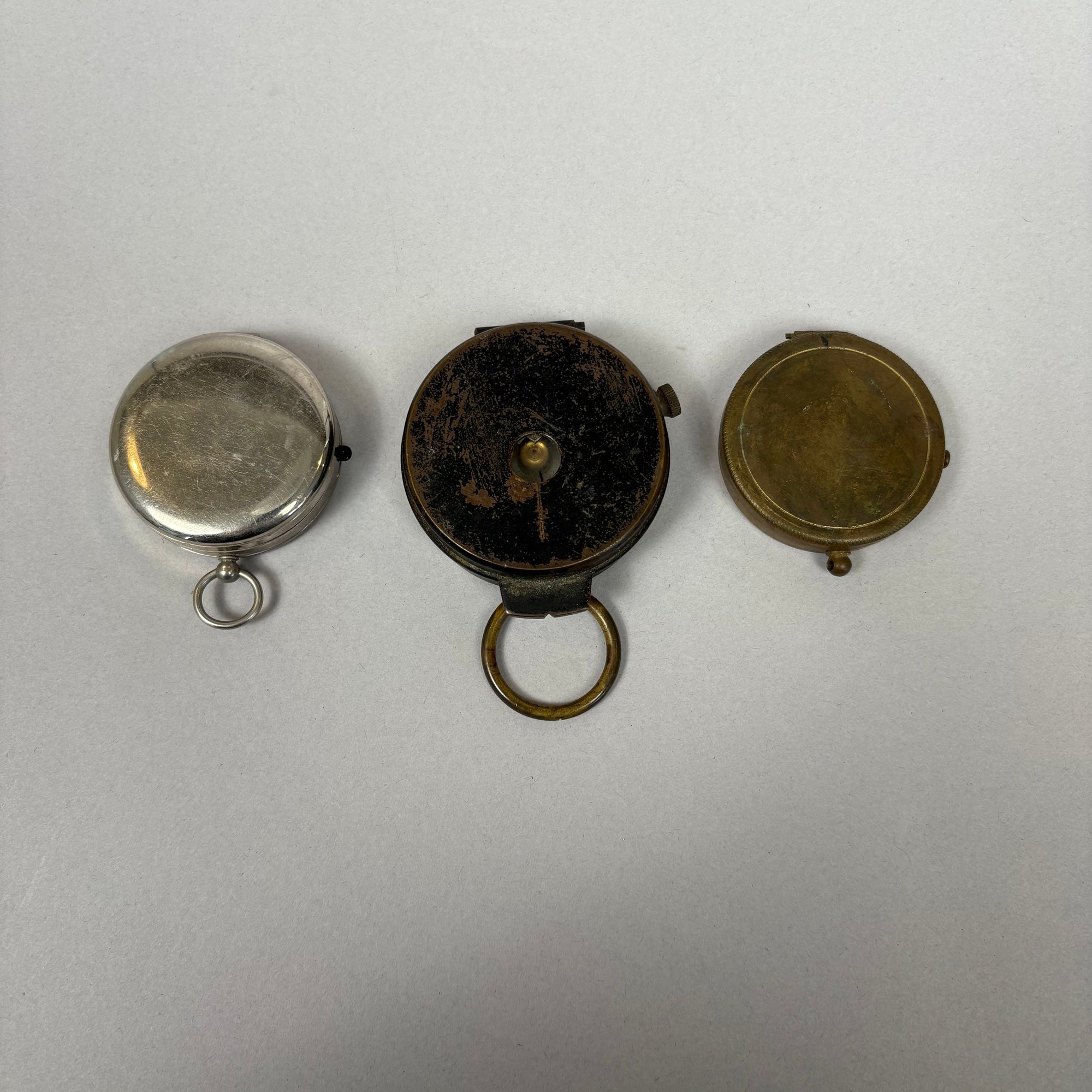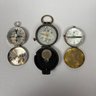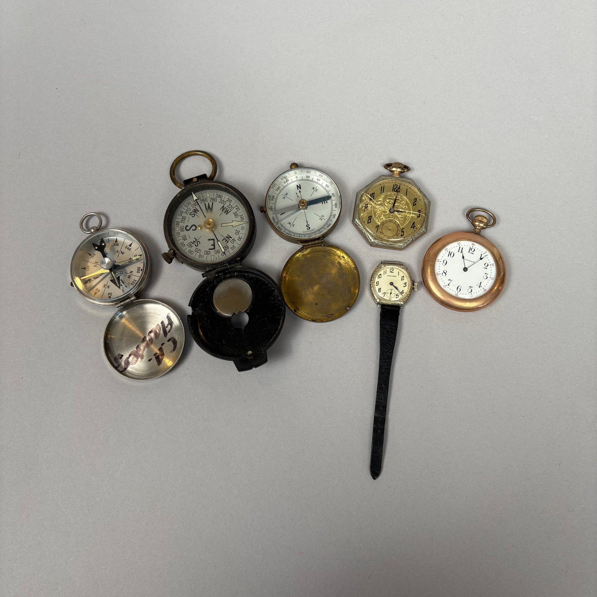 Group of Compasses and Watches, Including a WWII Compass, Late 19th-20th Century. Comprising a World War II black-painted metal compass, Abercrombie & Fitch Co., marked "SWISS MADE" on the dial and the case marked "ABERCROMBIE & FITCH Co./ NEW-YORK/ 2120/ MADE IN SWITZERLAND;" a brass and a chrome compass, each marked "GERMANY;" a Record pocket watch, Lancaster Watch Co., Lancaster, Pennsylvania, 1879-1884; a Waltham pocket watch, Waltham, Massachusetts; and a Waltham wrist watch.