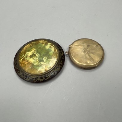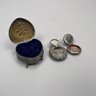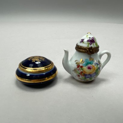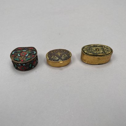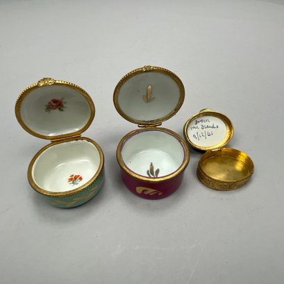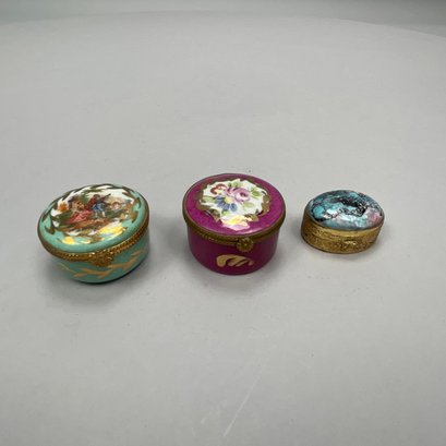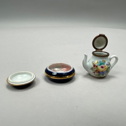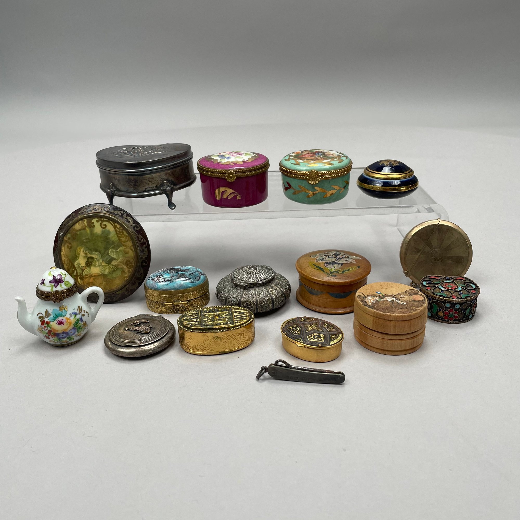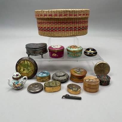 Group of Continental and English Miniature Boxes, Late Nineteenth-Twentieth Century. Including a button hook, Cornelius Desormeaux Saunders & James Francis Hollings (Frank) Shepherd, London, 1899; and an Edward VII Heart-shaped trinket box, William Disney Barlow, London, 1905; the remaining boxes in porcelain, gilt-metal, brass and wood; and a woven basket with lid. (17)
