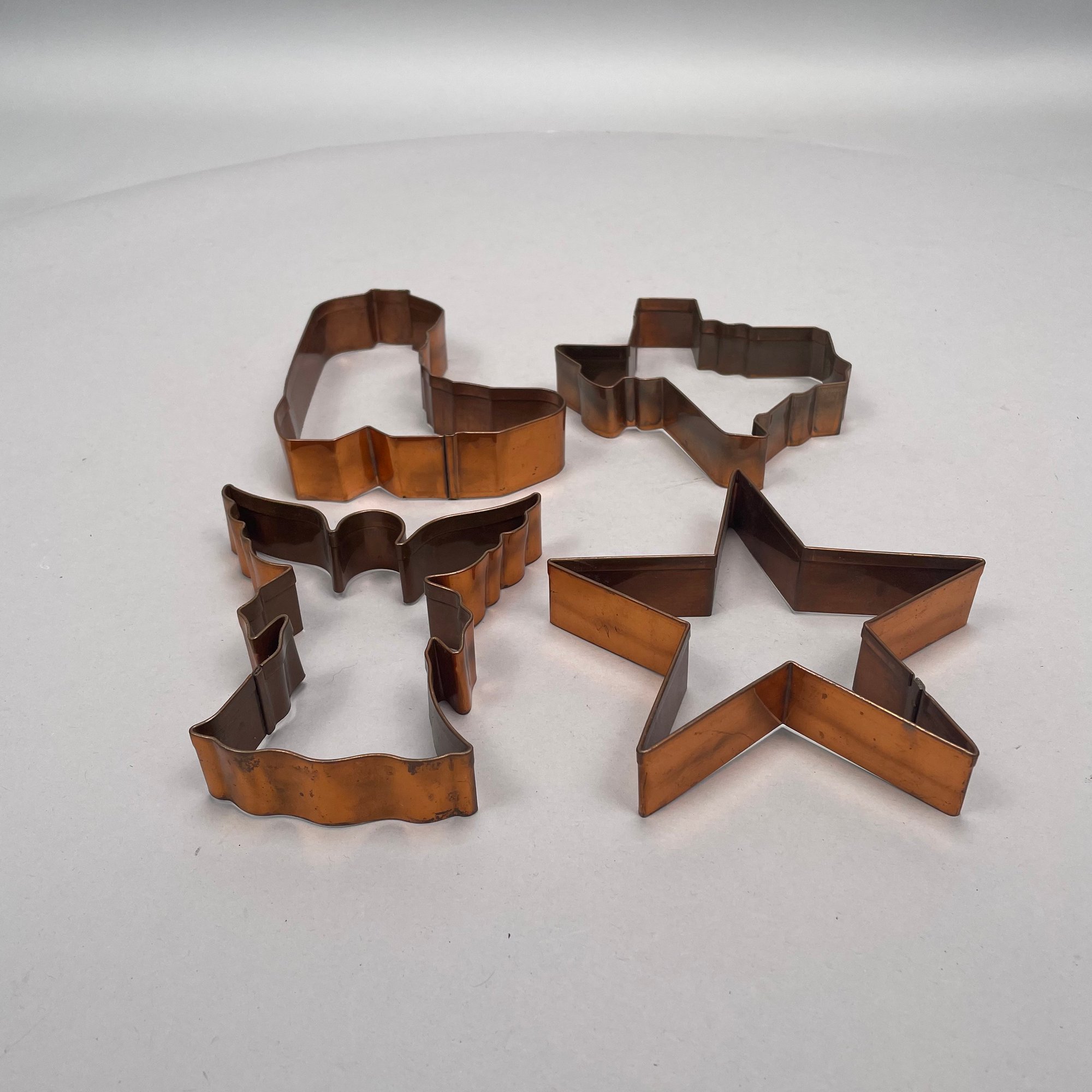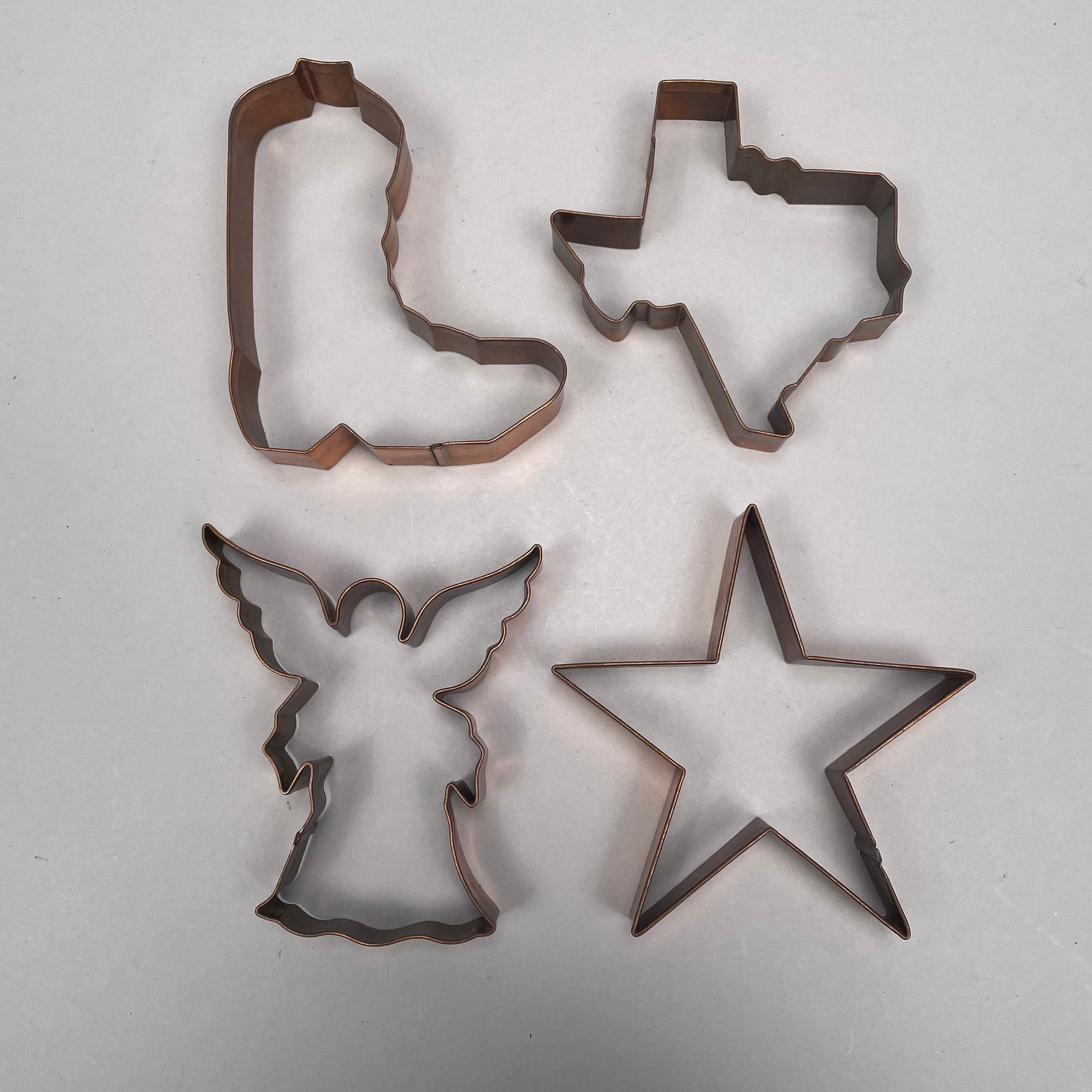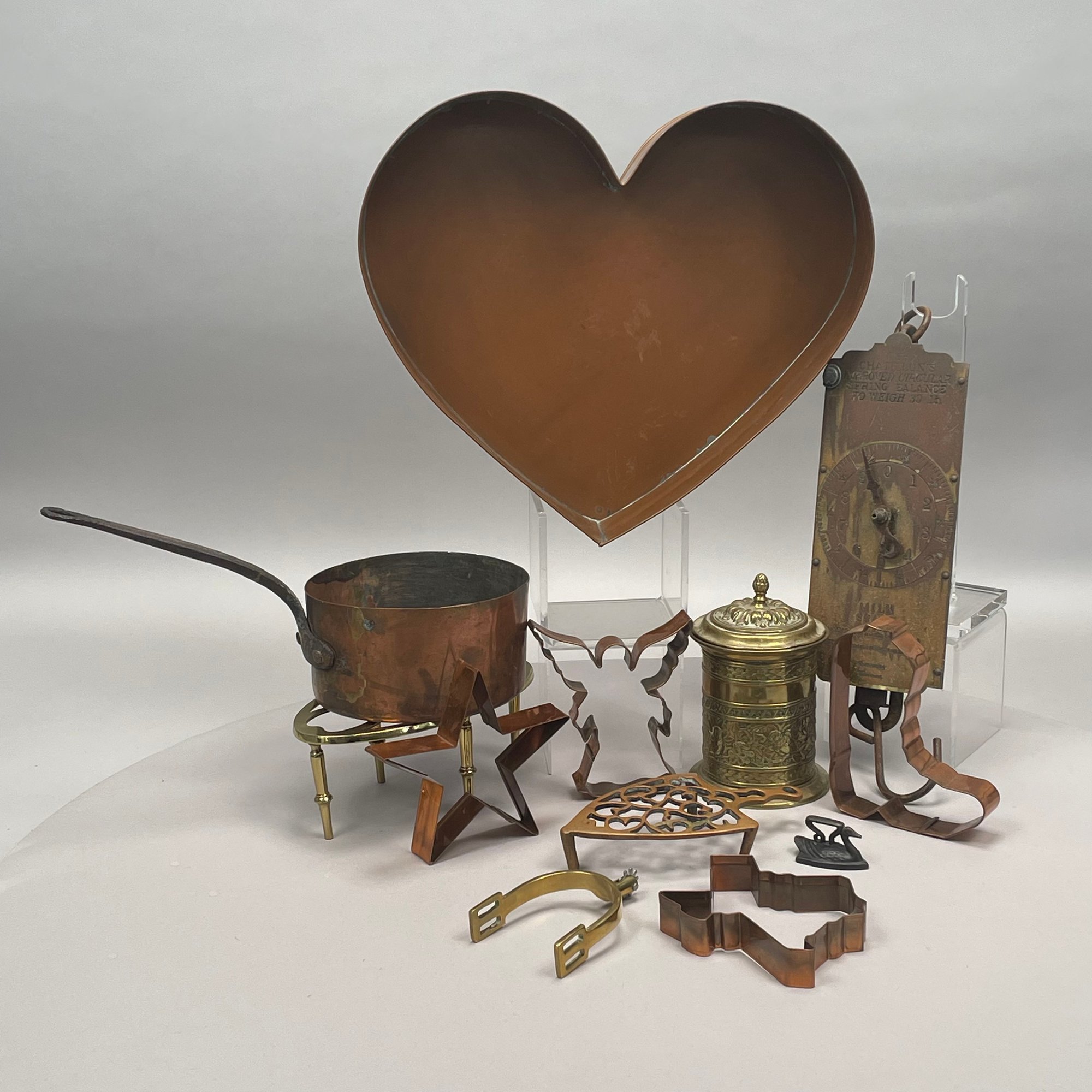 Group of Copper and Brass Decorative Articles. Group of Copper and Brass Baking and Decorative Articles. Including four cookie cutters in the shapes of the state of Texas, a cowboy boot, a star and an angel, and a large copper heart-shaped pan. (12)