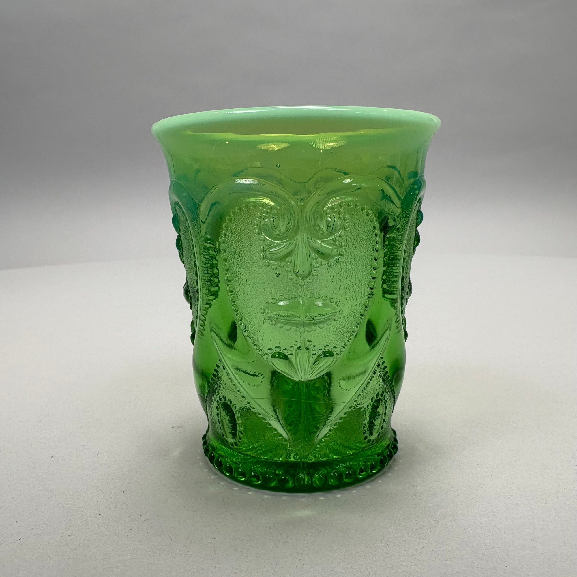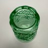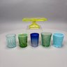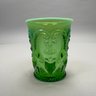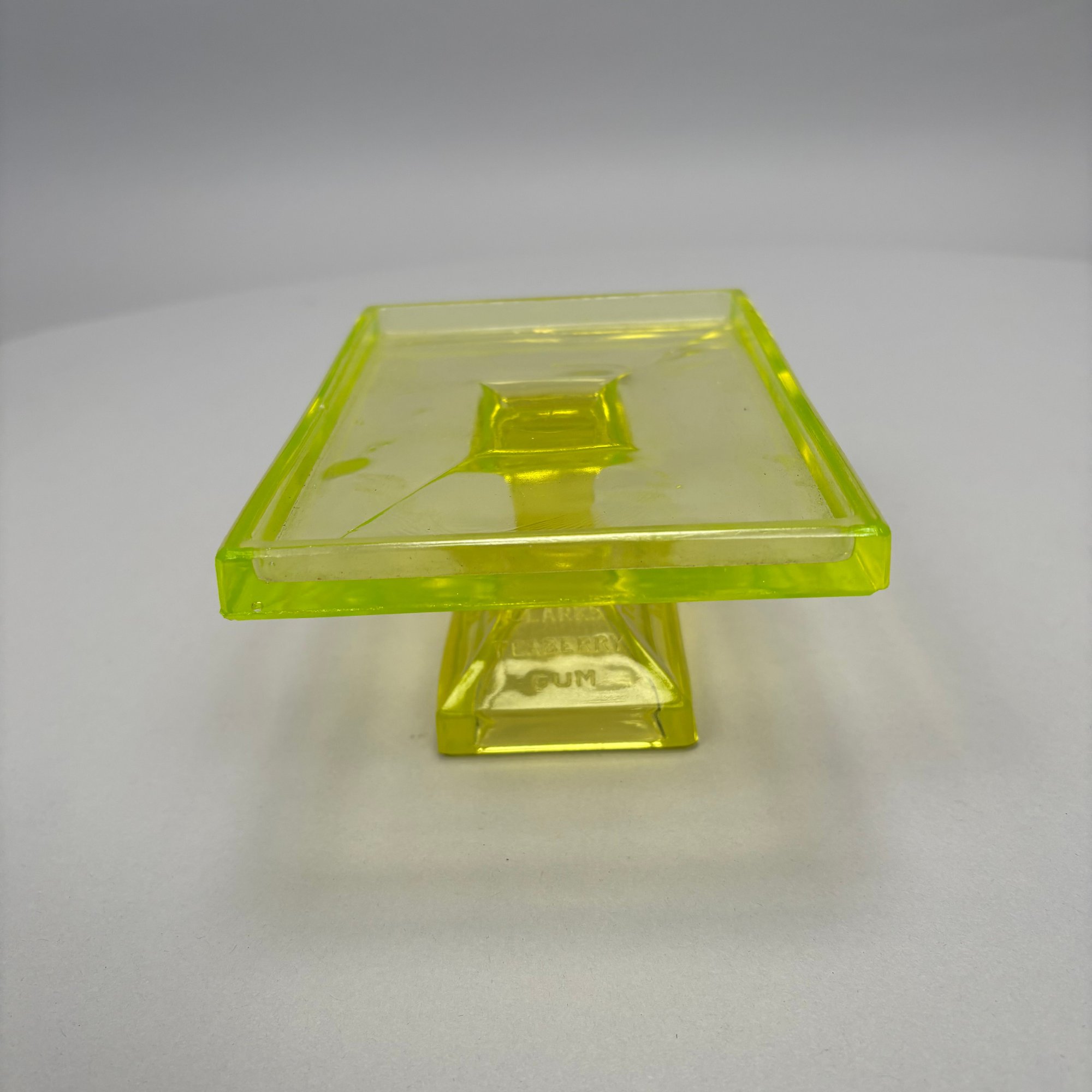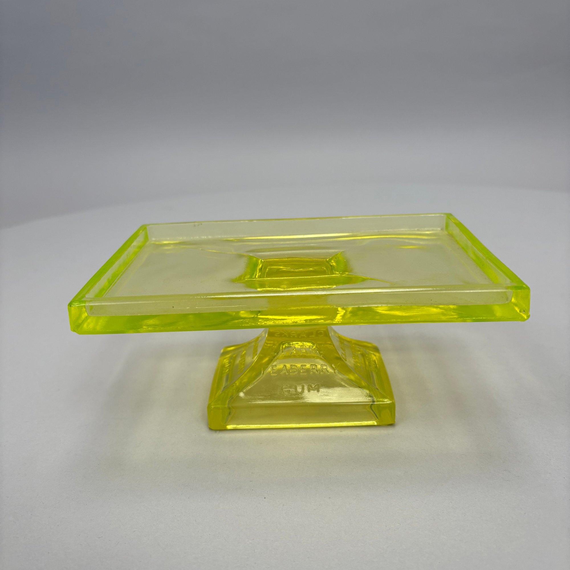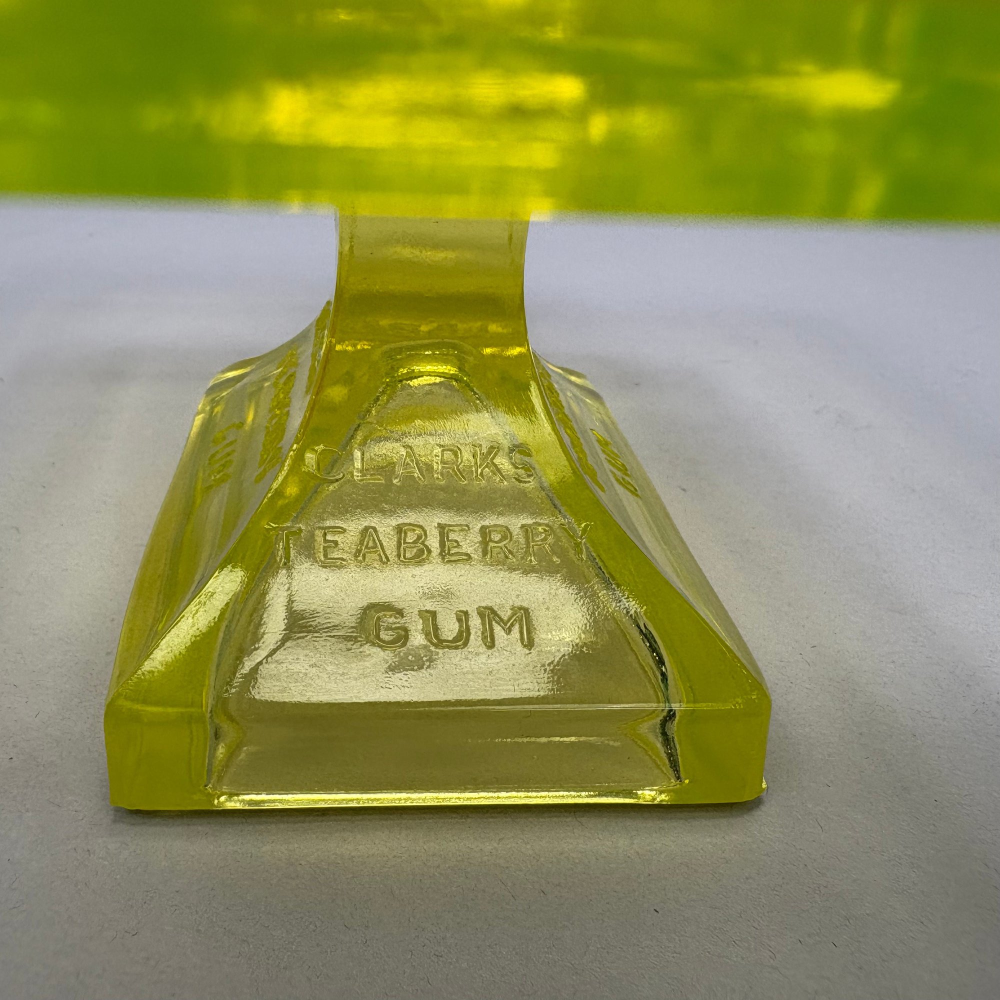 Group of Early American Pattern Glass, 20th Century. Comprising a yellow-green (uranium/ Vaseline glass) Clarks Teaberry gum advertising stand for the D.L. Clark Co., Pittsburgh, Pennsylvania, circa 1930, molded on each side of the base "CLARKS TEABERRY GUM;" and five pattern glass tumblers including an opalescent blue 'Stars and Stripes' tumbler, Fenton Art Glass Co., Williamstown, West Virginia / L.G. Wright Glass Co., New Martinsville, West Virginia. (6)