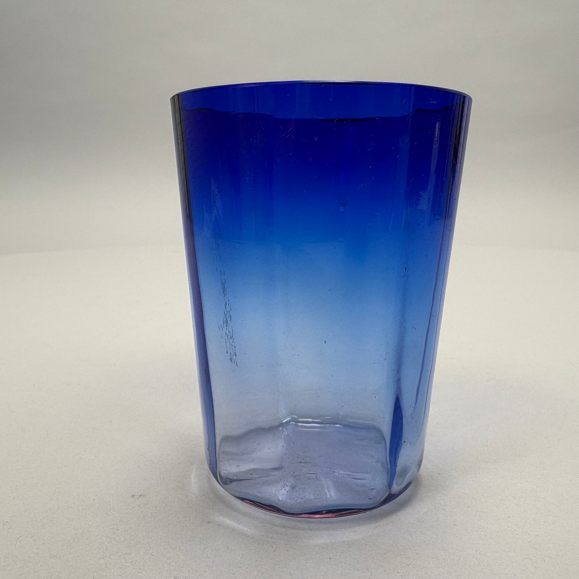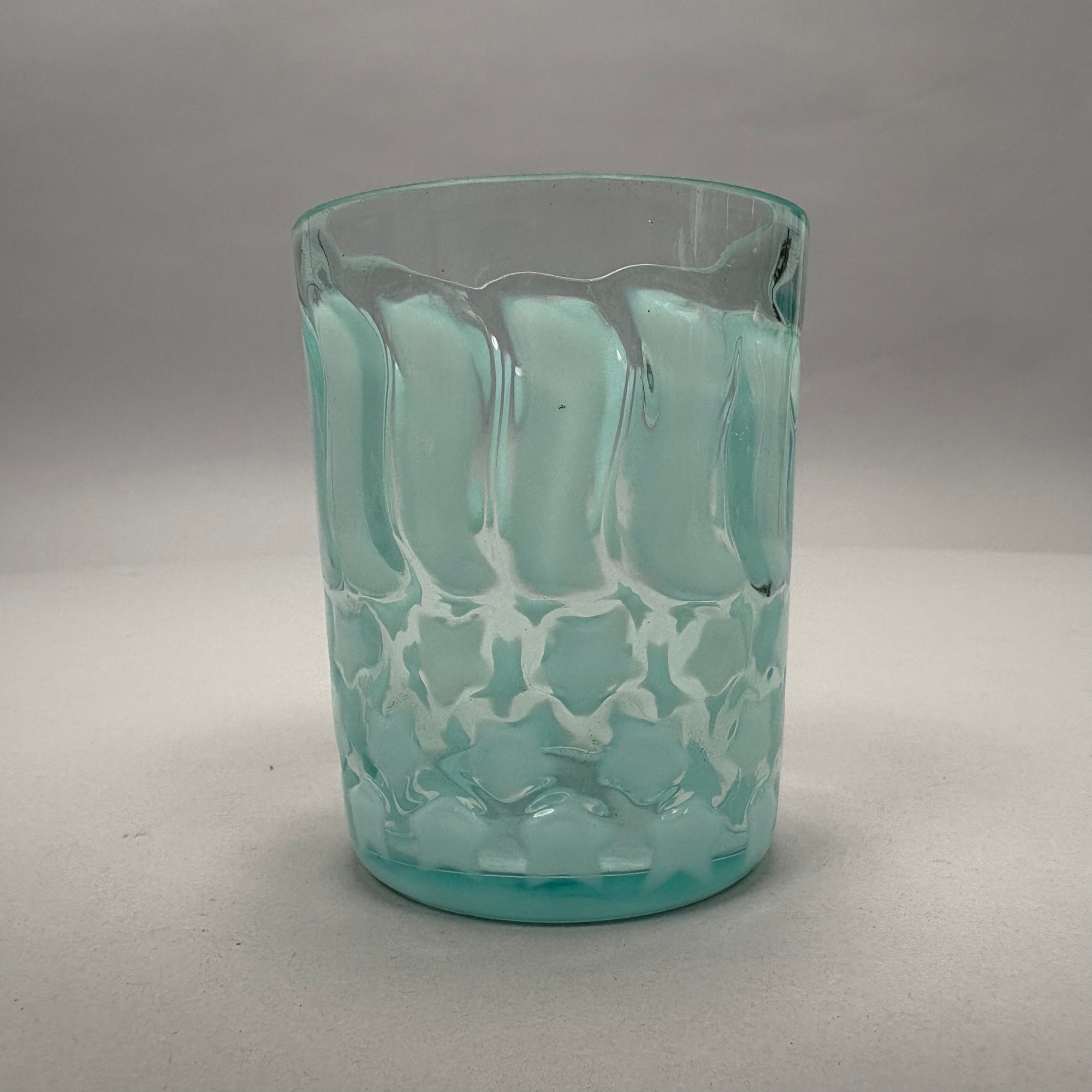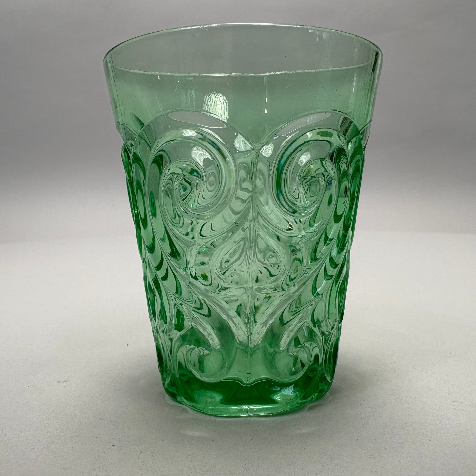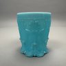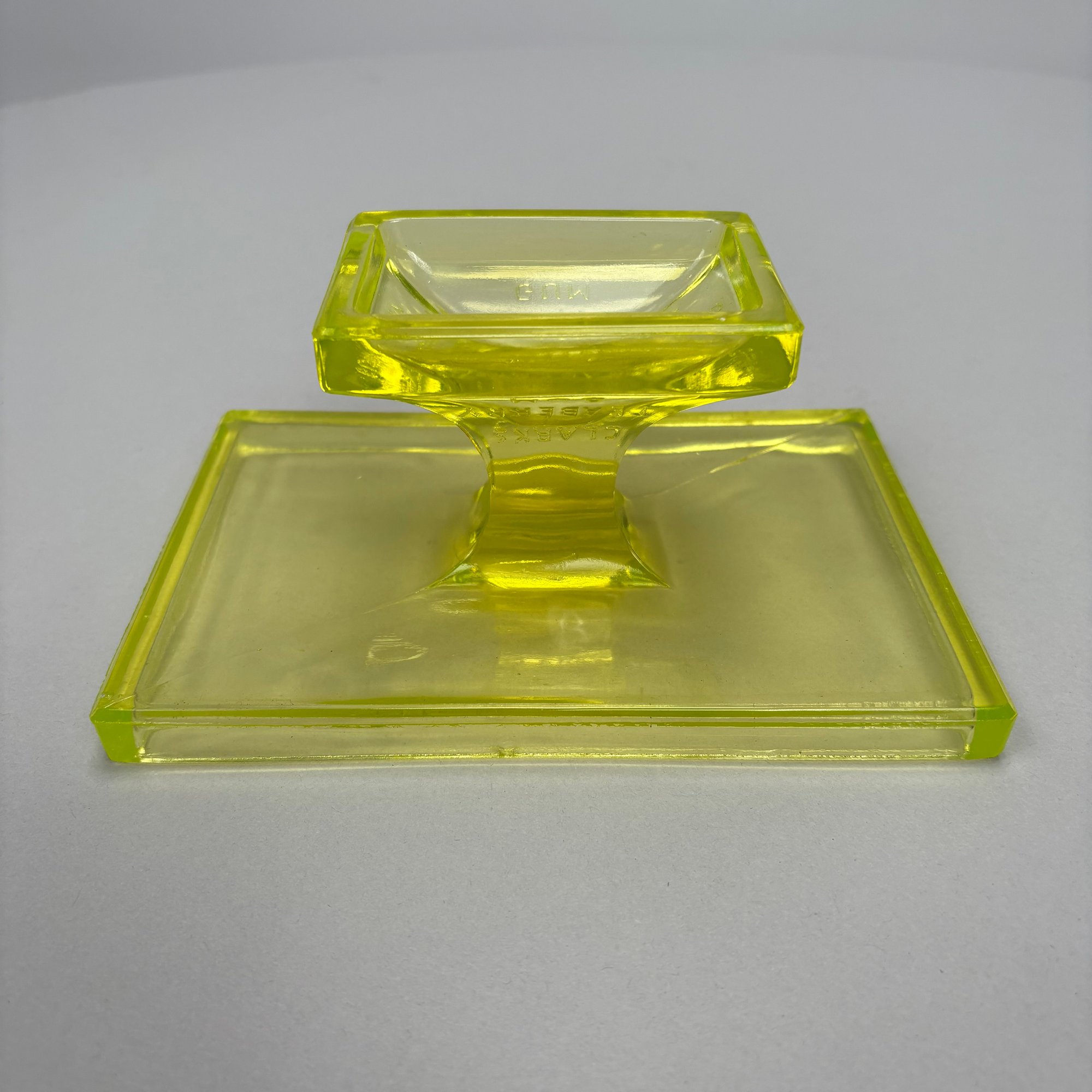 Group of Early American Pattern Glass, 20th Century. Comprising a yellow-green (uranium/ Vaseline glass) Clarks Teaberry gum advertising stand for the D.L. Clark Co., Pittsburgh, Pennsylvania, circa 1930, molded on each side of the base "CLARKS TEABERRY GUM;" and five pattern glass tumblers including an opalescent blue 'Stars and Stripes' tumbler, Fenton Art Glass Co., Williamstown, West Virginia / L.G. Wright Glass Co., New Martinsville, West Virginia. (6)