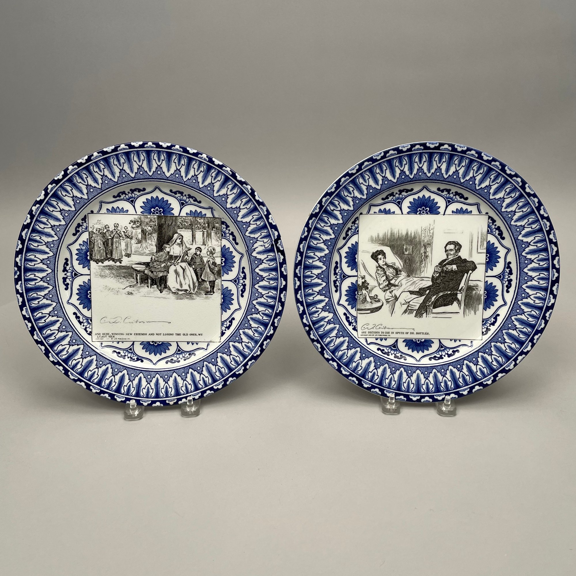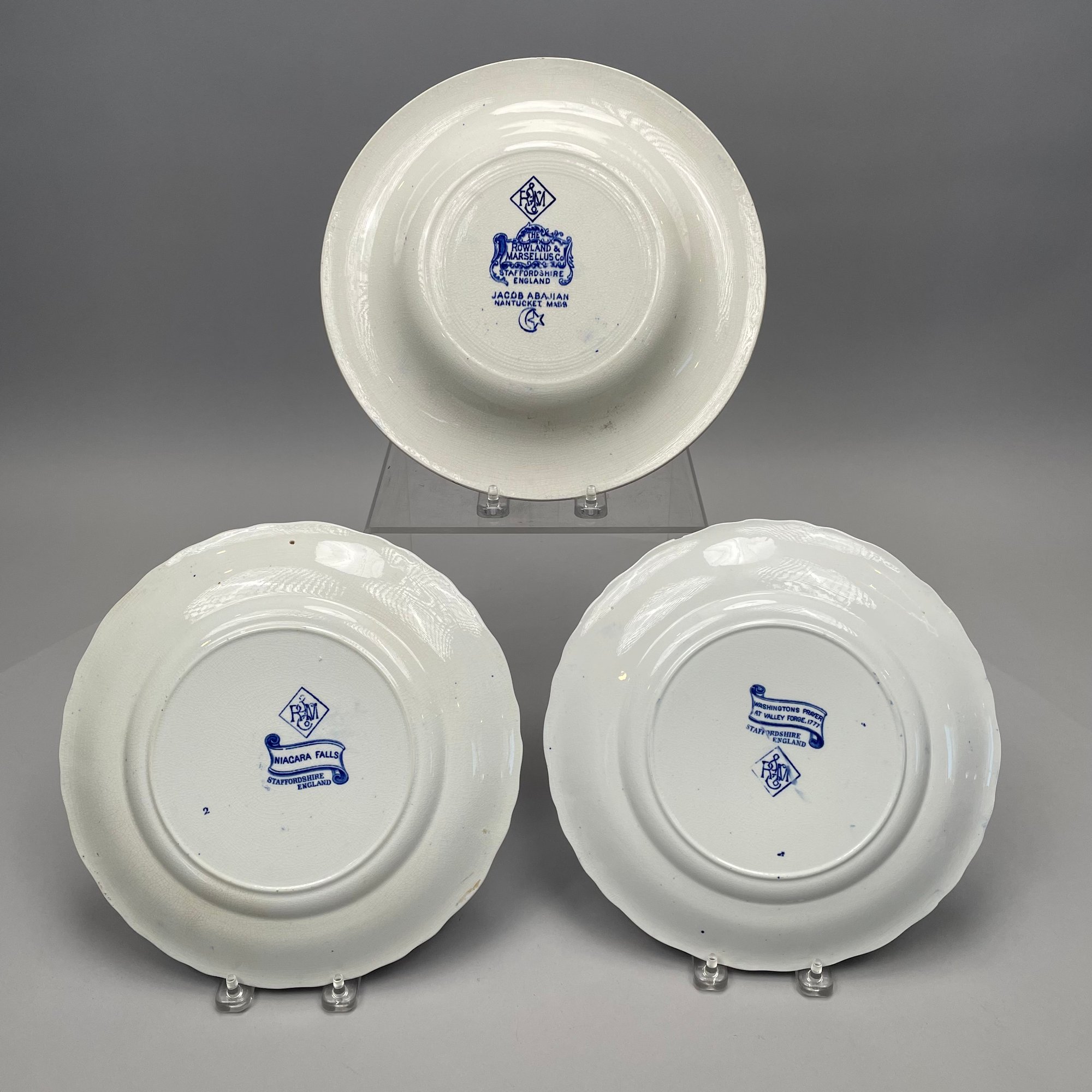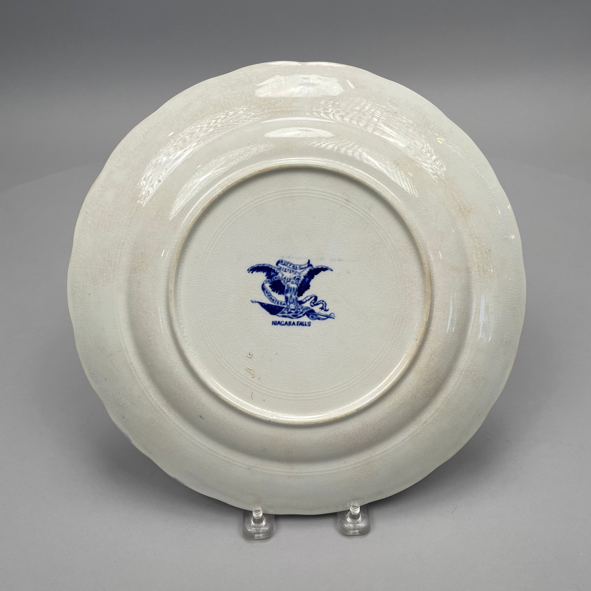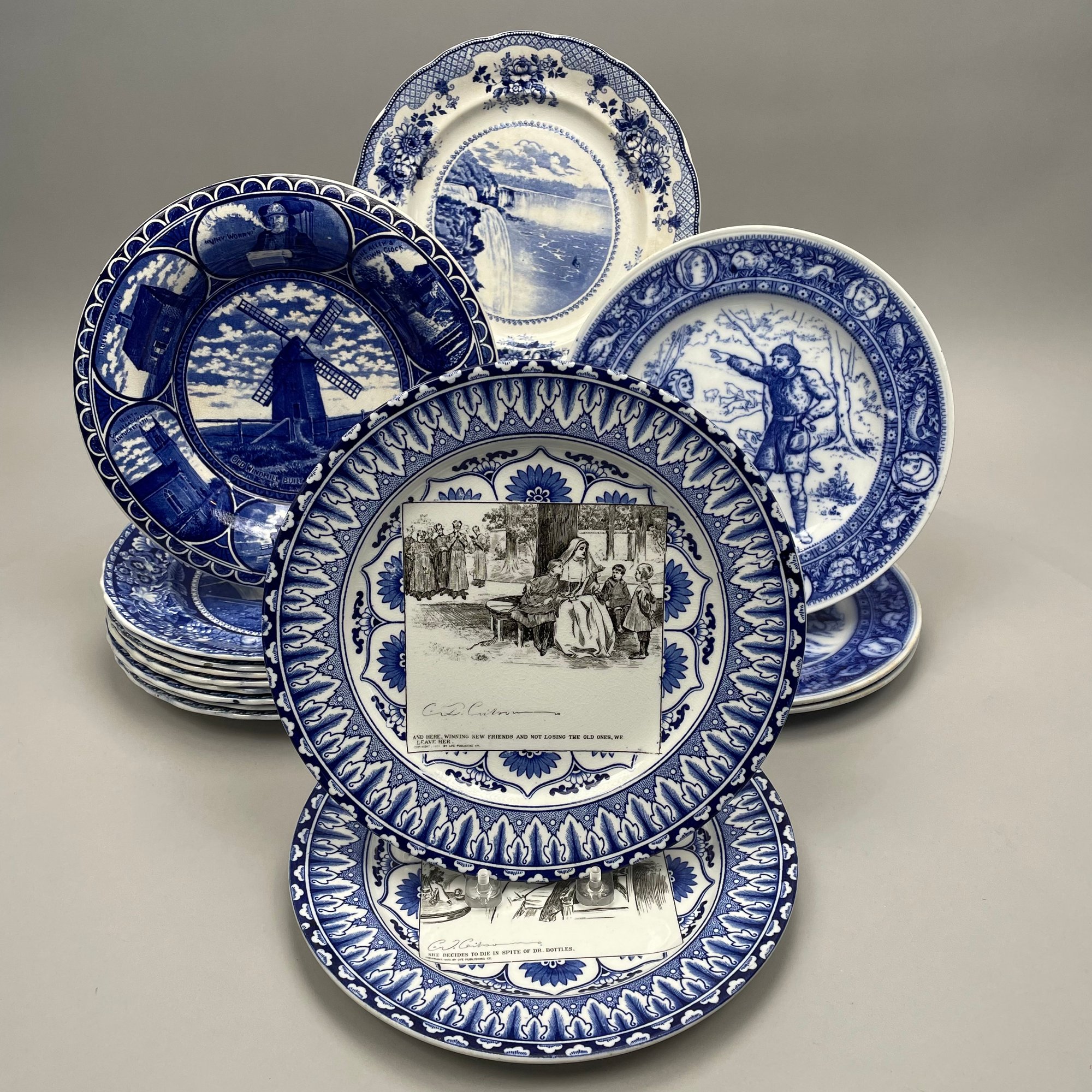 Group of English Transfer-Printed Souvenir Plates, Early Twentieth Century. Comprising a set of eight 9.875 inch plates and a single deep plate, depicting various American historical views, retailed by Rowland & Marsellus, New York, 1893-1938; two Royal Doulton 'Gibson Girl' 10.375 inch plates, 1902-15, "She Decides to Die in Spite of Dr. Bottles" and "And Here, Winning New Friends and Not Losing the Old Ones, We Leave Her;" three Wedgwood 'Ivanhoe' 10.25 inch plates; and a Buffalo Pottery 'Niagara Falls' plate, various printed factory marks.
