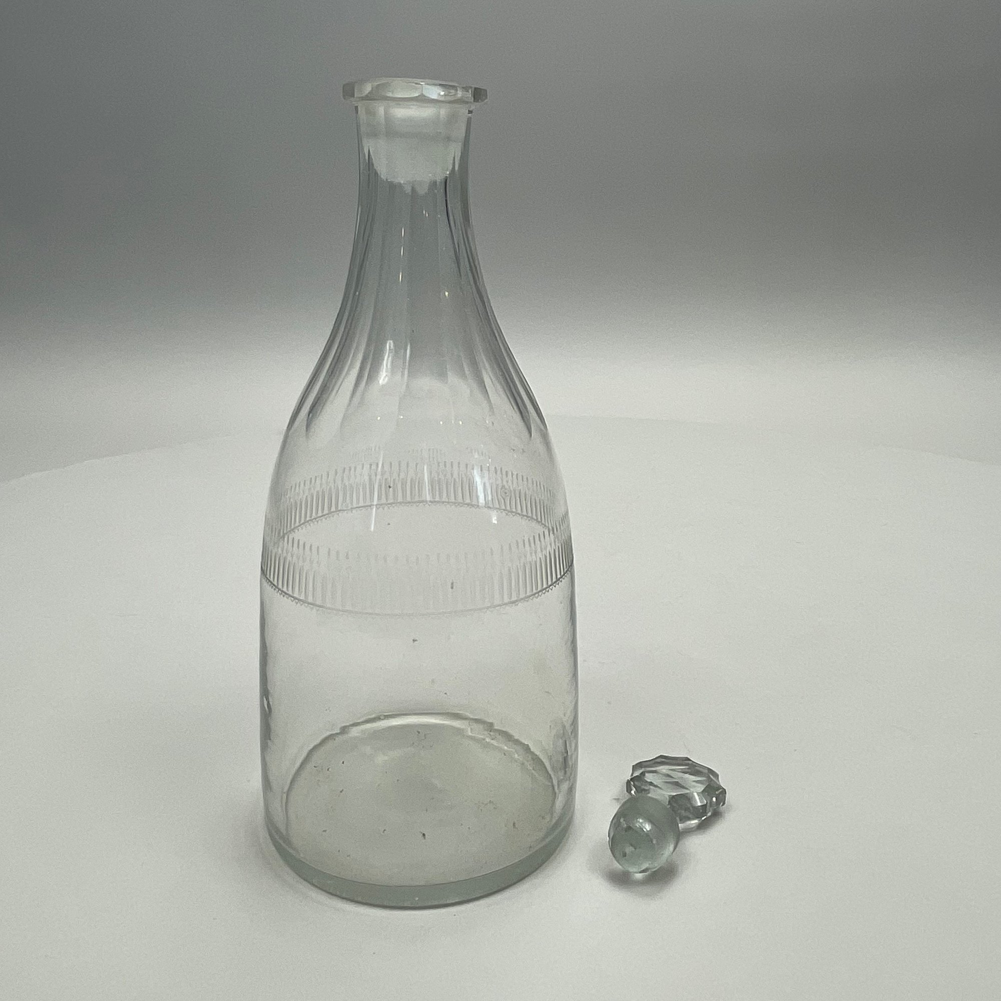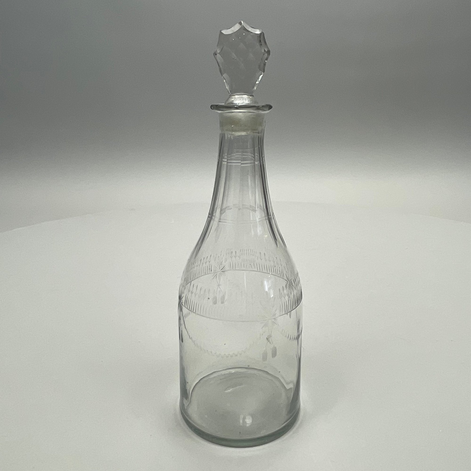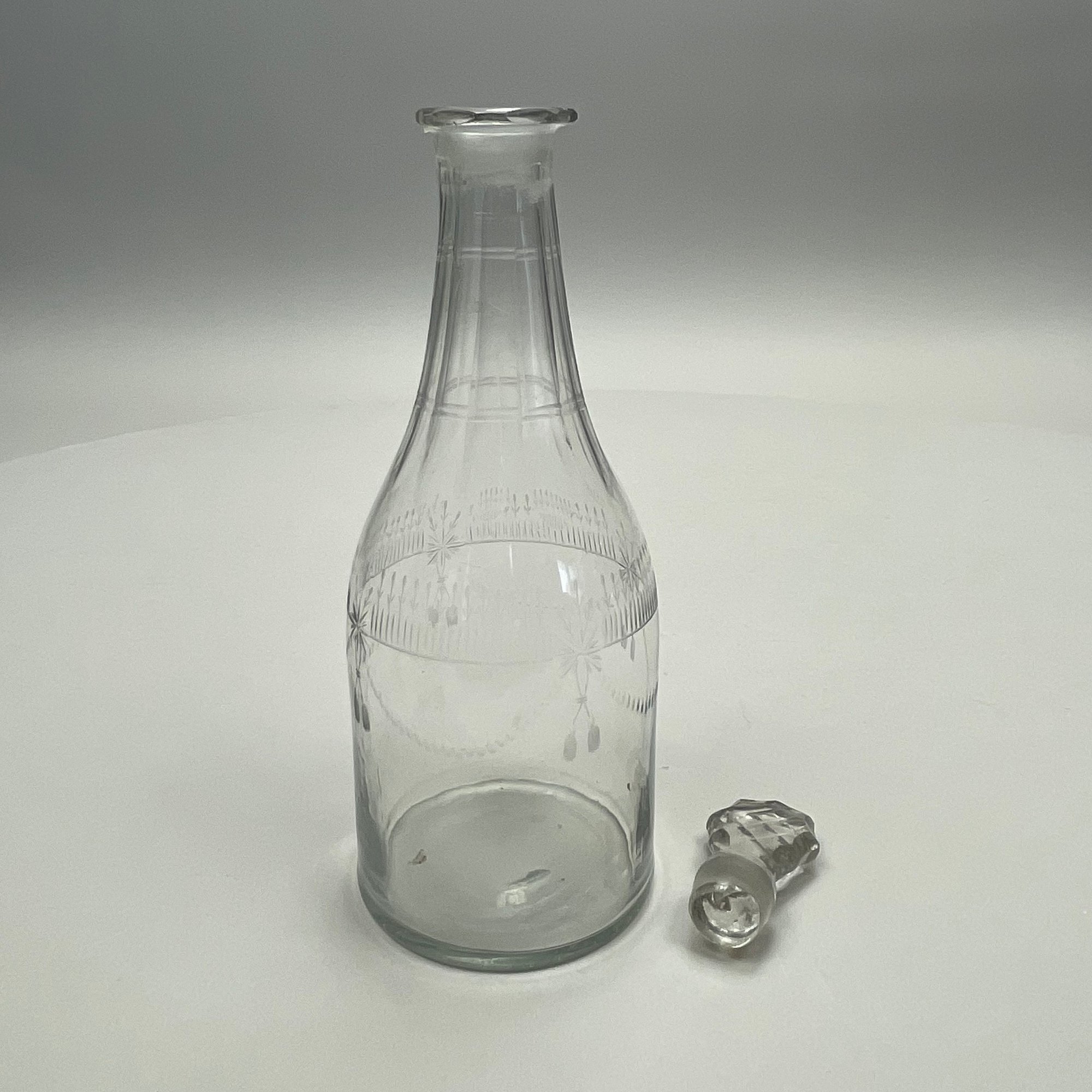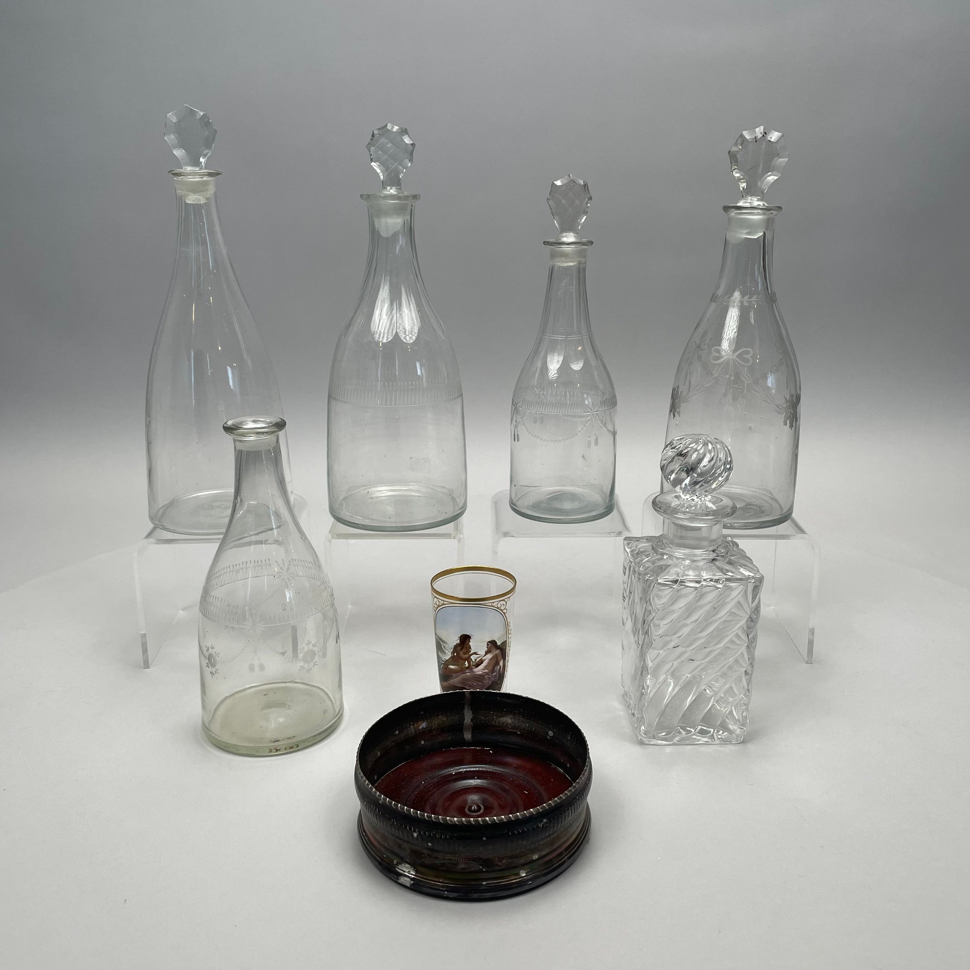 Group of Glass and Silverplate Wares Pertaining to Drinking, Nineteenth Century. Comprising five English and American free-blown and engraved decanters, a swirl-molded decanter and stopper, a silverplate wine coaster, and a Continental drinking glass transfer-printed with a neoclassical scene.