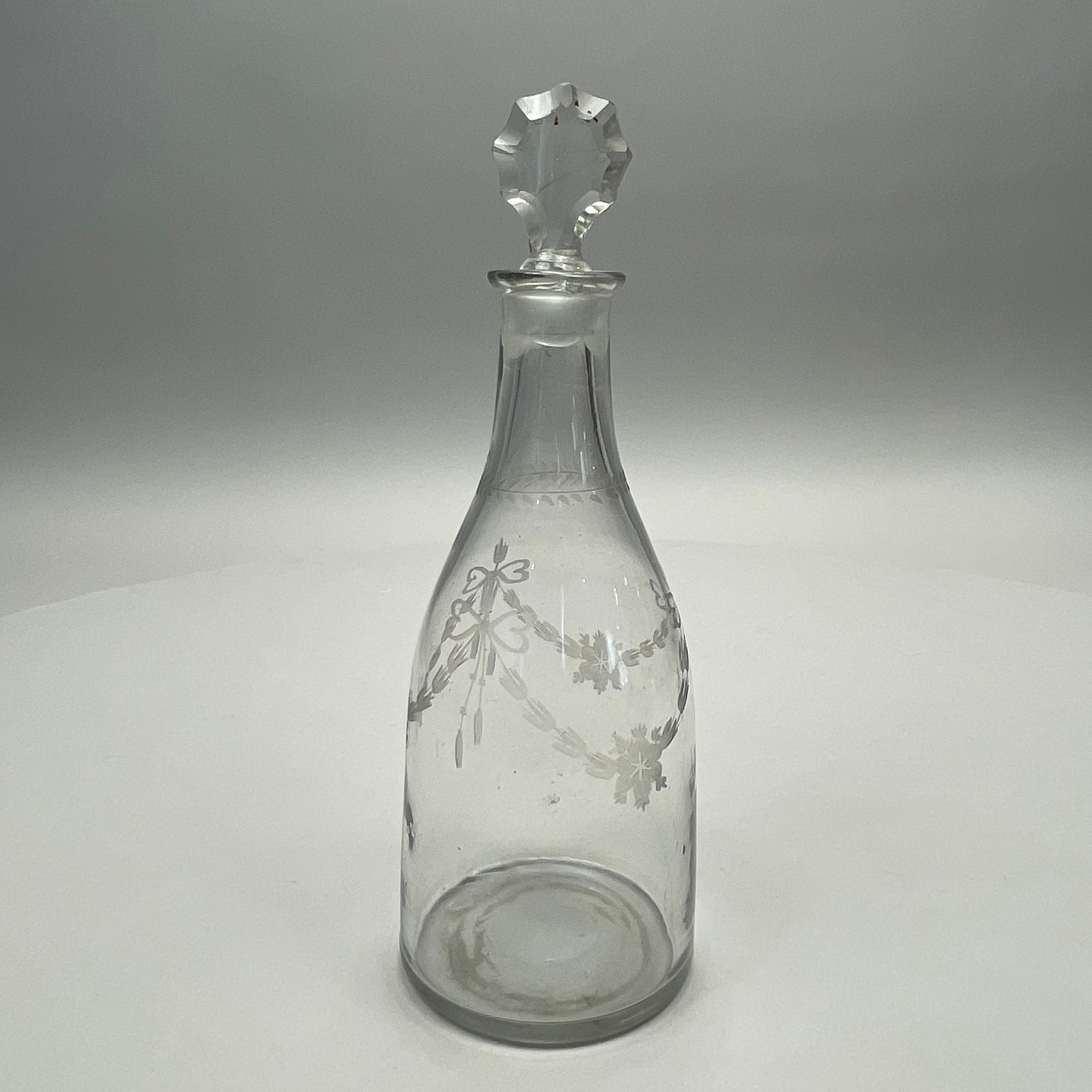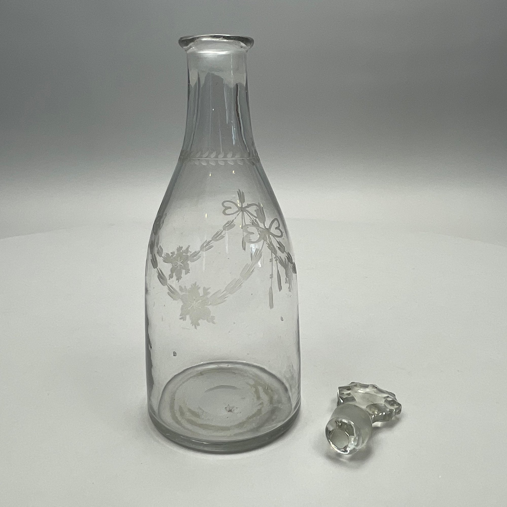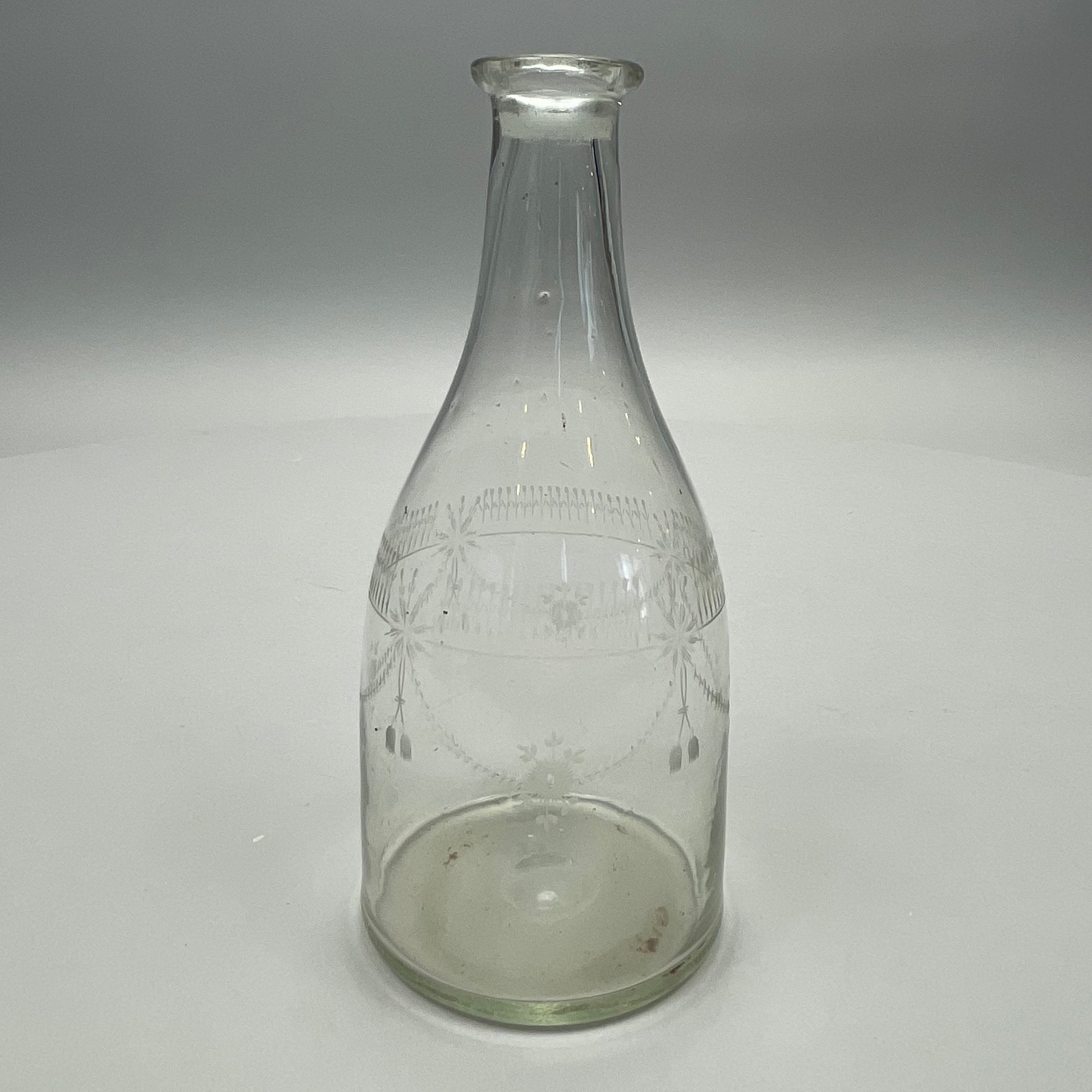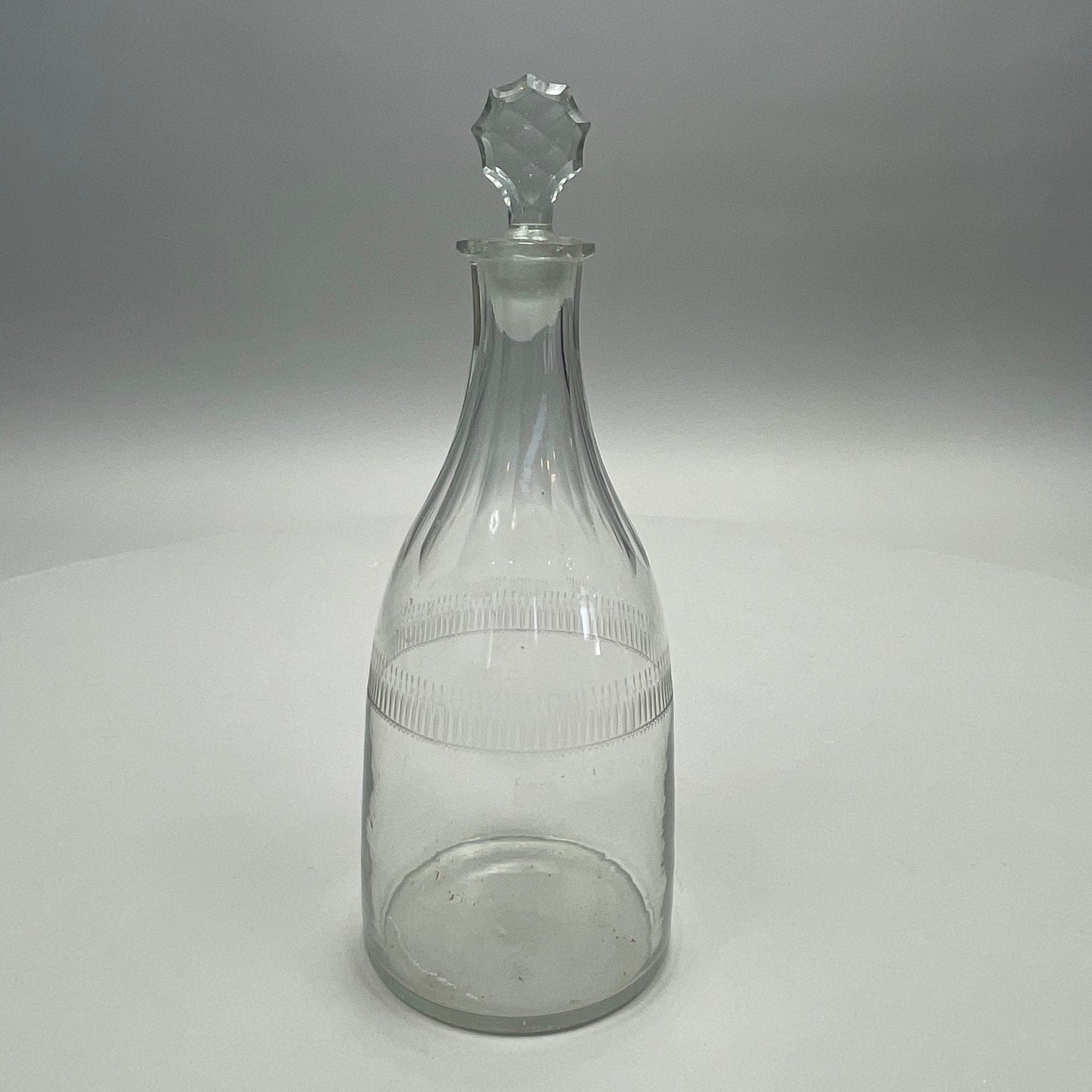 Group of Glass and Silverplate Wares Pertaining to Drinking, Nineteenth Century. Comprising five English and American free-blown and engraved decanters, a swirl-molded decanter and stopper, a silverplate wine coaster, and a Continental drinking glass transfer-printed with a neoclassical scene.