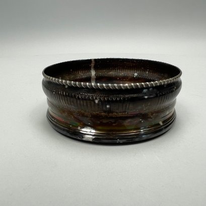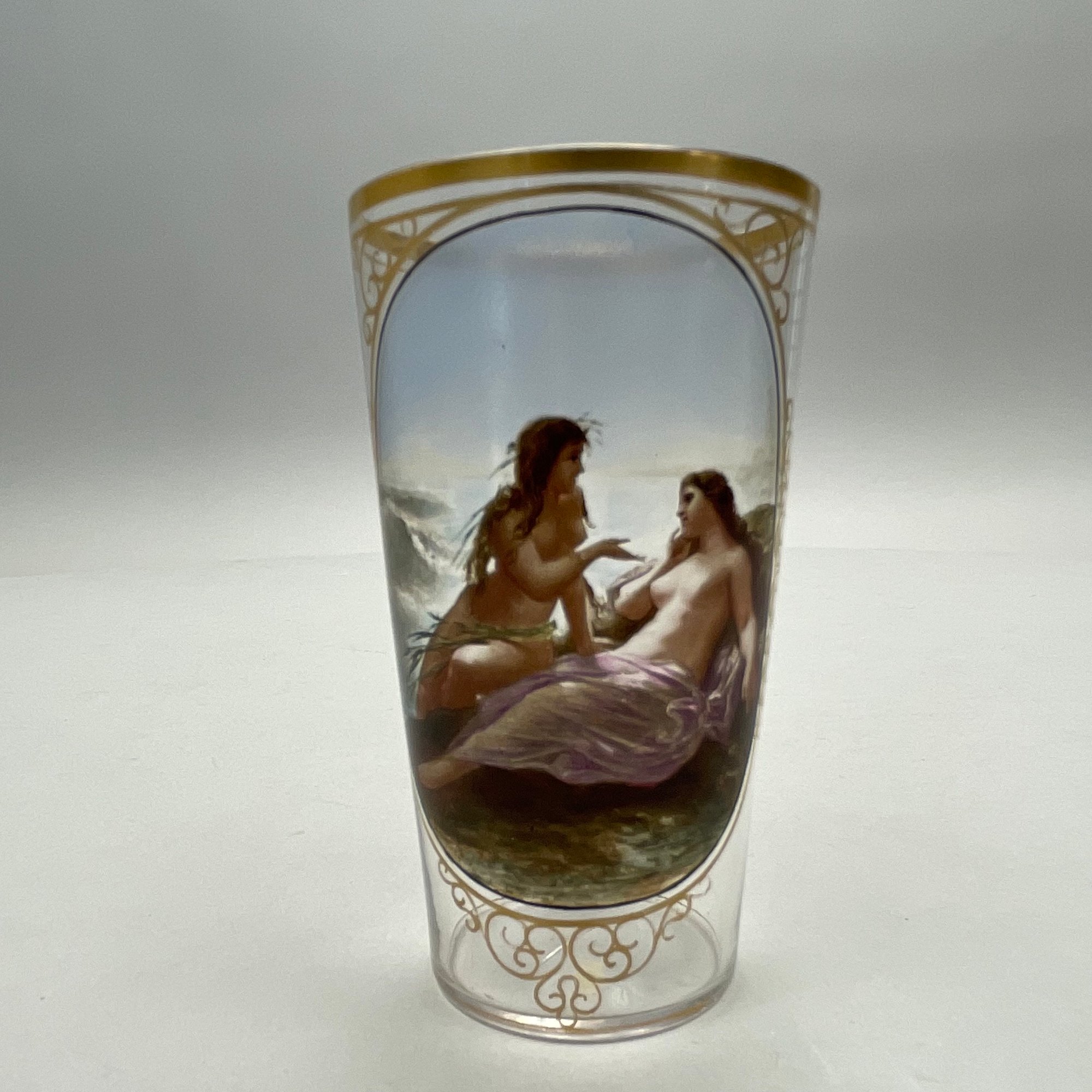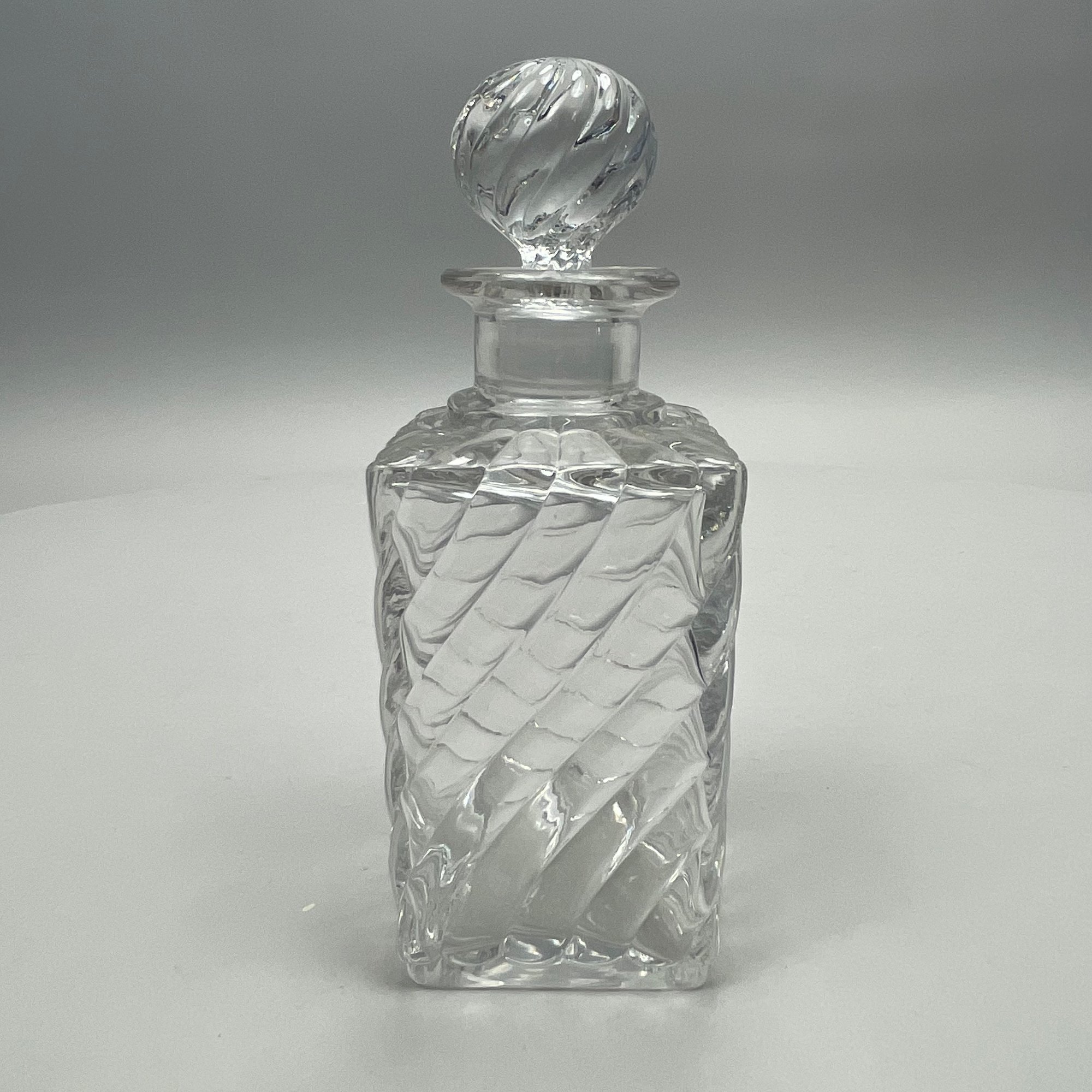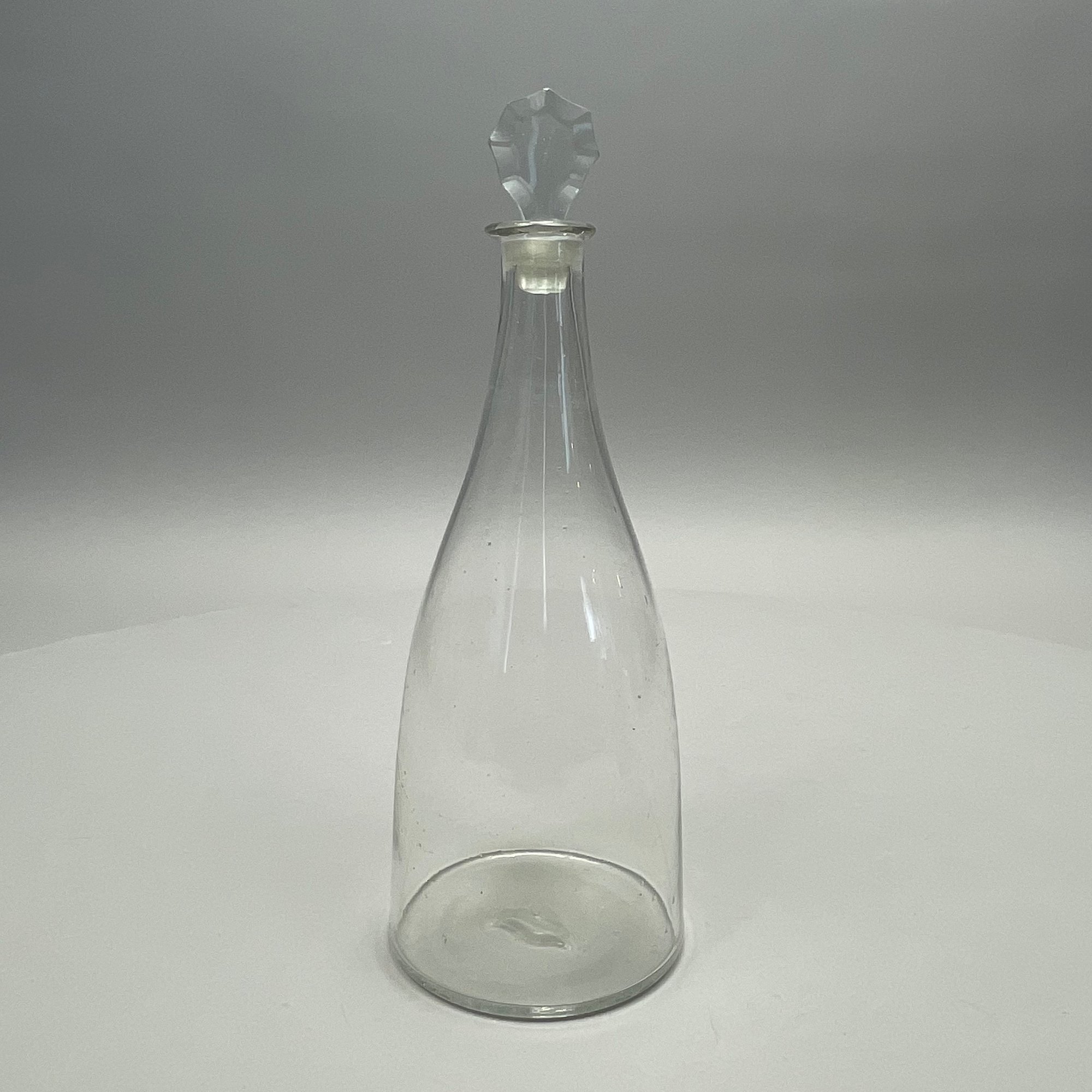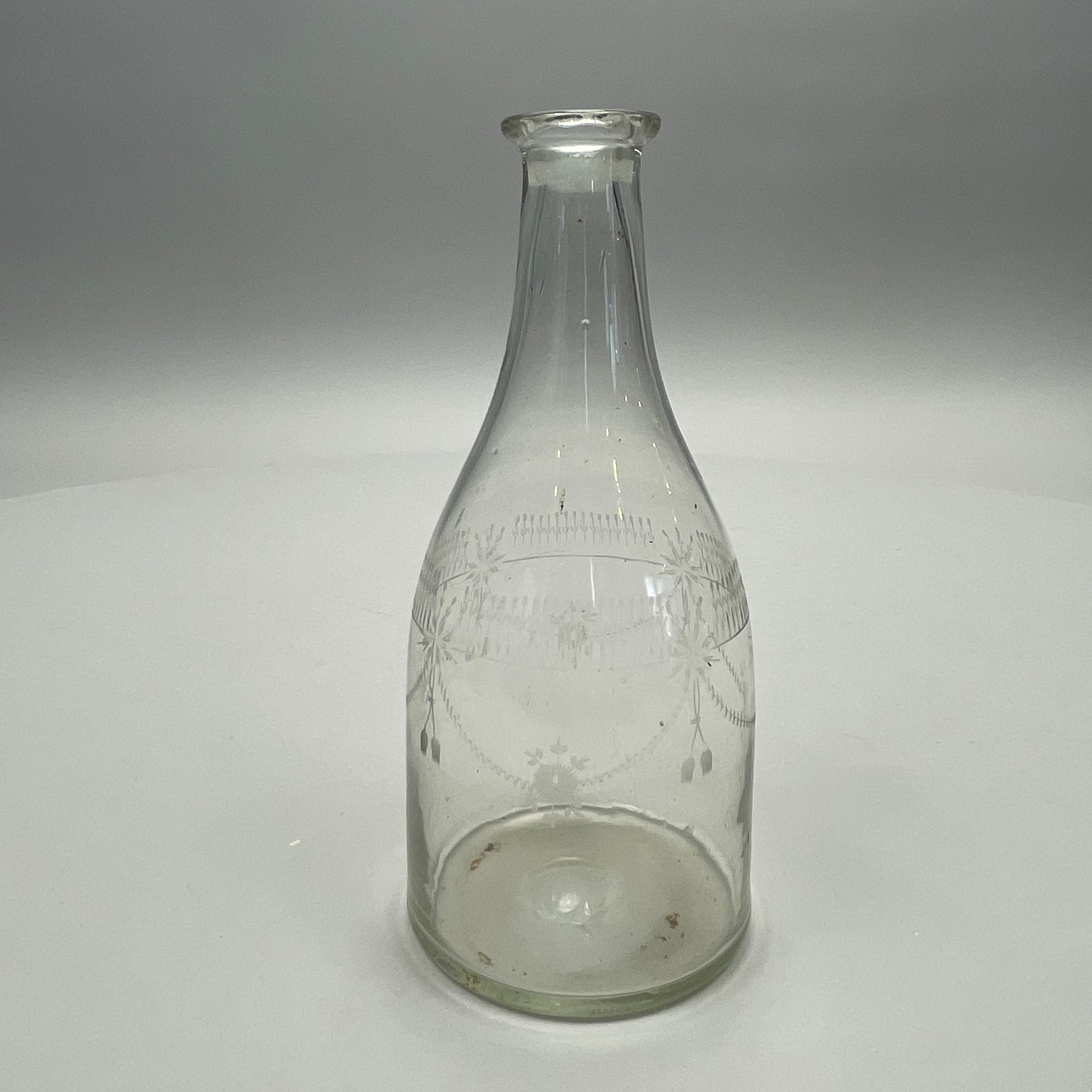 Group of Glass and Silverplate Wares Pertaining to Drinking, Nineteenth Century. Comprising five English and American free-blown and engraved decanters, a swirl-molded decanter and stopper, a silverplate wine coaster, and a Continental drinking glass transfer-printed with a neoclassical scene.