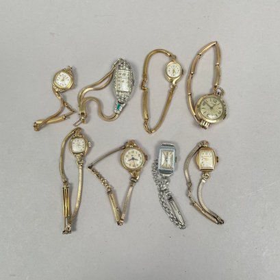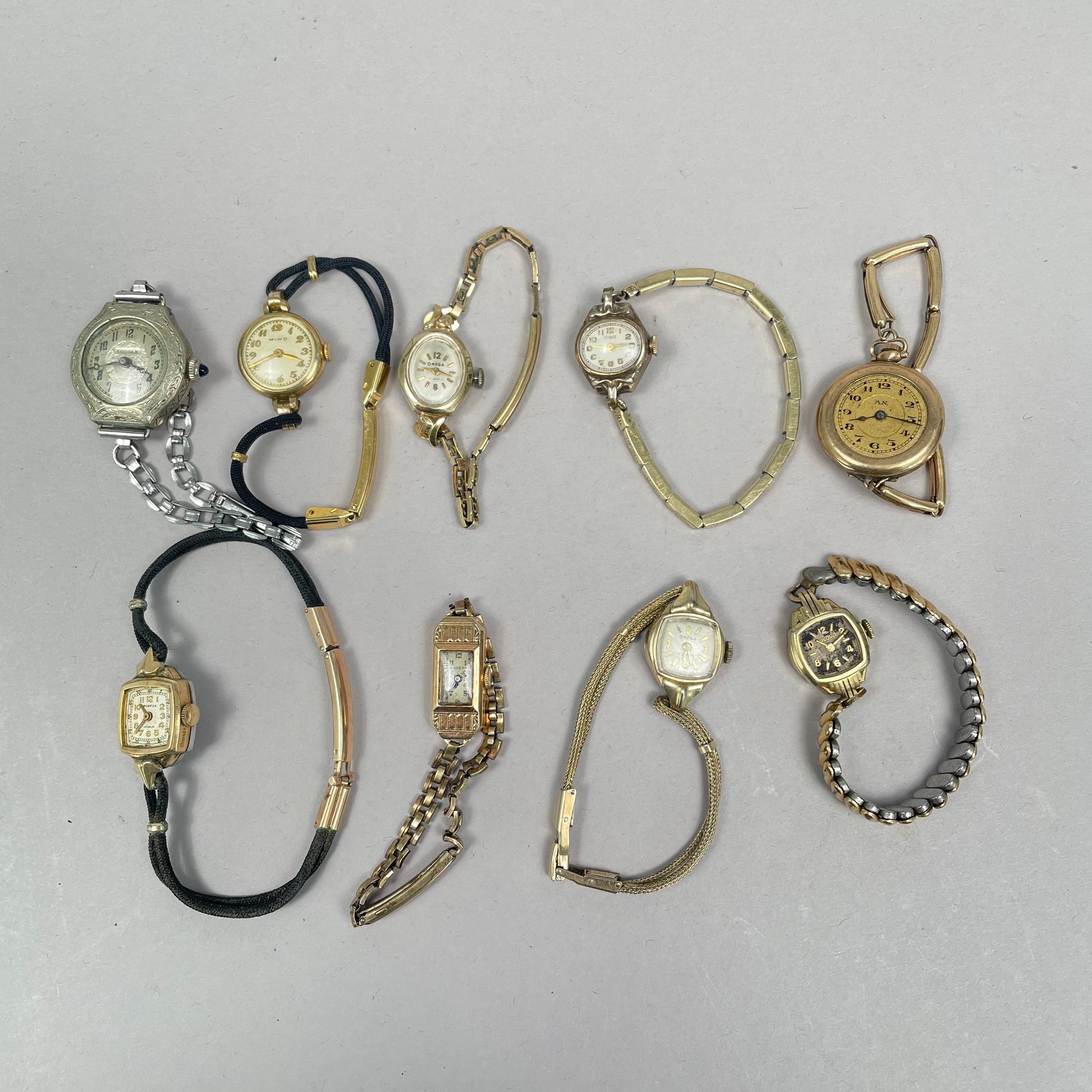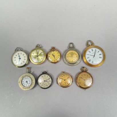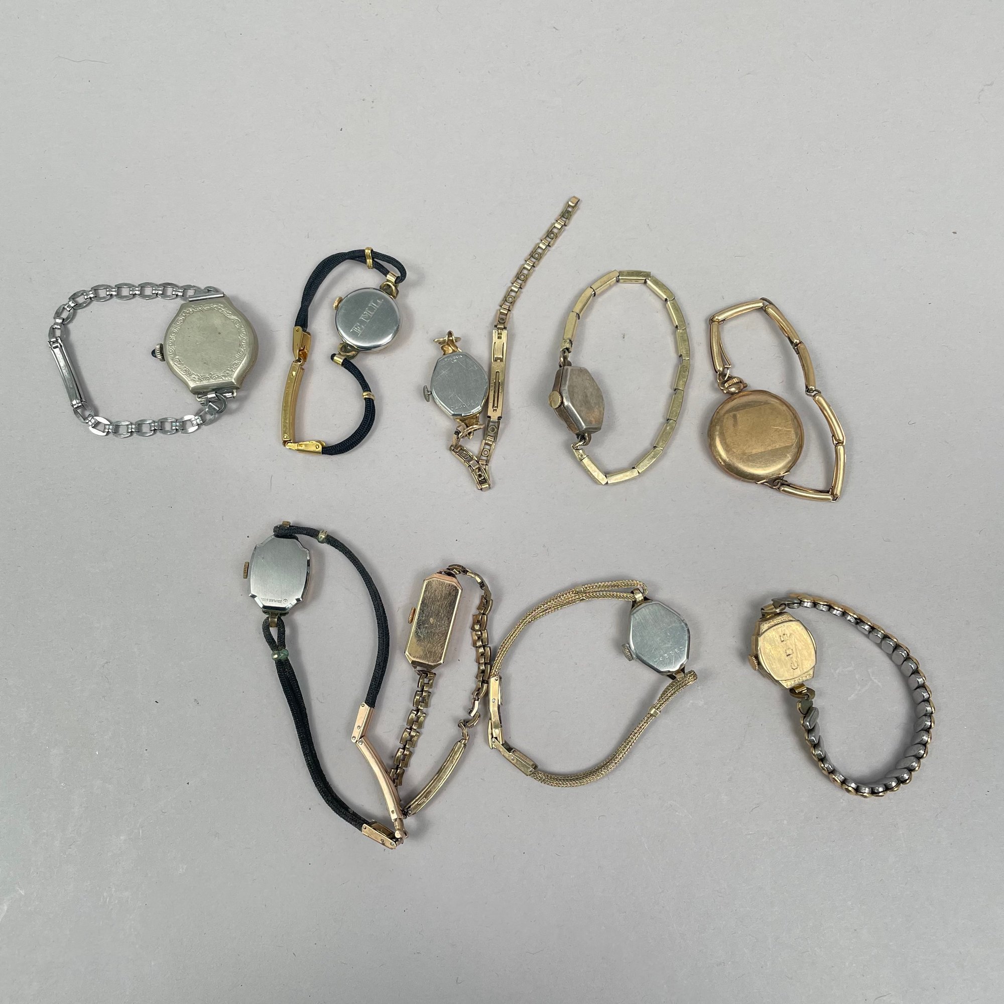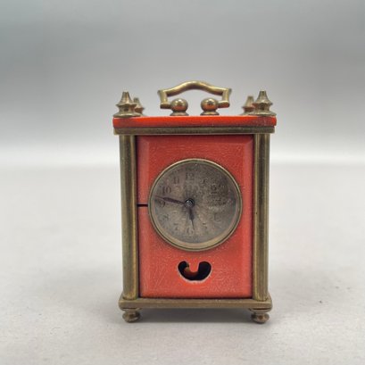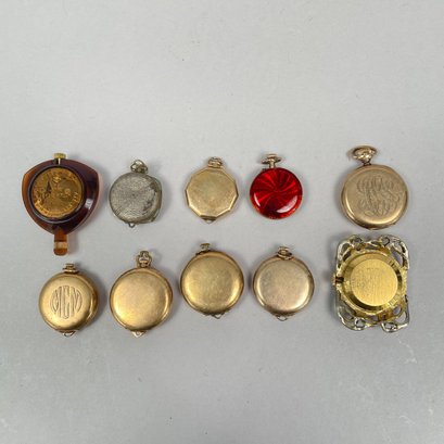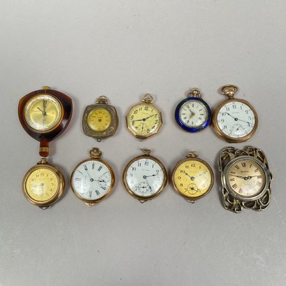 Group of Ladies Pocket and Wrist Watches, and Small Clocks. Including a miniature carriage clock, an Art Deco enamel triangular clock and two travelling clocks.