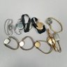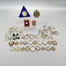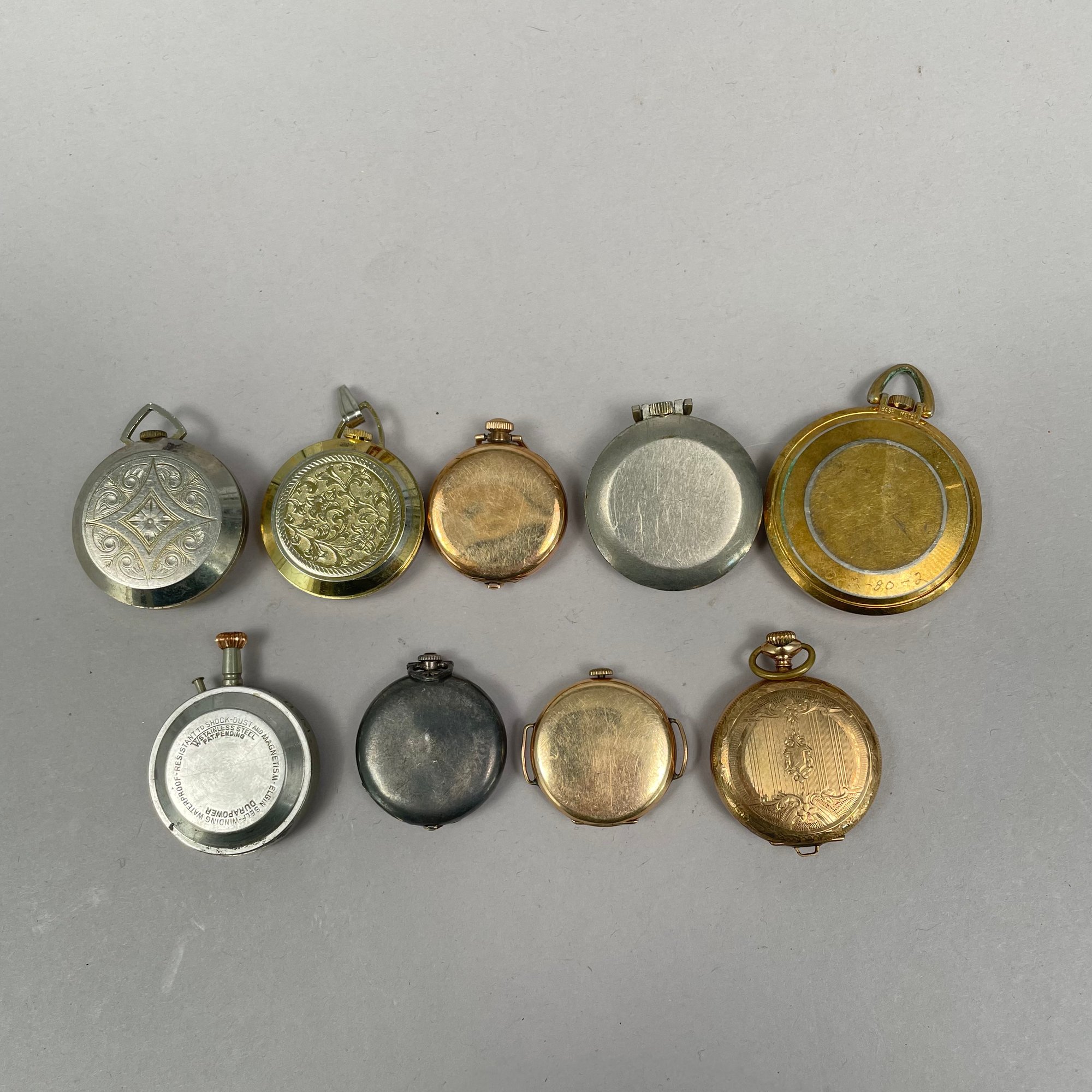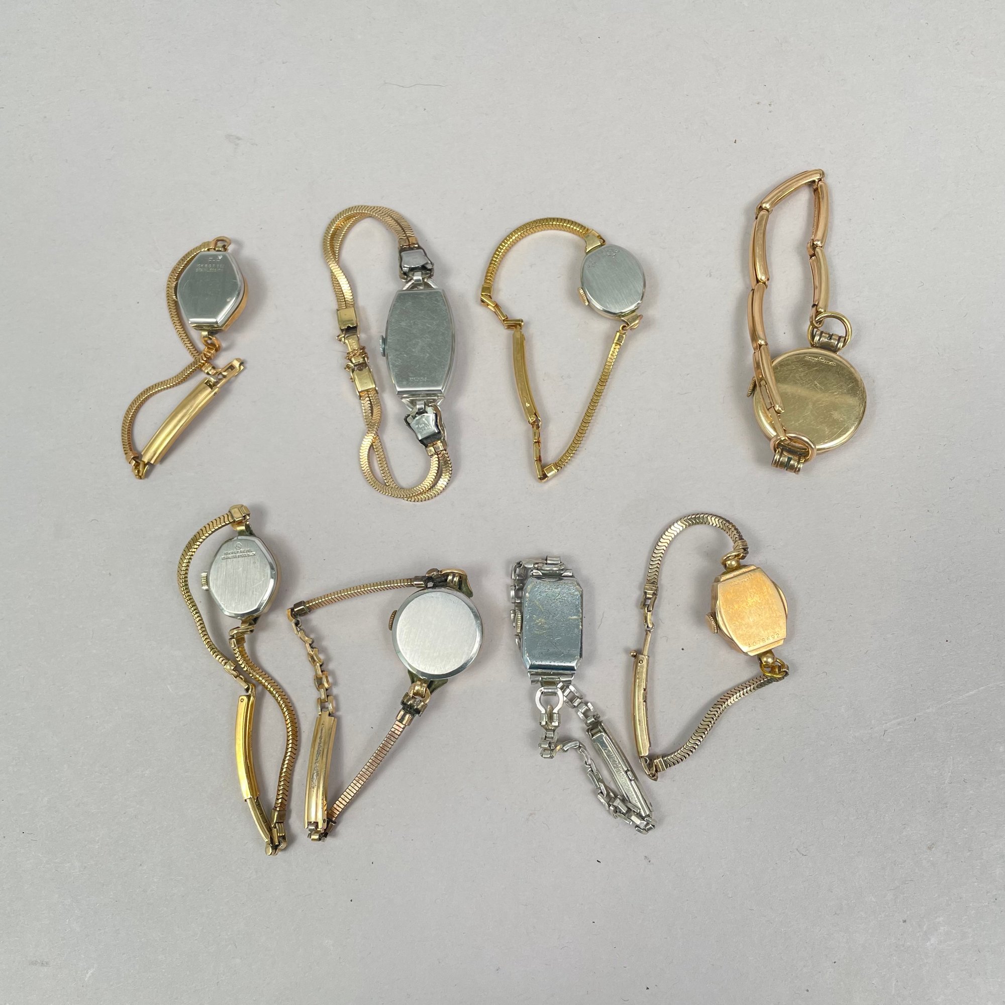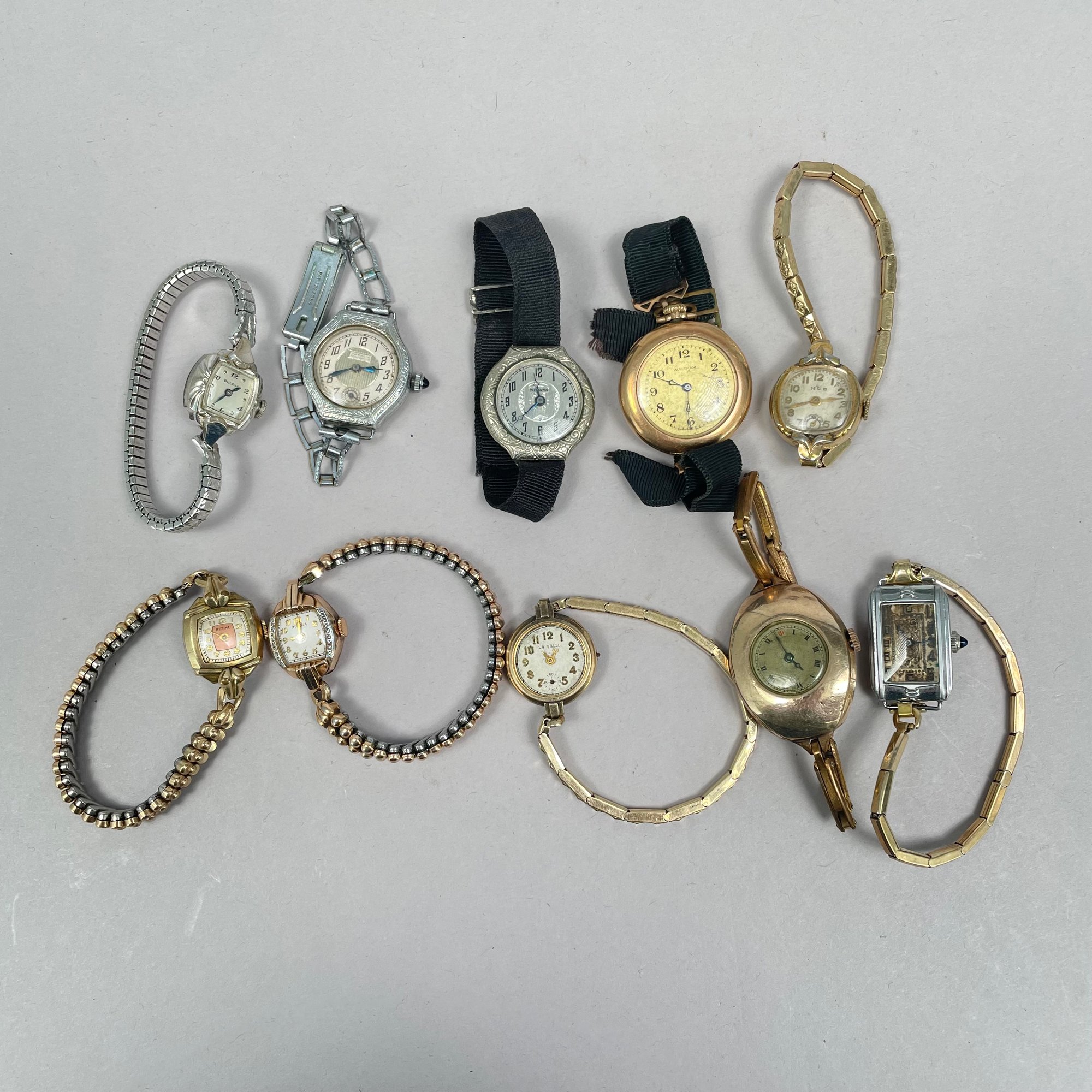 Group of Ladies Pocket and Wrist Watches, and Small Clocks. Including a miniature carriage clock, an Art Deco enamel triangular clock and two travelling clocks.