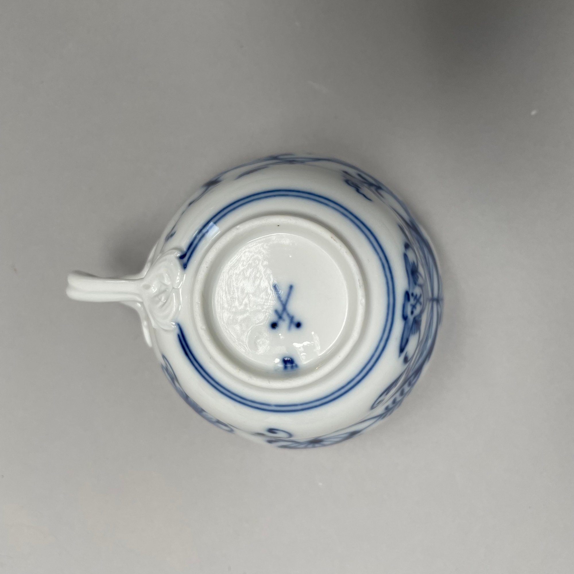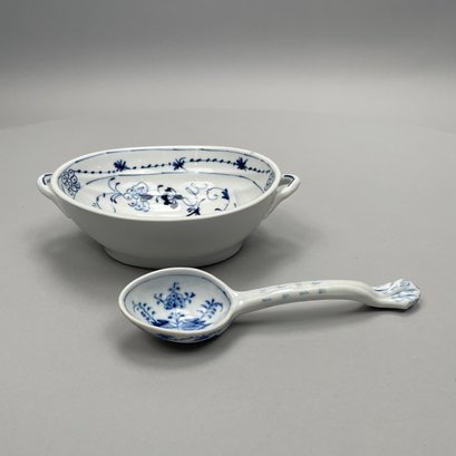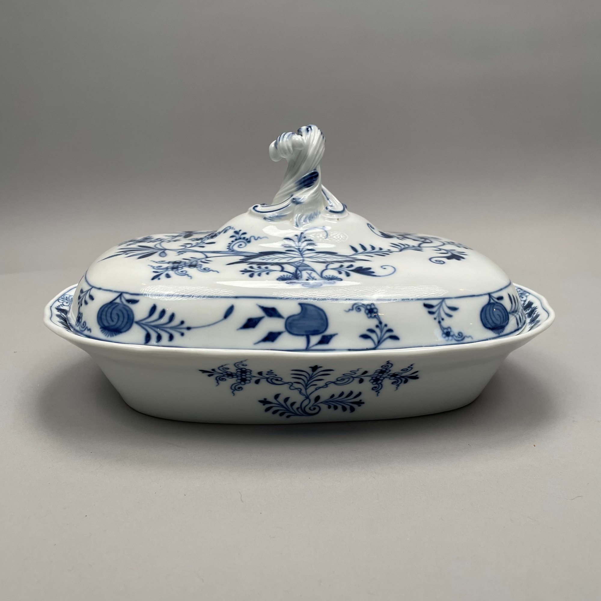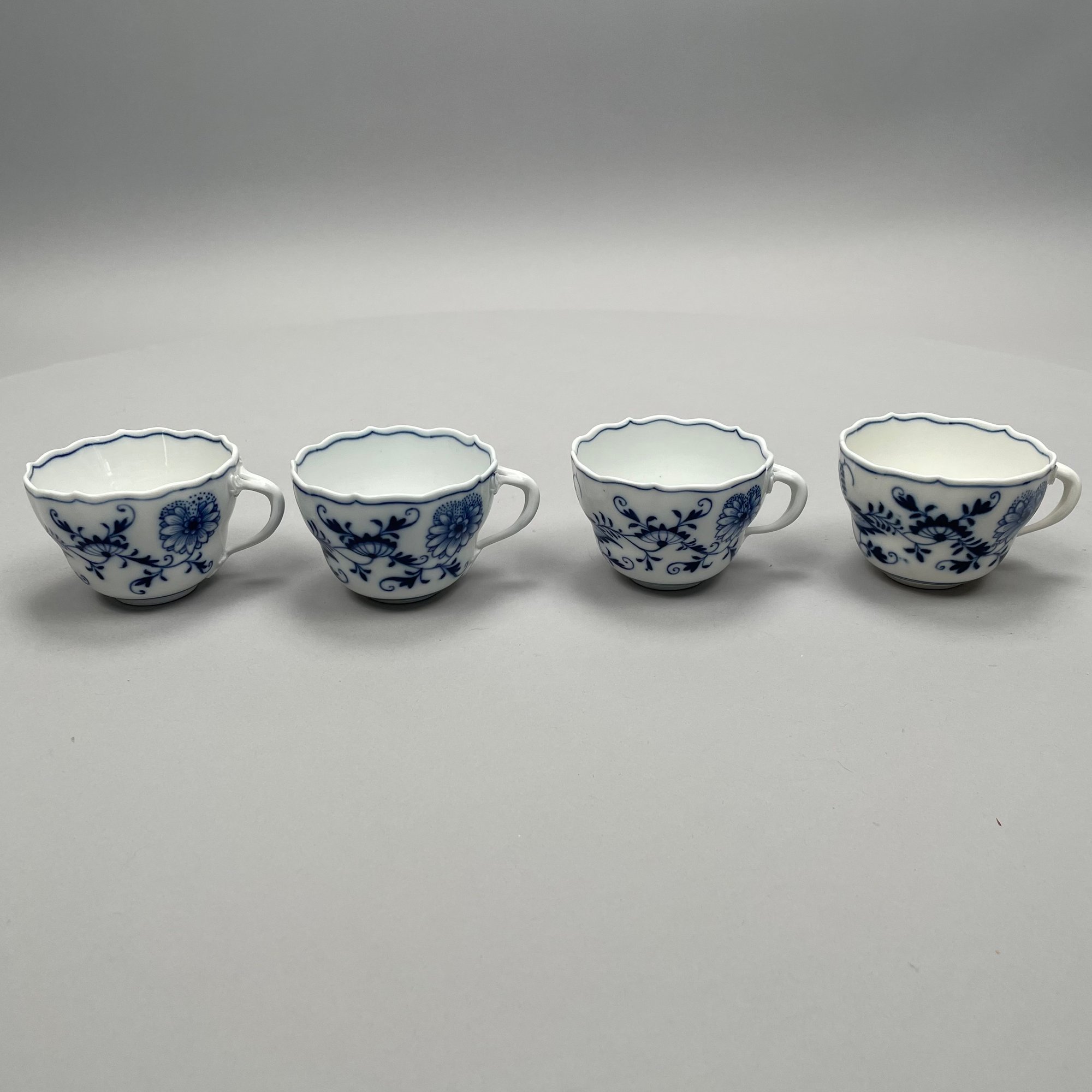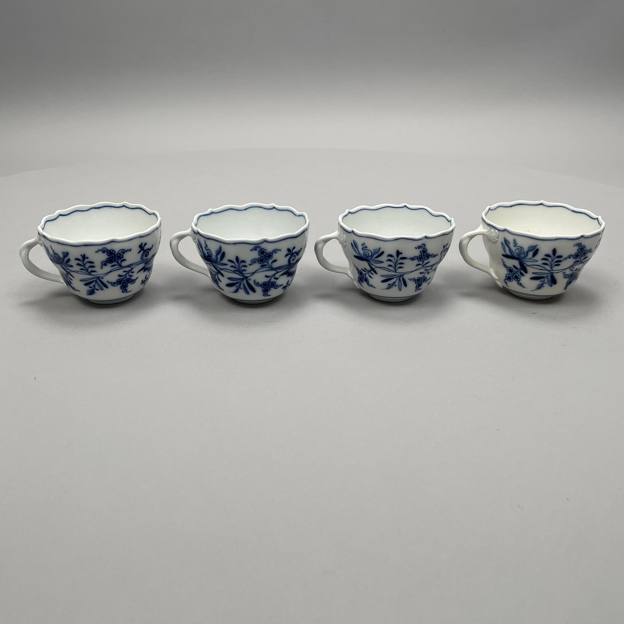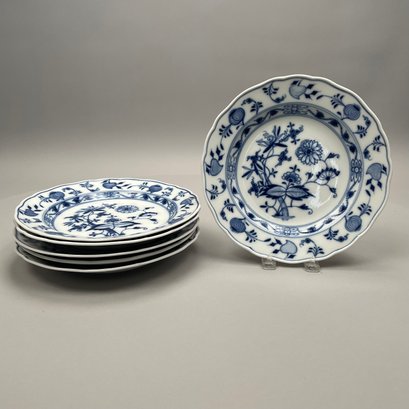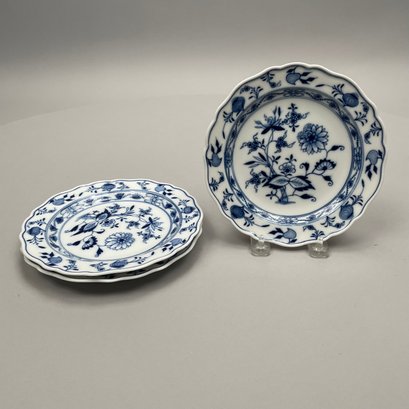 Group of Meissen Porcelain 'Blue Onion' Pattern Dinner Wares, Twentieth Century. Comprising a tureen and a cover, two-handled serving bowl, serving spoon, four fruit dishes, three bread and butter plates, six dinner plates and four teacups, various crossed swords and cancelled crossed swords marks in underglaze-blue, impressed and incised numbers. (20)