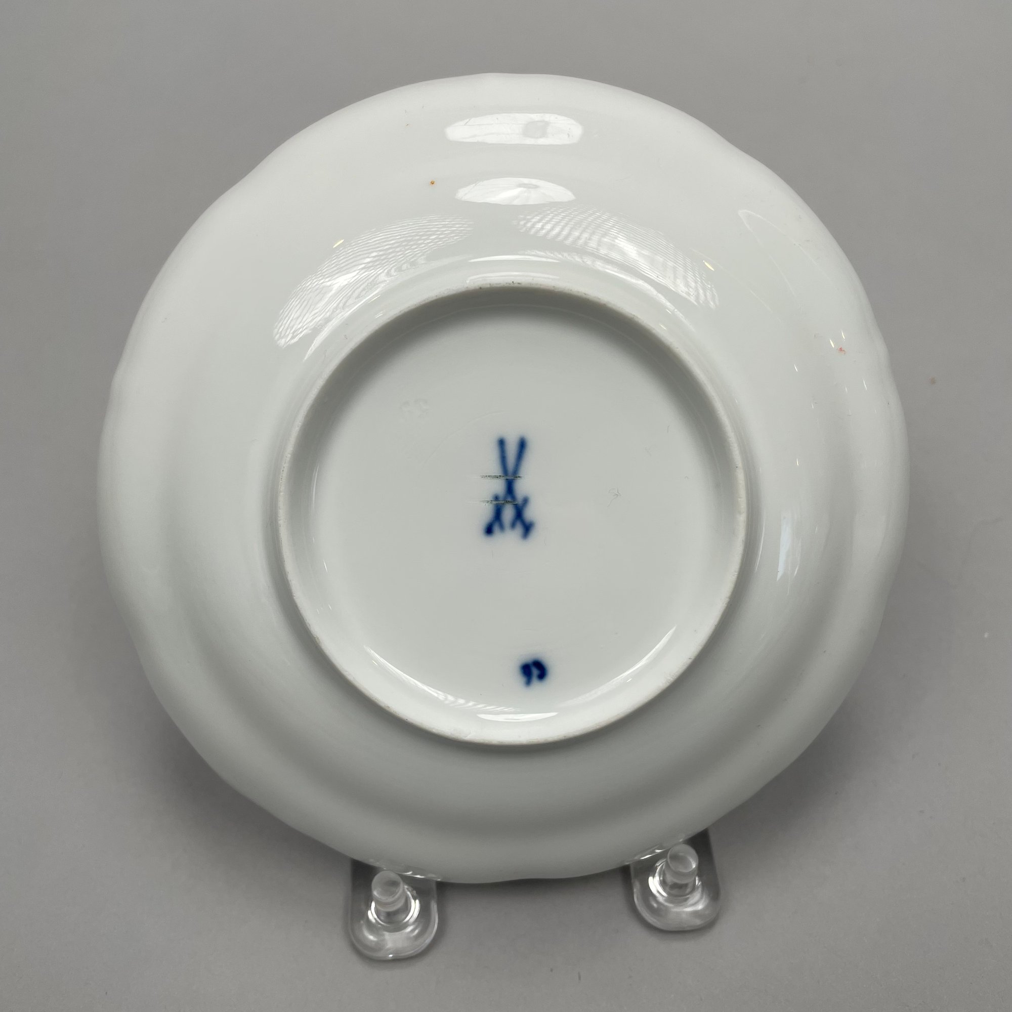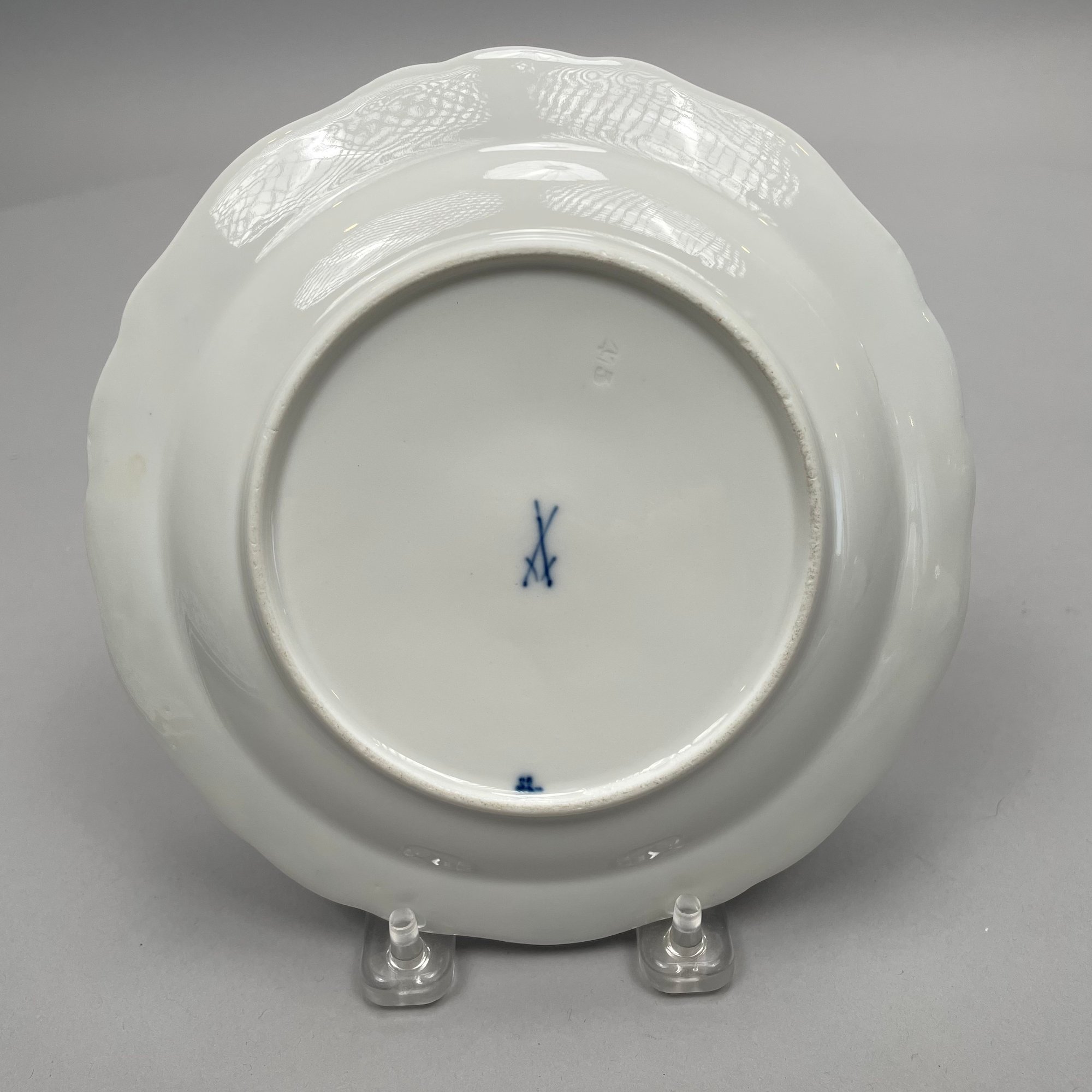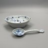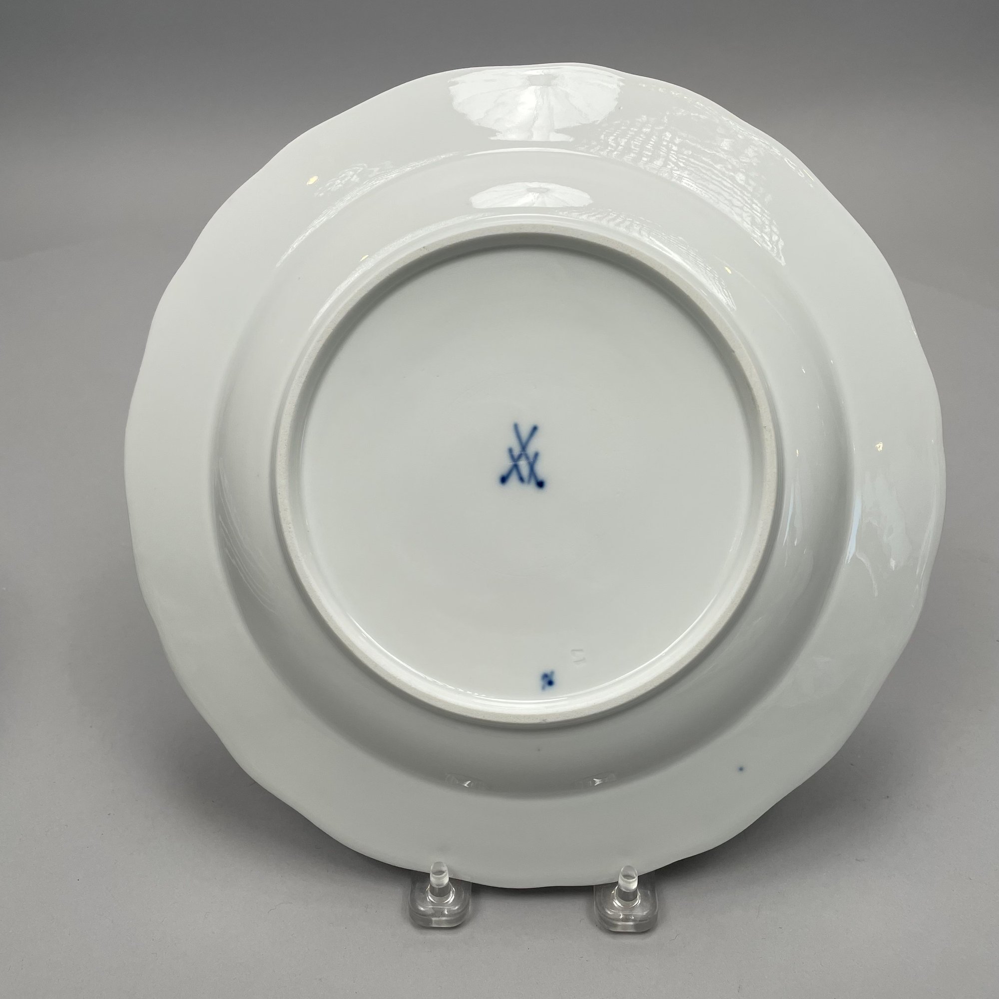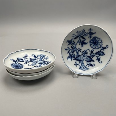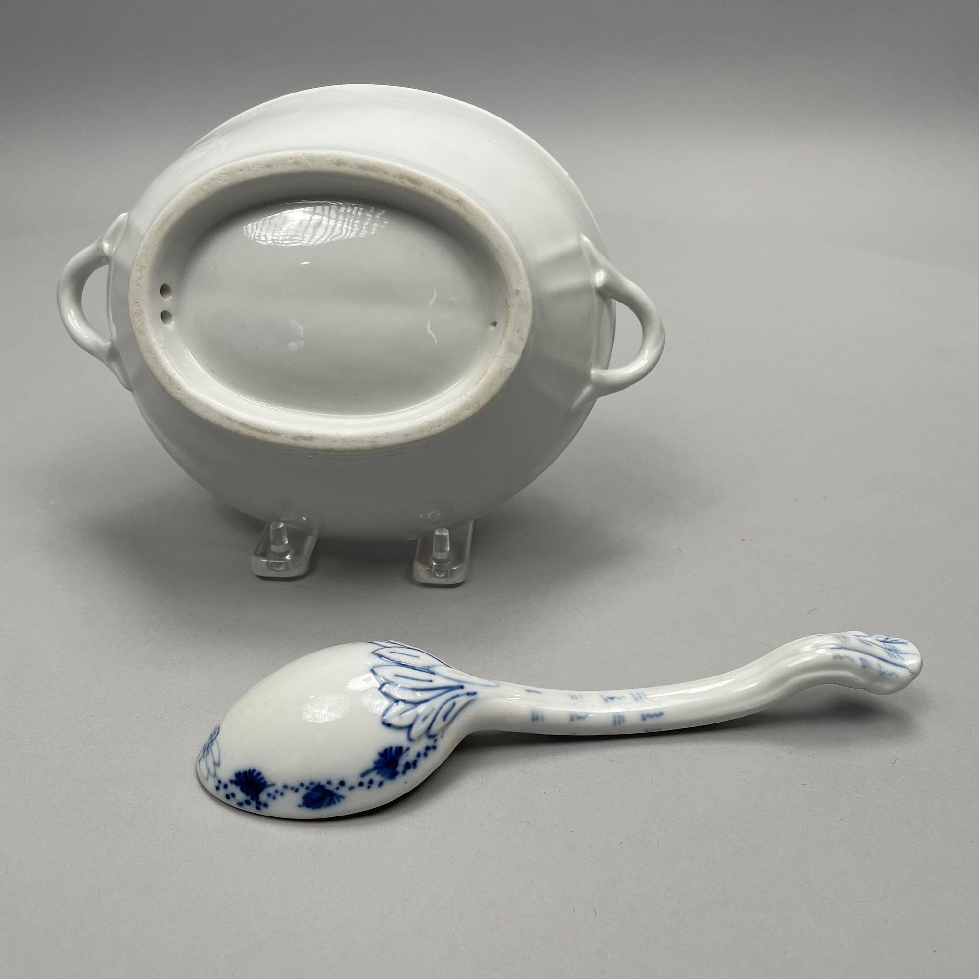 Group of Meissen Porcelain 'Blue Onion' Pattern Dinner Wares, Twentieth Century. Comprising a tureen and a cover, two-handled serving bowl, serving spoon, four fruit dishes, three bread and butter plates, six dinner plates and four teacups, various crossed swords and cancelled crossed swords marks in underglaze-blue, impressed and incised numbers. (20)