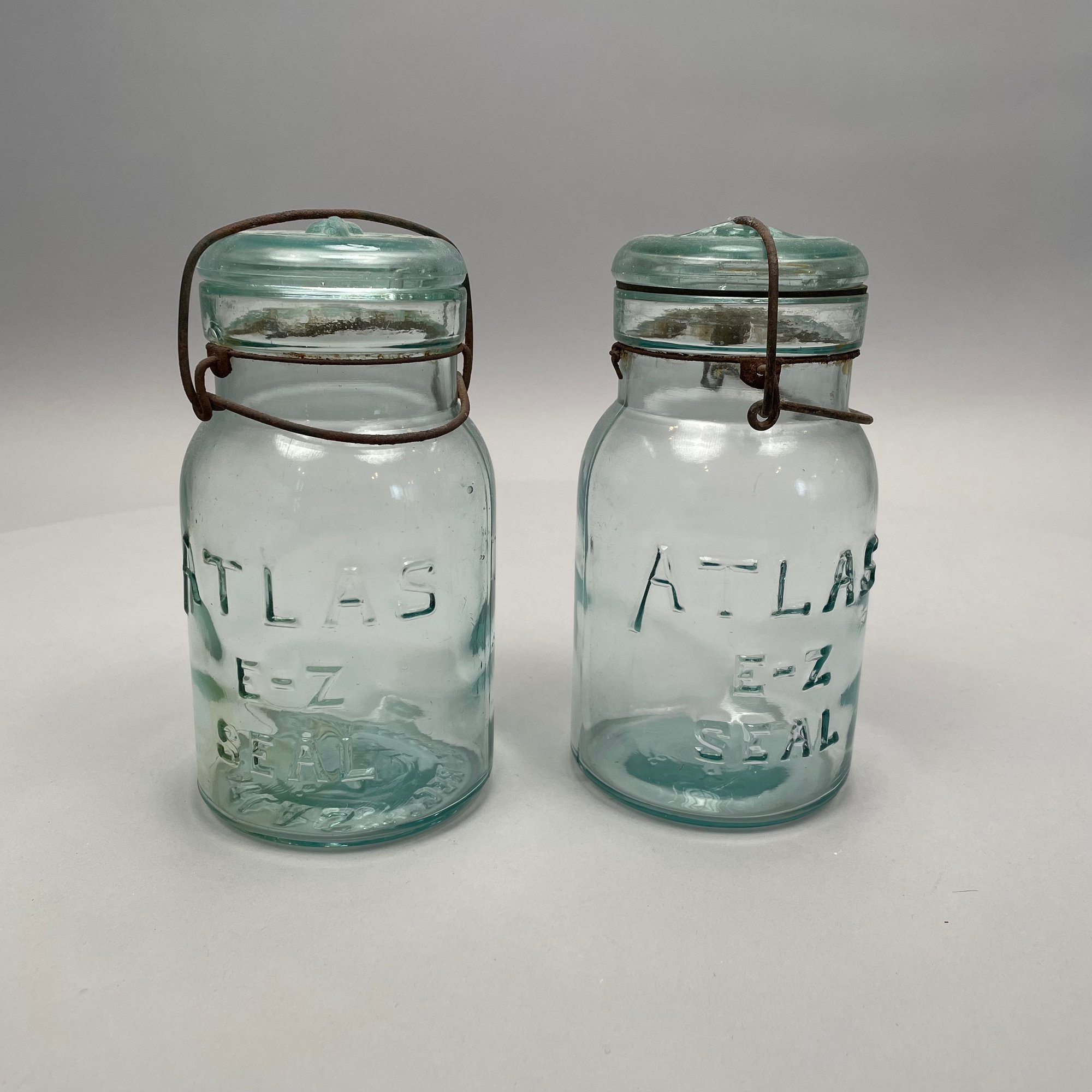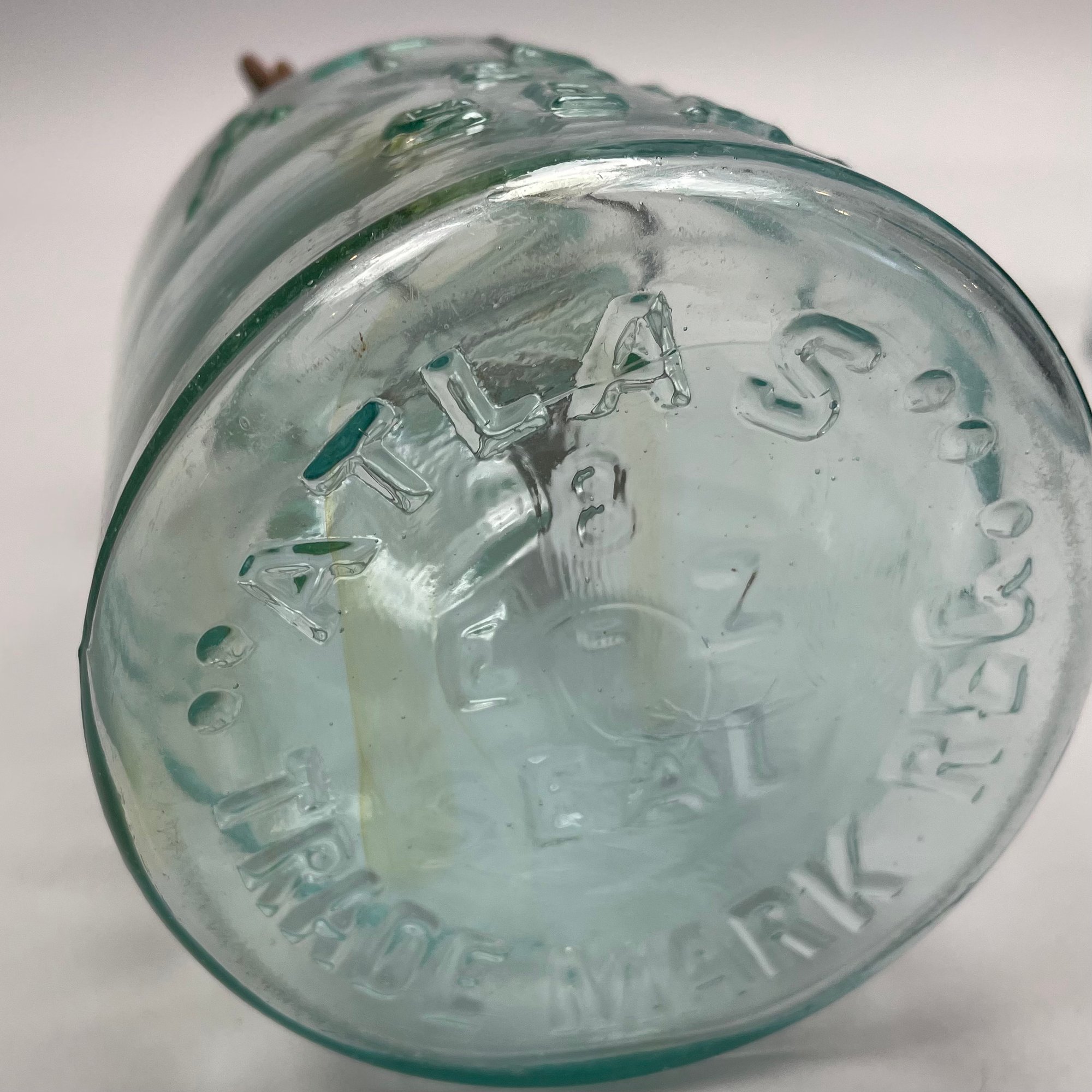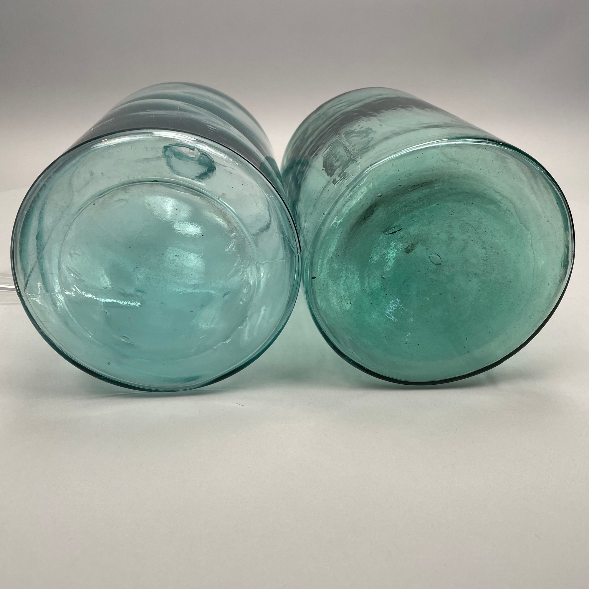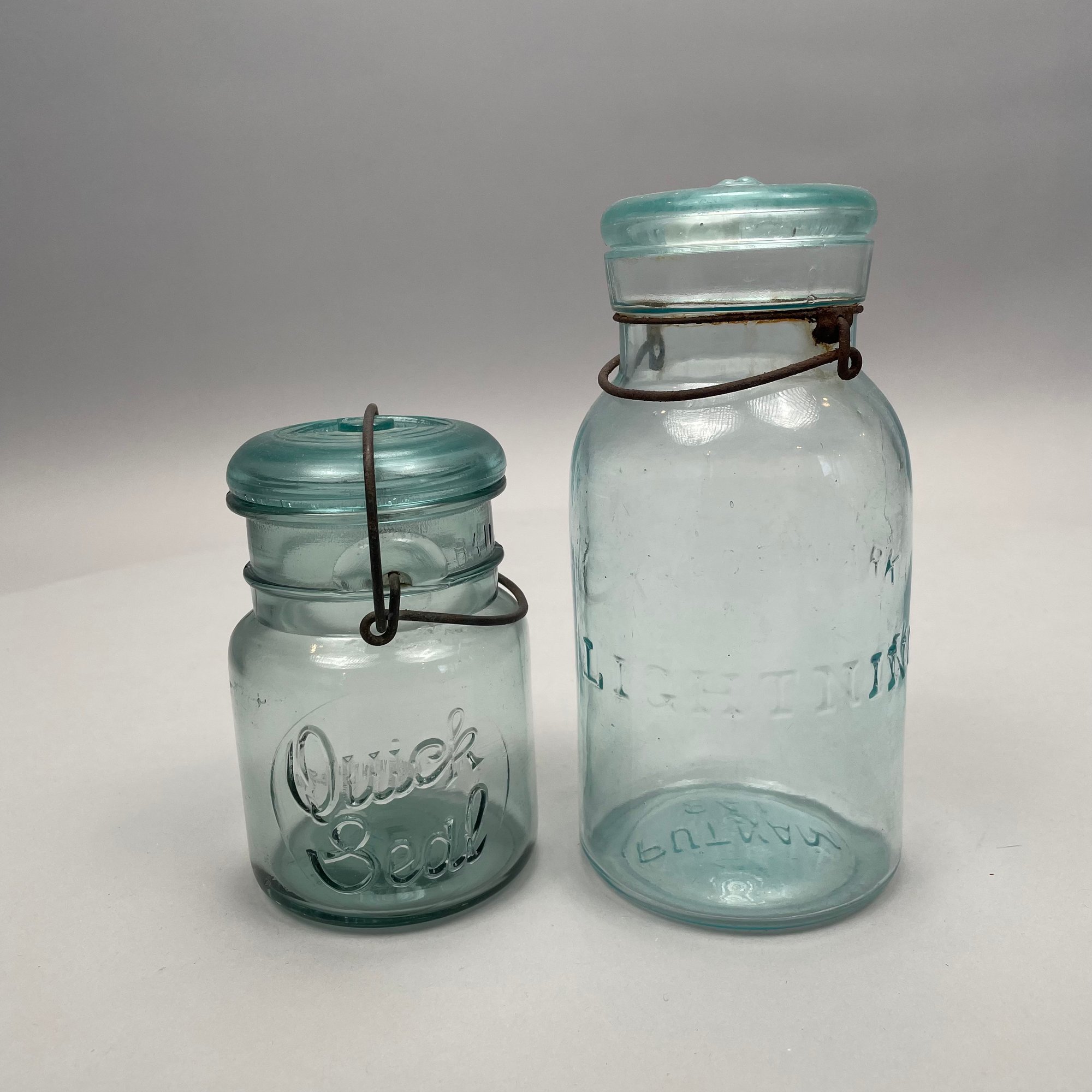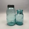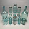 Group of American Molded and Pressed Aquamarine Glass Bottles and Jars. Comprising a pair of blown two-mold bottles, a Niagara Bottling Co. bottle, a Buffalo, NY bottle, a cream bottle, and eight Atlas, Ball, Lightning and Quick Seal canning jars. (13)
