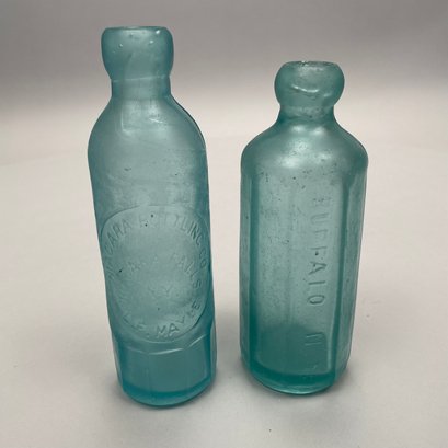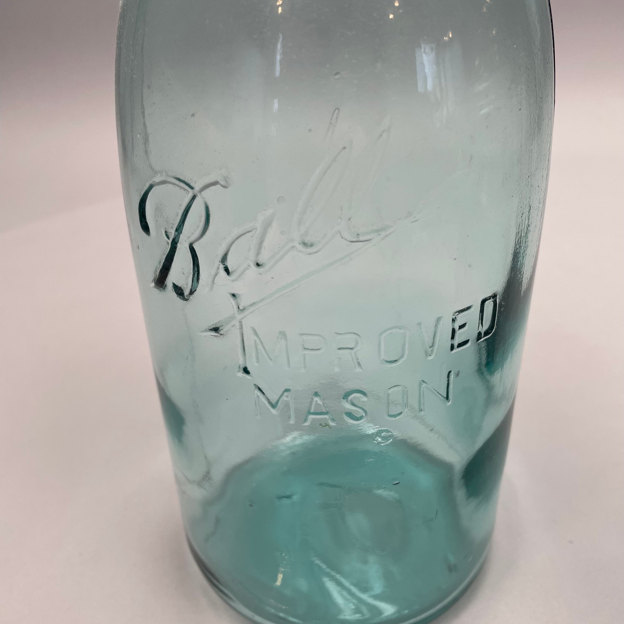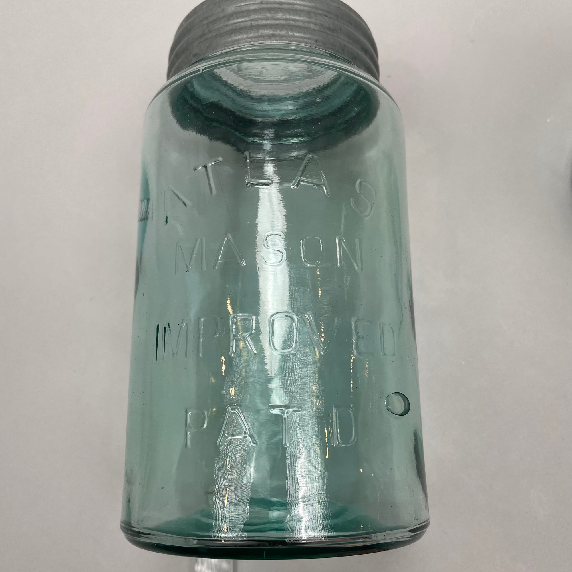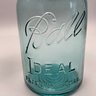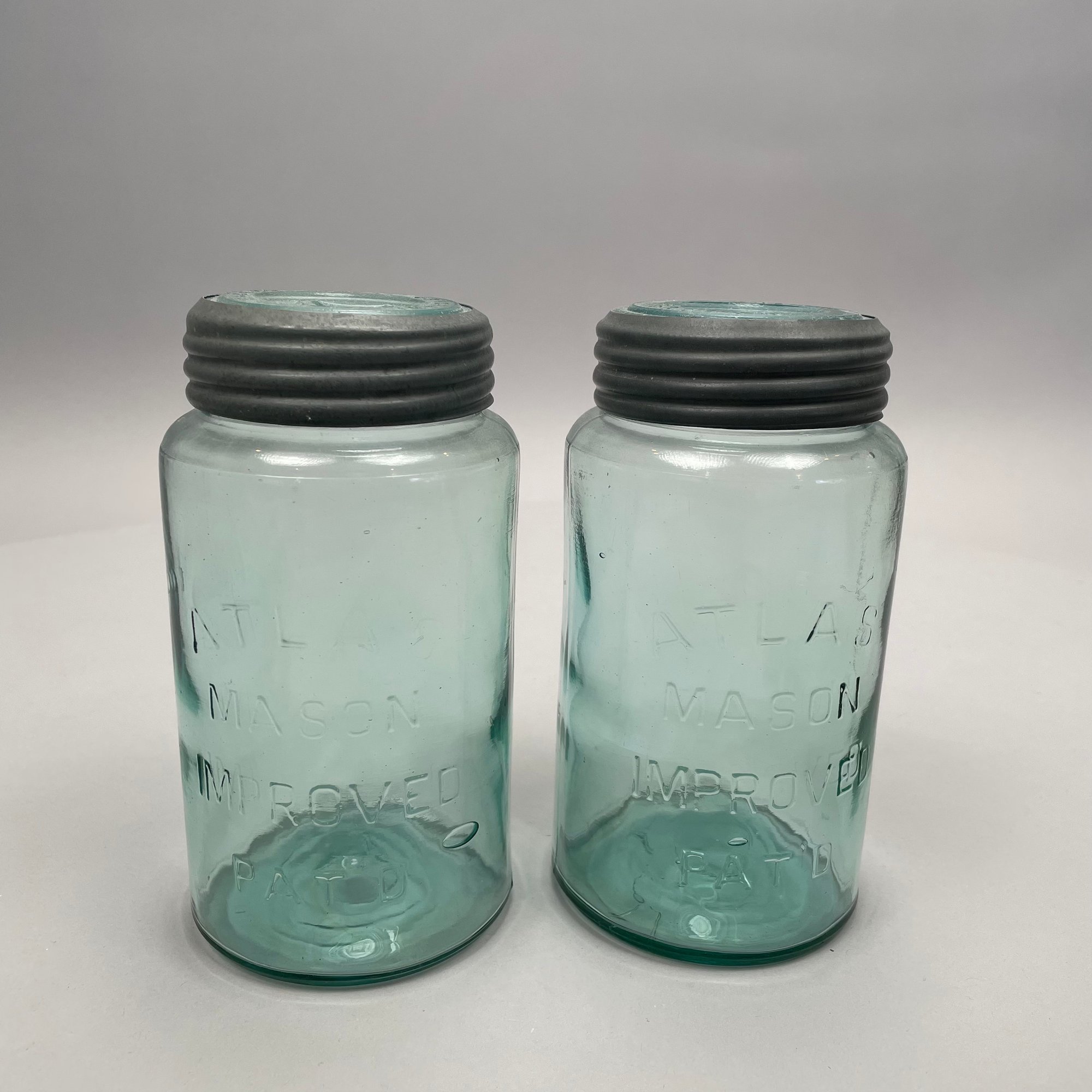 Group of American Molded and Pressed Aquamarine Glass Bottles and Jars. Comprising a pair of blown two-mold bottles, a Niagara Bottling Co. bottle, a Buffalo, NY bottle, a cream bottle, and eight Atlas, Ball, Lightning and Quick Seal canning jars. (13)