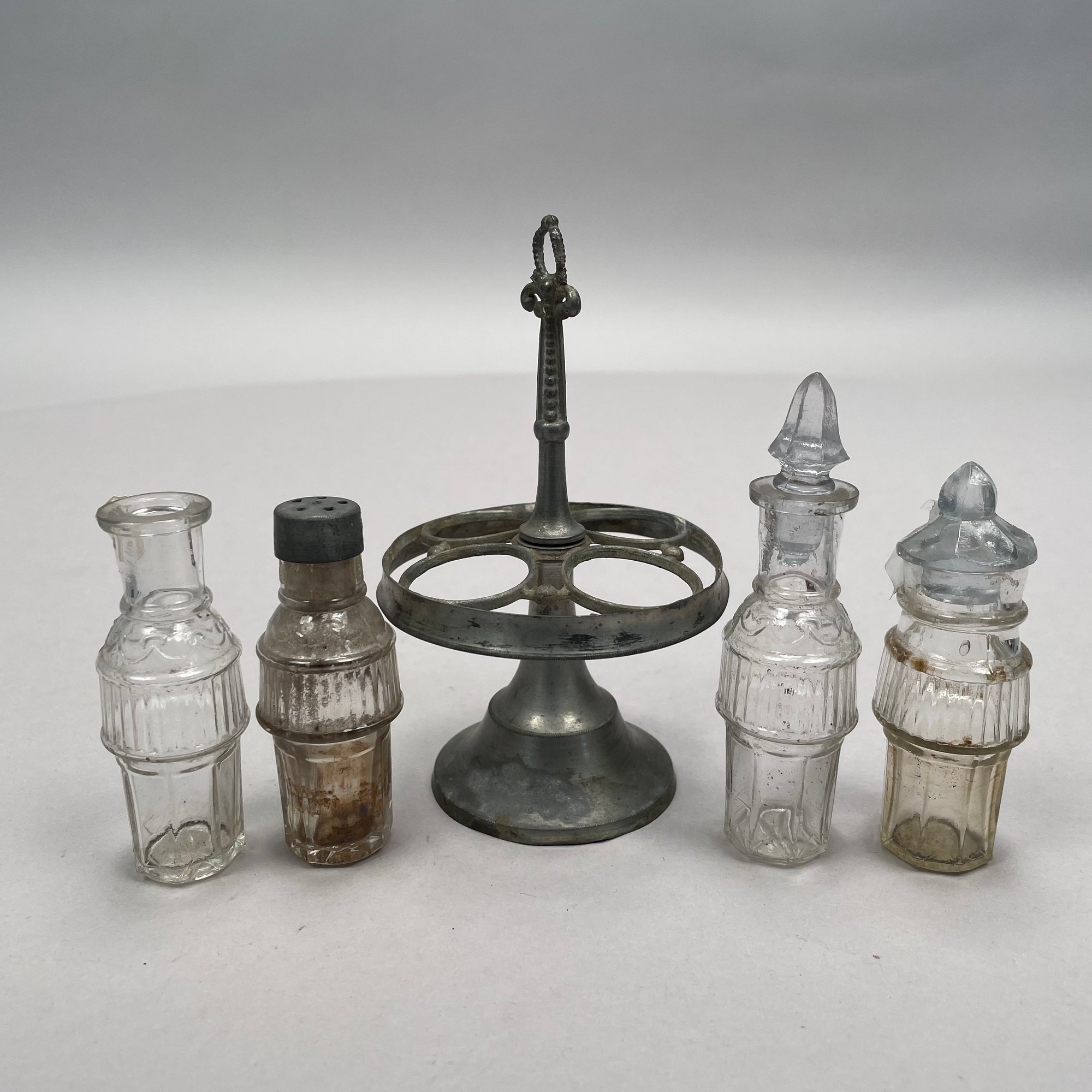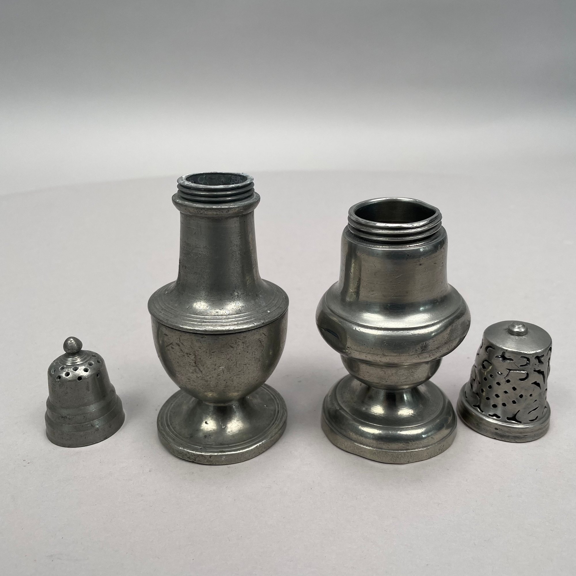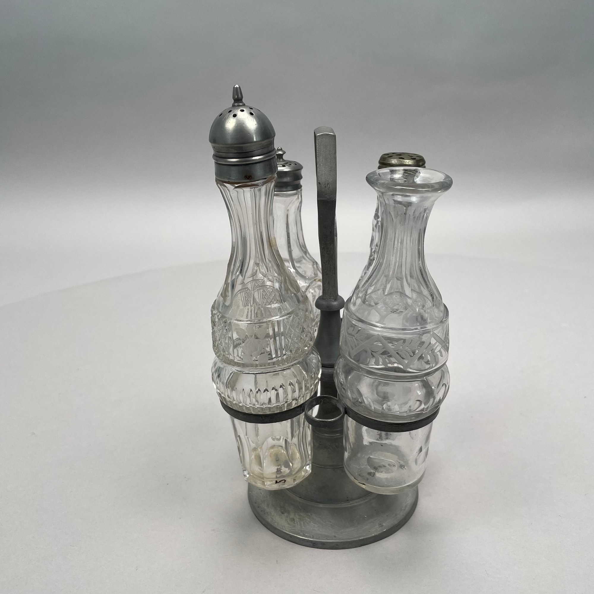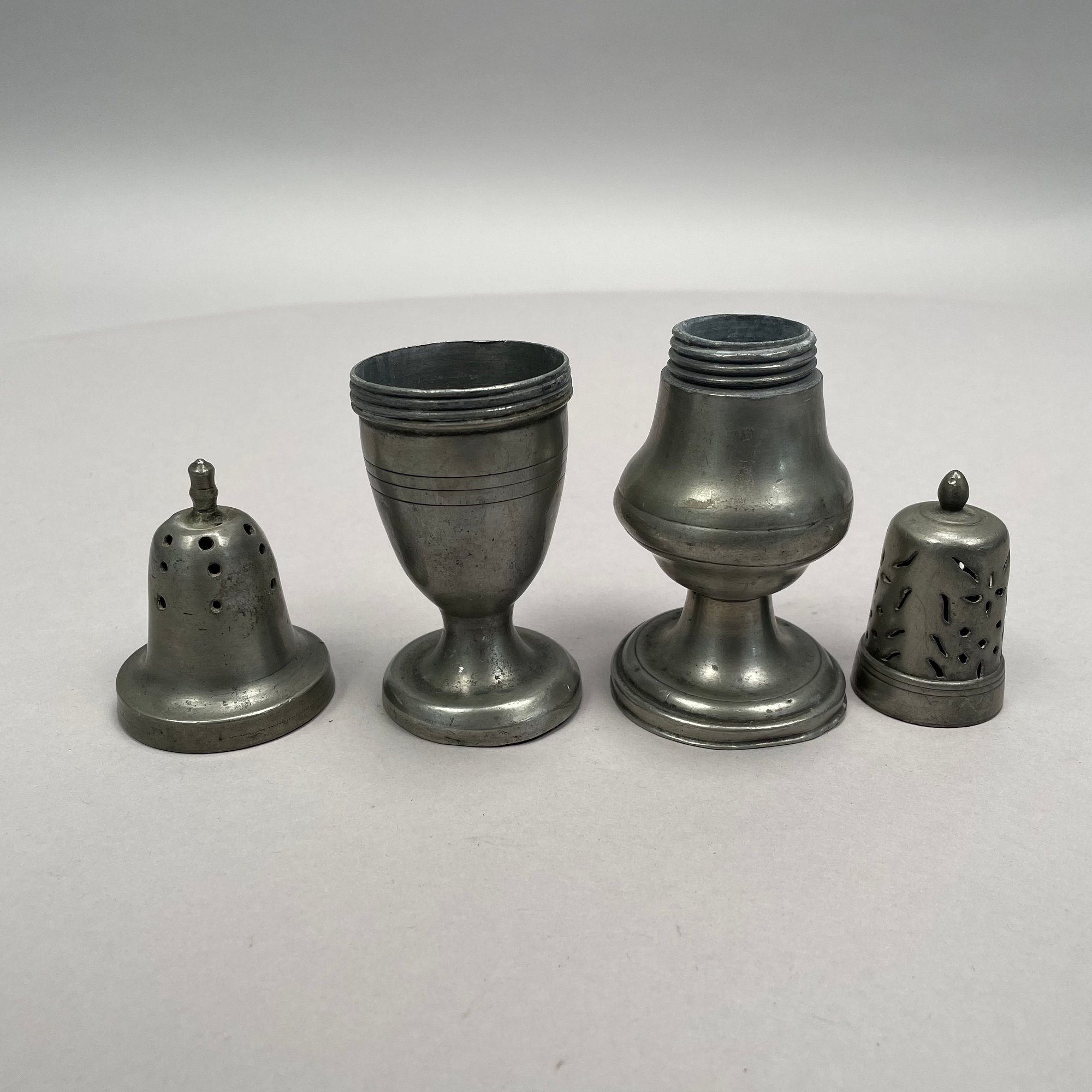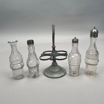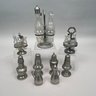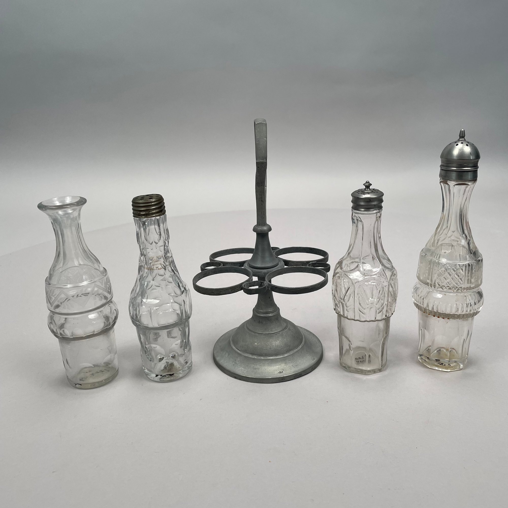 Group of Pewter and Glass Table Wares, Late Nineteenth-Twentieth Century. Comprising two miniature or toy four-piece castor sets, the glass bottles in each set in matching patterns; a four-piece castor set, the stand Eben Smith, Beverly, Massachusetts, circa 1840-56, fitted with four mismatched bottles; a pair of salt and pepper shakers; and four castors.