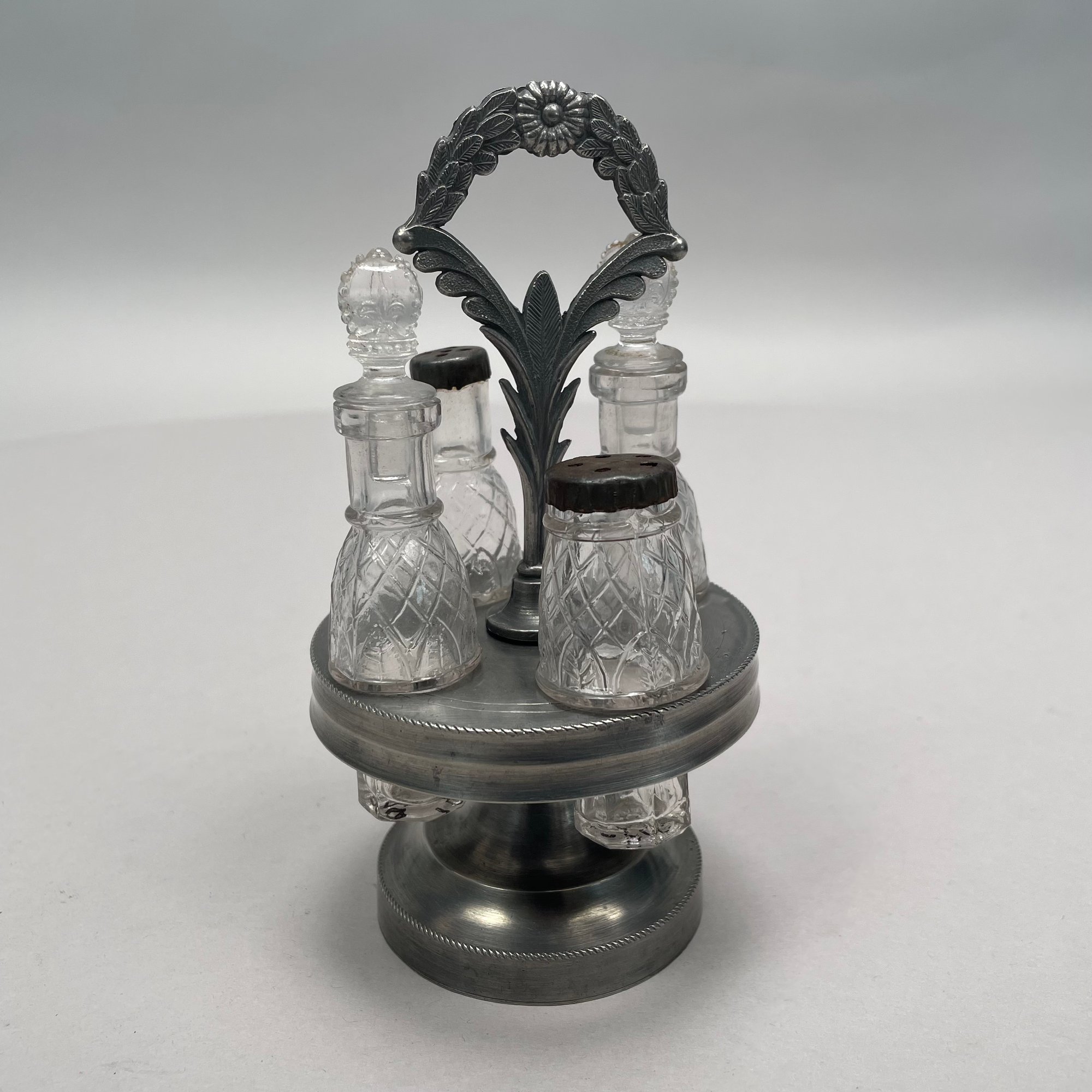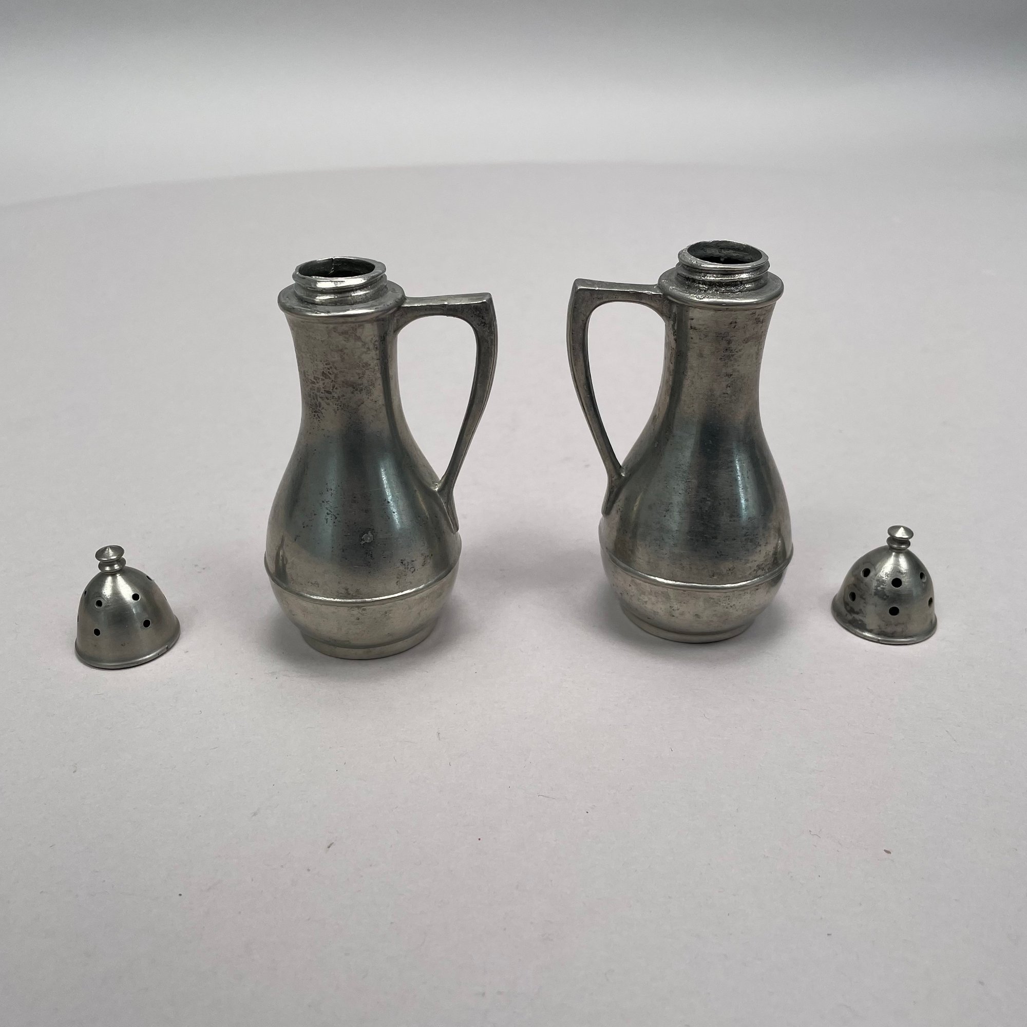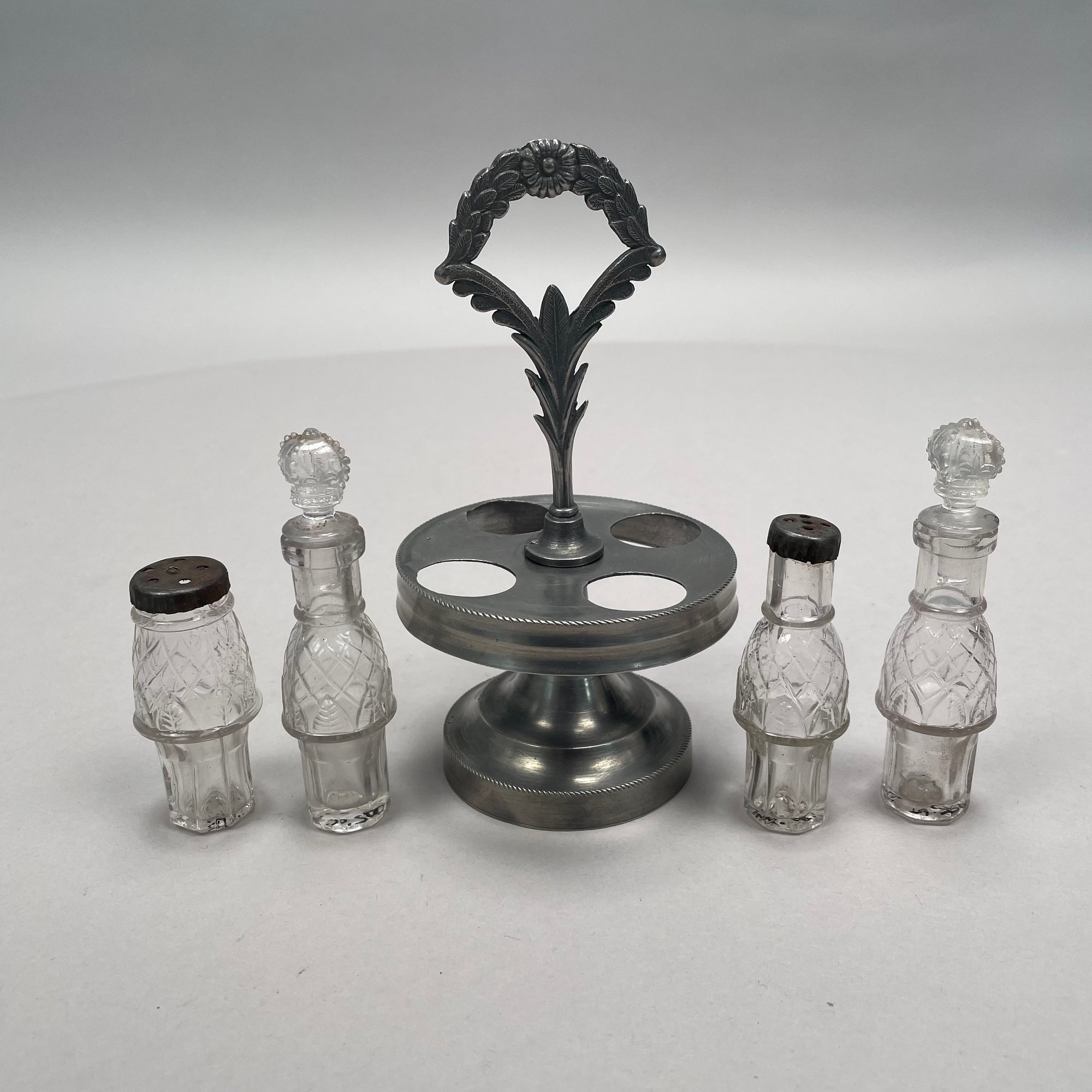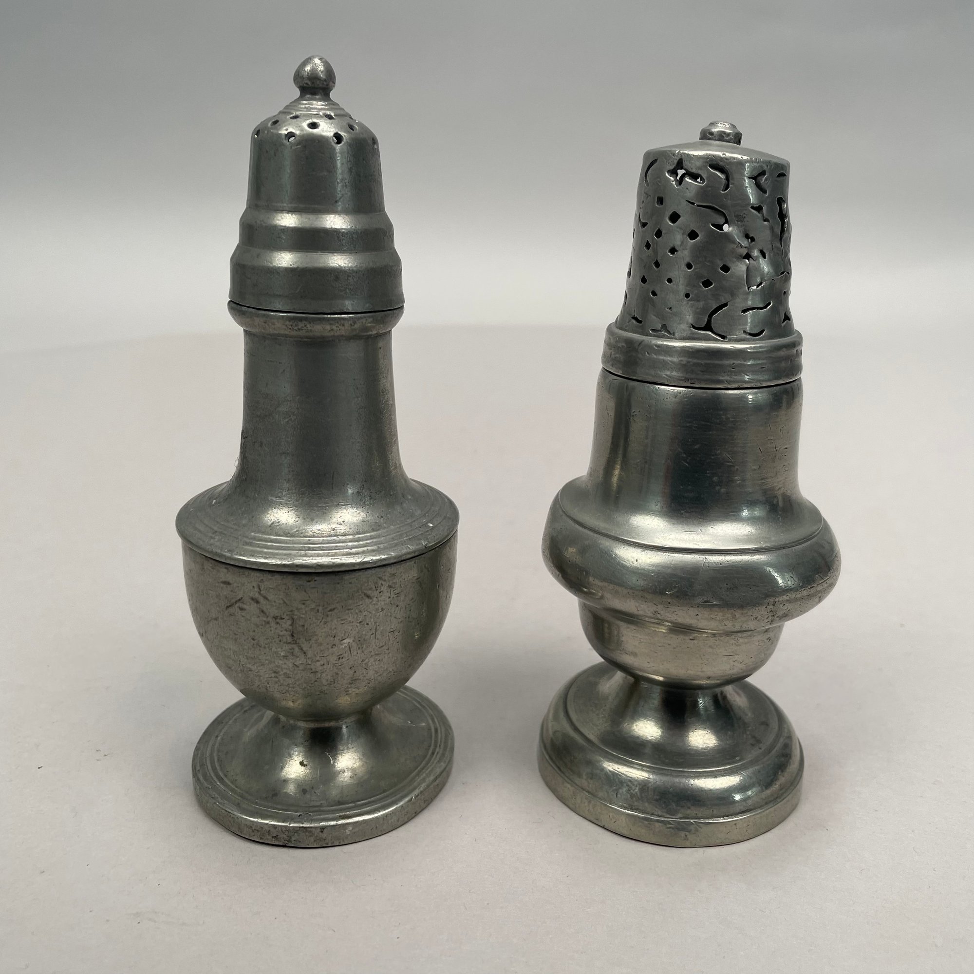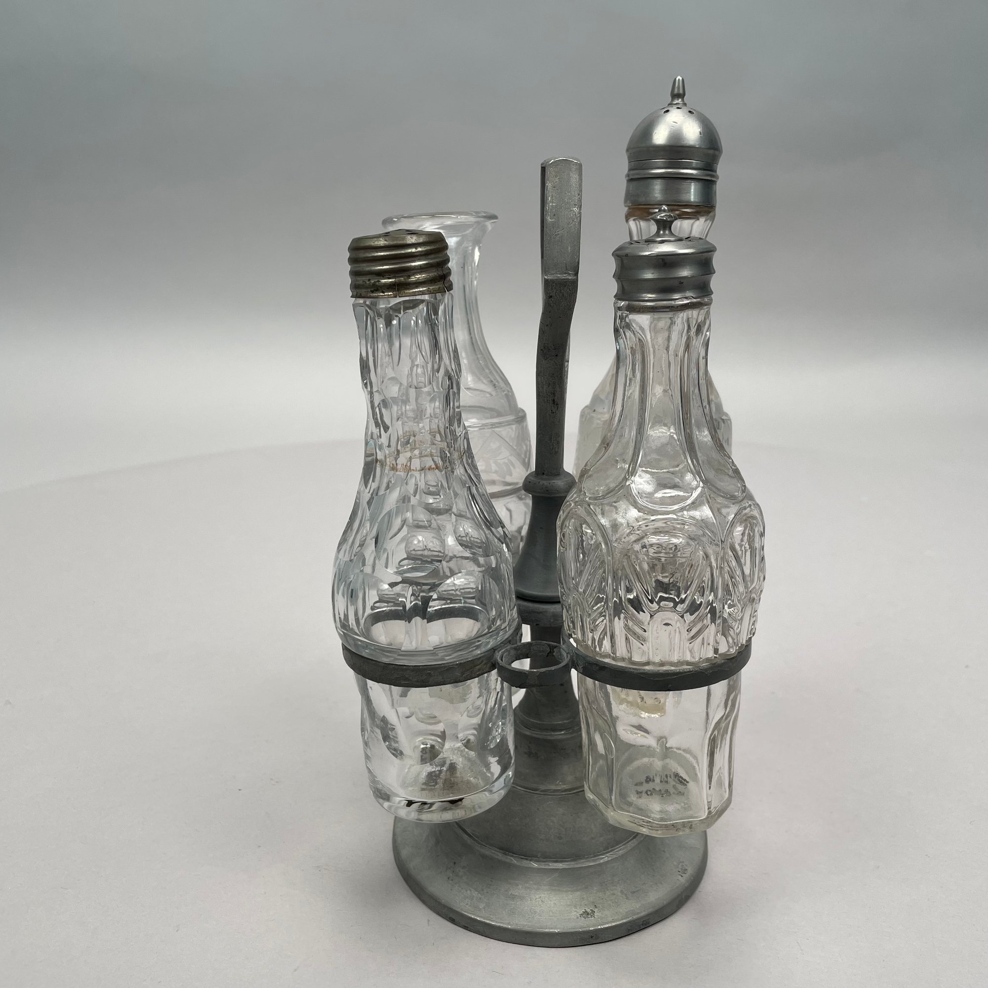 Group of Pewter and Glass Table Wares, Late Nineteenth-Twentieth Century. Comprising two miniature or toy four-piece castor sets, the glass bottles in each set in matching patterns; a four-piece castor set, the stand Eben Smith, Beverly, Massachusetts, circa 1840-56, fitted with four mismatched bottles; a pair of salt and pepper shakers; and four castors.