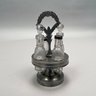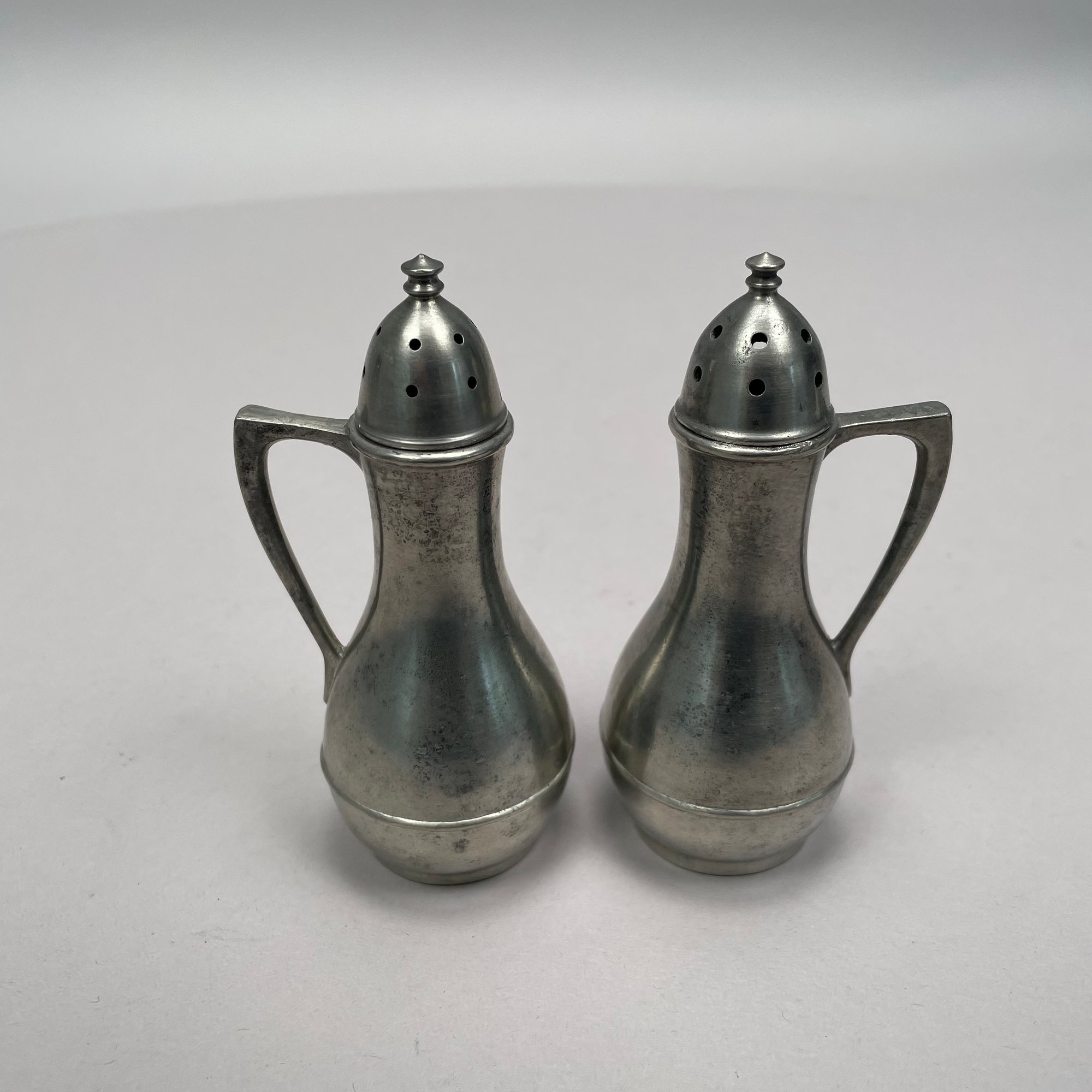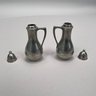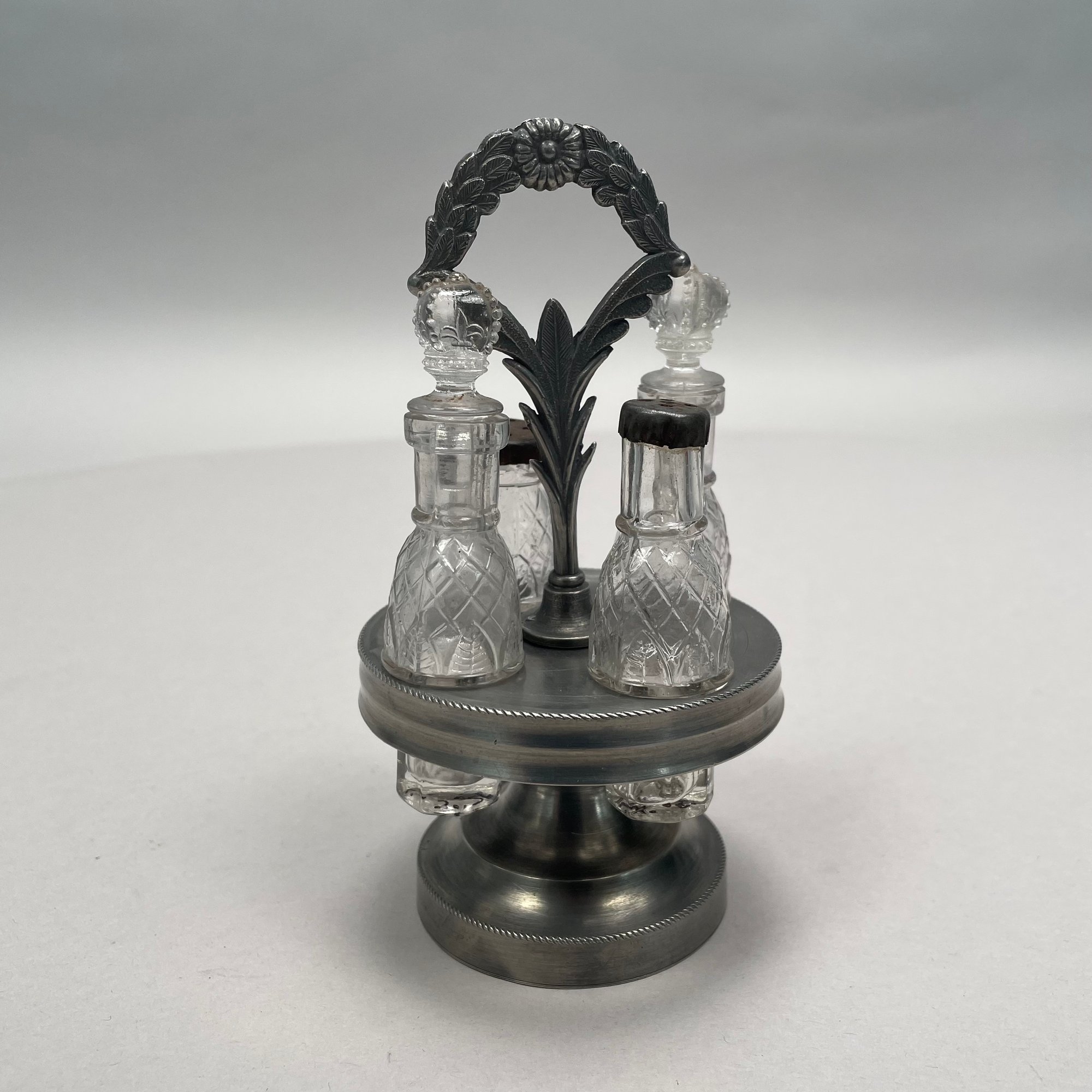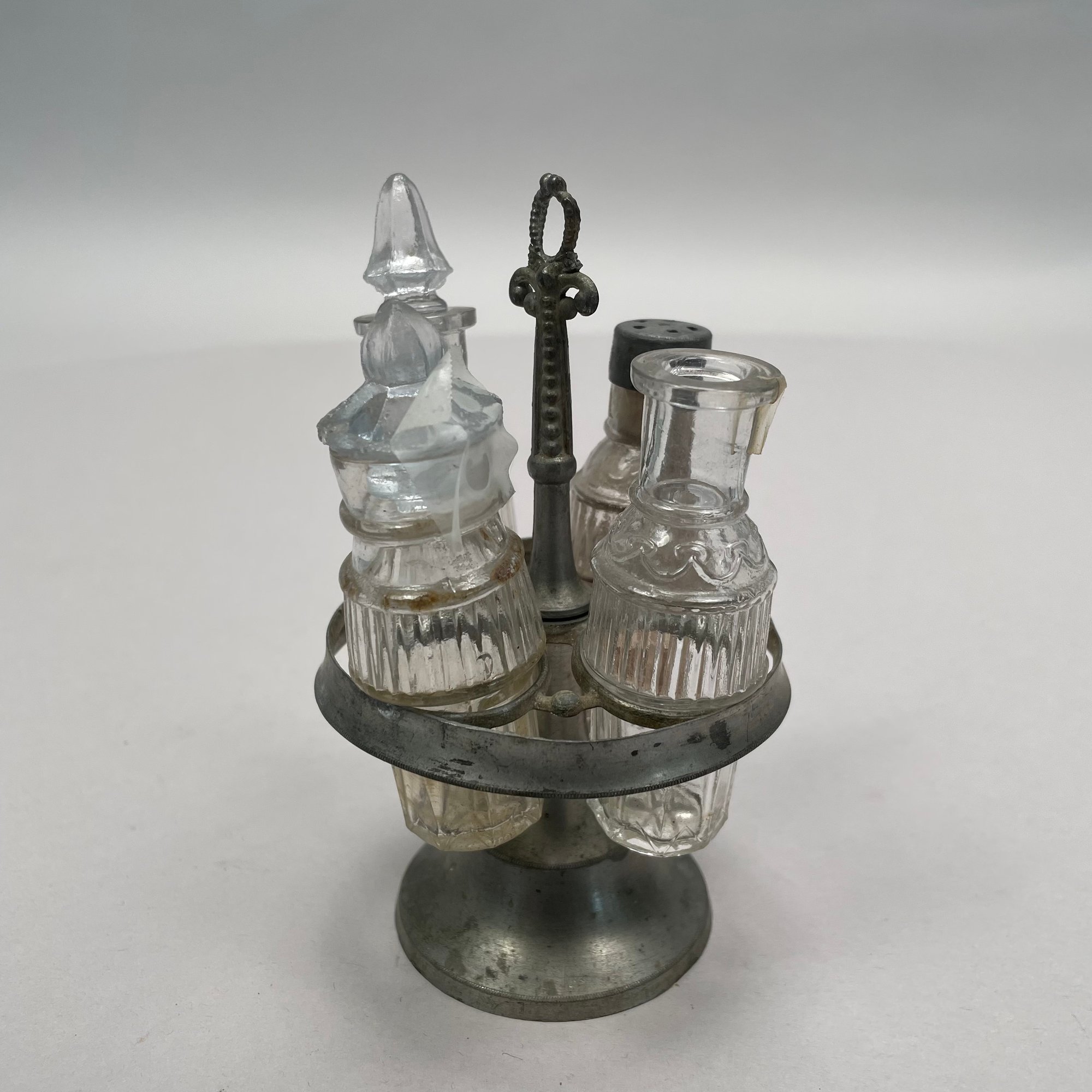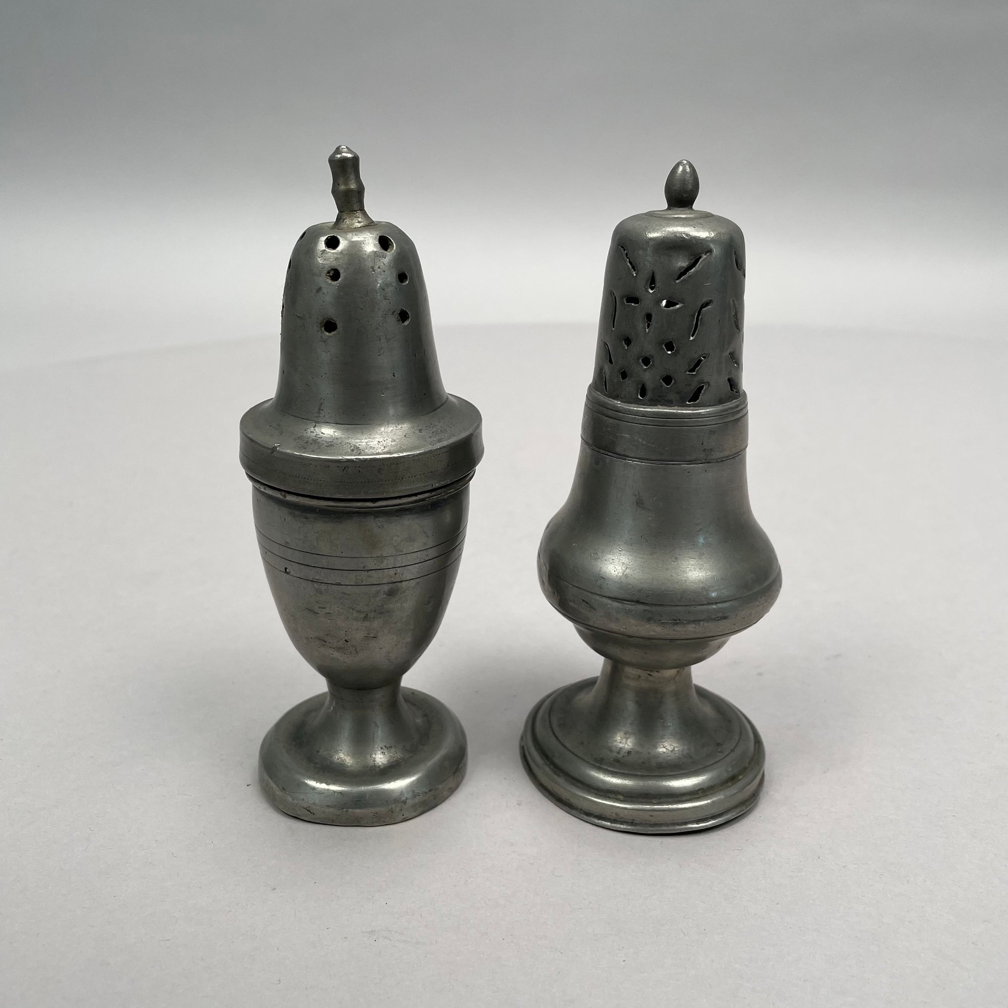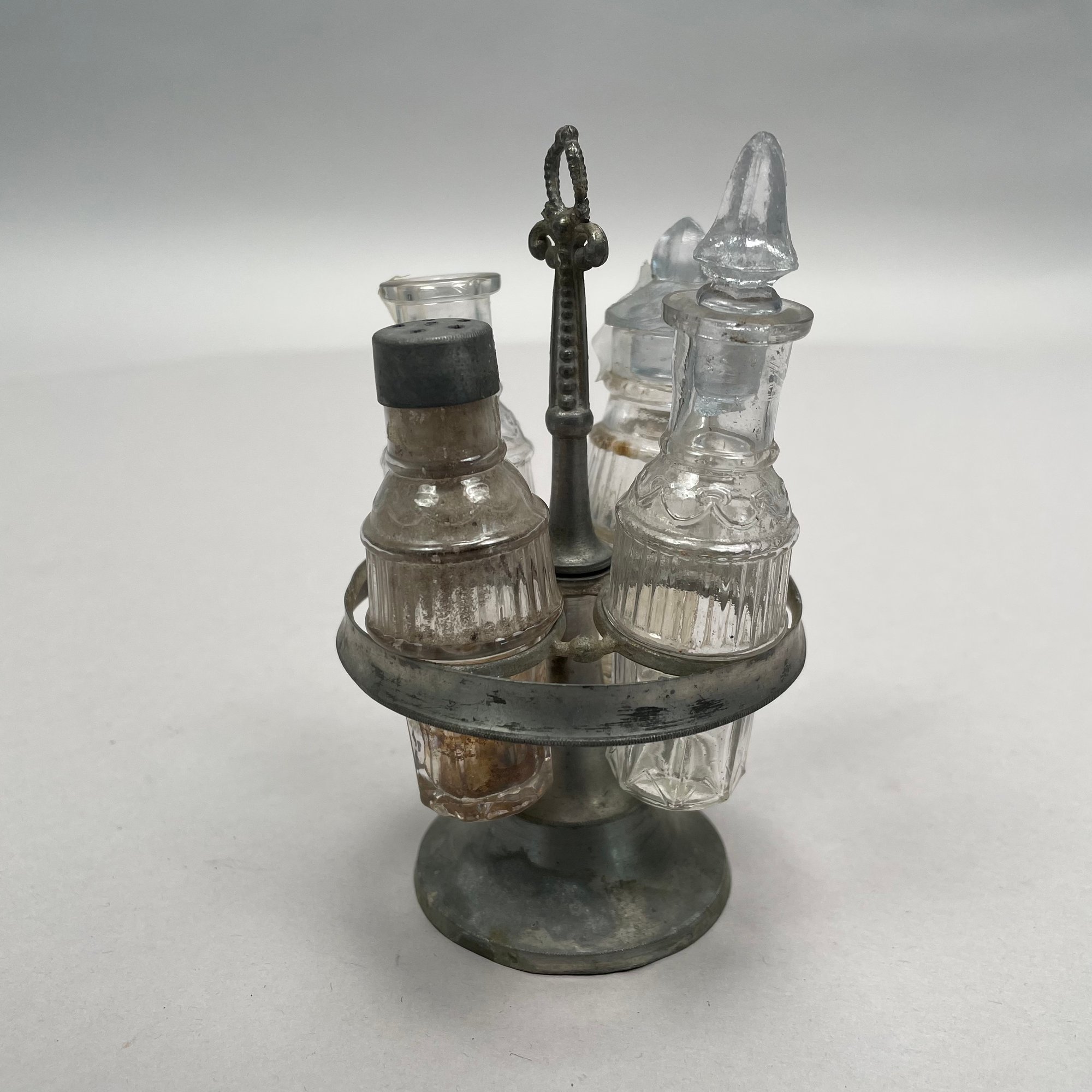 Group of Pewter and Glass Table Wares, Late Nineteenth-Twentieth Century. Comprising two miniature or toy four-piece castor sets, the glass bottles in each set in matching patterns; a four-piece castor set, the stand Eben Smith, Beverly, Massachusetts, circa 1840-56, fitted with four mismatched bottles; a pair of salt and pepper shakers; and four castors.