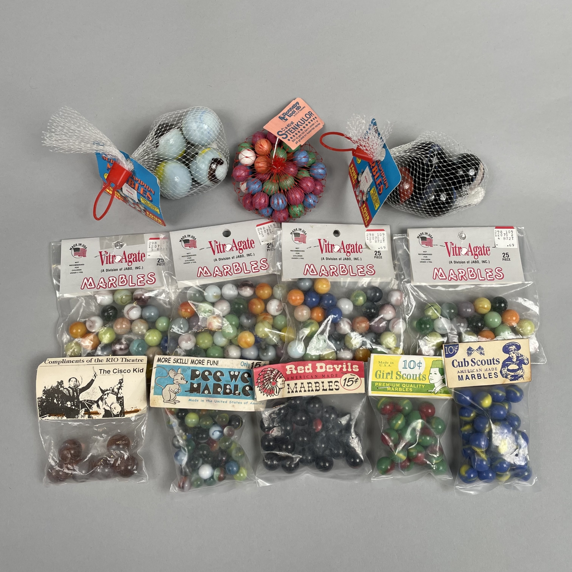 Comprising four bags of "VitroAgate" marbles, two bags of "SUPER CHAMPION MARBLES," one bag of "Pee Wee Marbles," one bag of "Red Devils" marbles, one bag of "Cub Scouts" and one bag of "Girl Scouts" marbles, one bag of "STENKULOR" marbles, and a box of six marbles compliments of the Rio Theatre. (12)