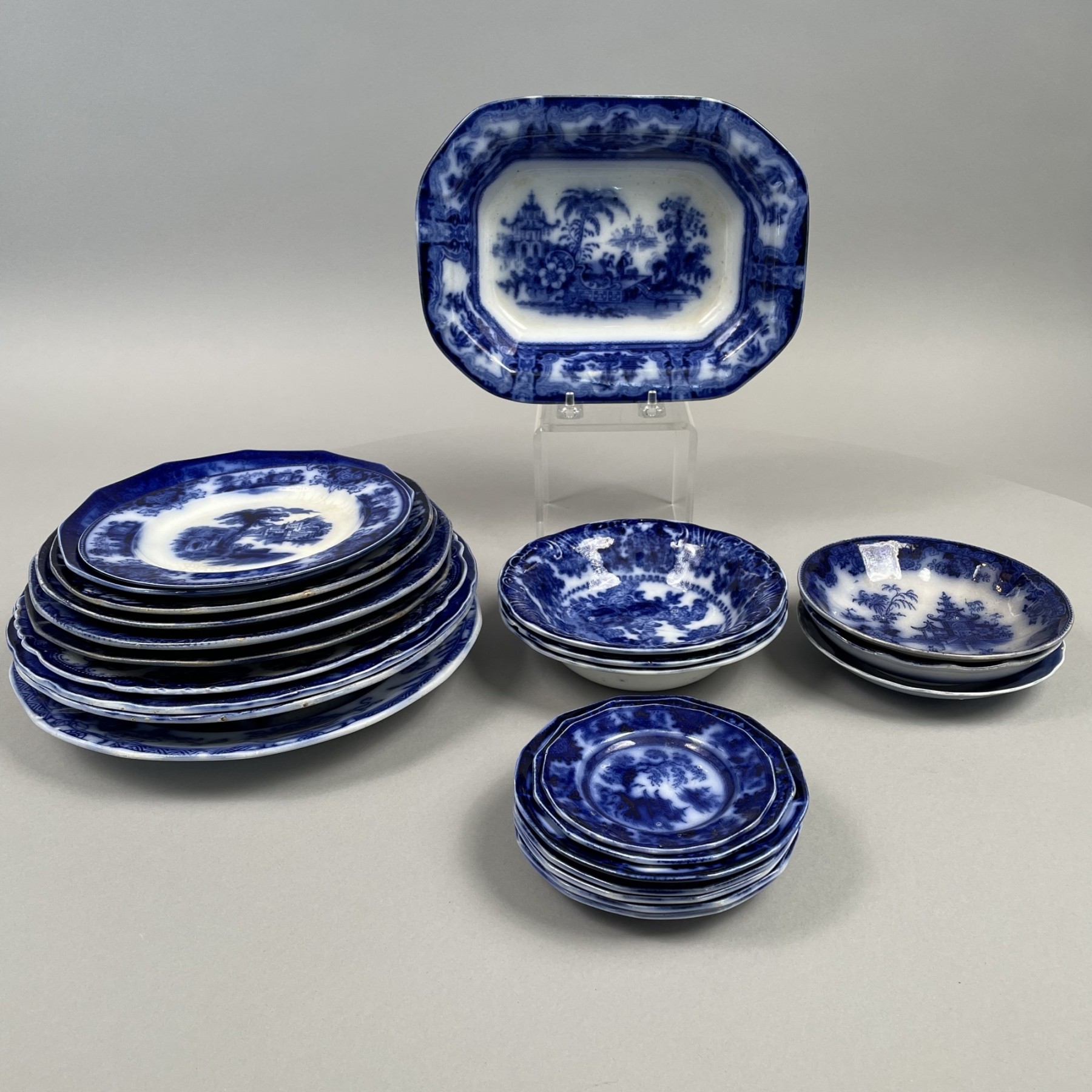 Including a 'Tonquin' 7.375 in. plate and set of four side plates, John Heath, 1809-22; a 'Kyber' octagonal vegetable dish, and three 'Fairy Villas' pudding dishes, William Adams & Co., 1819-64; the remaining comprising one soup plate, eight plates, three pudding dishes, two toddy plates and a cup plate, various printed factory marks in underglaze-blue. (24)