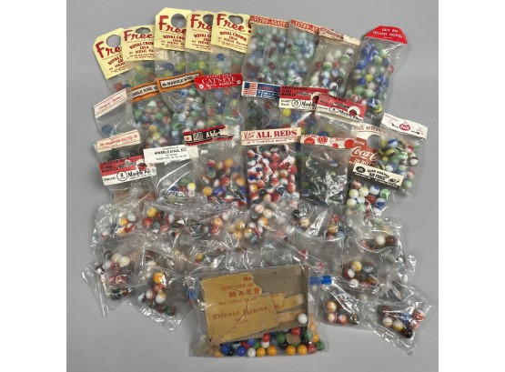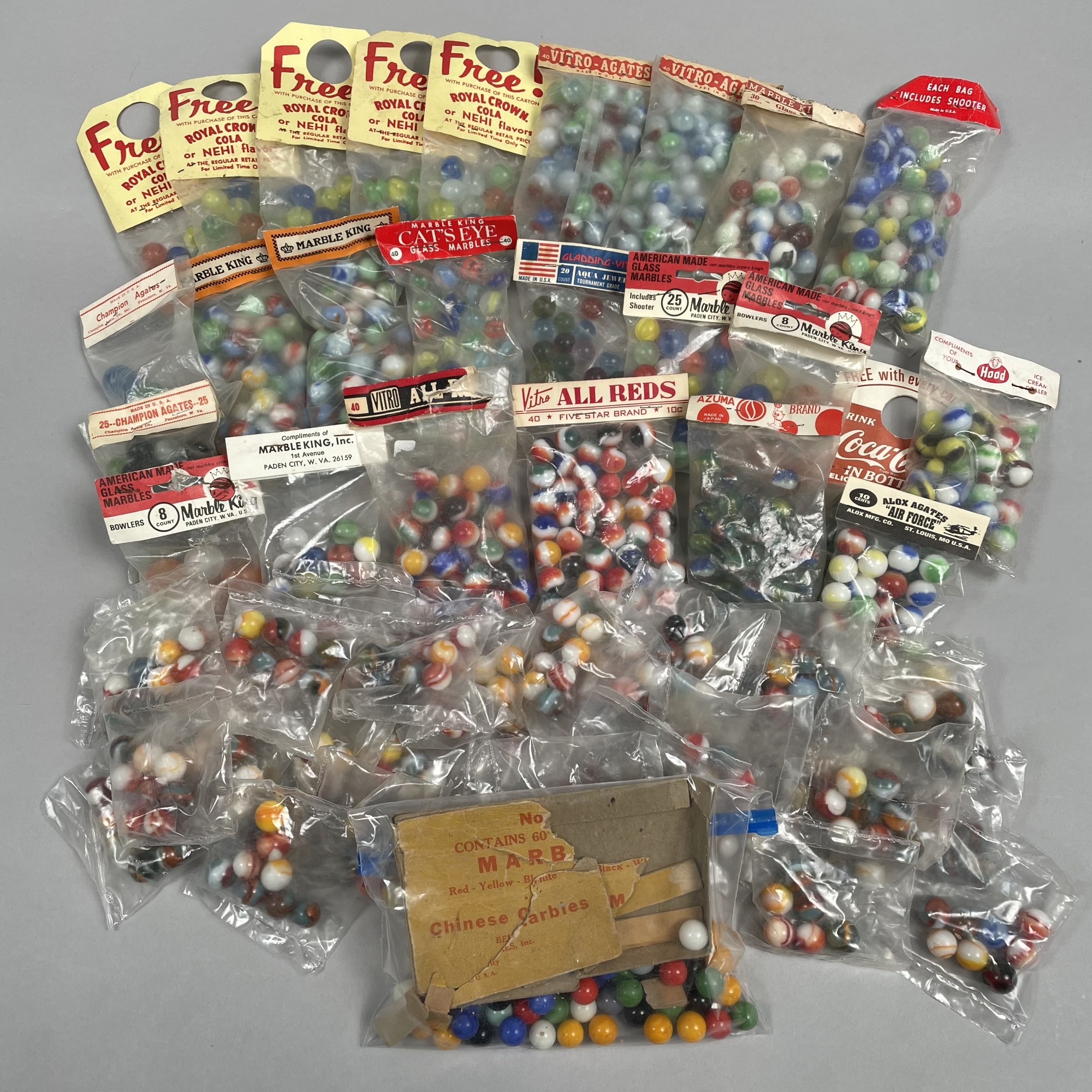 Including Alox Agates "AIR FORCE," Azuma Brand, Champion Agates, Coca-Cola, Five Star Brand, Gladding-Vitro, Hood, Marble King, Inc., Marble King Cat's Eye and Rainbow, Royal Crown Cola/ Nehi, Vitro-Agates, Vitro All Reds, a bag of Chinese Checker marbles, and 38 bags of assorted marbles.