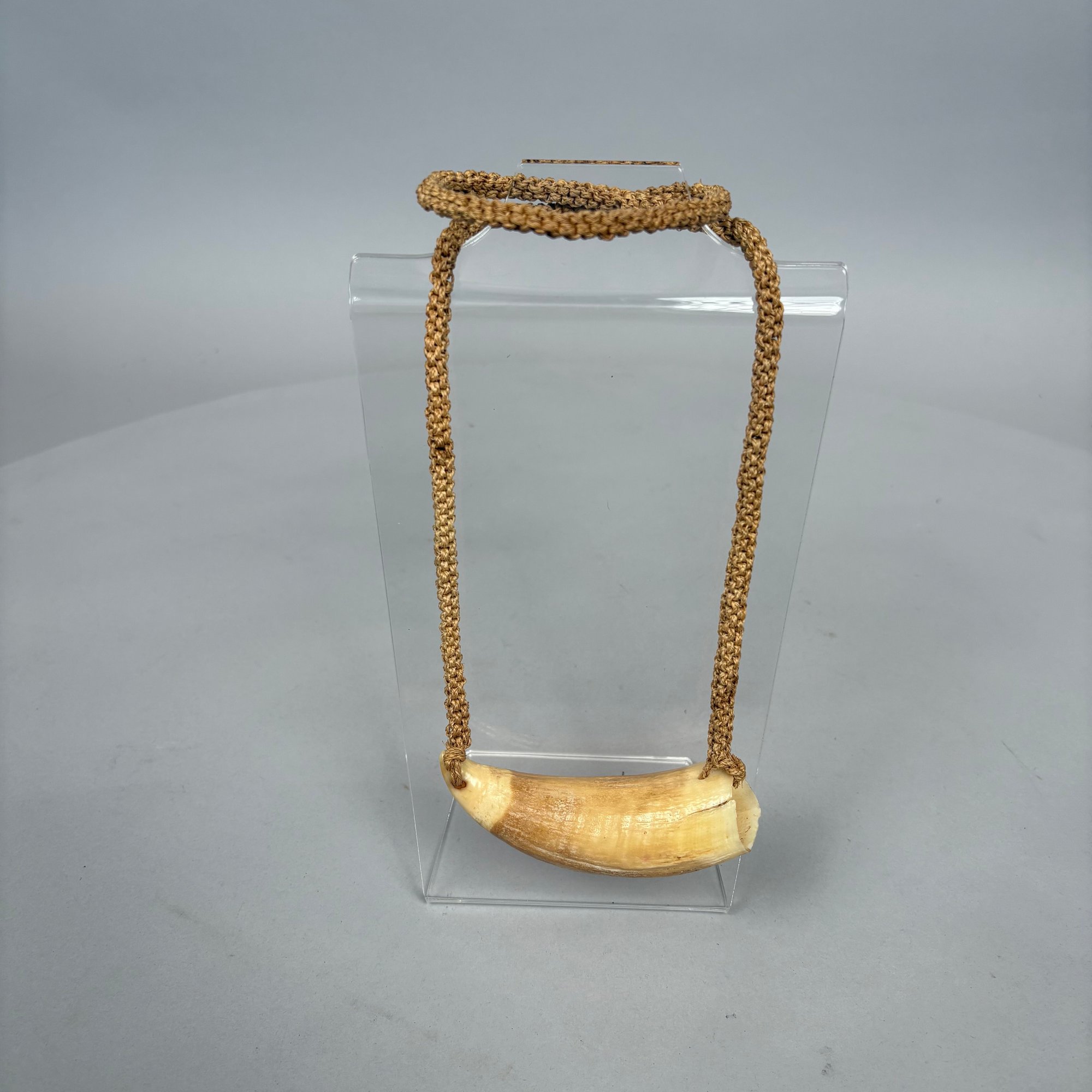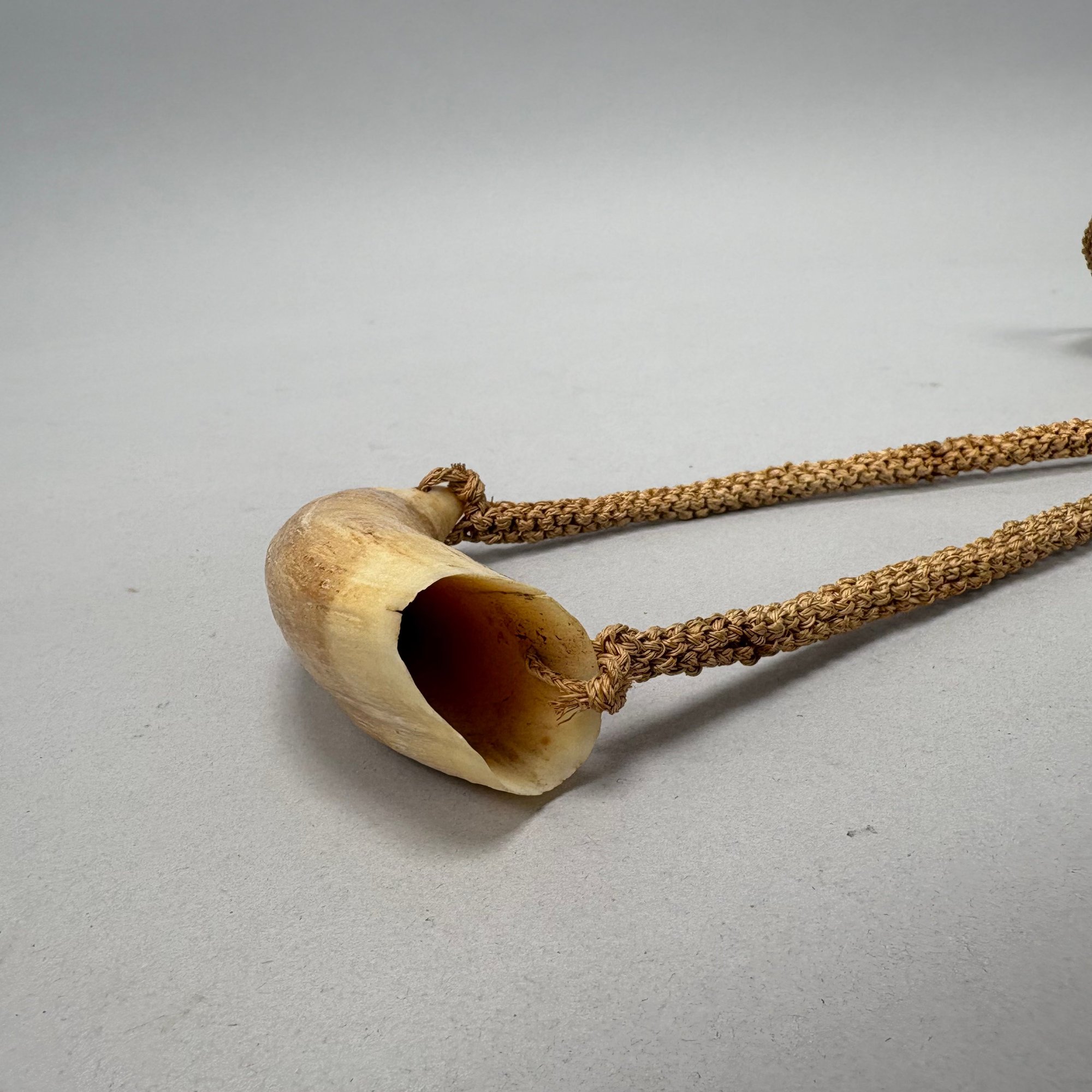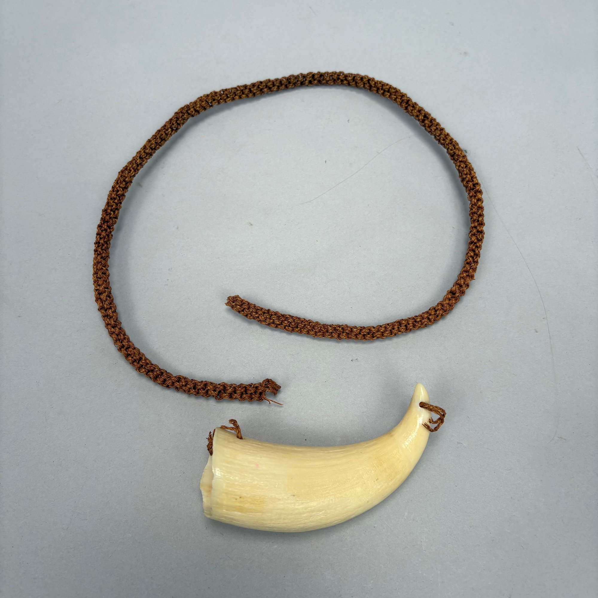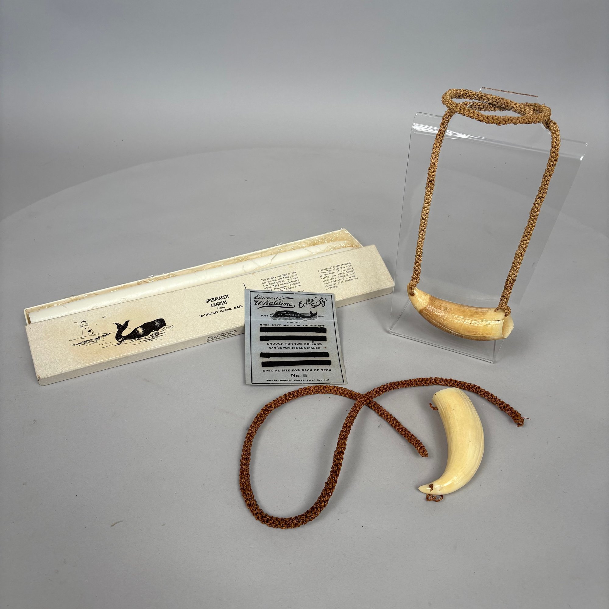Group of Whale-Related Articles. Comprising two Fijian sperm whale tabuas or tooth pendants, two pair of Edwards' whalebone collar stays and a pair of spermaceti candles, Nantucket, Massachusetts. (4)