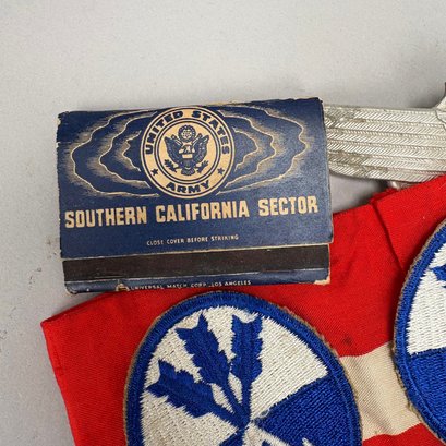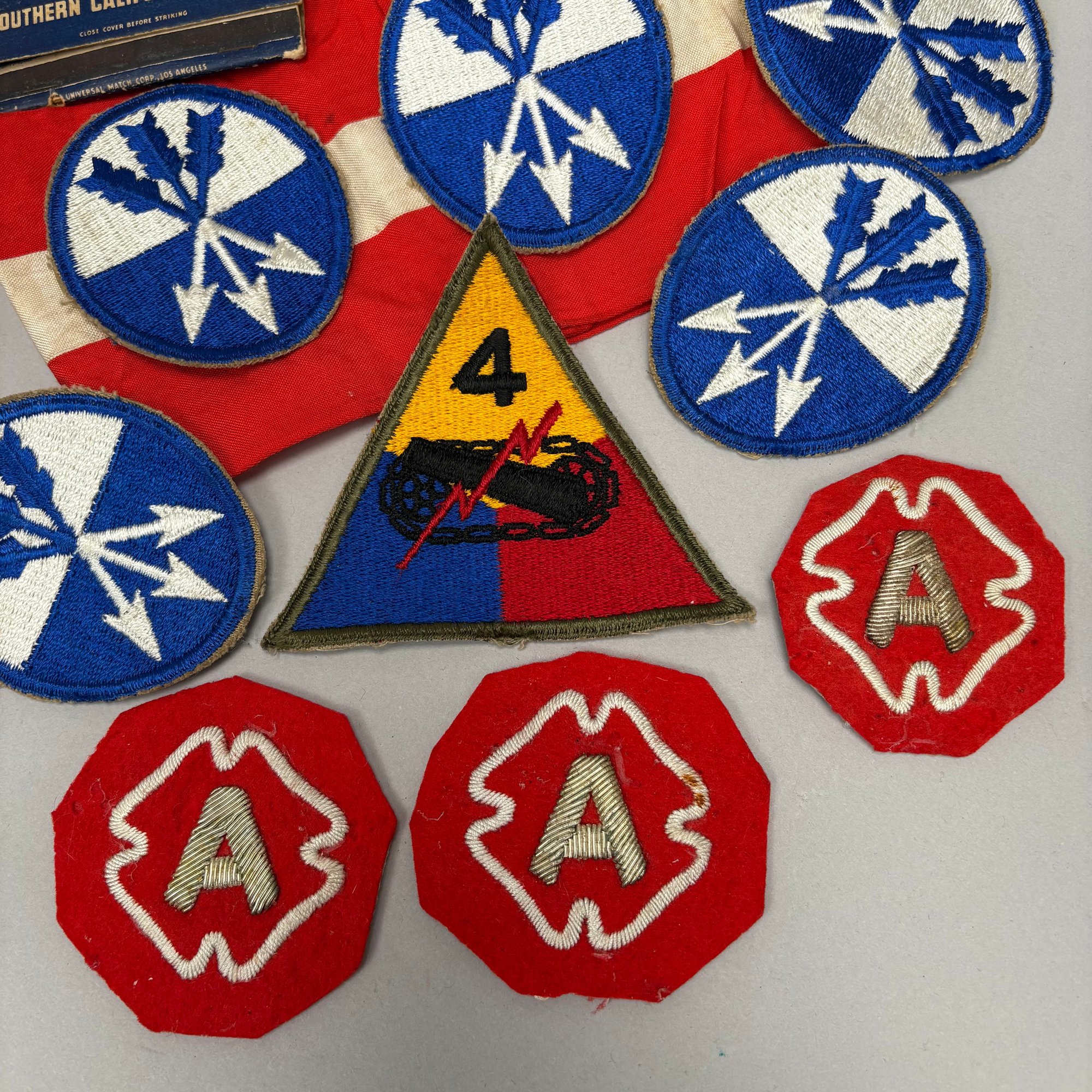 Group of WWII Army Insignia. Comprising two 9th army bullion shoulder sleeve insignia, five United States Army 23 Corps insignia, one United States Army 4th Armored Division shoulder insignia, and a United States Army/ Southern California Sector matchbook with matches, Universal Match Corp., Los Angeles, California.