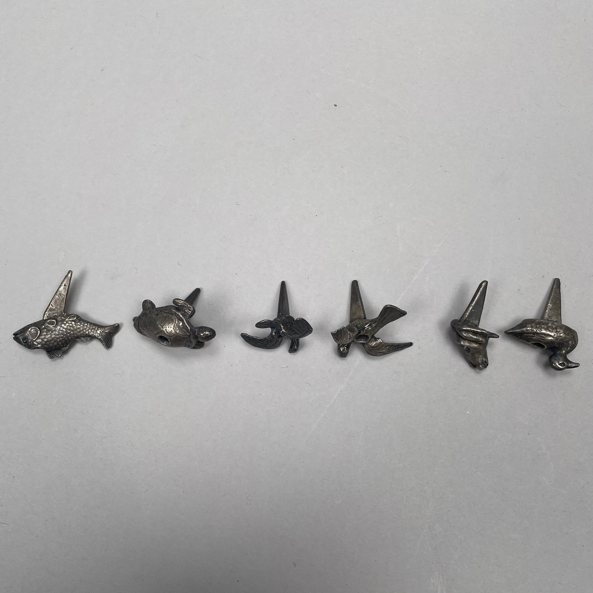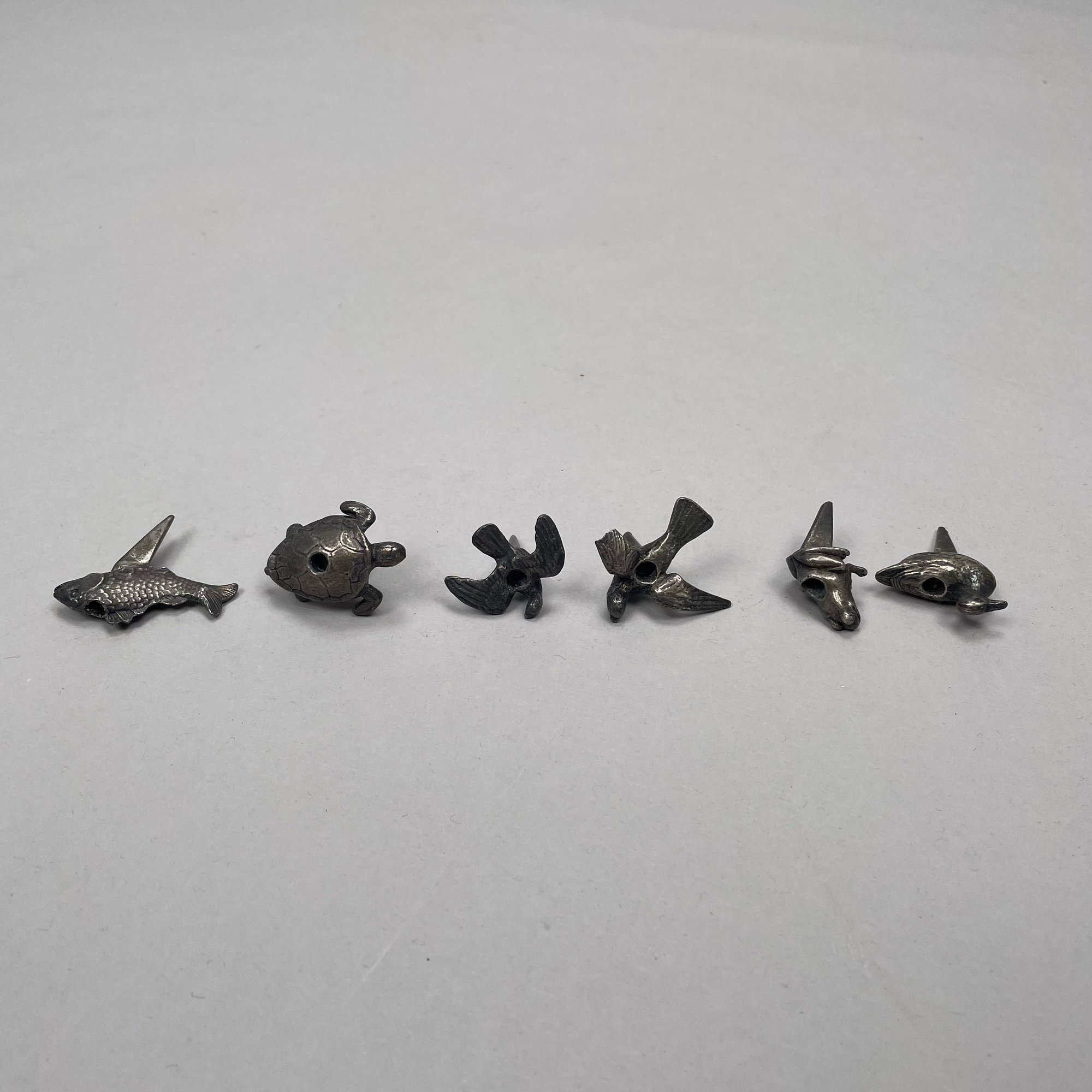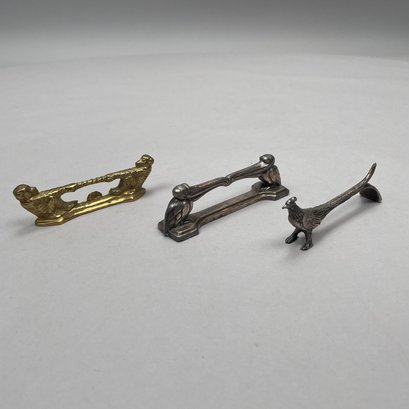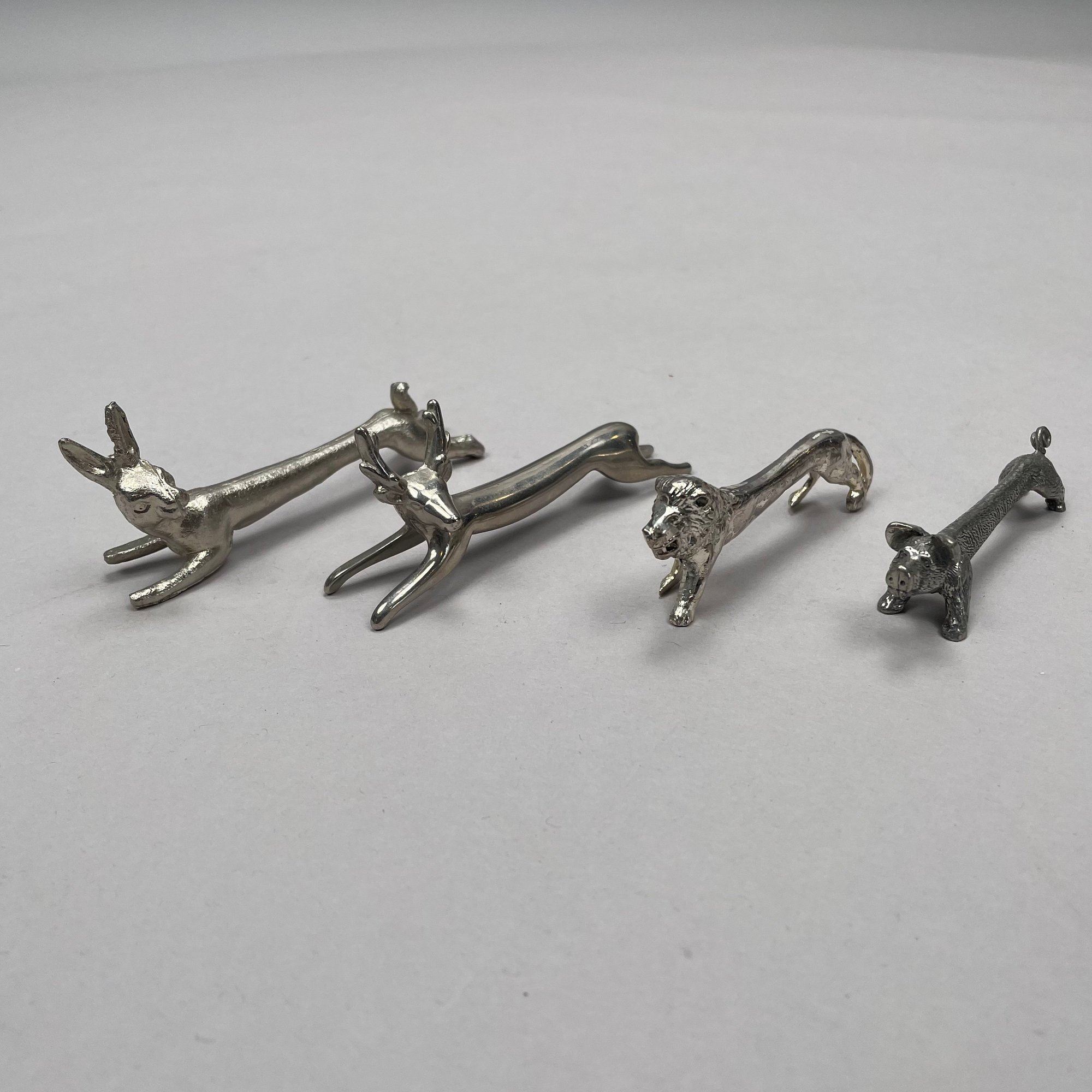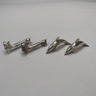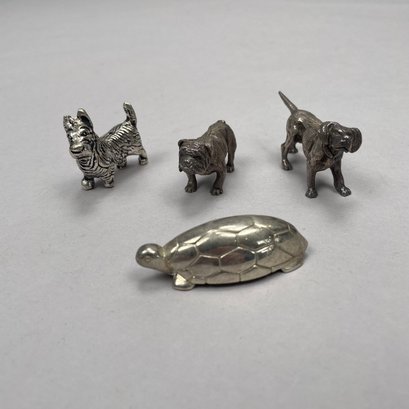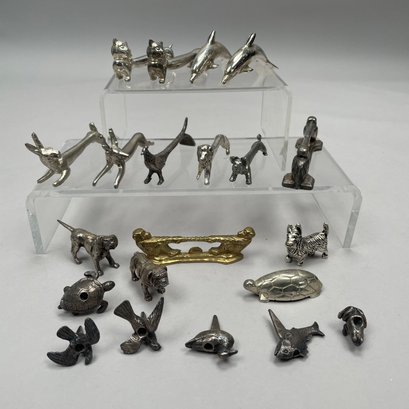 Group of Sterling Silver, Silverplate and Brass Table Objects, Twentieth Century. Comprising two sterling silver miniature figures of a bulldog and a pointer, John Silvant & Marguerite Jones, London, 1989 and 1992, respectively; a silverplate figure of a scottie; set of six silverplate figural animal, bird and amphibian birthday candle holders, Reed & Barton; nine silverplate and brass figural knife rests; a pair of silverplate miniature figures of porpoises and a turtle. (21)