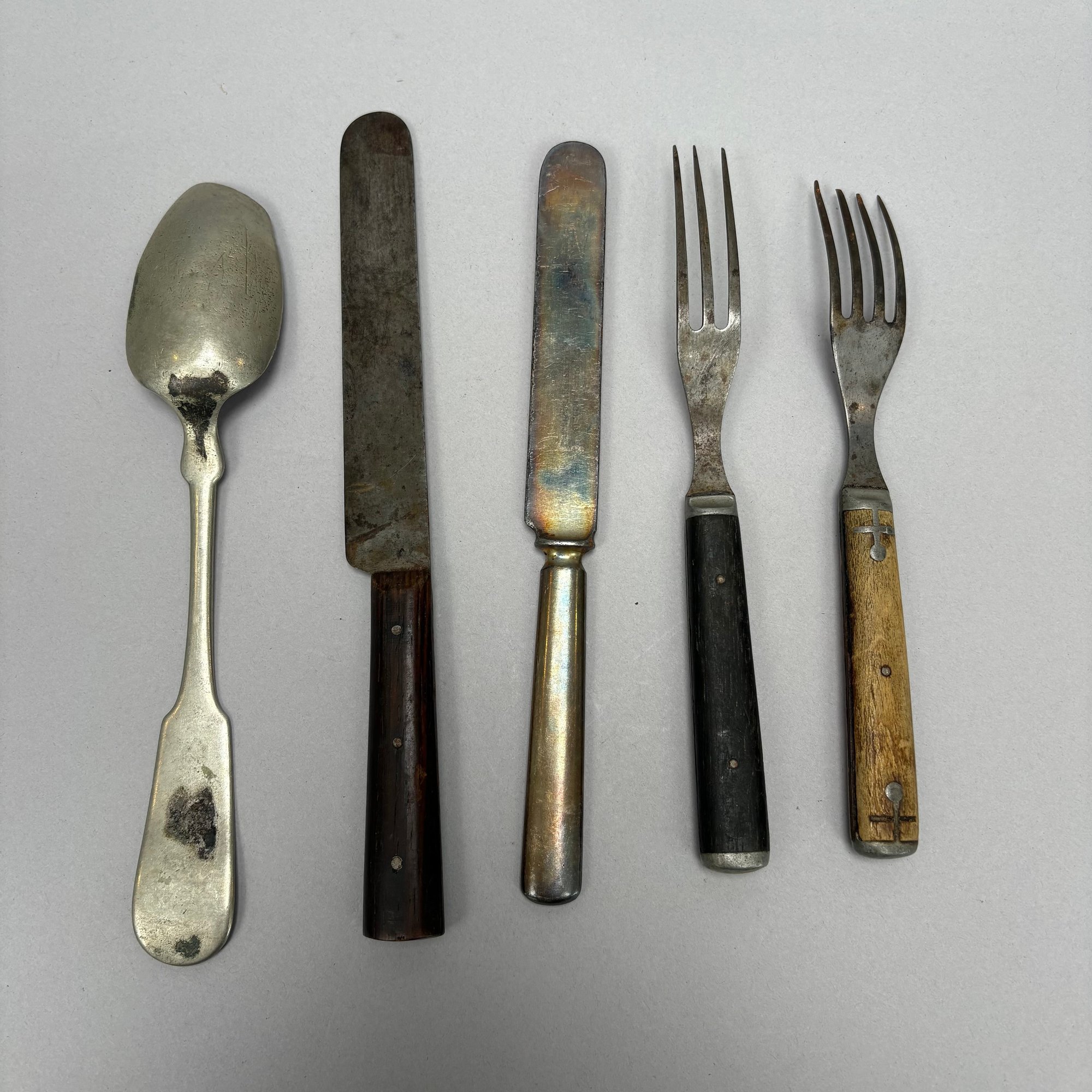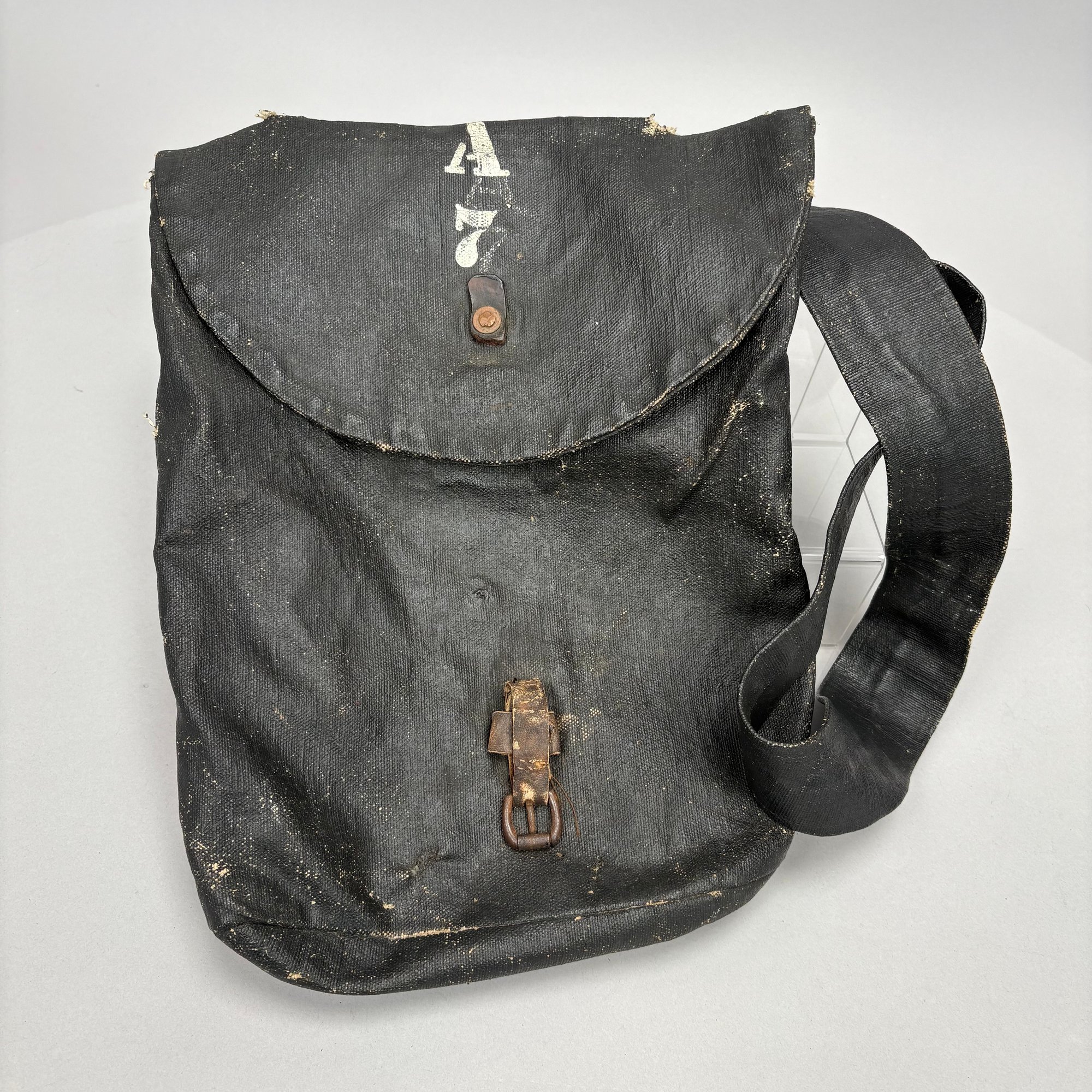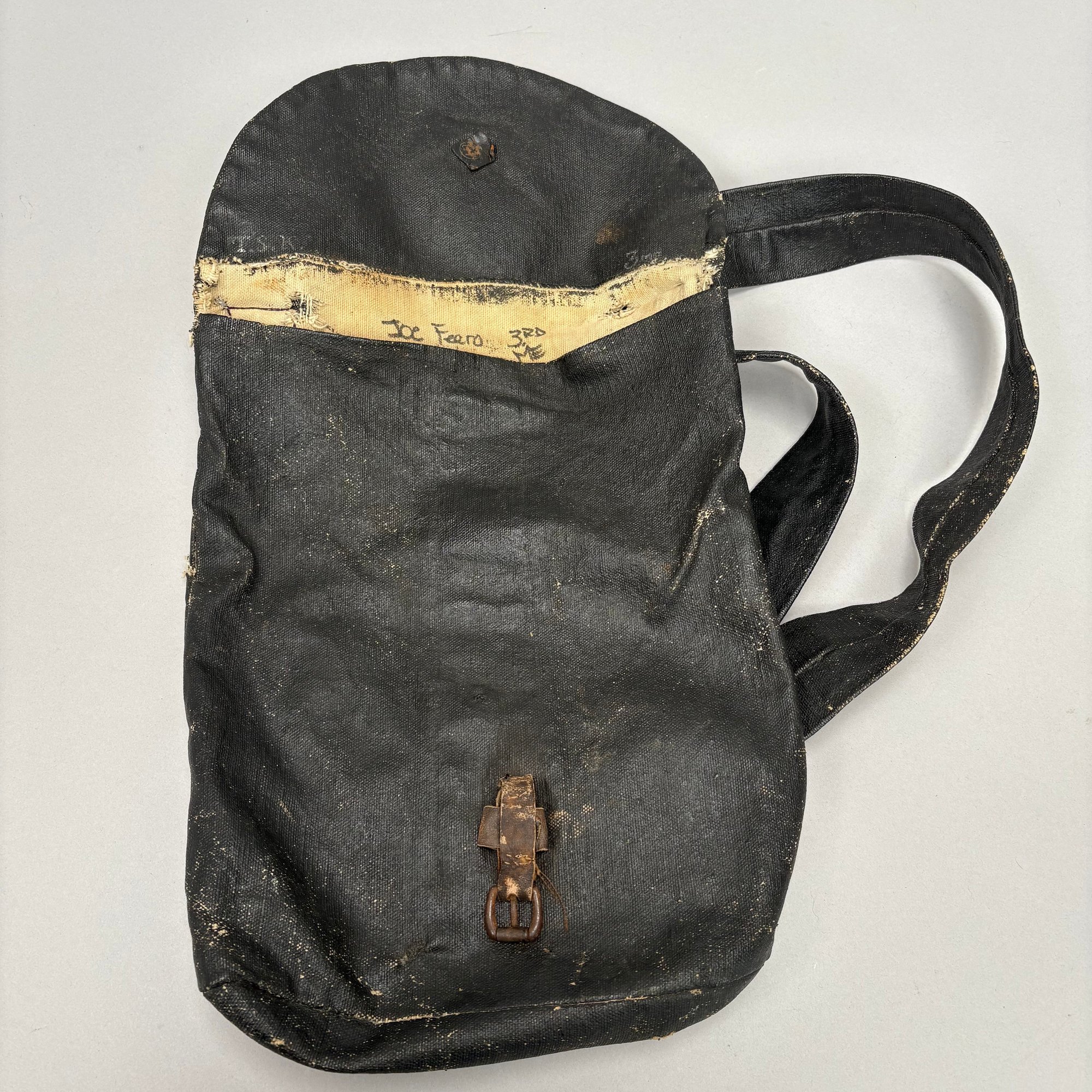 Provisions Haversack in Black Paint and Associated Implements. The cover stencilled "A7," the interior printed "Joe Fearo 3RD ME" in black marker, containing a pan, two forks, two knives and a spoon.