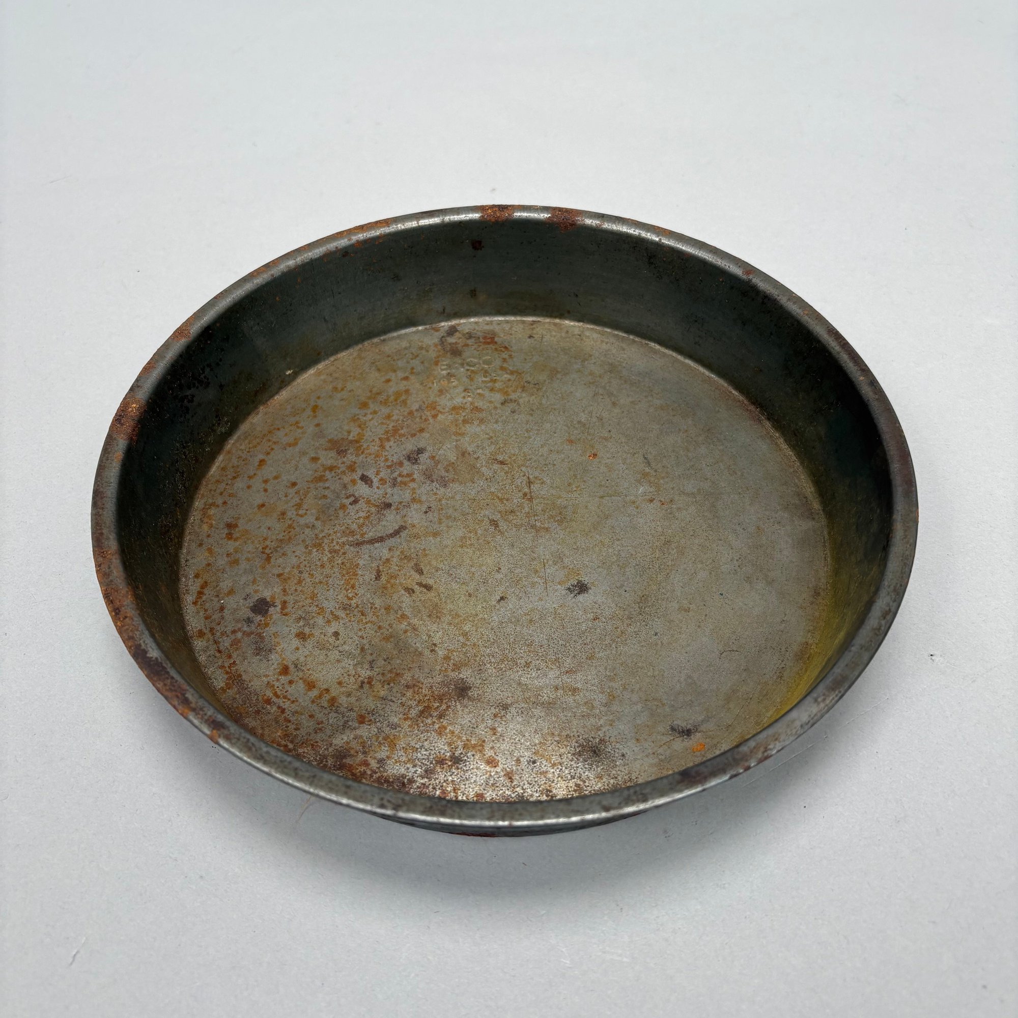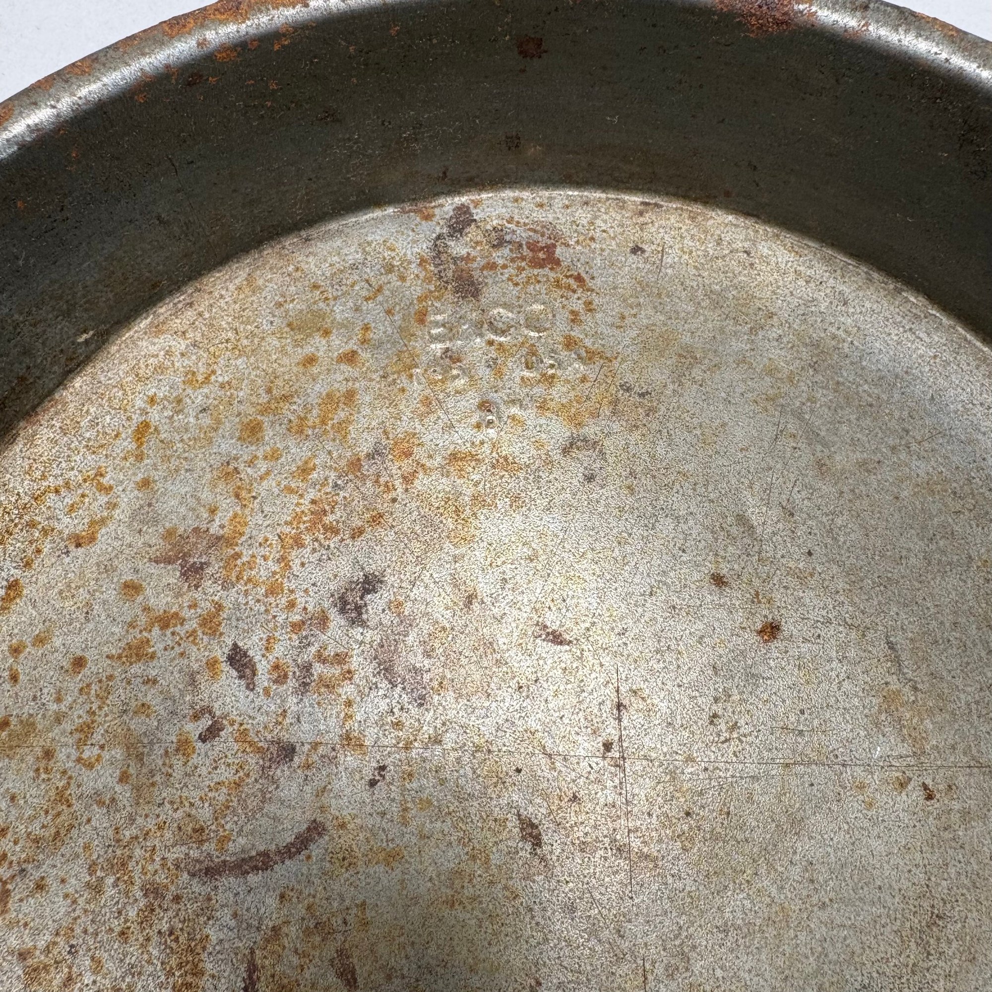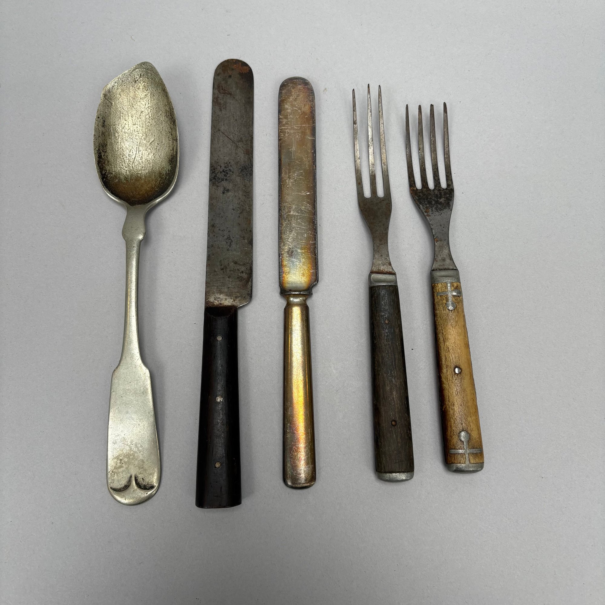 Provisions Haversack in Black Paint and Associated Implements. The cover stencilled "A7," the interior printed "Joe Fearo 3RD ME" in black marker, containing a pan, two forks, two knives and a spoon.