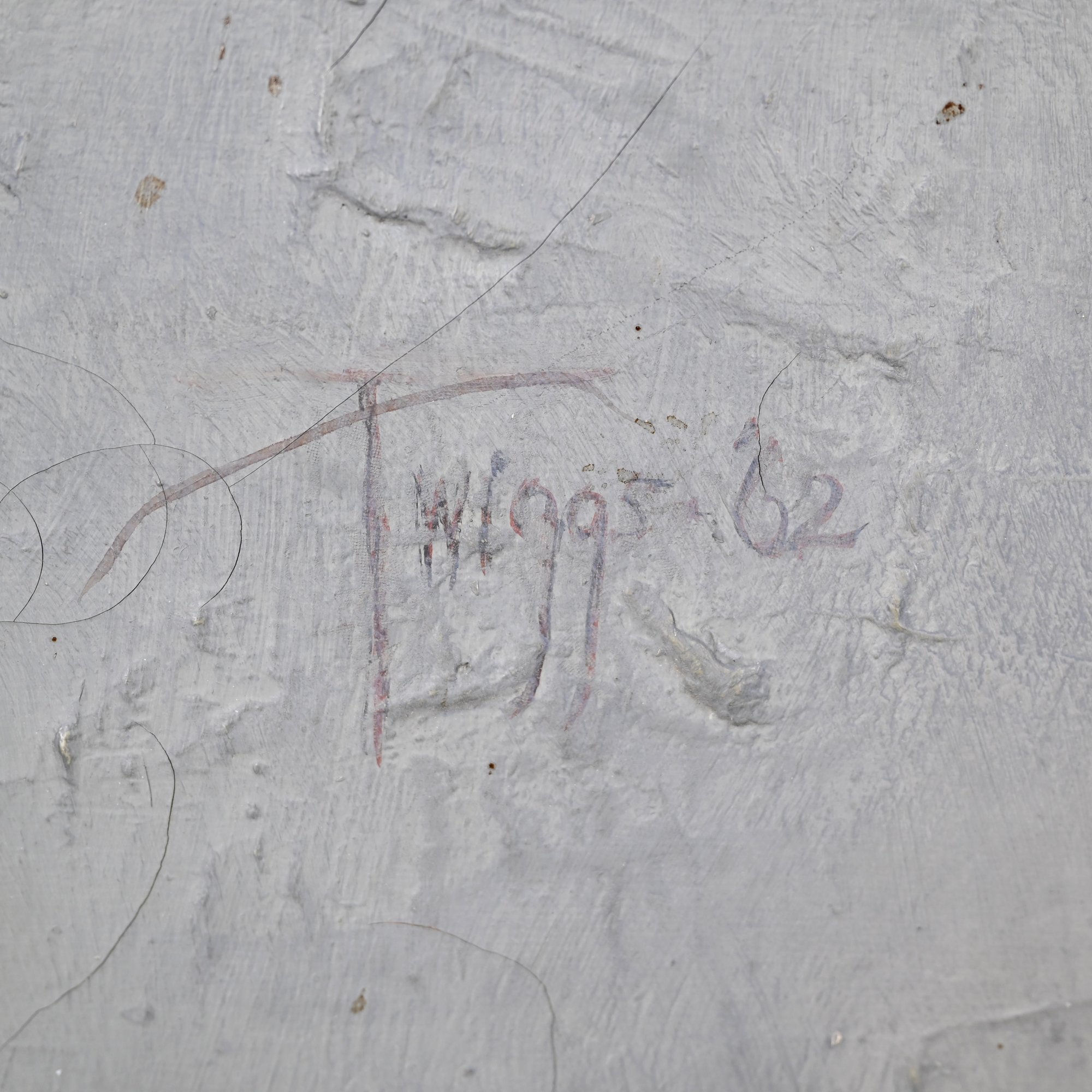 Russell Gould Twiggs (American, 1898-1991). "Composition in Gray," oil on canvas, signed "Twigg '62" lower right upside down (the signature has always been that way), and on the reverse one Masonite corner mount inscribed "Comp. in Gray, C568B" in black crayon.